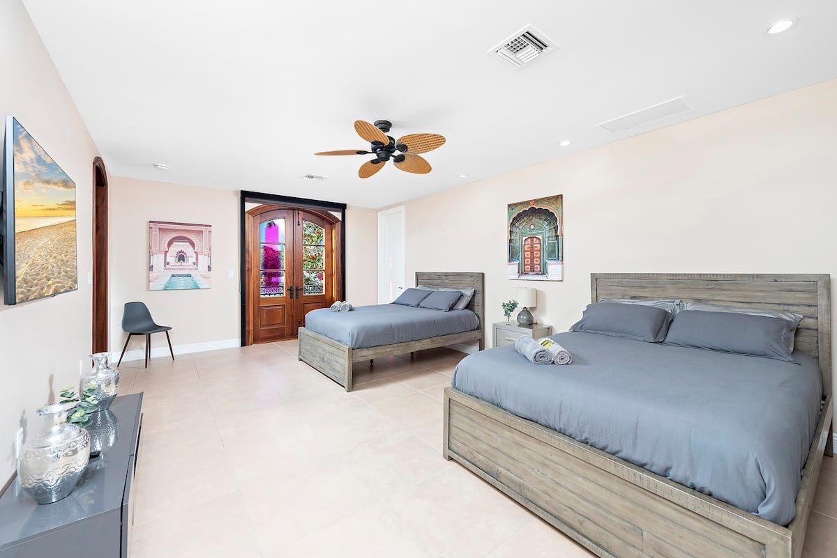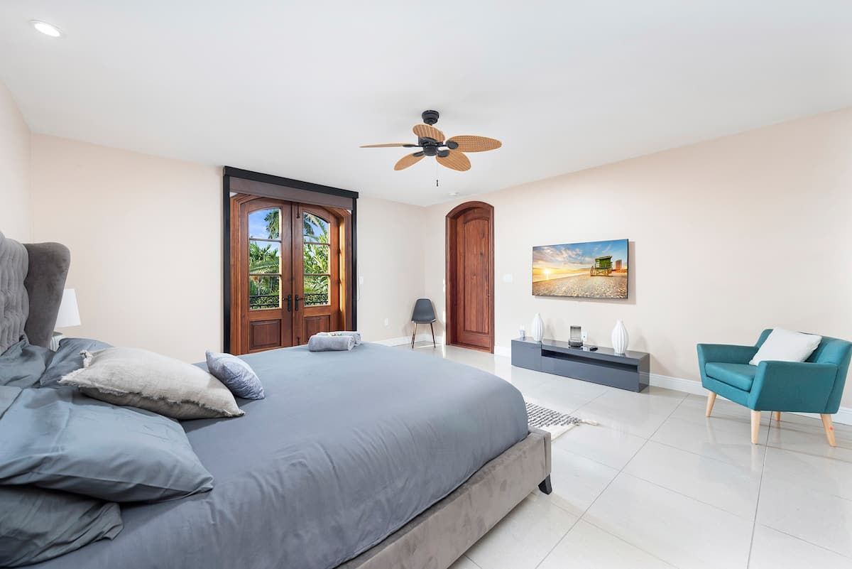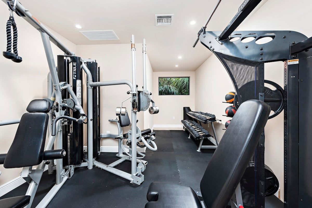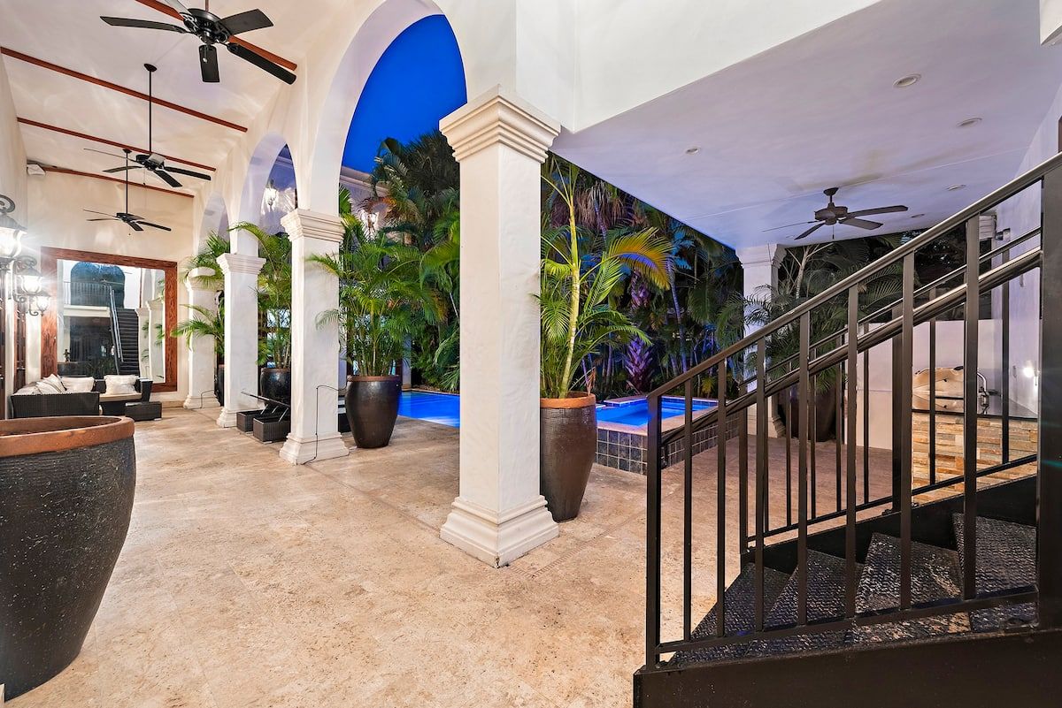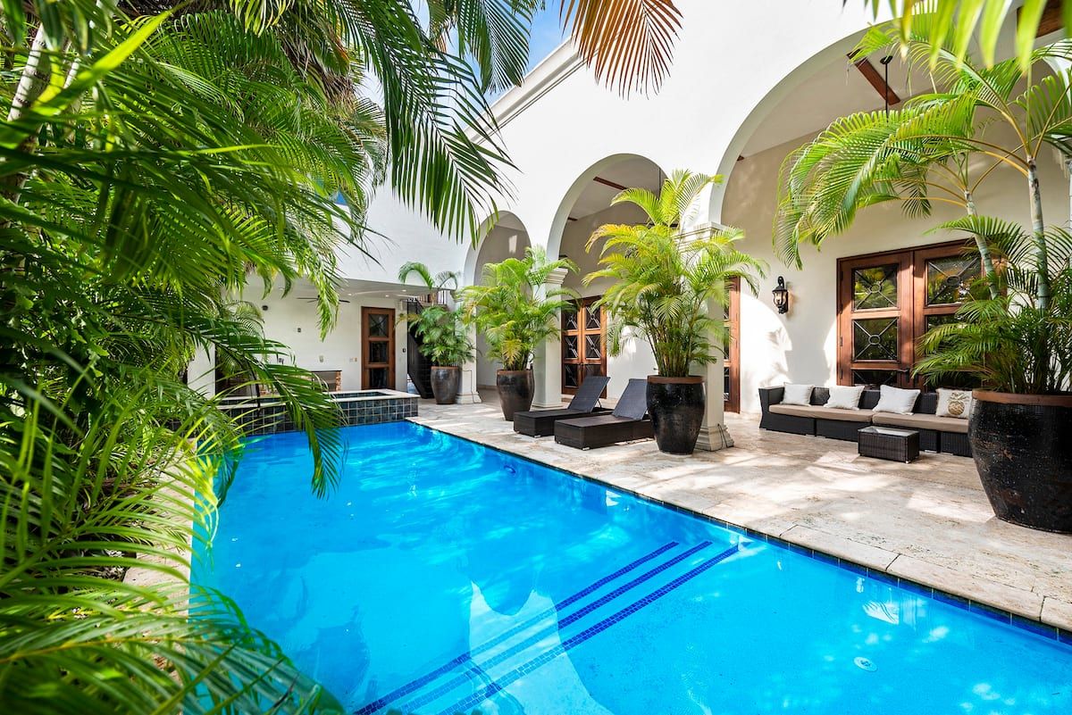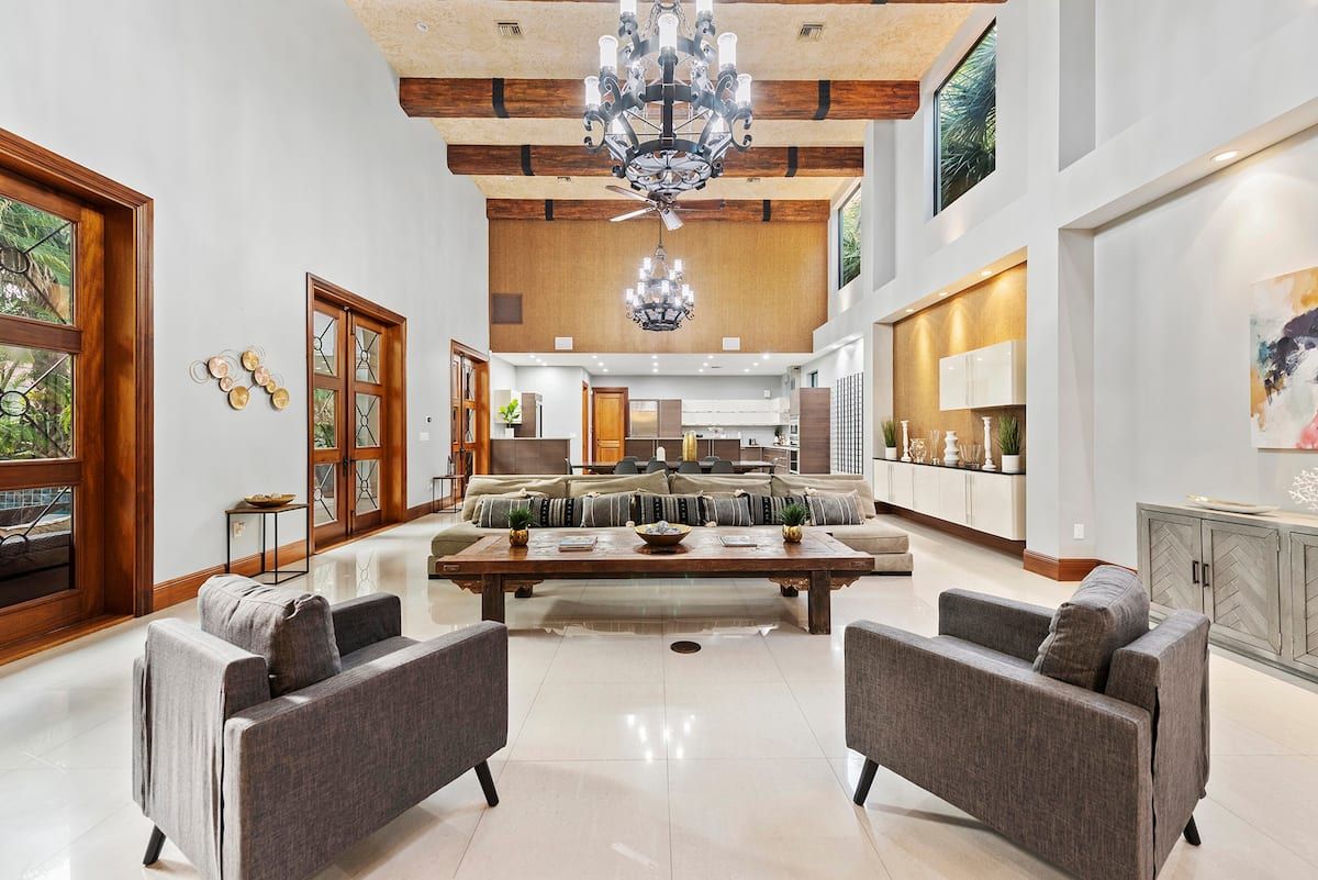 Some homes are so extraordinary that they draw 'oohs' and 'aahs' from guests in every new room they enter — this stunning European-style villa in Fort Lauderdale is very much one of those. Inside, the twenty-four-foot high ceilings in the living space invite palatial comparisons and this continues when you step outside to the palm-covered heated pool area, which is reminiscent of a Roman emperor's abode. It's very easy to imagine careless afternoons drifting between the inbuilt hot tub and the loungers on the covered terrace close to the barbecue. If you ever want to up the ante at any point, there's a well-equipped gym with a cable machine, free weights, and core strength equipment, as well as a whole host of sports to play in nearby Holiday Park too, which can be reached in twelve minutes' walk. However, if you feel more at home just lazing about, the golden sands of Fort Lauderdale Beach are a ten-minute car journey away.