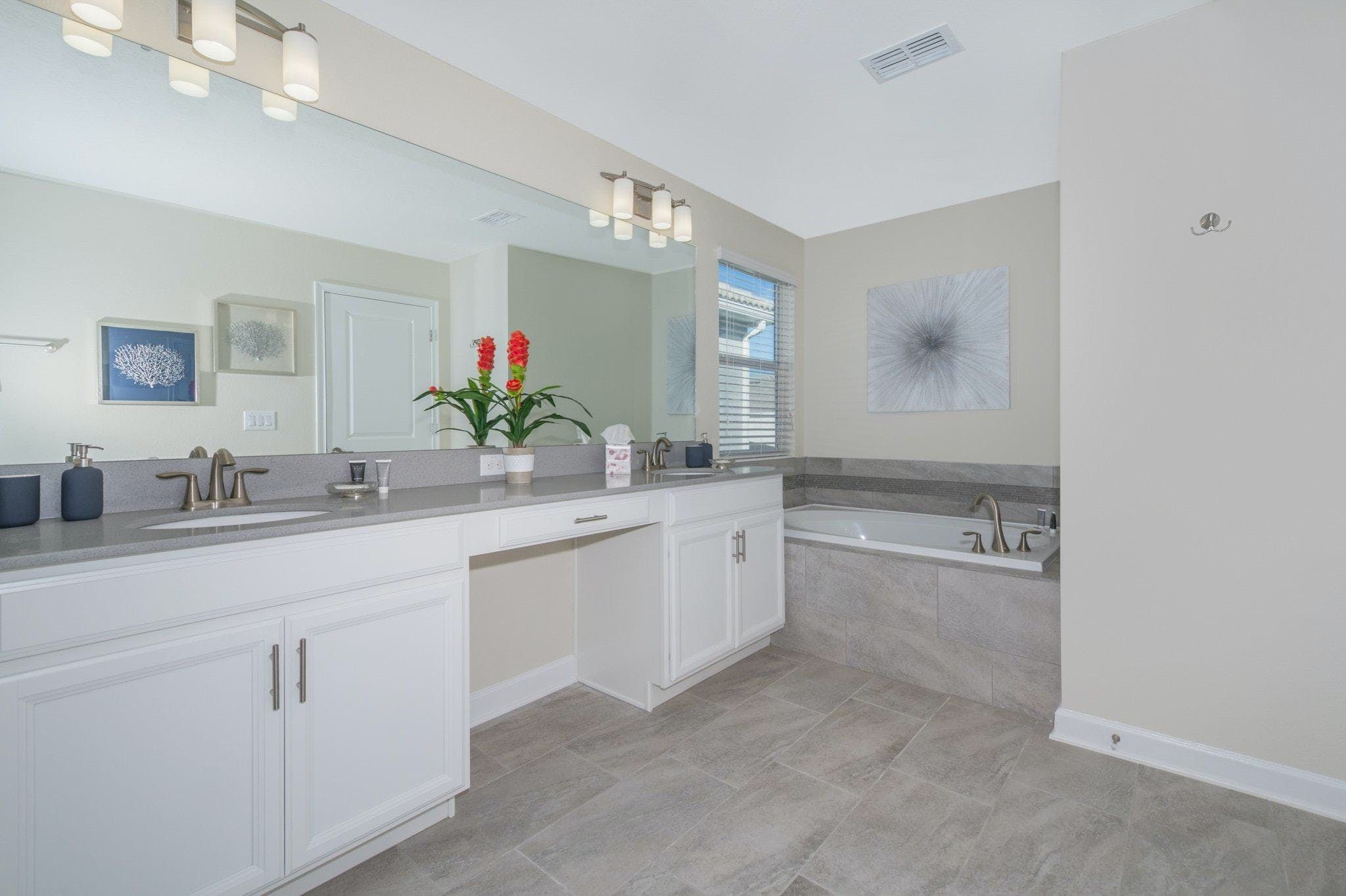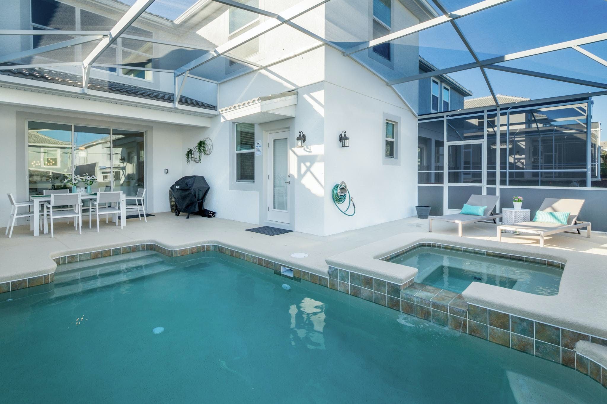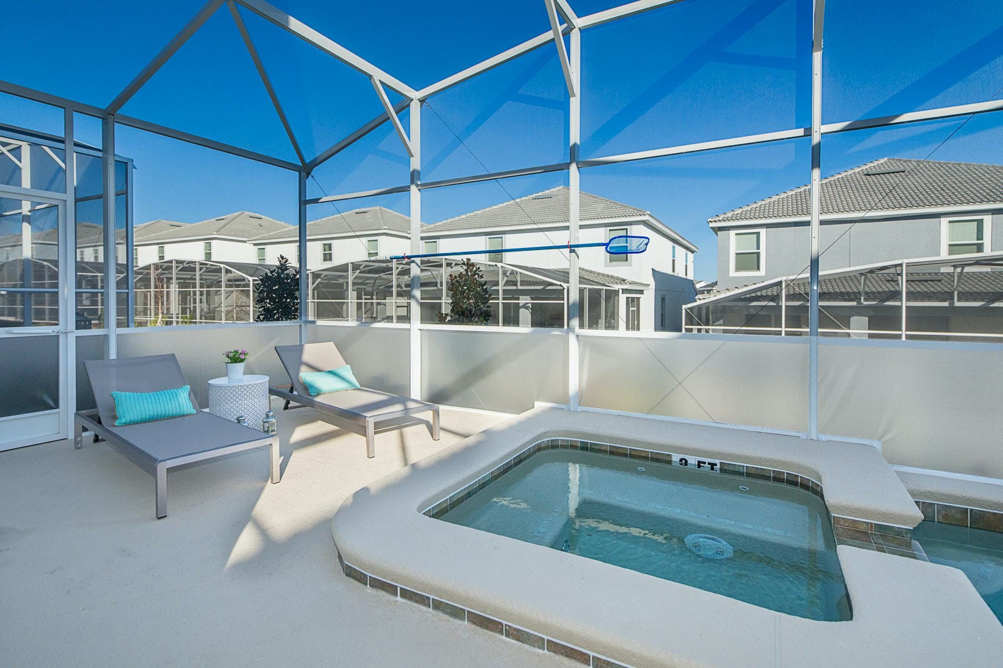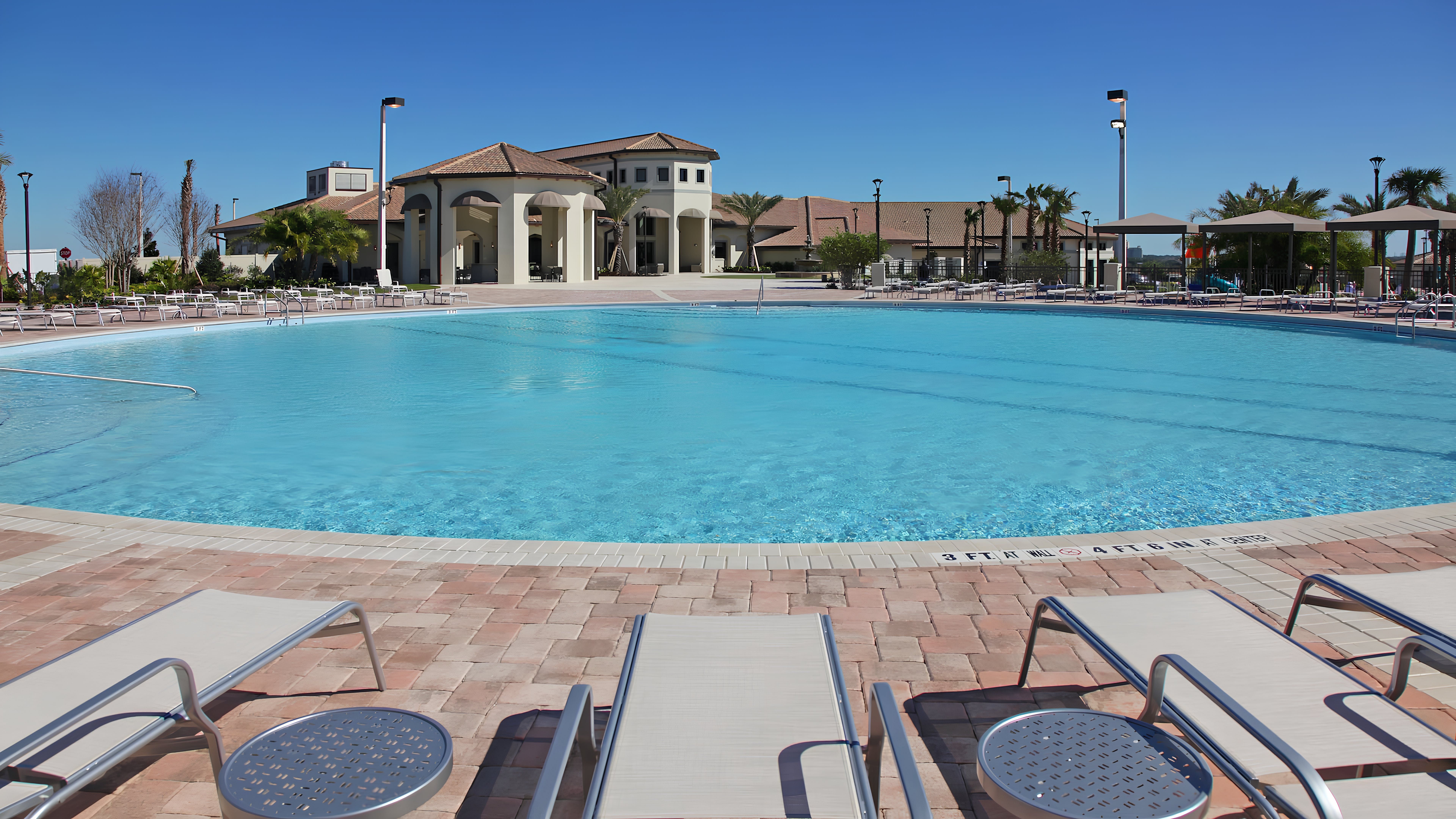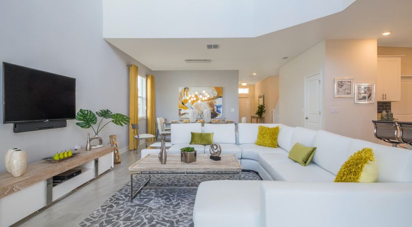 This luxurious single-family home is located in Champions Gate and boasts 5 bedrooms and 5 bathrooms. Two of the bedrooms are located downstairs, while the fully equipped kitchen and private game room with a pool table can be found on the main floor. The screened private pool and spa provide a relaxing retreat, while the garage has been converted into a game room for added entertainment. The property also includes private parking and is newly furnished and decorated. Guests will have access to internet and cable during their stay. The home is conveniently located close to Disney, restaurants, and shopping centers. Additionally, guests will have access to the resort's clubhouse amenities which include two pools (including a lazy river), a restaurant, gym, business center, and more.