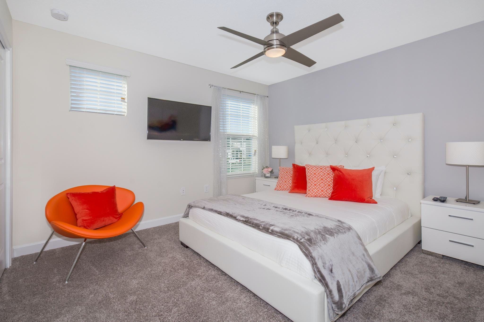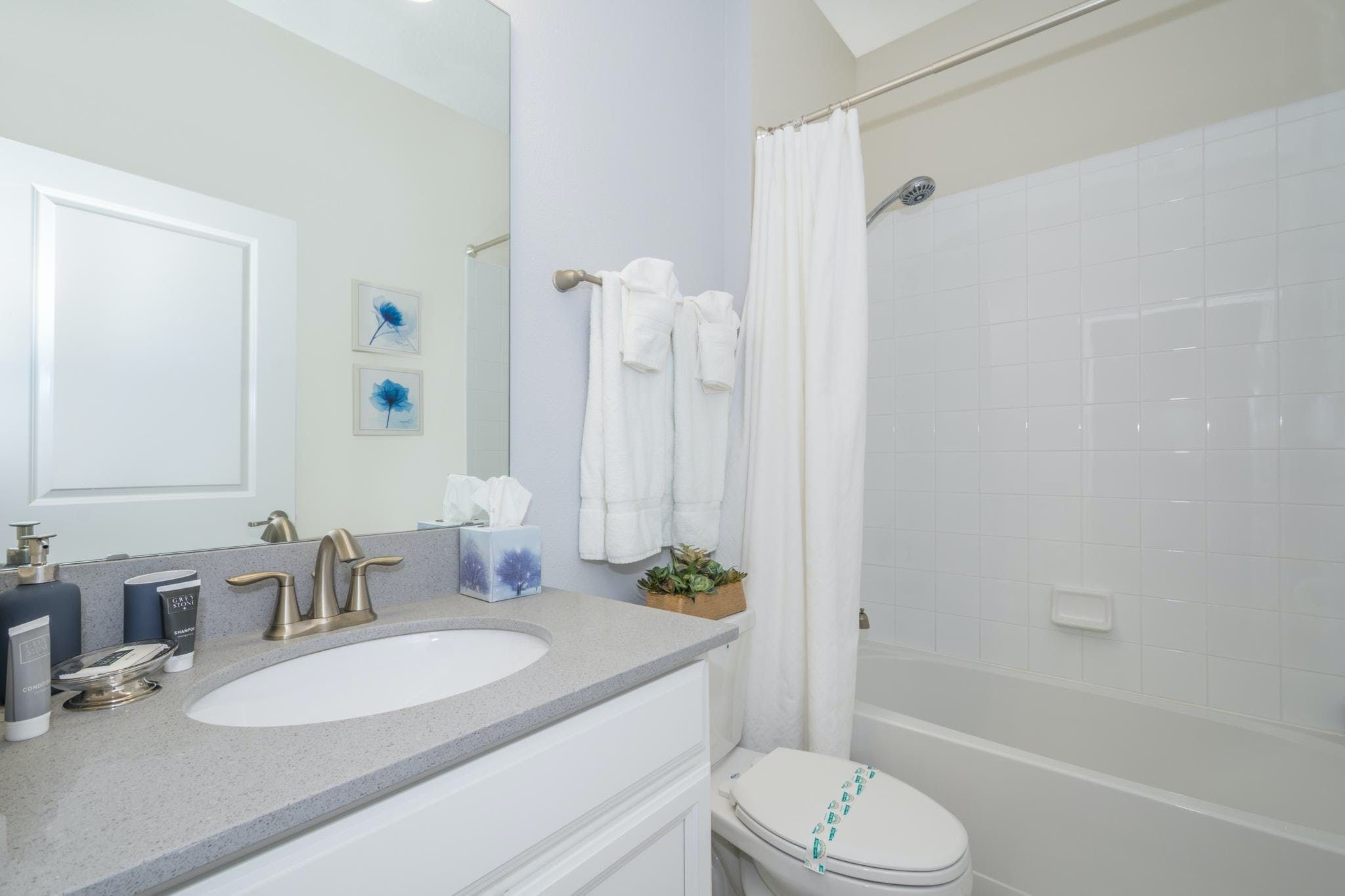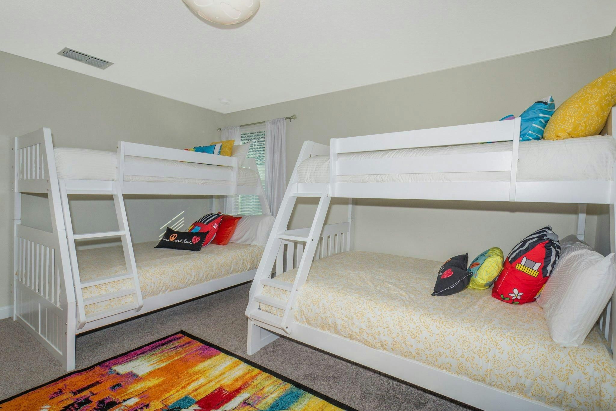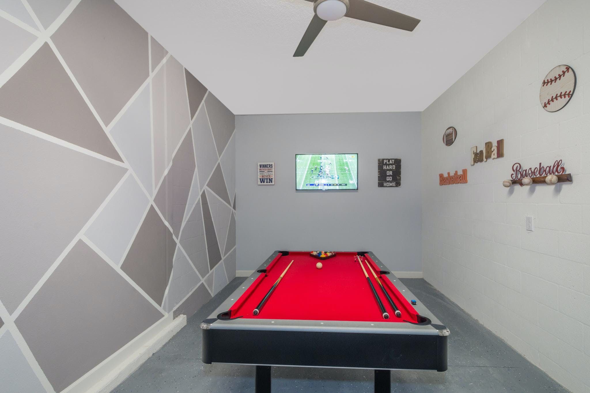 This luxurious single-family home is located in Champions Gate and boasts 5 bedrooms and 5 bathrooms. Two of the bedrooms are located downstairs, while the fully equipped kitchen and private game room with a pool table can be found on the main floor. The screened private pool and spa provide a relaxing retreat, while the garage has been converted into a game room for added entertainment. The property also includes private parking and is newly furnished and decorated. Guests will have access to internet and cable during their stay. The home is conveniently located close to Disney, restaurants, and shopping centers. Additionally, guests will have access to the resort's clubhouse amenities which include two pools (including a lazy river), a restaurant, gym, business center, and more.