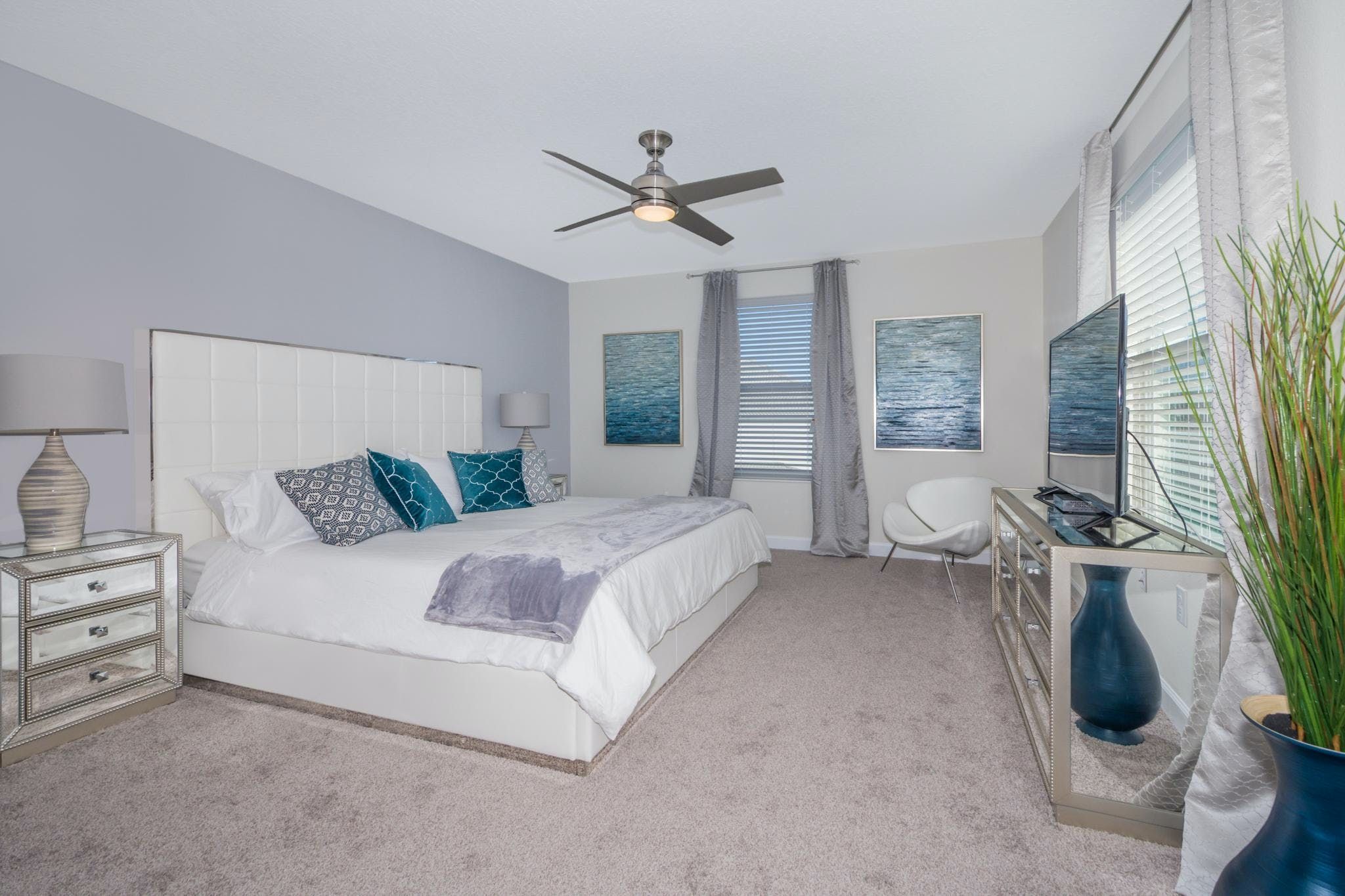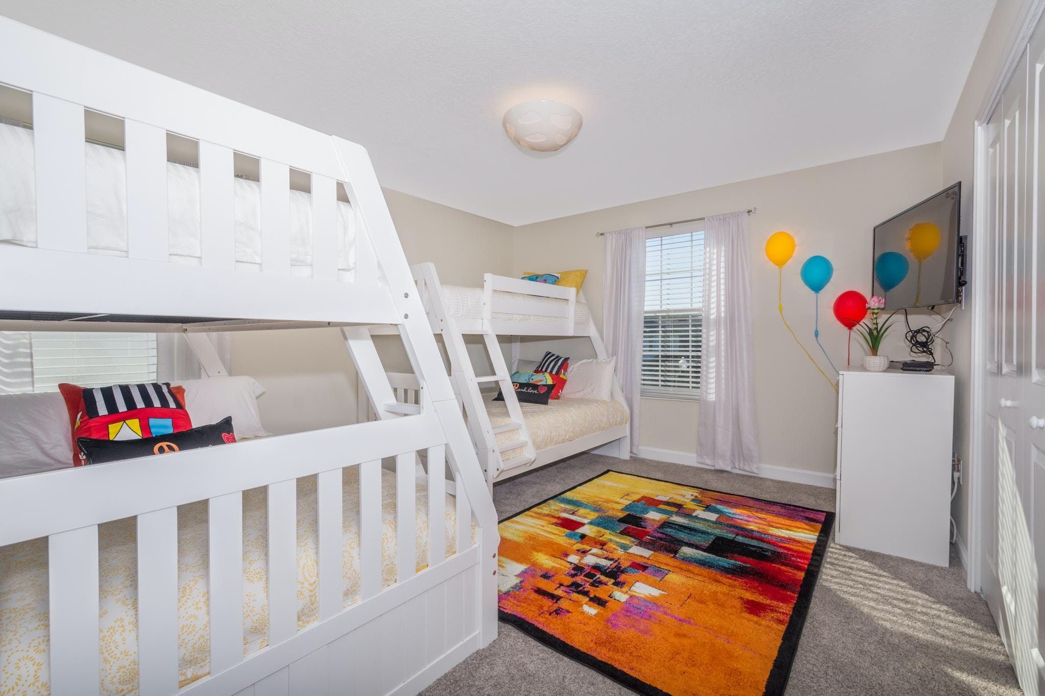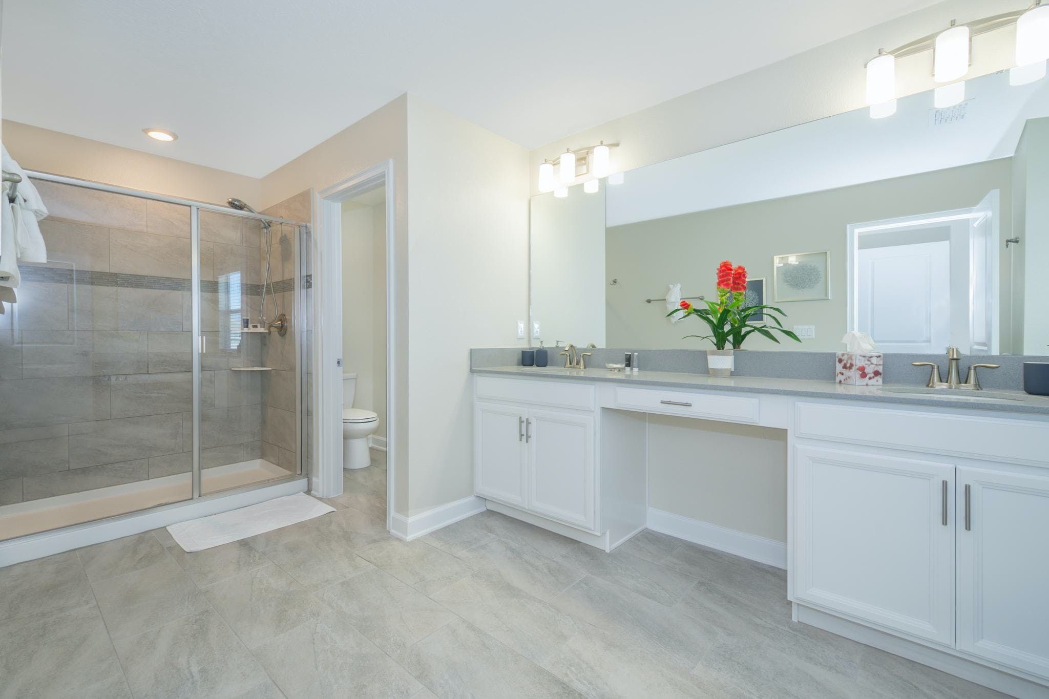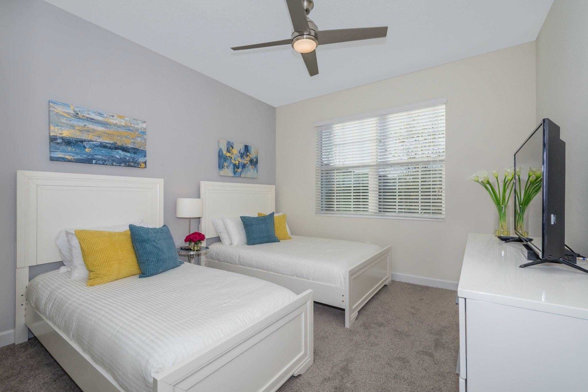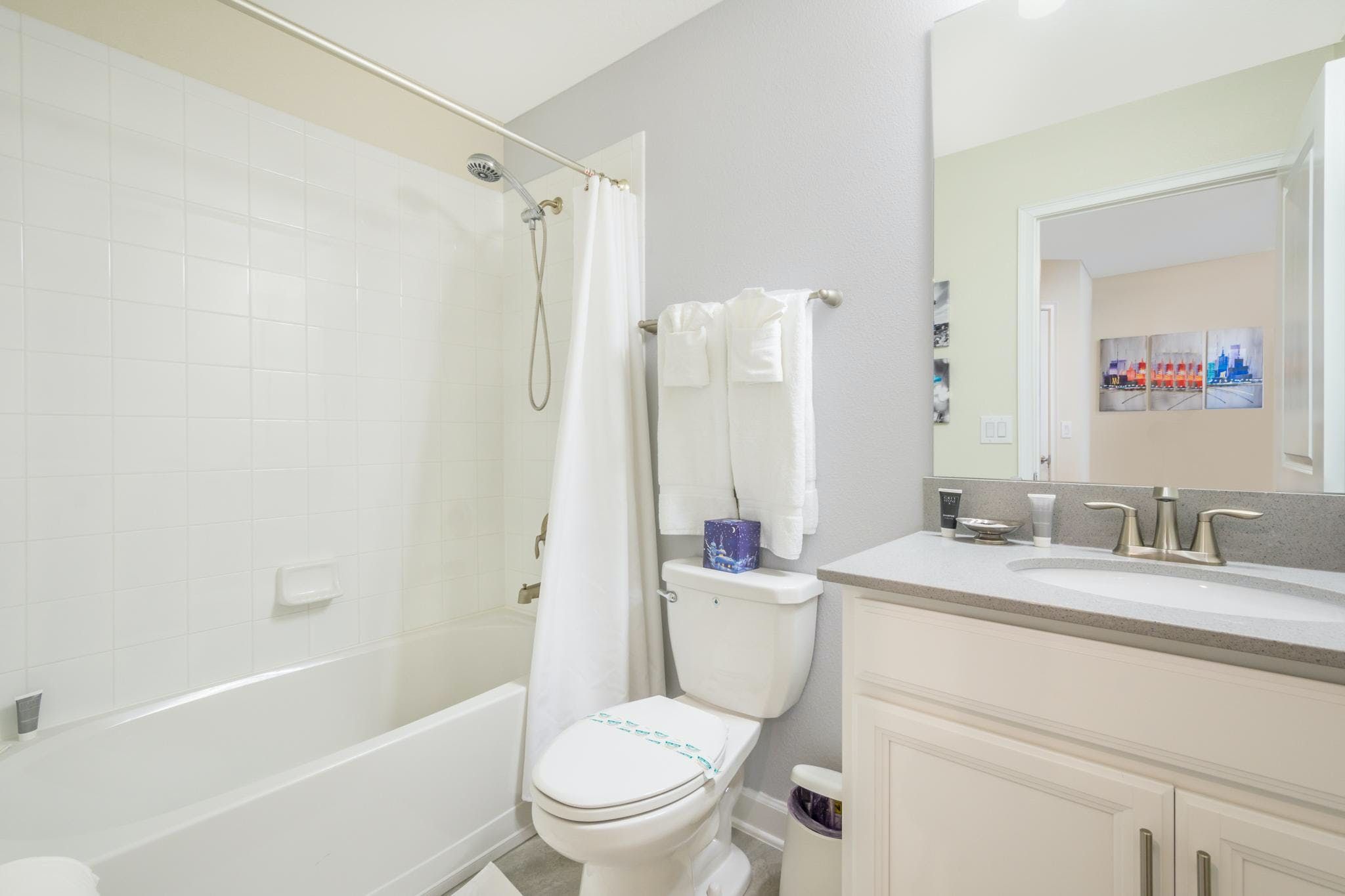 This luxurious single-family home is located in Champions Gate and boasts 5 bedrooms and 5 bathrooms. Two of the bedrooms are located downstairs, while the fully equipped kitchen and private game room with a pool table can be found on the main floor. The screened private pool and spa provide a relaxing retreat, while the garage has been converted into a game room for added entertainment. The property also includes private parking and is newly furnished and decorated. Guests will have access to internet and cable during their stay. The home is conveniently located close to Disney, restaurants, and shopping centers. Additionally, guests will have access to the resort's clubhouse amenities which include two pools (including a lazy river), a restaurant, gym, business center, and more.