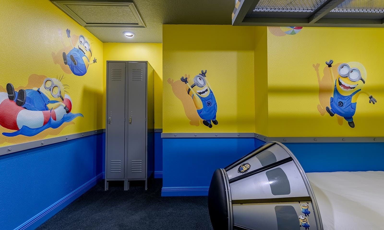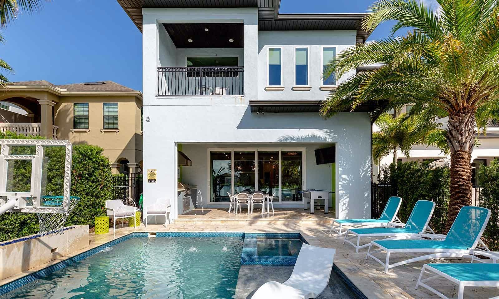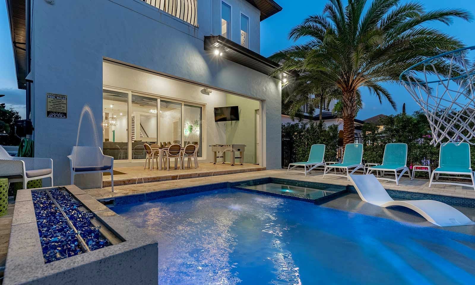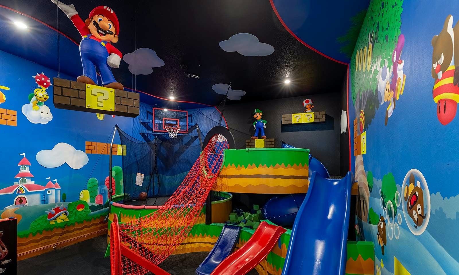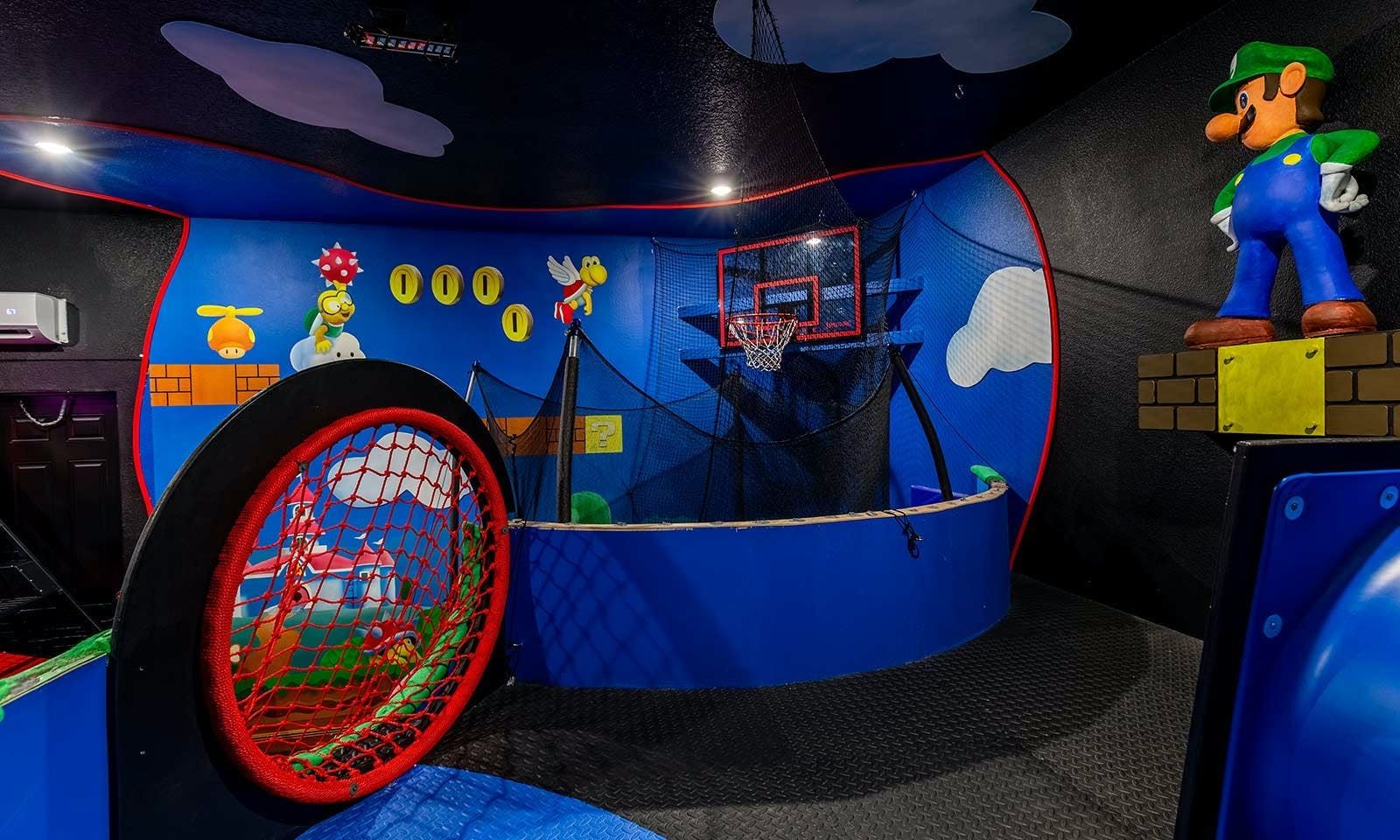 This 6-bed/5-bath villa in Orlando is perfect for a family vacation. The villa features two epic-themed bedrooms, including a Minions and Ironman bedroom, that will keep the kids entertained all night long. The Mario-themed game room has everything a kid could want, including slides, nets, basketball hoops, Nintendo Switch and PS4 consoles connected to two large flat-screen TVs. The private swimming pool and spillover spa offer stunning views of palm trees and water. The outdoor entertainment area includes family foosball or giant Connect Four tournaments and a summer kitchen grill for barbecuing. The indoor kitchen is fully equipped with modern appliances and cookware. The dining area seats 12 guests comfortably. Relax in the living area with velvety sofas and armchairs surrounding a fireplace and smart TV. There are four other spacious king and queen-size bedrooms available, each with en suite bathrooms. Don't miss out on the third-floor suite with two Queen-size beds, a mini fridge, sofa and accent chair, and private balcony access with seating overlooking the pool deck.
