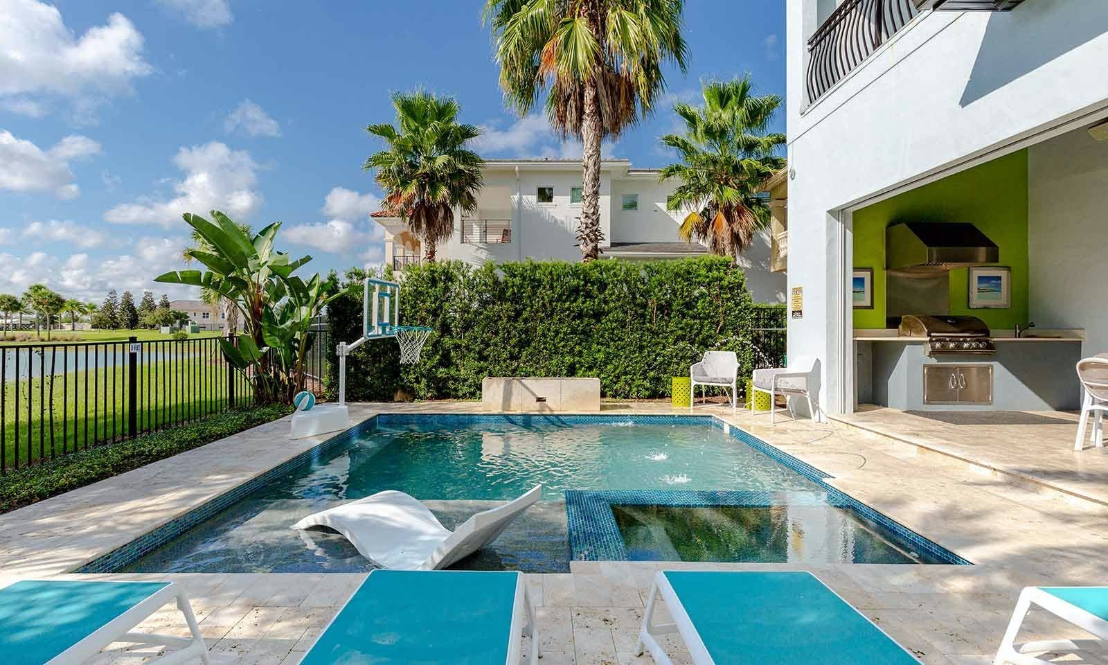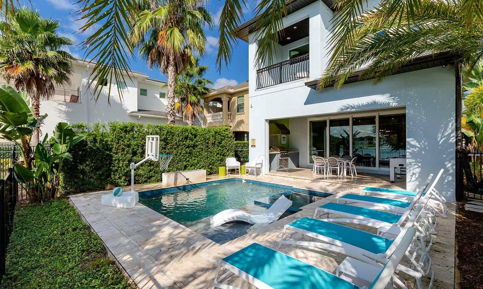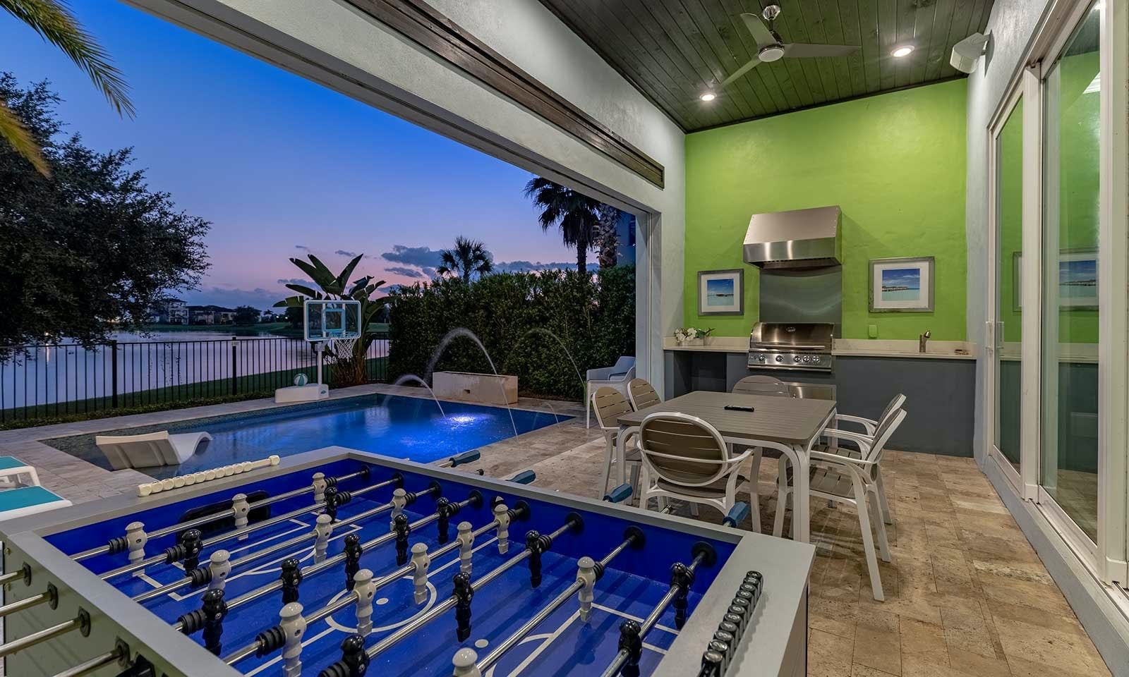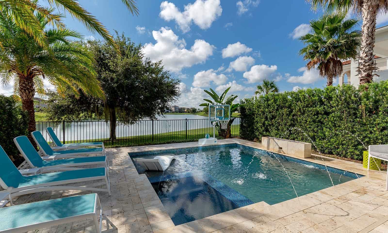 This 6-bed/5-bath villa in Orlando is perfect for a family vacation. The villa features two epic-themed bedrooms, including a Minions and Ironman bedroom, that will keep the kids entertained all night long. The Mario-themed game room has everything a kid could want, including slides, nets, basketball hoops, Nintendo Switch and PS4 consoles connected to two large flat-screen TVs. The private swimming pool and spillover spa offer stunning views of palm trees and water. The outdoor entertainment area includes family foosball or giant Connect Four tournaments and a summer kitchen grill for barbecuing. The indoor kitchen is fully equipped with modern appliances and cookware. The dining area seats 12 guests comfortably. Relax in the living area with velvety sofas and armchairs surrounding a fireplace and smart TV. There are four other spacious king and queen-size bedrooms available, each with en suite bathrooms. Don't miss out on the third-floor suite with two Queen-size beds, a mini fridge, sofa and accent chair, and private balcony access with seating overlooking the pool deck.