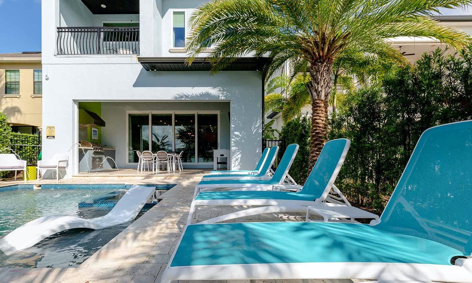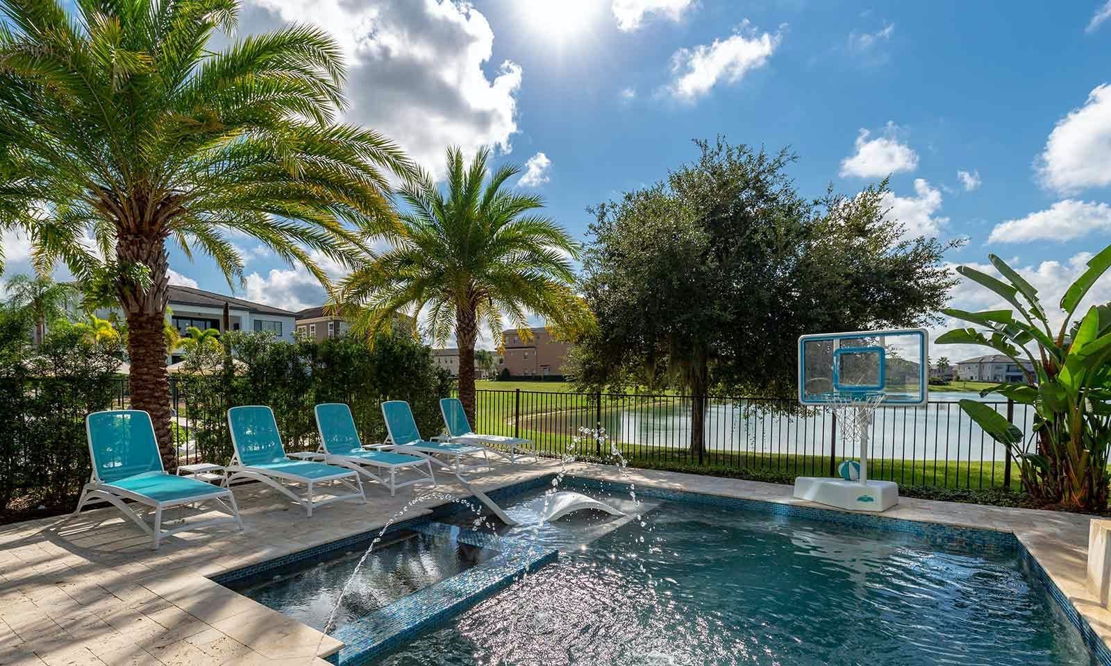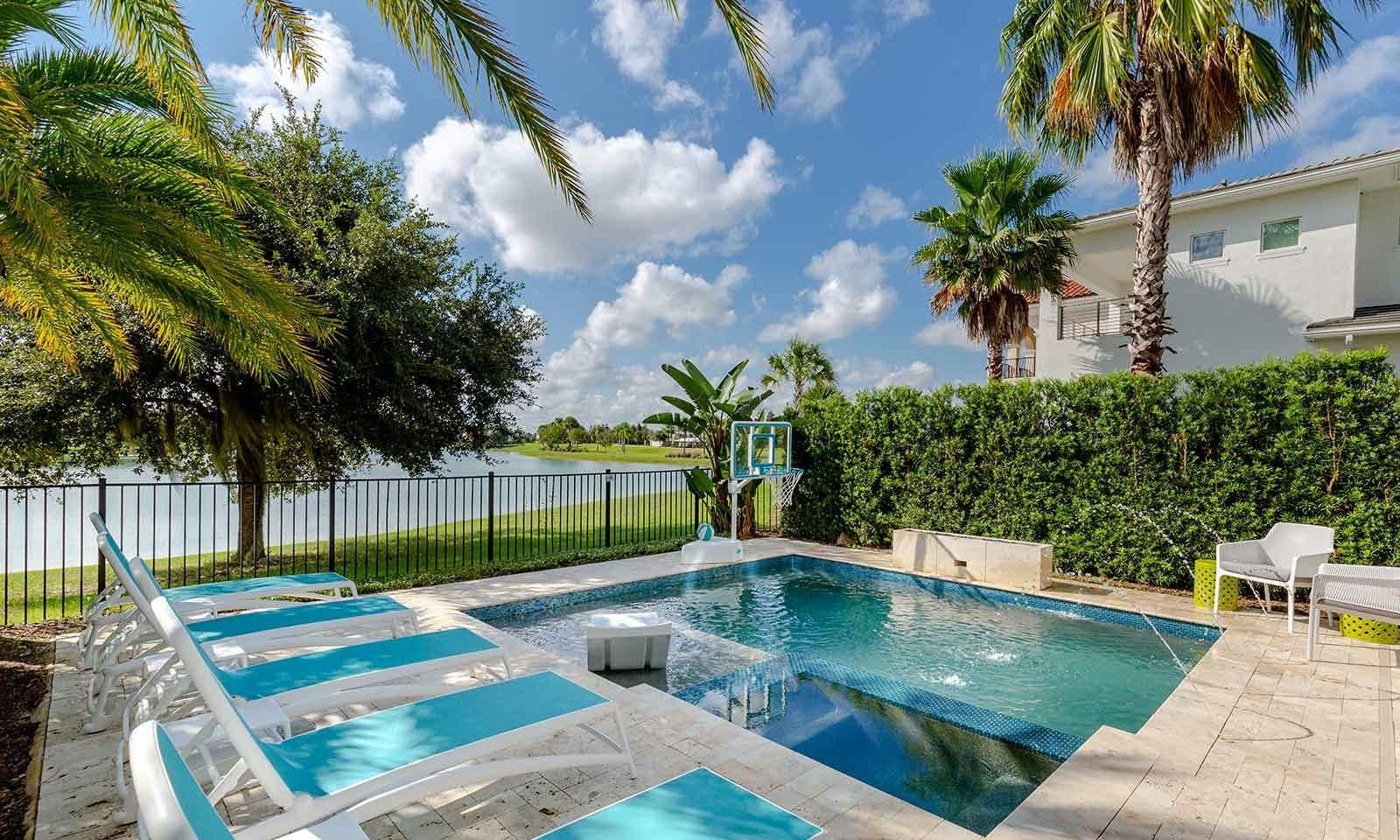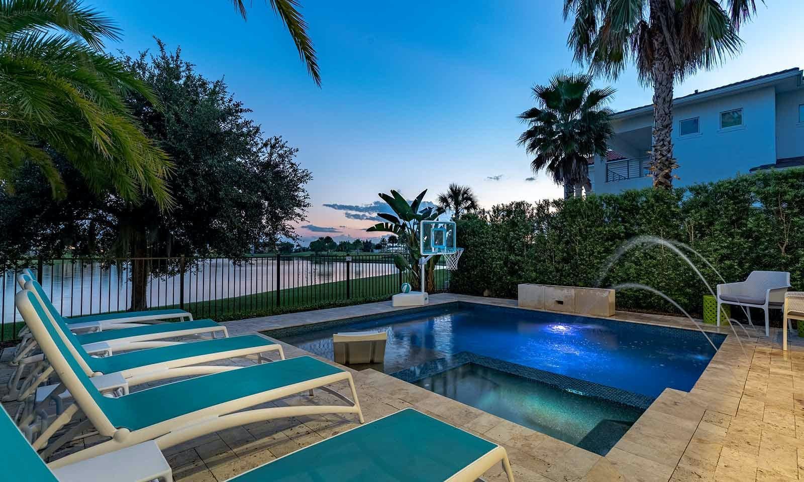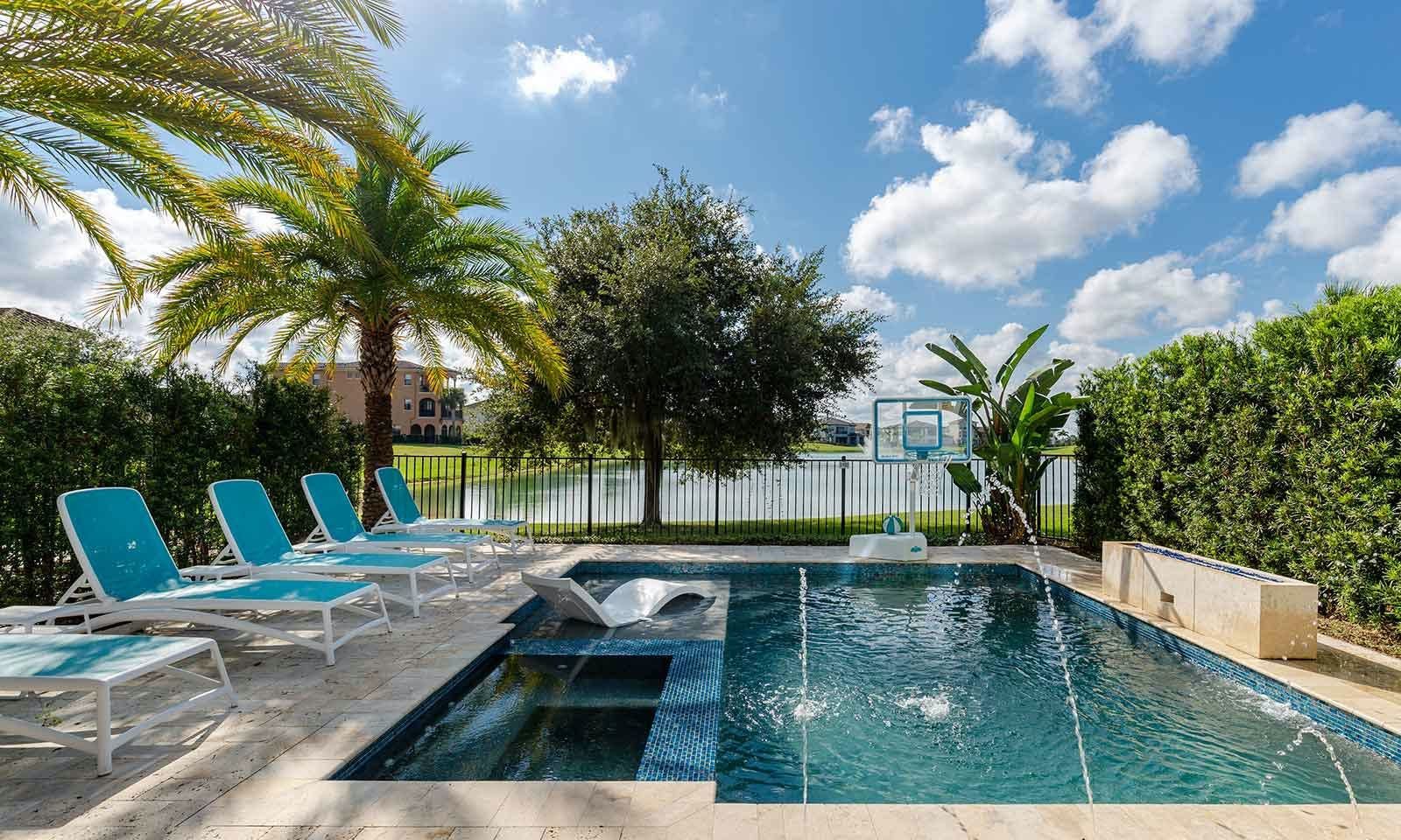 This 6-bed/5-bath villa in Orlando is perfect for a family vacation. The villa features two epic-themed bedrooms, including a Minions and Ironman bedroom, that will keep the kids entertained all night long. The Mario-themed game room has everything a kid could want, including slides, nets, basketball hoops, Nintendo Switch and PS4 consoles connected to two large flat-screen TVs. The private swimming pool and spillover spa offer stunning views of palm trees and water. The outdoor entertainment area includes family foosball or giant Connect Four tournaments and a summer kitchen grill for barbecuing. The indoor kitchen is fully equipped with modern appliances and cookware. The dining area seats 12 guests comfortably. Relax in the living area with velvety sofas and armchairs surrounding a fireplace and smart TV. There are four other spacious king and queen-size bedrooms available, each with en suite bathrooms. Don't miss out on the third-floor suite with two Queen-size beds, a mini fridge, sofa and accent chair, and private balcony access with seating overlooking the pool deck.