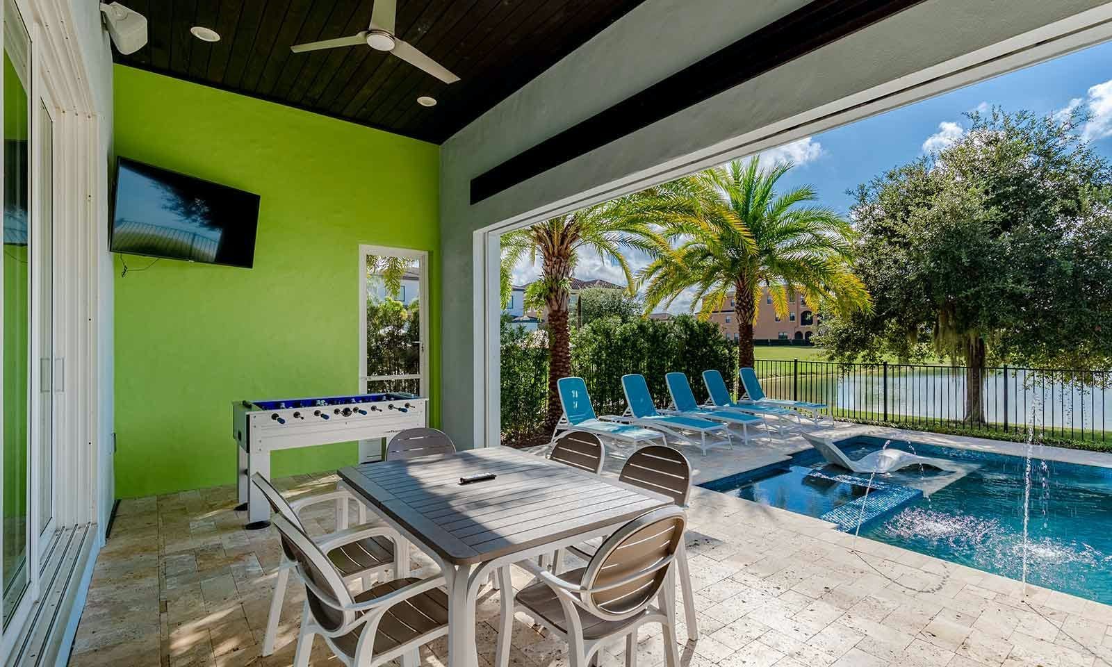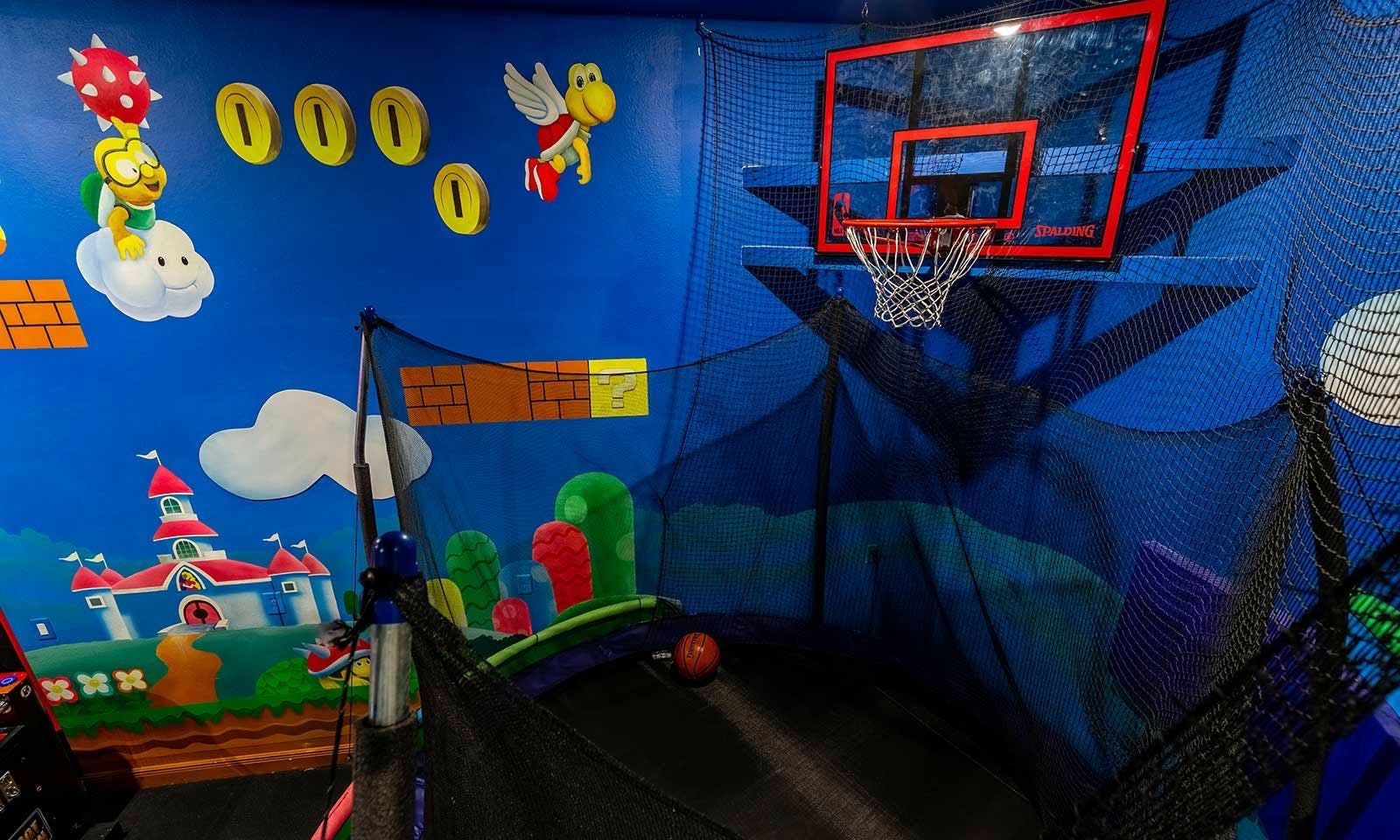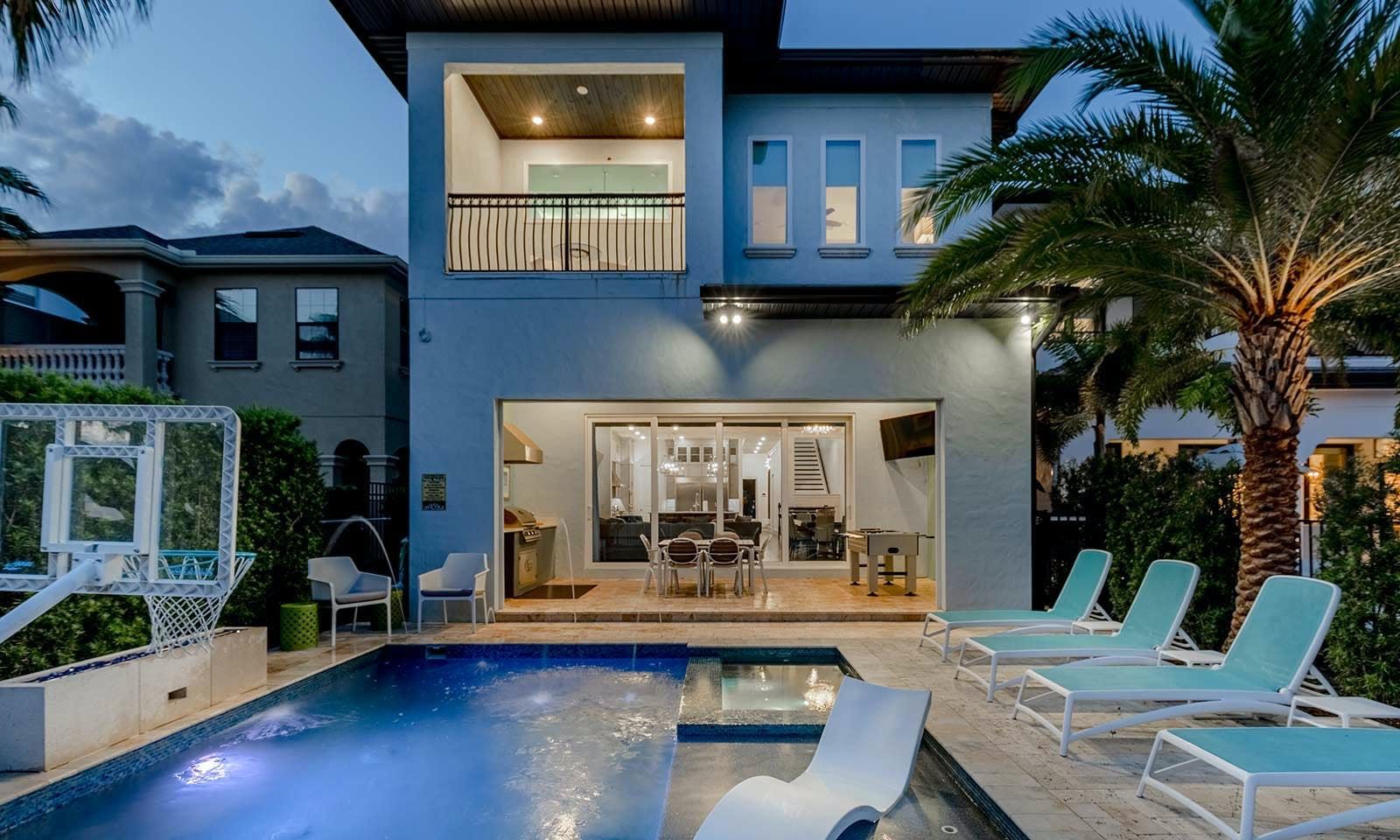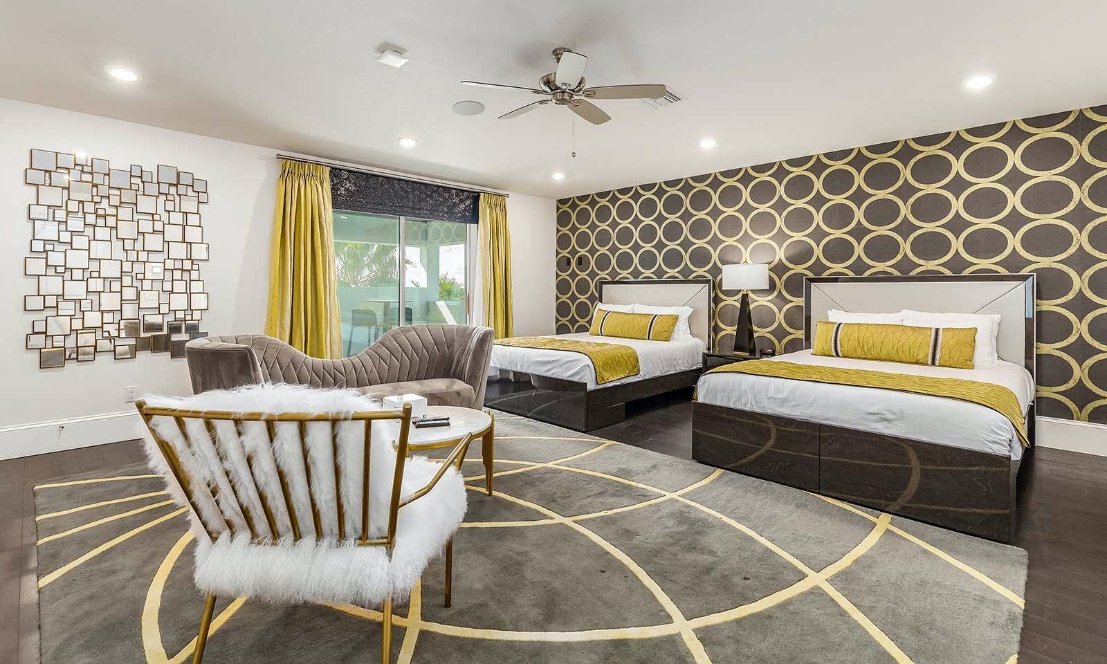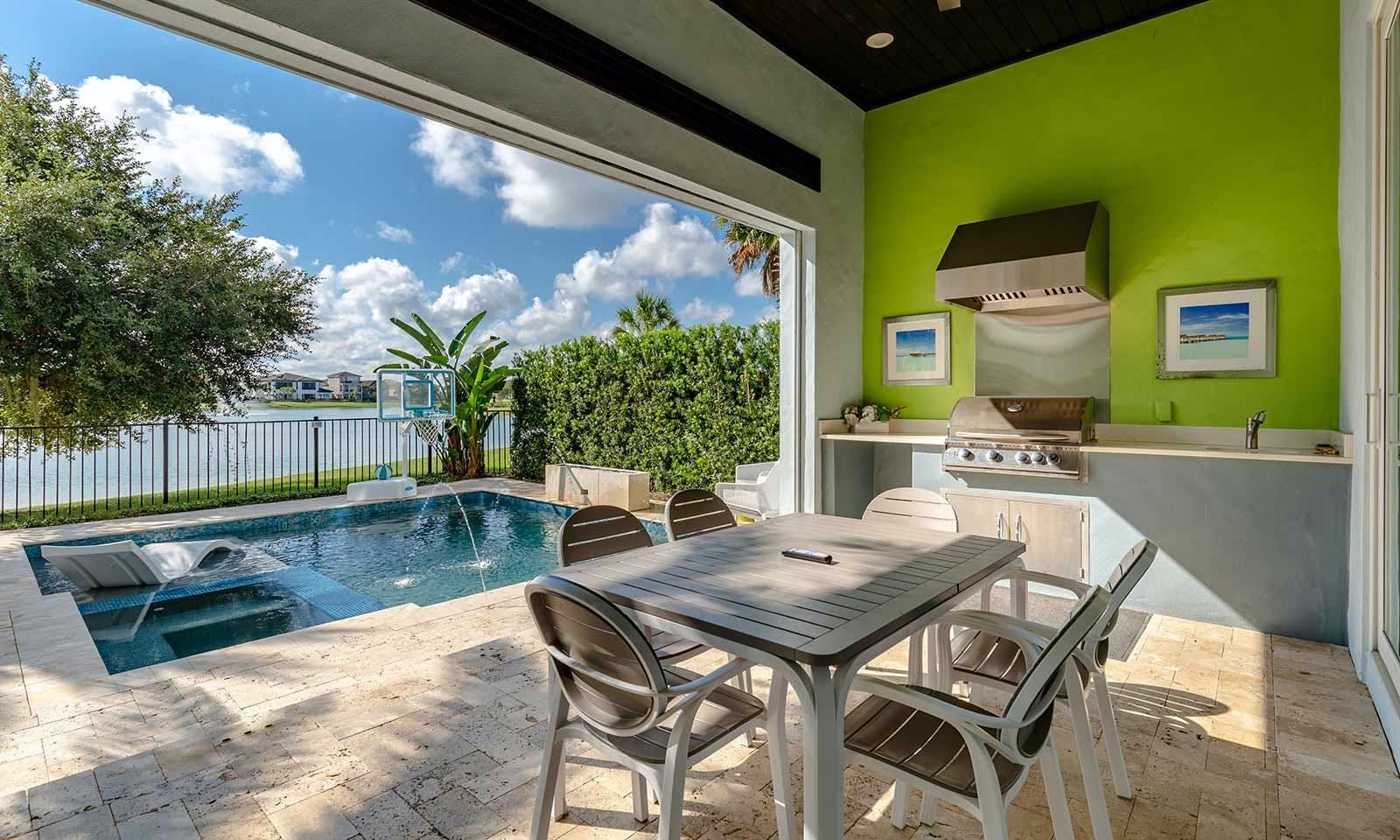This 6-bed/5-bath villa in Orlando is perfect for a family vacation. The villa features two epic-themed bedrooms, including a Minions and Ironman bedroom, that will keep the kids entertained all night long. The Mario-themed game room has everything a kid could want, including slides, nets, basketball hoops, Nintendo Switch and PS4 consoles connected to two large flat-screen TVs. The private swimming pool and spillover spa offer stunning views of palm trees and water. The outdoor entertainment area includes family foosball or giant Connect Four tournaments and a summer kitchen grill for barbecuing. The indoor kitchen is fully equipped with modern appliances and cookware. The dining area seats 12 guests comfortably. Relax in the living area with velvety sofas and armchairs surrounding a fireplace and smart TV. There are four other spacious king and queen-size bedrooms available, each with en suite bathrooms. Don't miss out on the third-floor suite with two Queen-size beds, a mini fridge, sofa and accent chair, and private balcony access with seating overlooking the pool deck.
