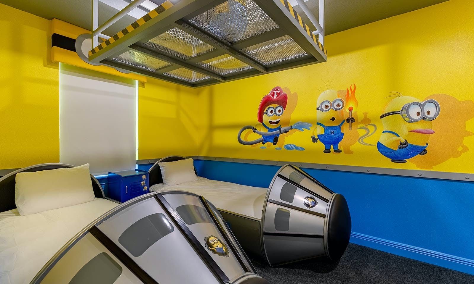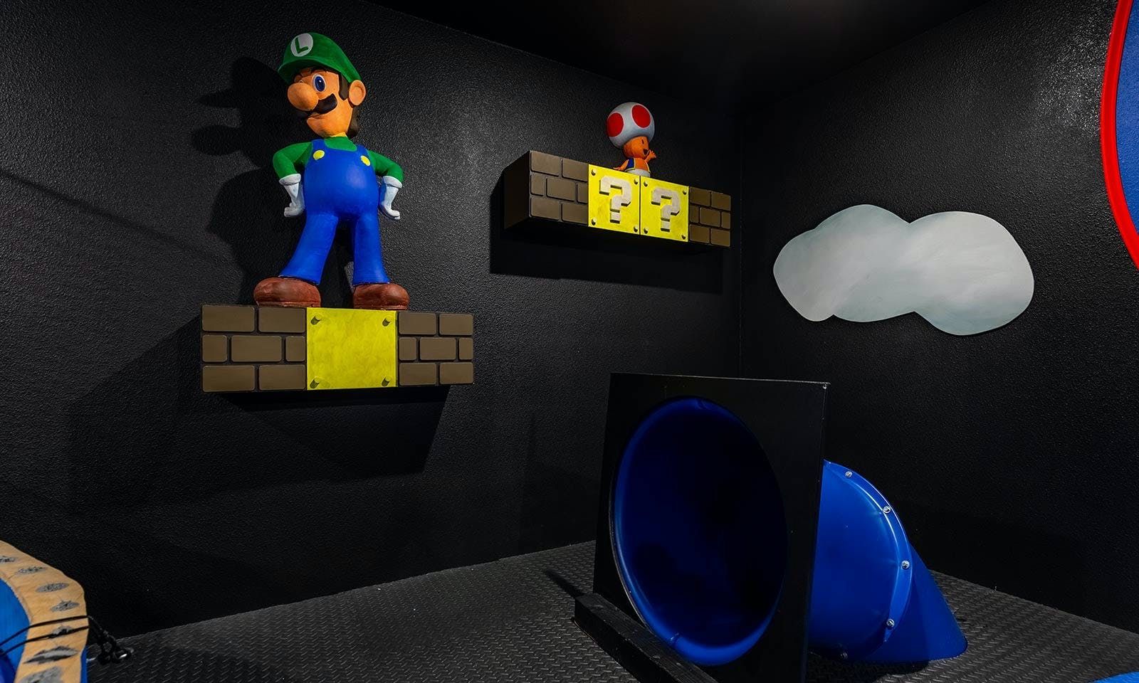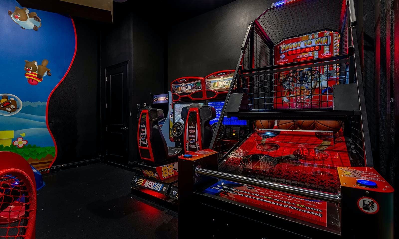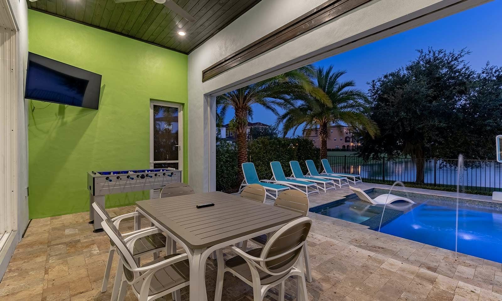 This 6-bed/5-bath villa in Orlando is perfect for a family vacation. The villa features two epic-themed bedrooms, including a Minions and Ironman bedroom, that will keep the kids entertained all night long. The Mario-themed game room has everything a kid could want, including slides, nets, basketball hoops, Nintendo Switch and PS4 consoles connected to two large flat-screen TVs. The private swimming pool and spillover spa offer stunning views of palm trees and water. The outdoor entertainment area includes family foosball or giant Connect Four tournaments and a summer kitchen grill for barbecuing. The indoor kitchen is fully equipped with modern appliances and cookware. The dining area seats 12 guests comfortably. Relax in the living area with velvety sofas and armchairs surrounding a fireplace and smart TV. There are four other spacious king and queen-size bedrooms available, each with en suite bathrooms. Don't miss out on the third-floor suite with two Queen-size beds, a mini fridge, sofa and accent chair, and private balcony access with seating overlooking the pool deck.