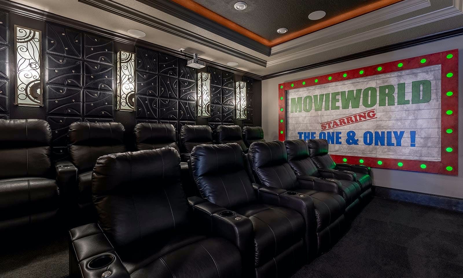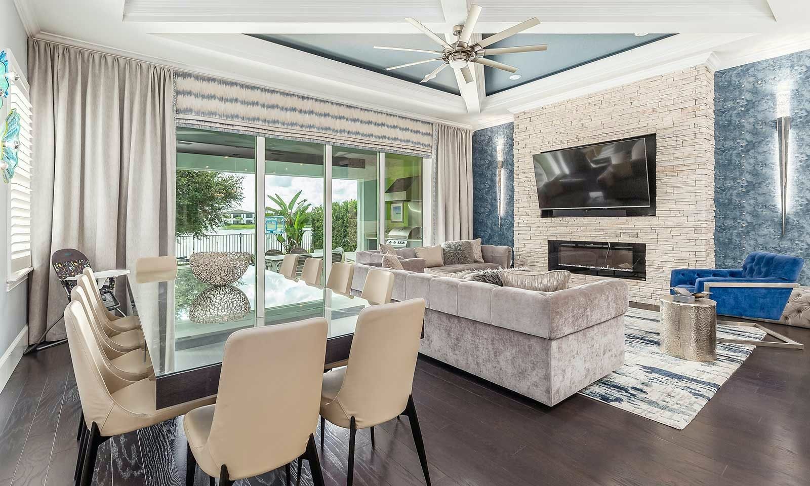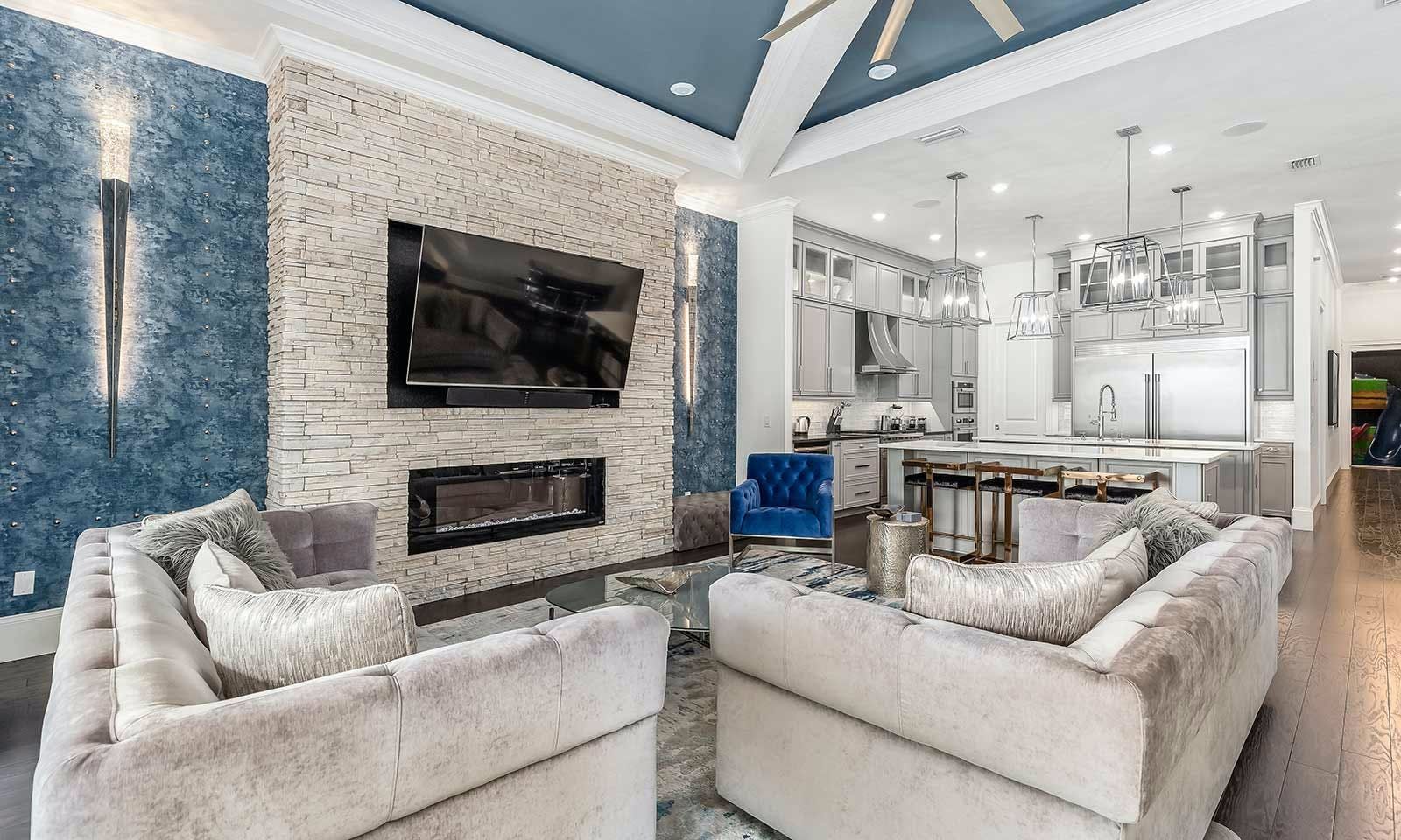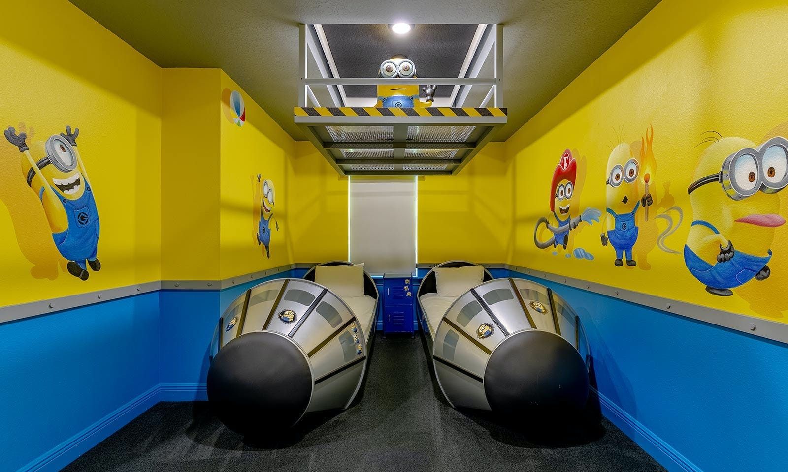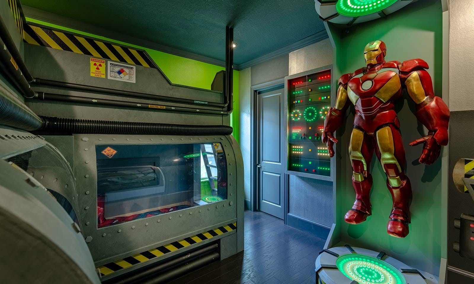 This 6-bed/5-bath villa in Orlando is perfect for a family vacation. The villa features two epic-themed bedrooms, including a Minions and Ironman bedroom, that will keep the kids entertained all night long. The Mario-themed game room has everything a kid could want, including slides, nets, basketball hoops, Nintendo Switch and PS4 consoles connected to two large flat-screen TVs. The private swimming pool and spillover spa offer stunning views of palm trees and water. The outdoor entertainment area includes family foosball or giant Connect Four tournaments and a summer kitchen grill for barbecuing. The indoor kitchen is fully equipped with modern appliances and cookware. The dining area seats 12 guests comfortably. Relax in the living area with velvety sofas and armchairs surrounding a fireplace and smart TV. There are four other spacious king and queen-size bedrooms available, each with en suite bathrooms. Don't miss out on the third-floor suite with two Queen-size beds, a mini fridge, sofa and accent chair, and private balcony access with seating overlooking the pool deck.