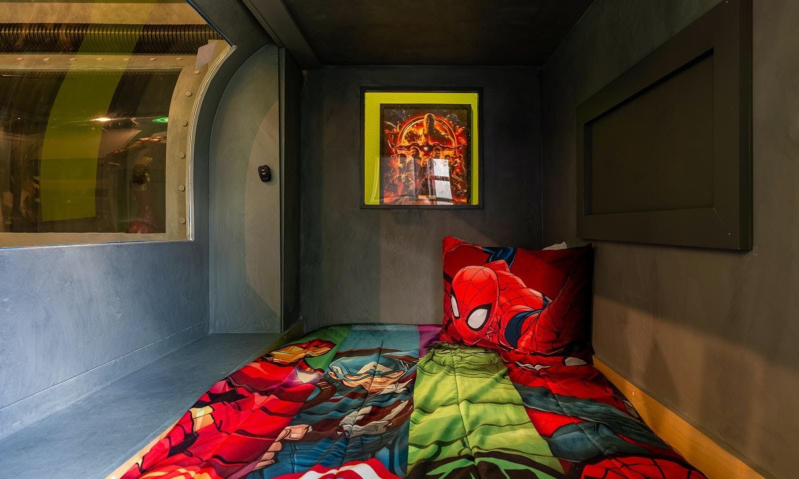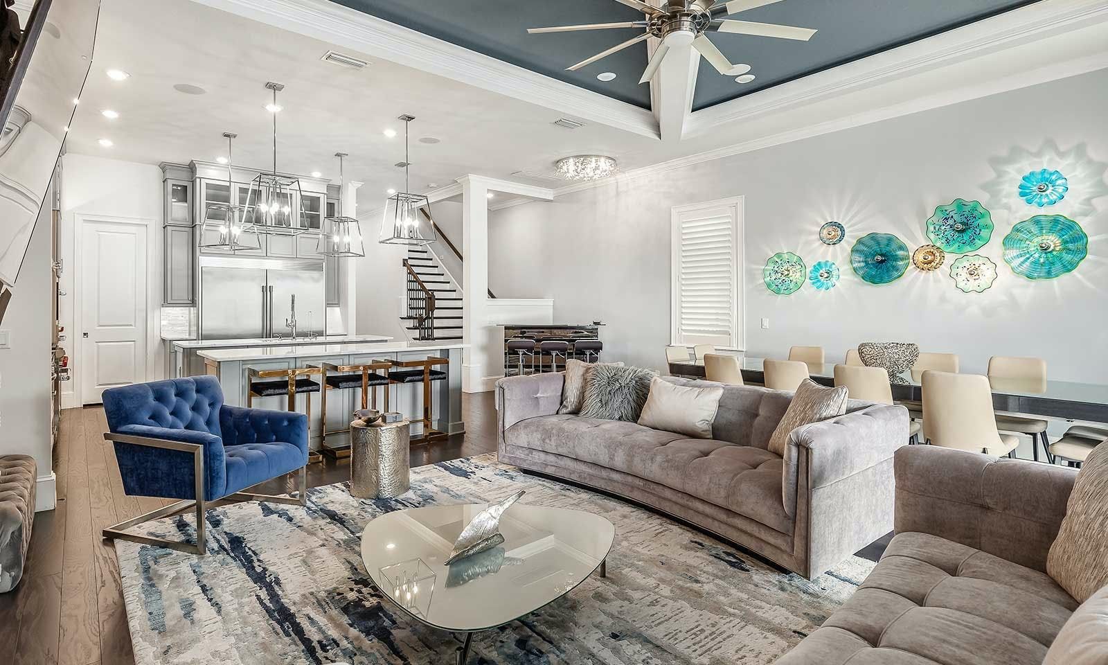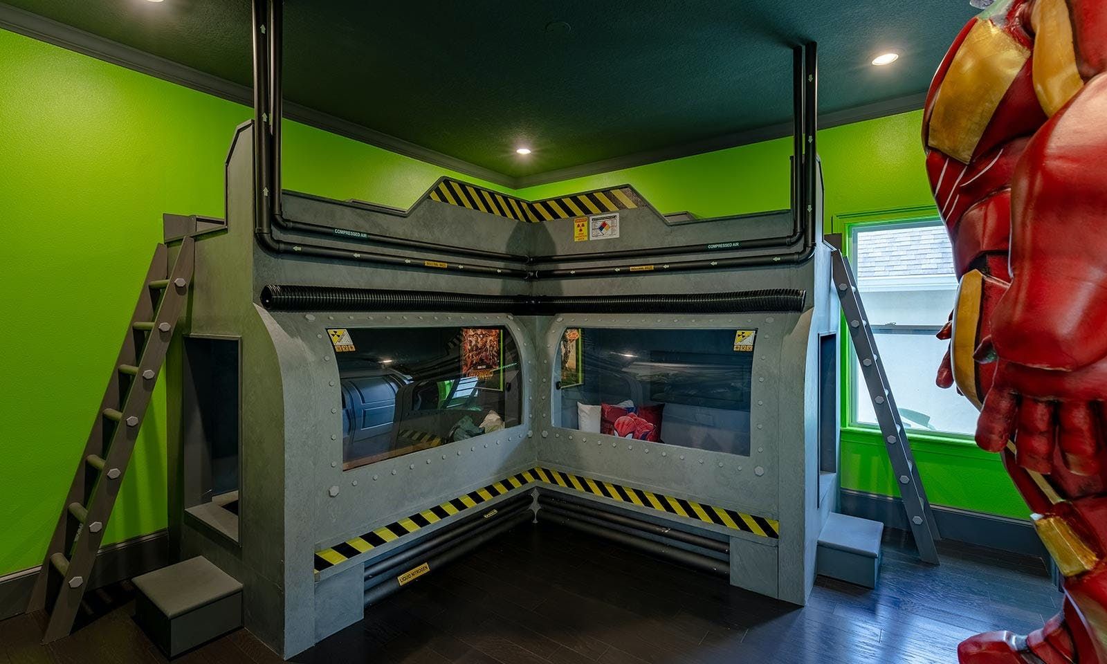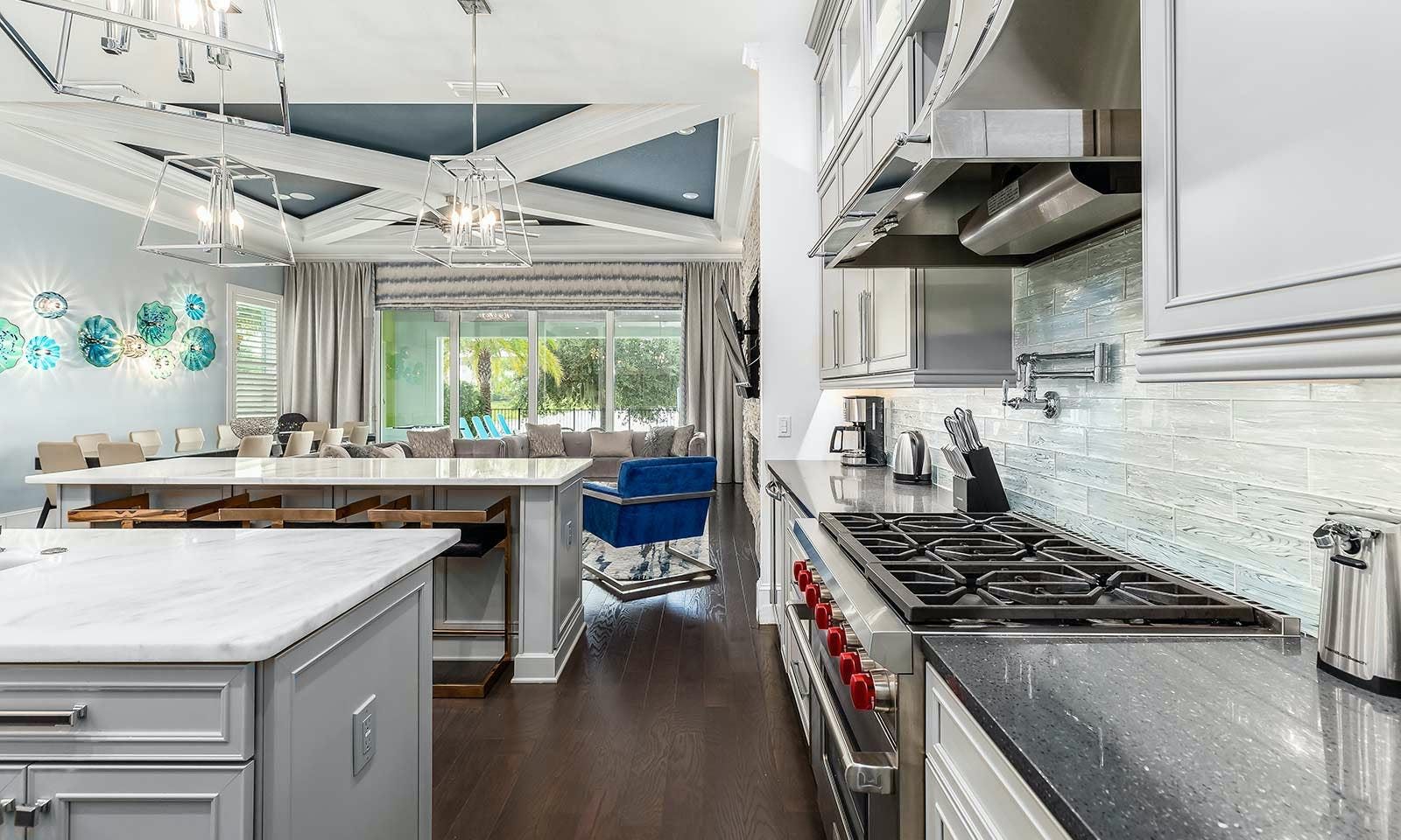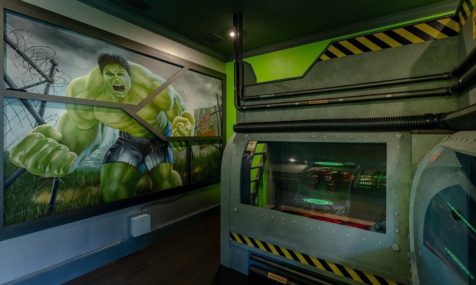 This 6-bed/5-bath villa in Orlando is perfect for a family vacation. The villa features two epic-themed bedrooms, including a Minions and Ironman bedroom, that will keep the kids entertained all night long. The Mario-themed game room has everything a kid could want, including slides, nets, basketball hoops, Nintendo Switch and PS4 consoles connected to two large flat-screen TVs. The private swimming pool and spillover spa offer stunning views of palm trees and water. The outdoor entertainment area includes family foosball or giant Connect Four tournaments and a summer kitchen grill for barbecuing. The indoor kitchen is fully equipped with modern appliances and cookware. The dining area seats 12 guests comfortably. Relax in the living area with velvety sofas and armchairs surrounding a fireplace and smart TV. There are four other spacious king and queen-size bedrooms available, each with en suite bathrooms. Don't miss out on the third-floor suite with two Queen-size beds, a mini fridge, sofa and accent chair, and private balcony access with seating overlooking the pool deck.