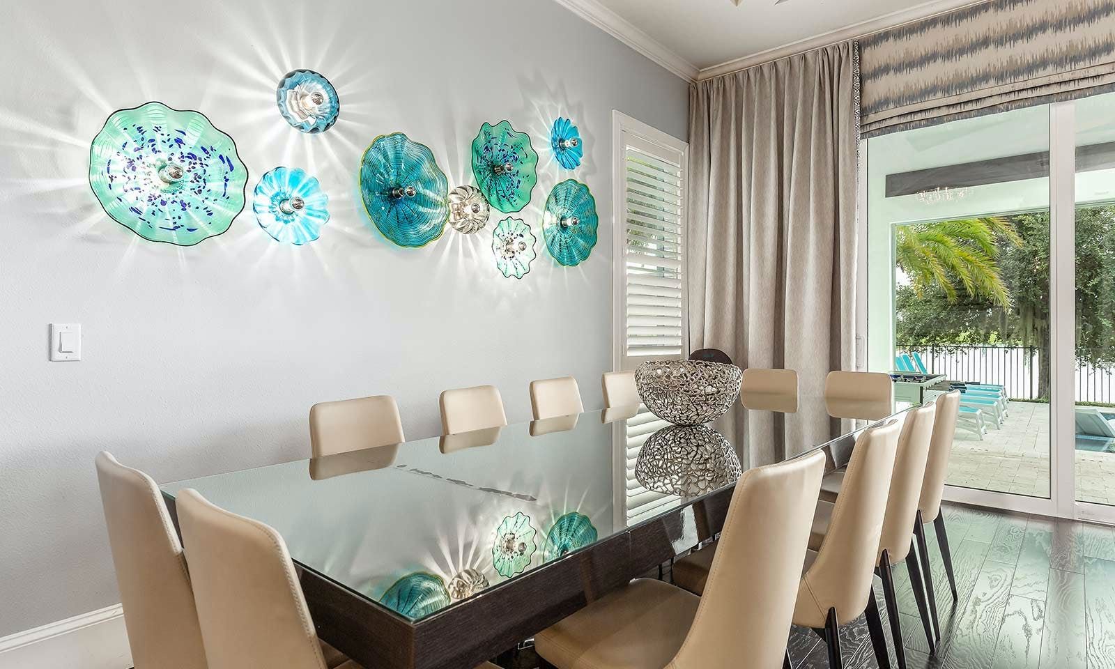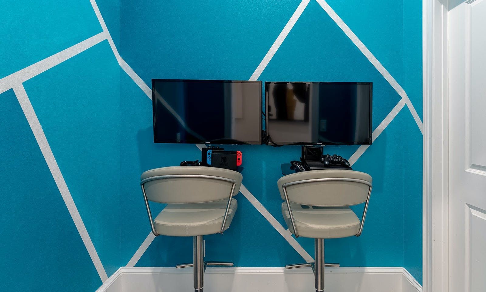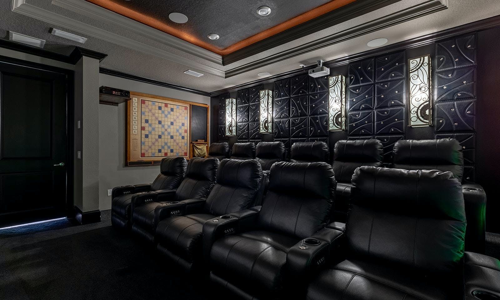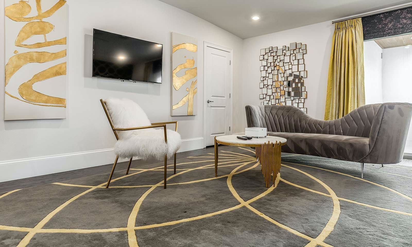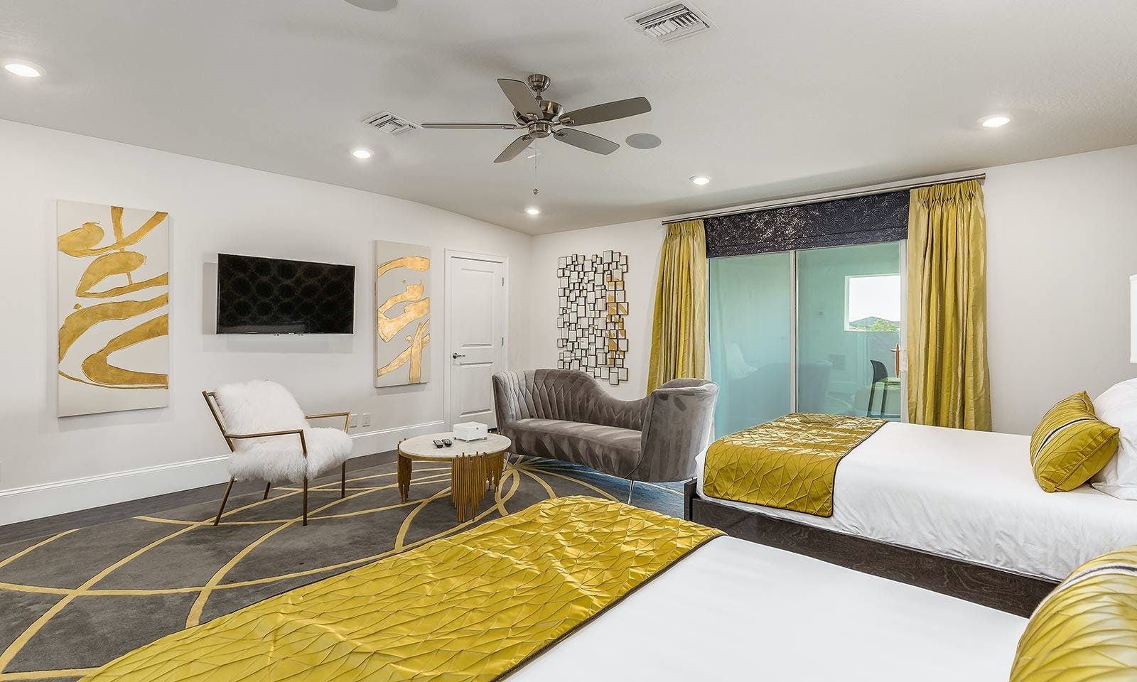 This 6-bed/5-bath villa in Orlando is perfect for a family vacation. The villa features two epic-themed bedrooms, including a Minions and Ironman bedroom, that will keep the kids entertained all night long. The Mario-themed game room has everything a kid could want, including slides, nets, basketball hoops, Nintendo Switch and PS4 consoles connected to two large flat-screen TVs. The private swimming pool and spillover spa offer stunning views of palm trees and water. The outdoor entertainment area includes family foosball or giant Connect Four tournaments and a summer kitchen grill for barbecuing. The indoor kitchen is fully equipped with modern appliances and cookware. The dining area seats 12 guests comfortably. Relax in the living area with velvety sofas and armchairs surrounding a fireplace and smart TV. There are four other spacious king and queen-size bedrooms available, each with en suite bathrooms. Don't miss out on the third-floor suite with two Queen-size beds, a mini fridge, sofa and accent chair, and private balcony access with seating overlooking the pool deck.