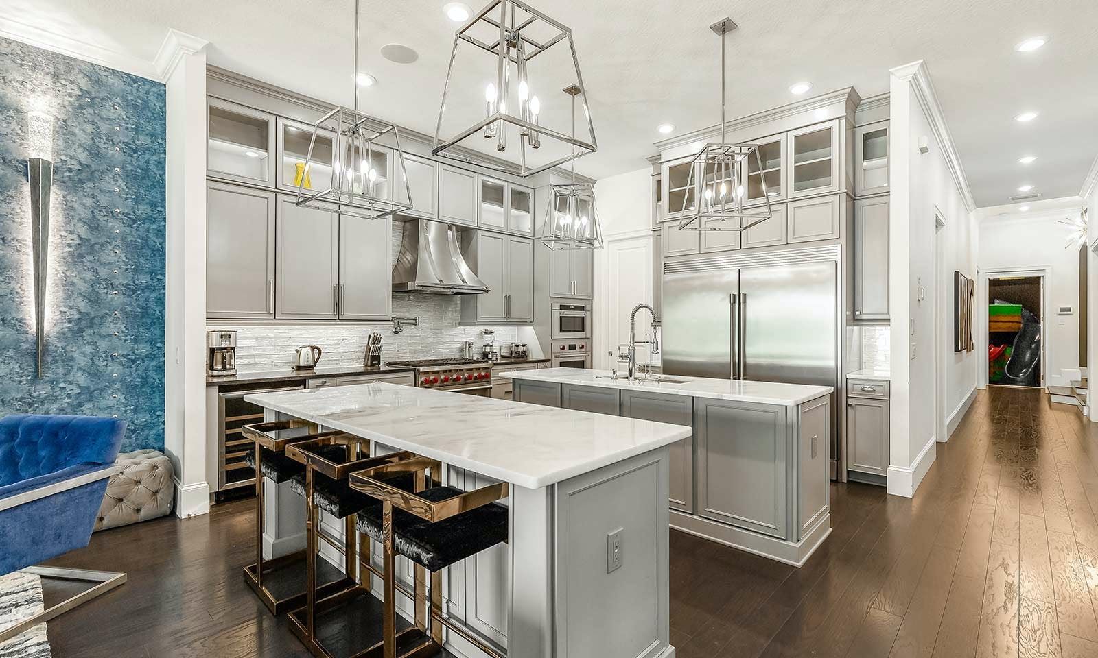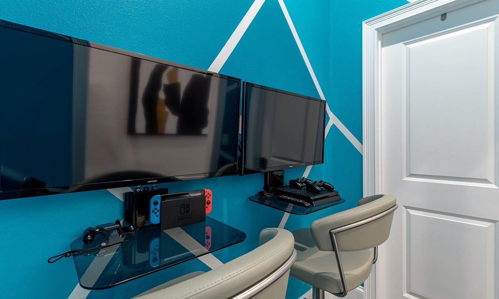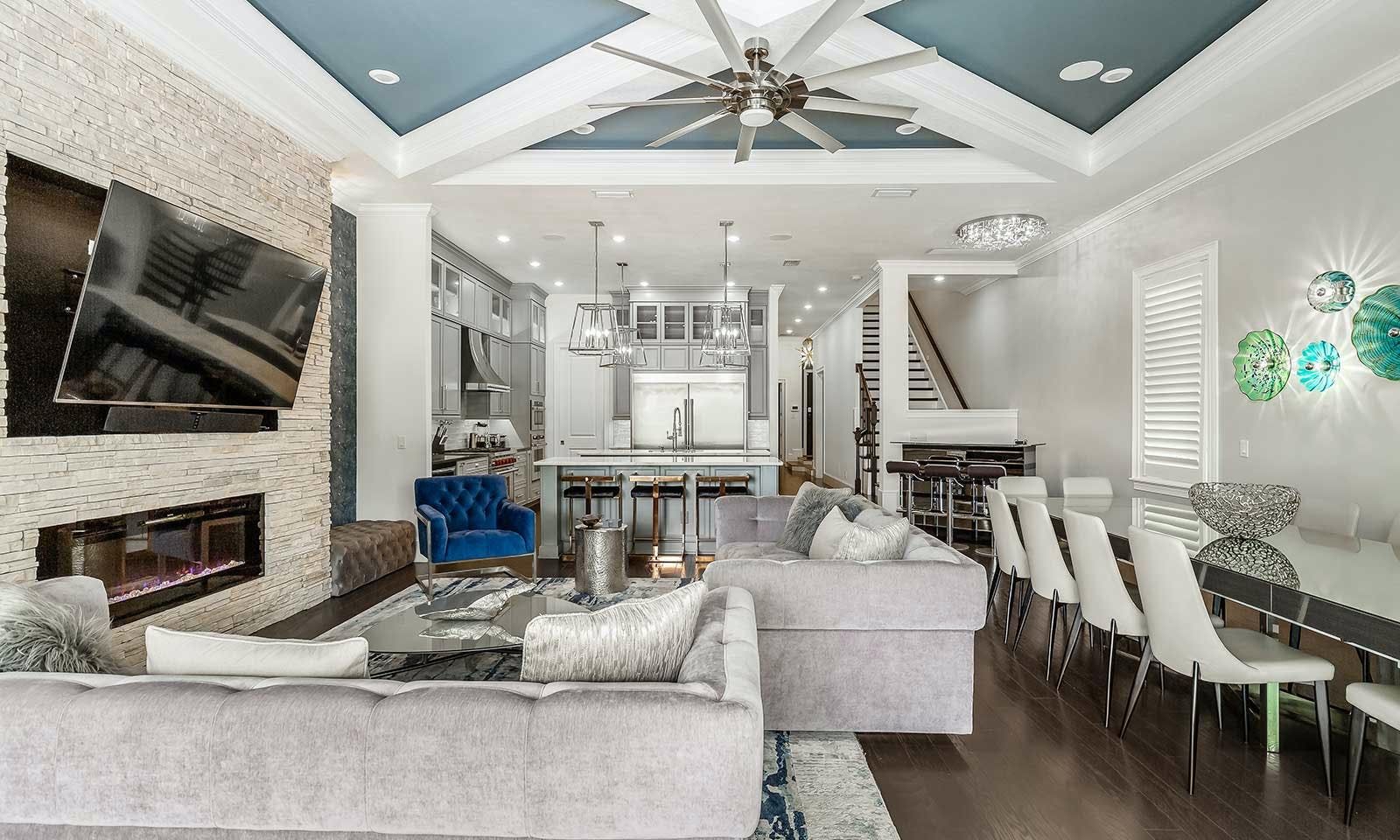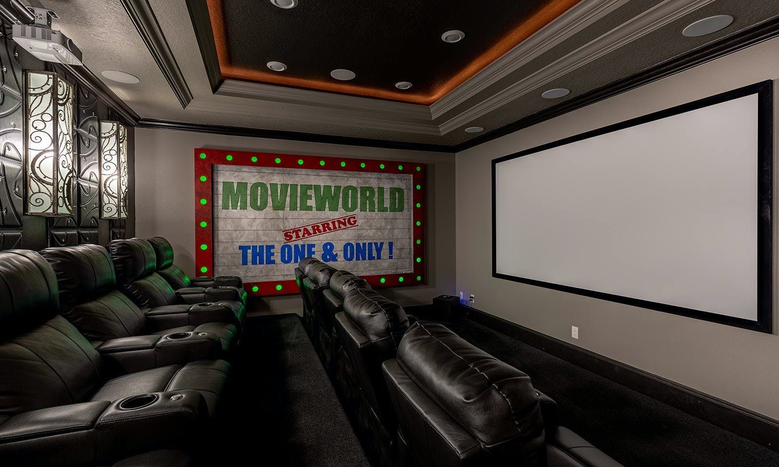 This 6-bed/5-bath villa in Orlando is perfect for a family vacation. The villa features two epic-themed bedrooms, including a Minions and Ironman bedroom, that will keep the kids entertained all night long. The Mario-themed game room has everything a kid could want, including slides, nets, basketball hoops, Nintendo Switch and PS4 consoles connected to two large flat-screen TVs. The private swimming pool and spillover spa offer stunning views of palm trees and water. The outdoor entertainment area includes family foosball or giant Connect Four tournaments and a summer kitchen grill for barbecuing. The indoor kitchen is fully equipped with modern appliances and cookware. The dining area seats 12 guests comfortably. Relax in the living area with velvety sofas and armchairs surrounding a fireplace and smart TV. There are four other spacious king and queen-size bedrooms available, each with en suite bathrooms. Don't miss out on the third-floor suite with two Queen-size beds, a mini fridge, sofa and accent chair, and private balcony access with seating overlooking the pool deck.
