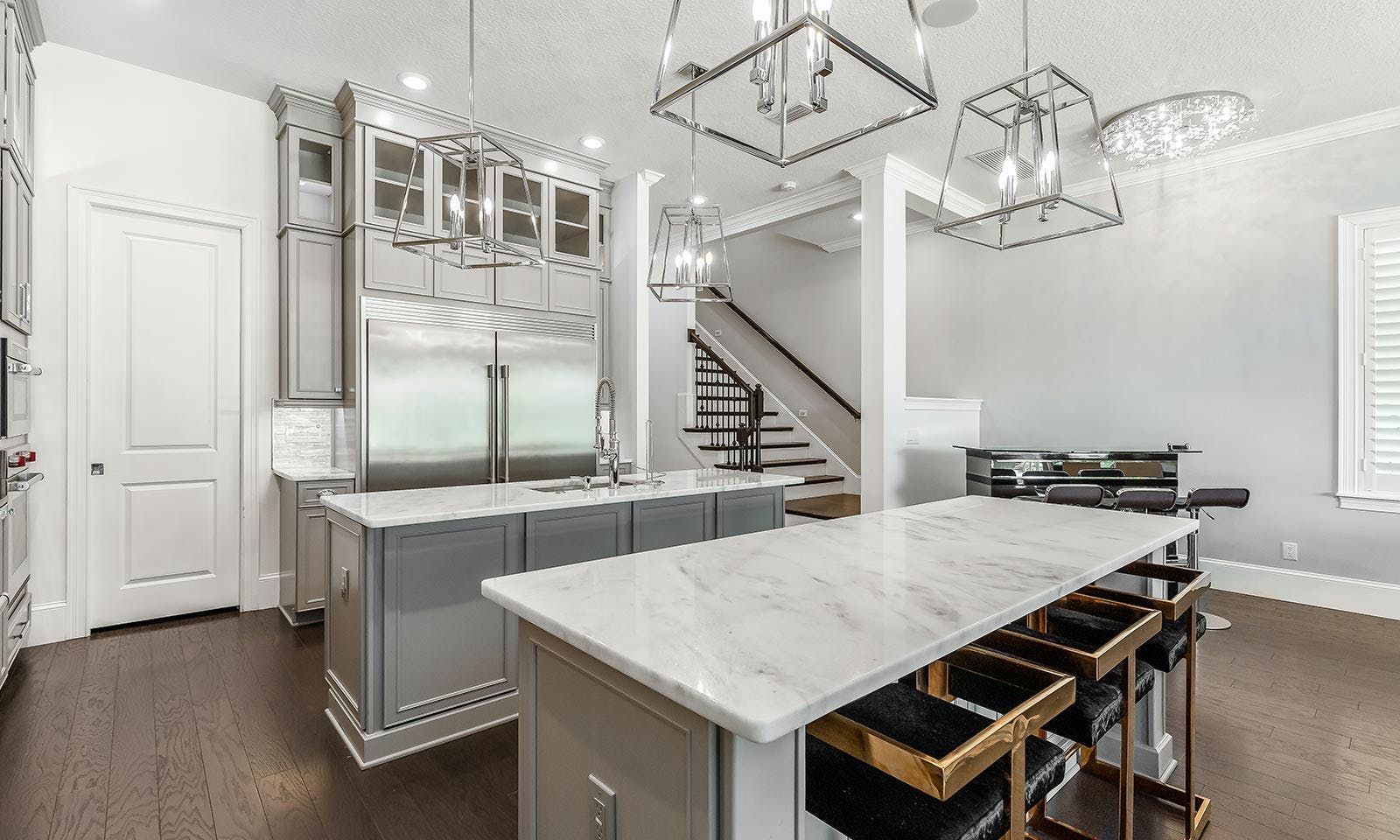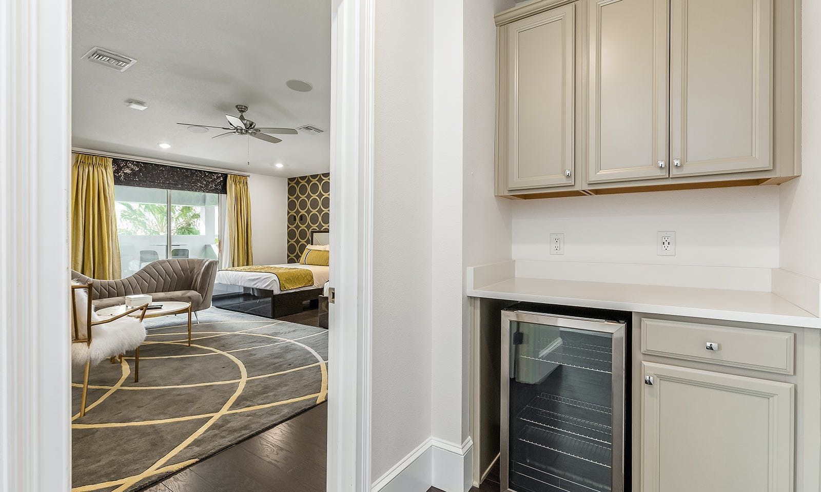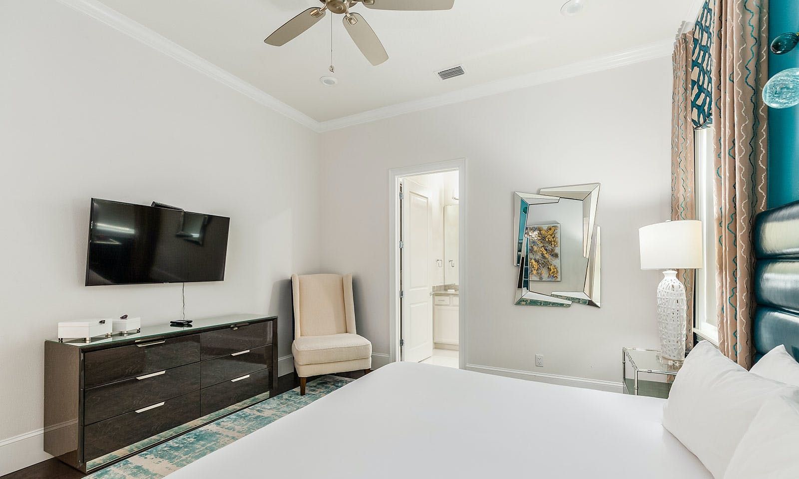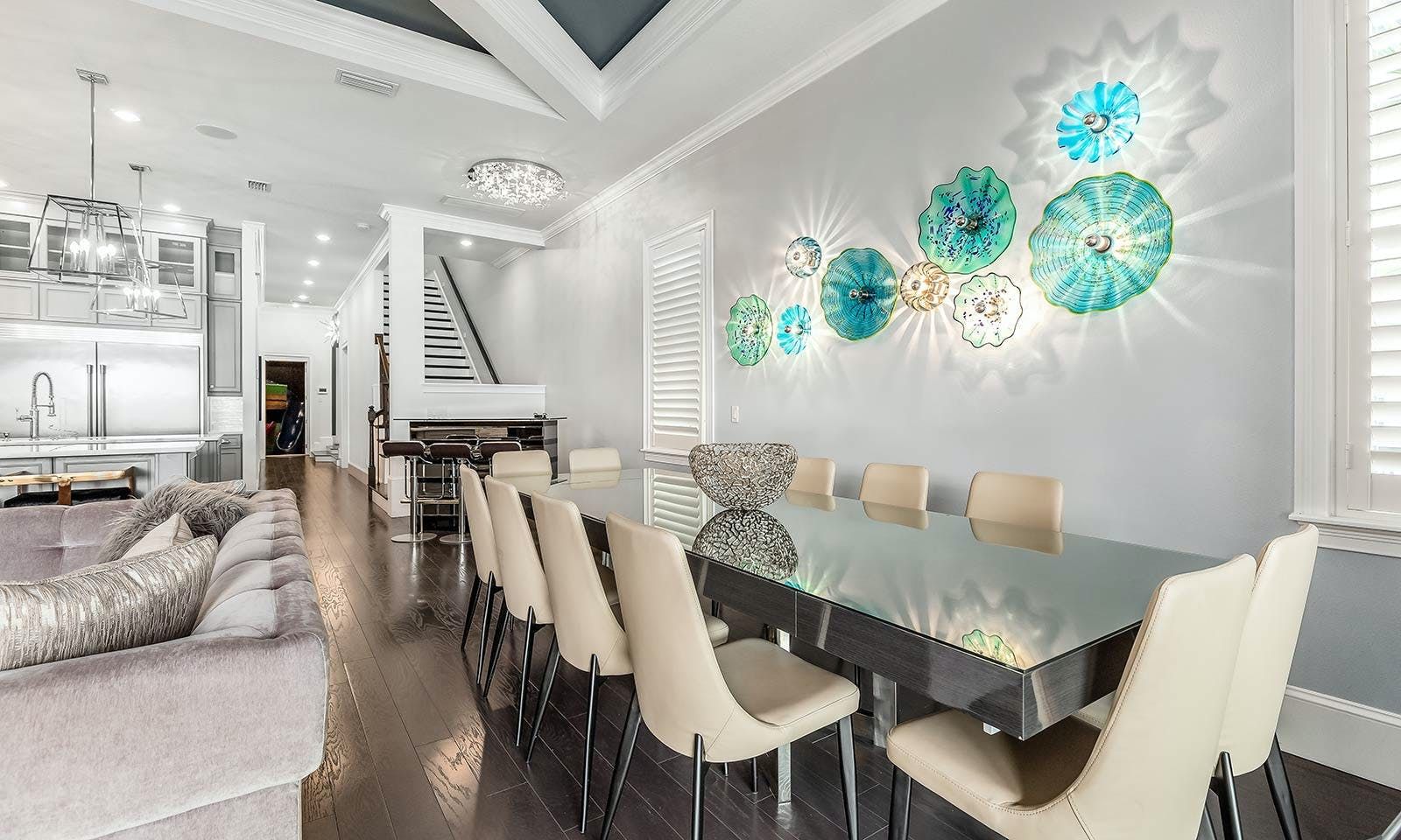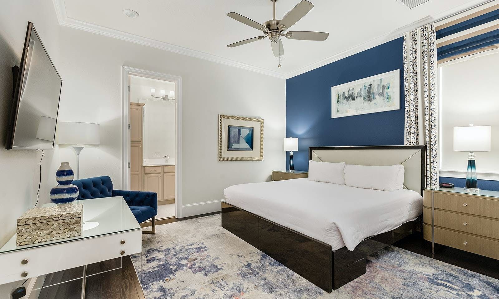 This 6-bed/5-bath villa in Orlando is perfect for a family vacation. The villa features two epic-themed bedrooms, including a Minions and Ironman bedroom, that will keep the kids entertained all night long. The Mario-themed game room has everything a kid could want, including slides, nets, basketball hoops, Nintendo Switch and PS4 consoles connected to two large flat-screen TVs. The private swimming pool and spillover spa offer stunning views of palm trees and water. The outdoor entertainment area includes family foosball or giant Connect Four tournaments and a summer kitchen grill for barbecuing. The indoor kitchen is fully equipped with modern appliances and cookware. The dining area seats 12 guests comfortably. Relax in the living area with velvety sofas and armchairs surrounding a fireplace and smart TV. There are four other spacious king and queen-size bedrooms available, each with en suite bathrooms. Don't miss out on the third-floor suite with two Queen-size beds, a mini fridge, sofa and accent chair, and private balcony access with seating overlooking the pool deck.