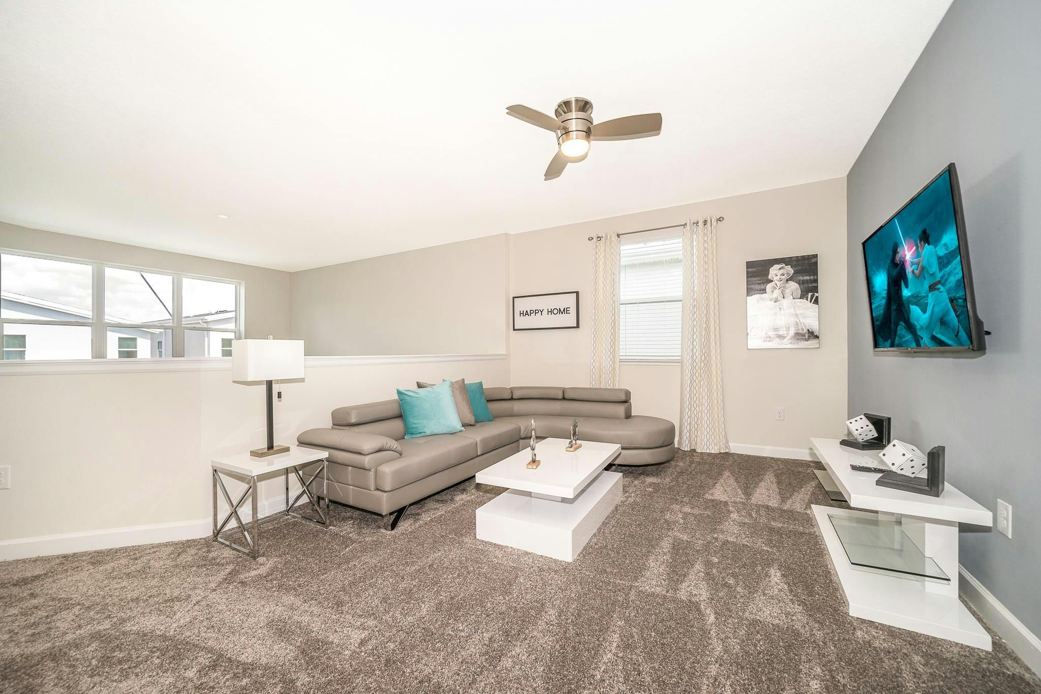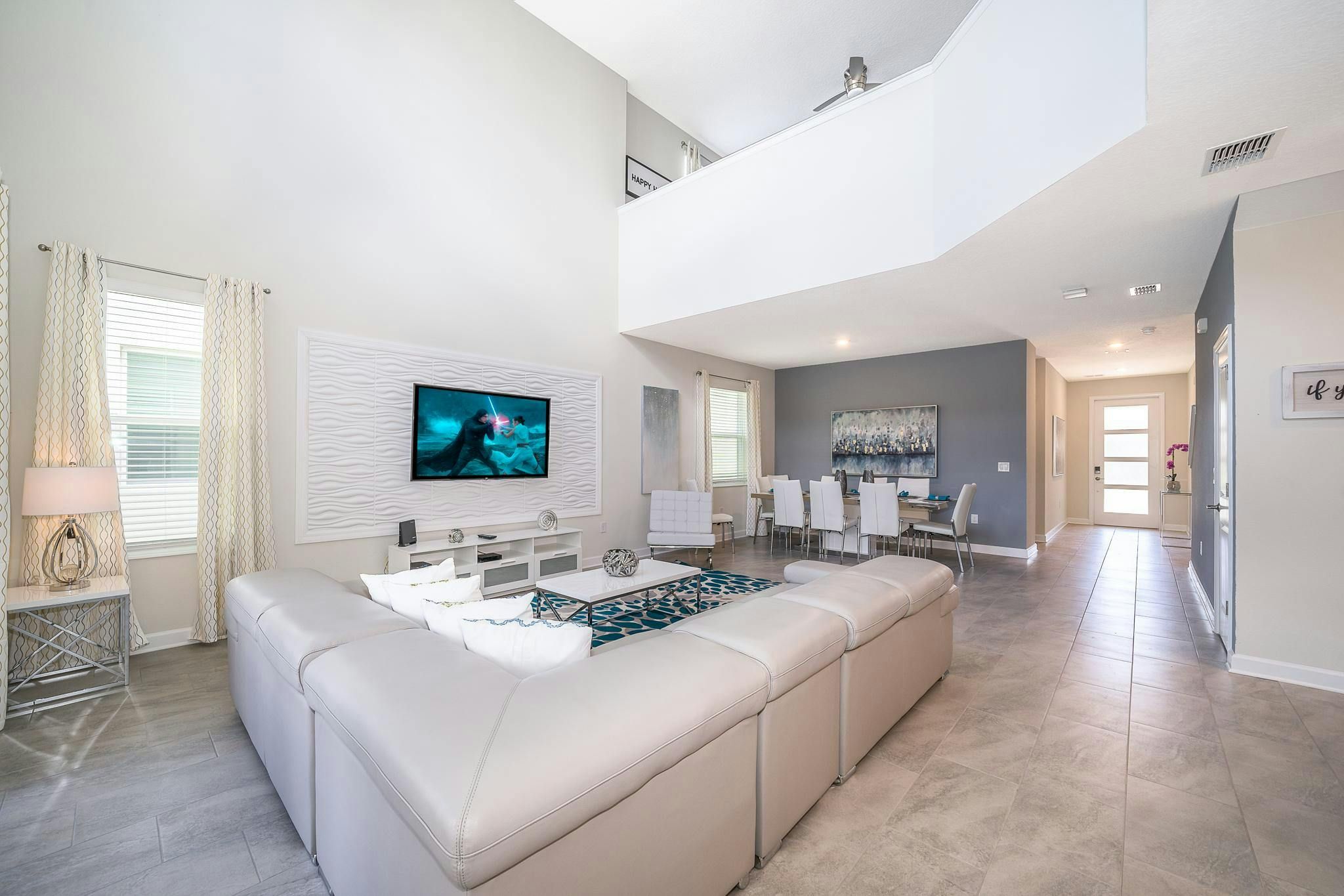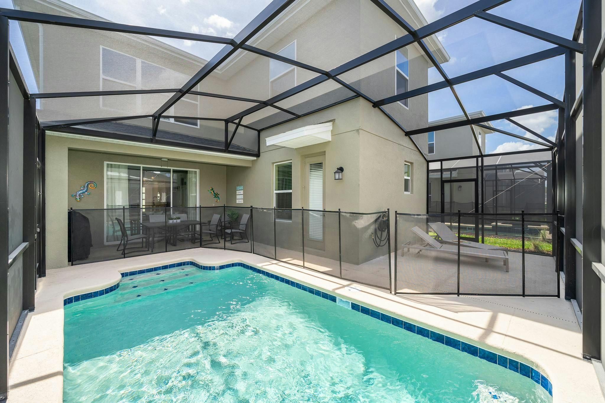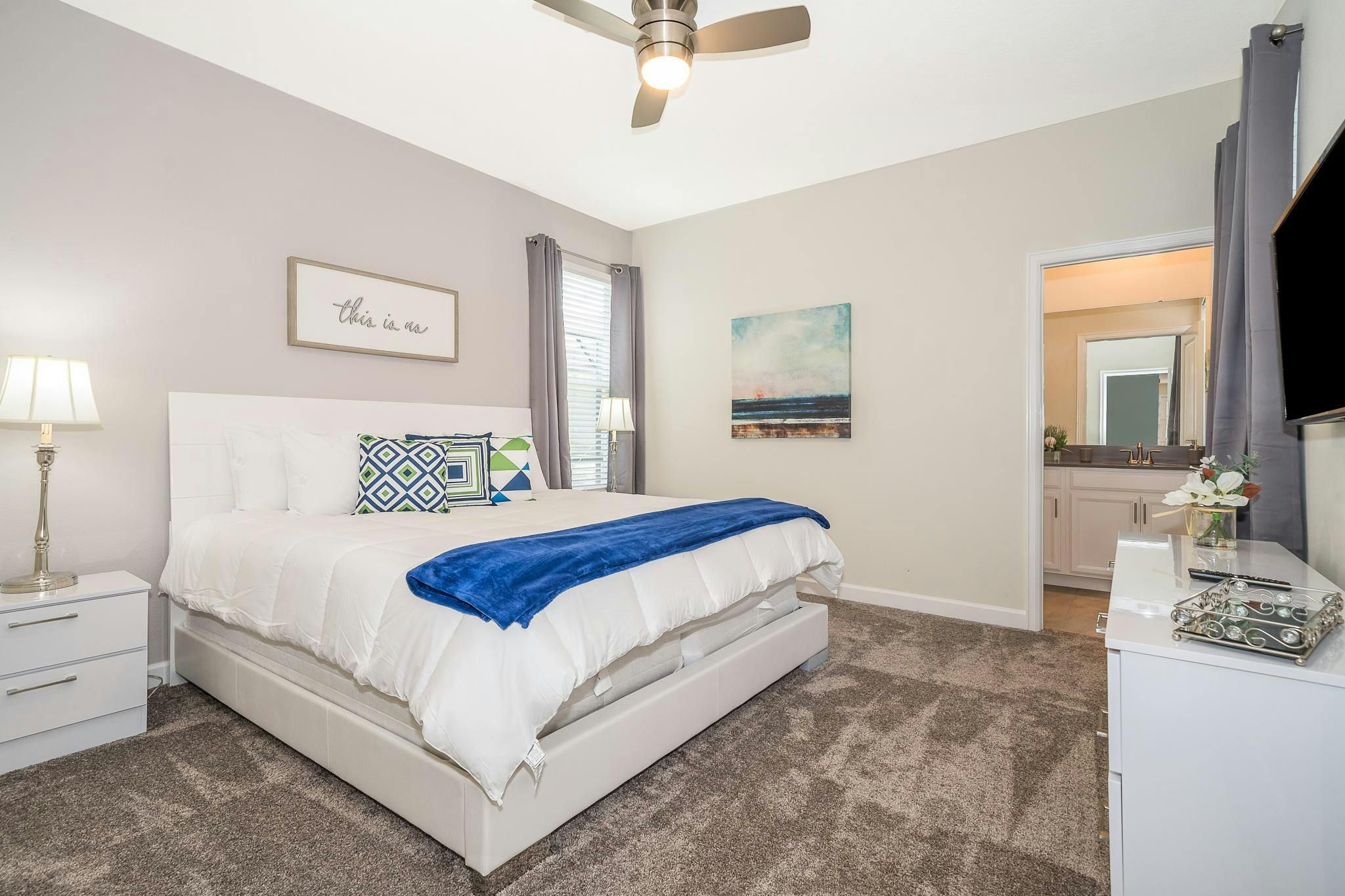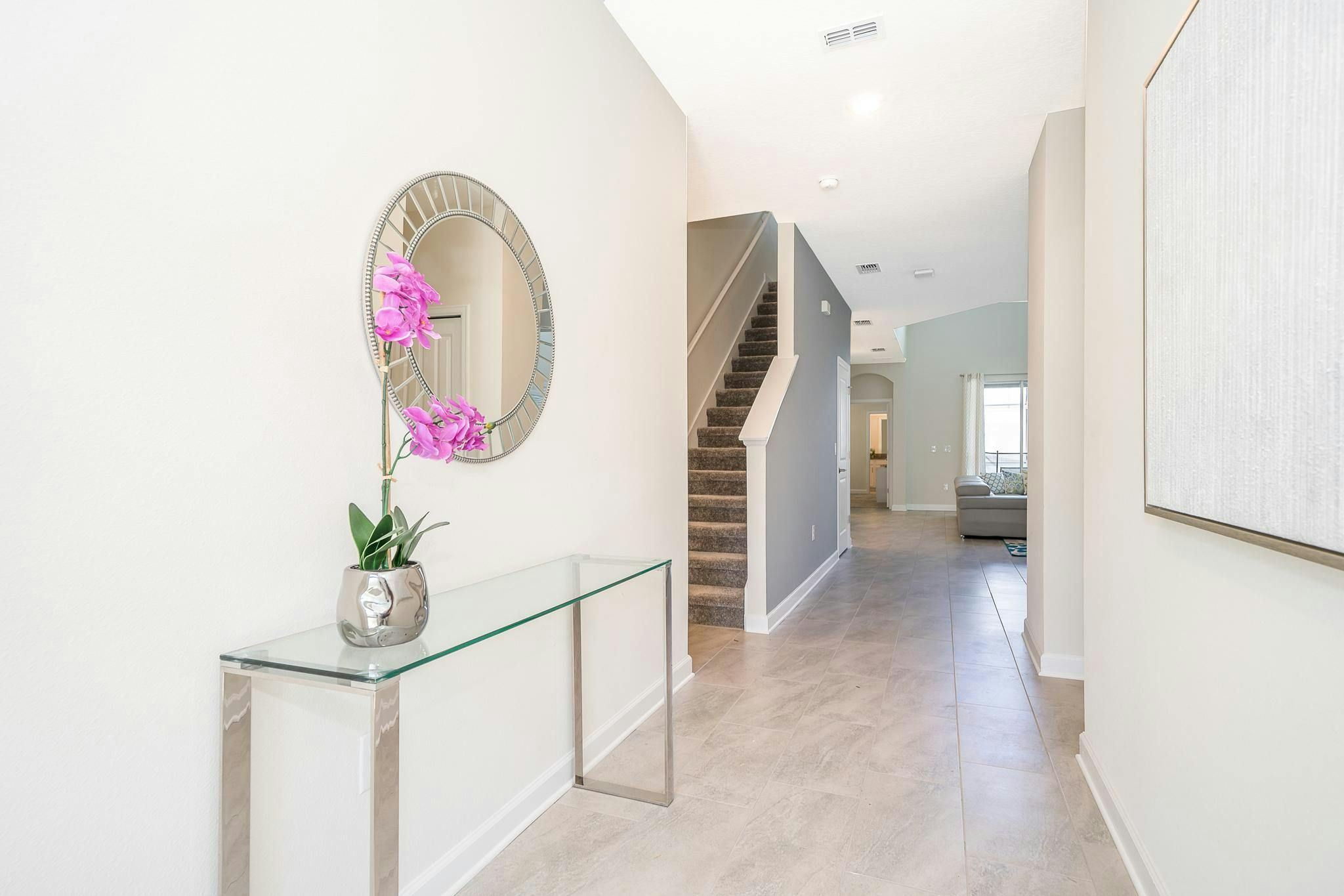 This spacious single-family home has 5 bedrooms and 5 bathrooms, with 2 bedrooms located on the ground floor. The property boasts a fully equipped kitchen, screened private pool, game room, and private parking. Newly furnished and decorated, the house includes a washer and dryer, as well as internet and cable. Located near Disney, Disney Springs, restaurants, and shopping centers, this property is conveniently situated on Osceola Parkway near I-4. The community is Storey Lake, which features a newly opened Clubhouse Resort with great amenities including two pools (one with a lazy river), a restaurant, gym, business center and more.