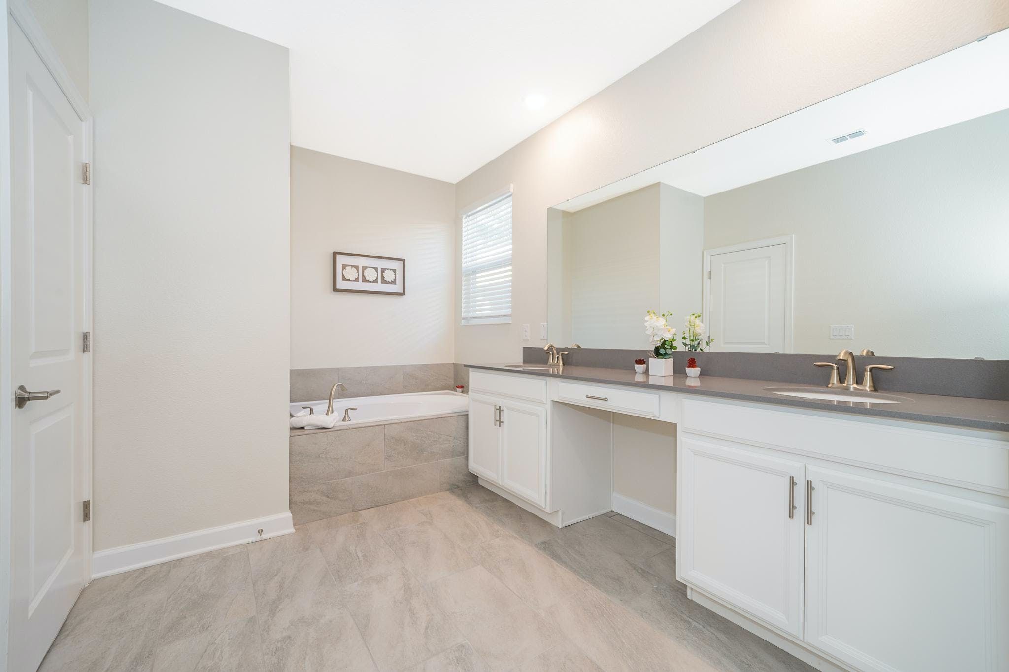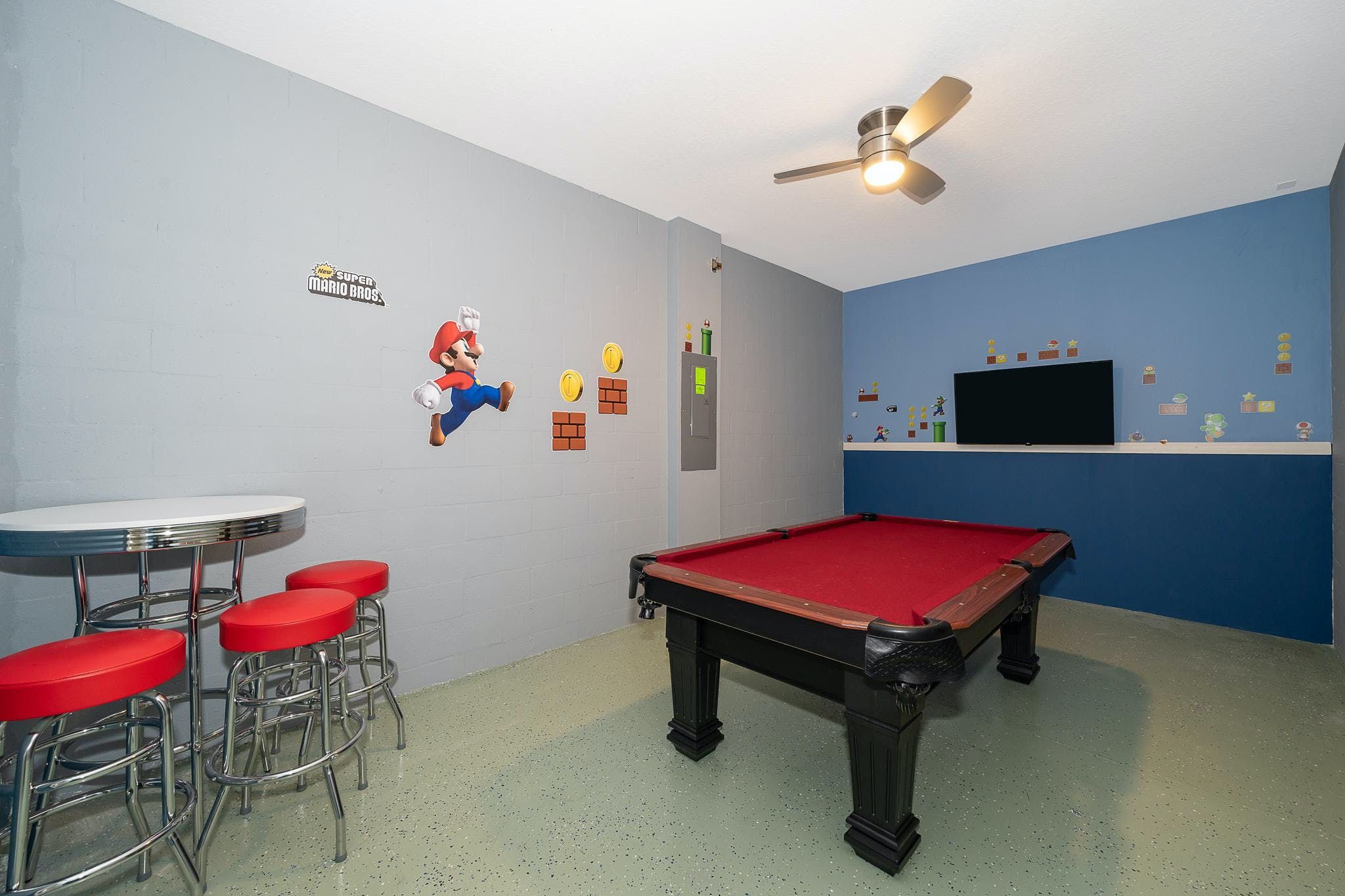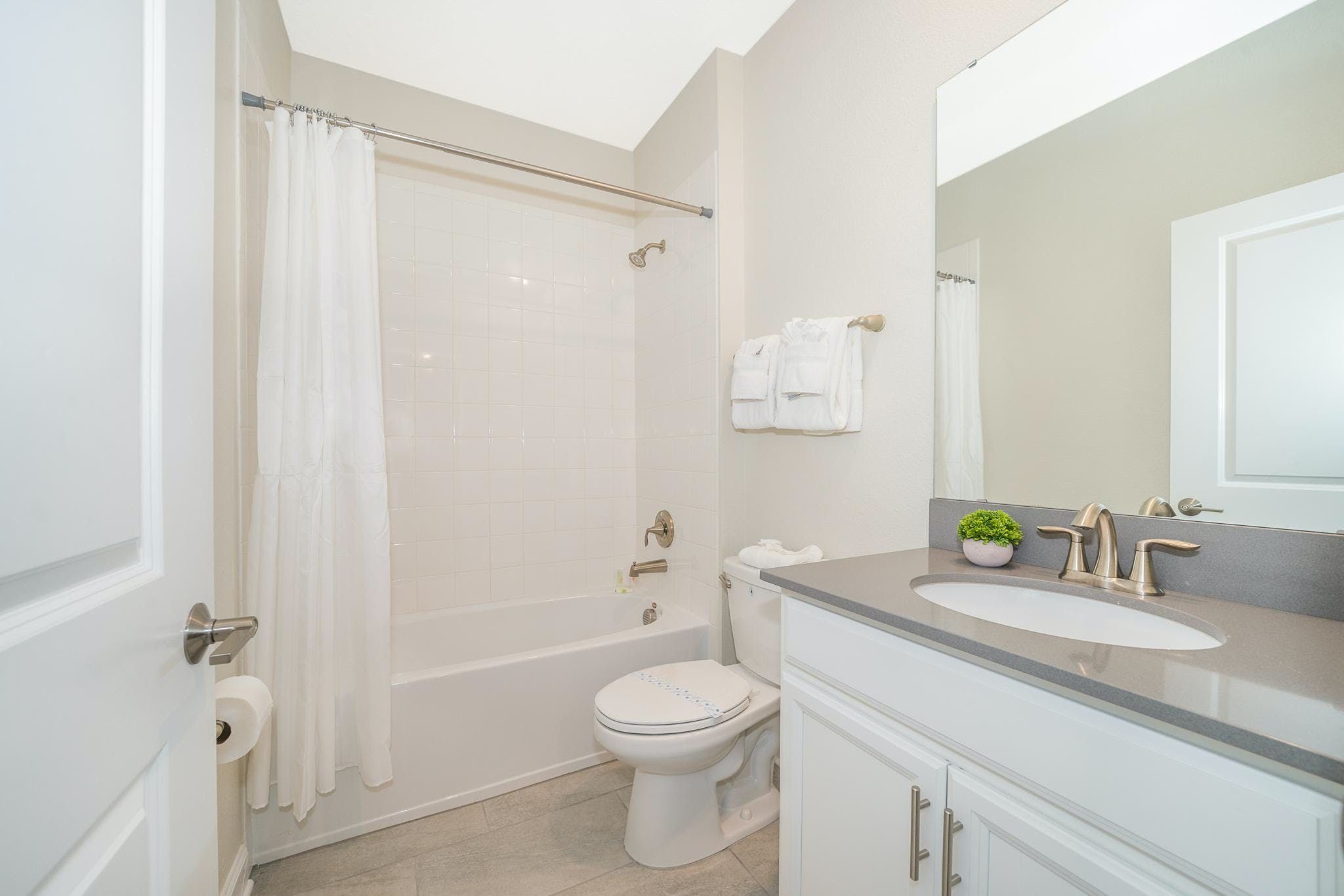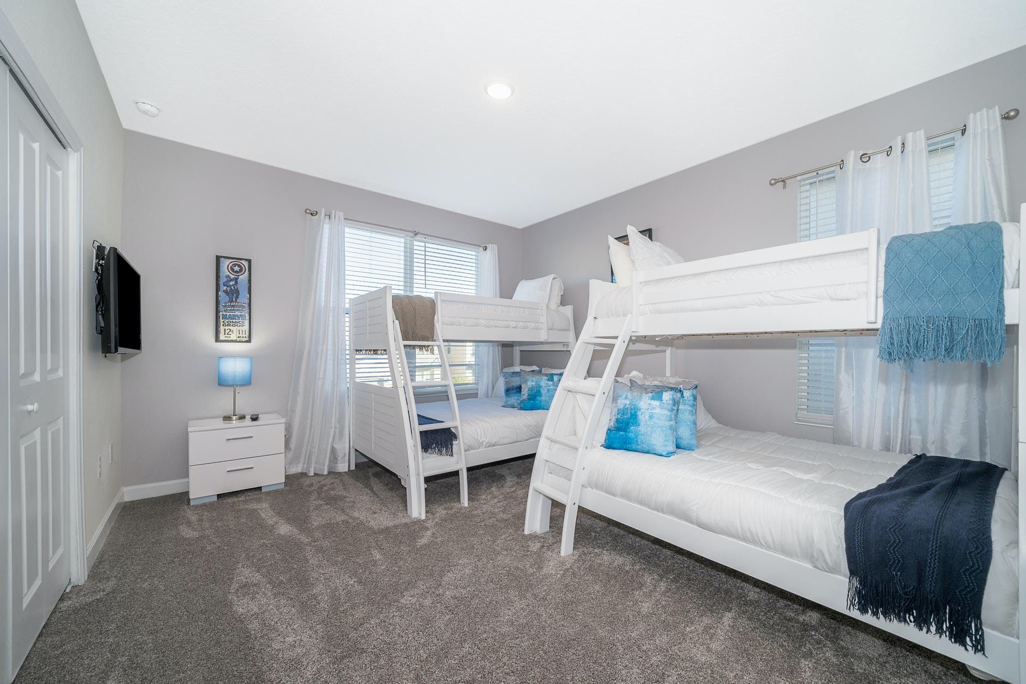 This brand new single family home features five bedrooms and five bathrooms, with two of the bedrooms located downstairs. The fully-equipped kitchen and private game room provide plenty of entertainment options for guests. The screened private pool and spa are perfect for relaxing after a long day exploring nearby attractions such as Disney and Disney Springs. The community is located on Osceola Parkway near I-4, making it easy to get around. Guests can enjoy access to the newly-opened Clubhouse Resort, which features two pools including a lazy river, restaurant, gym, business center, and other great amenities. Internet and cable are included in this newly-furnished and decorated vacation home.
