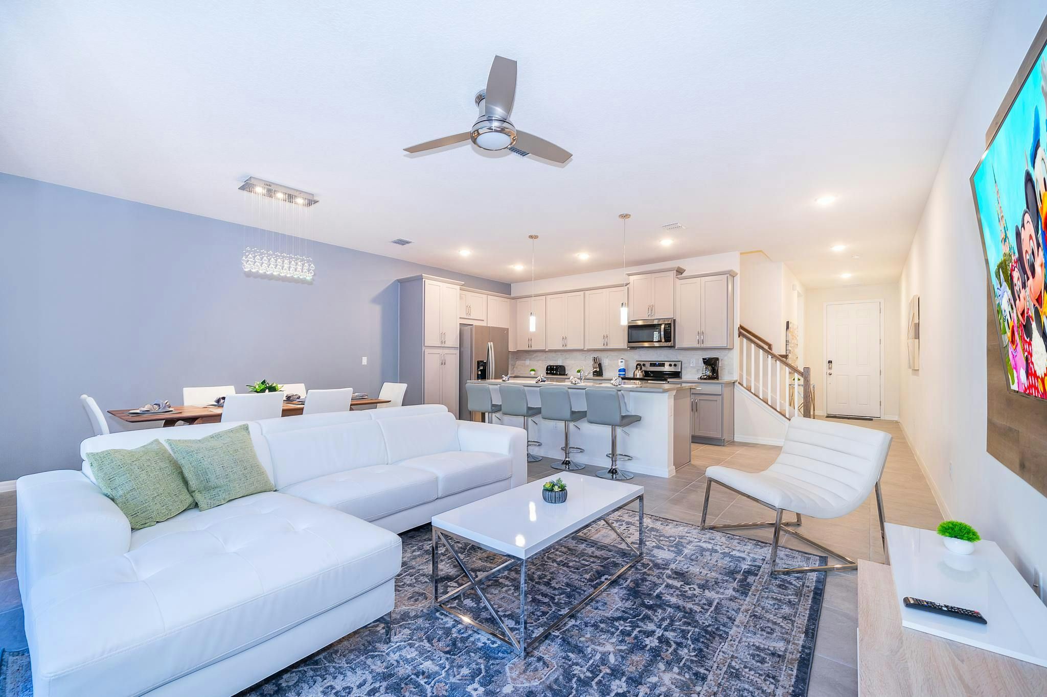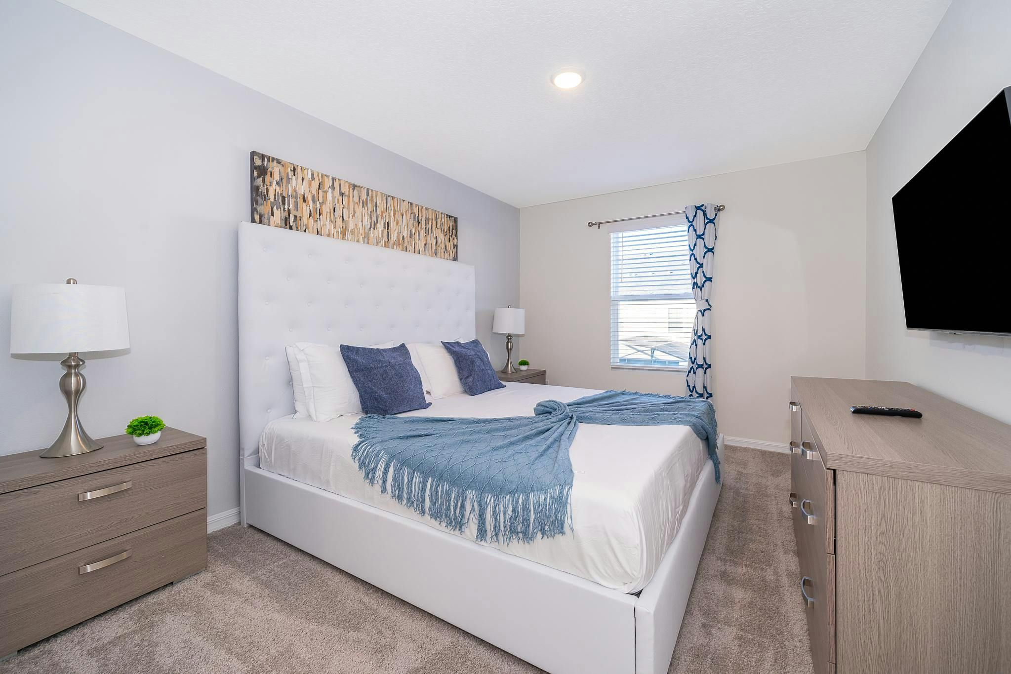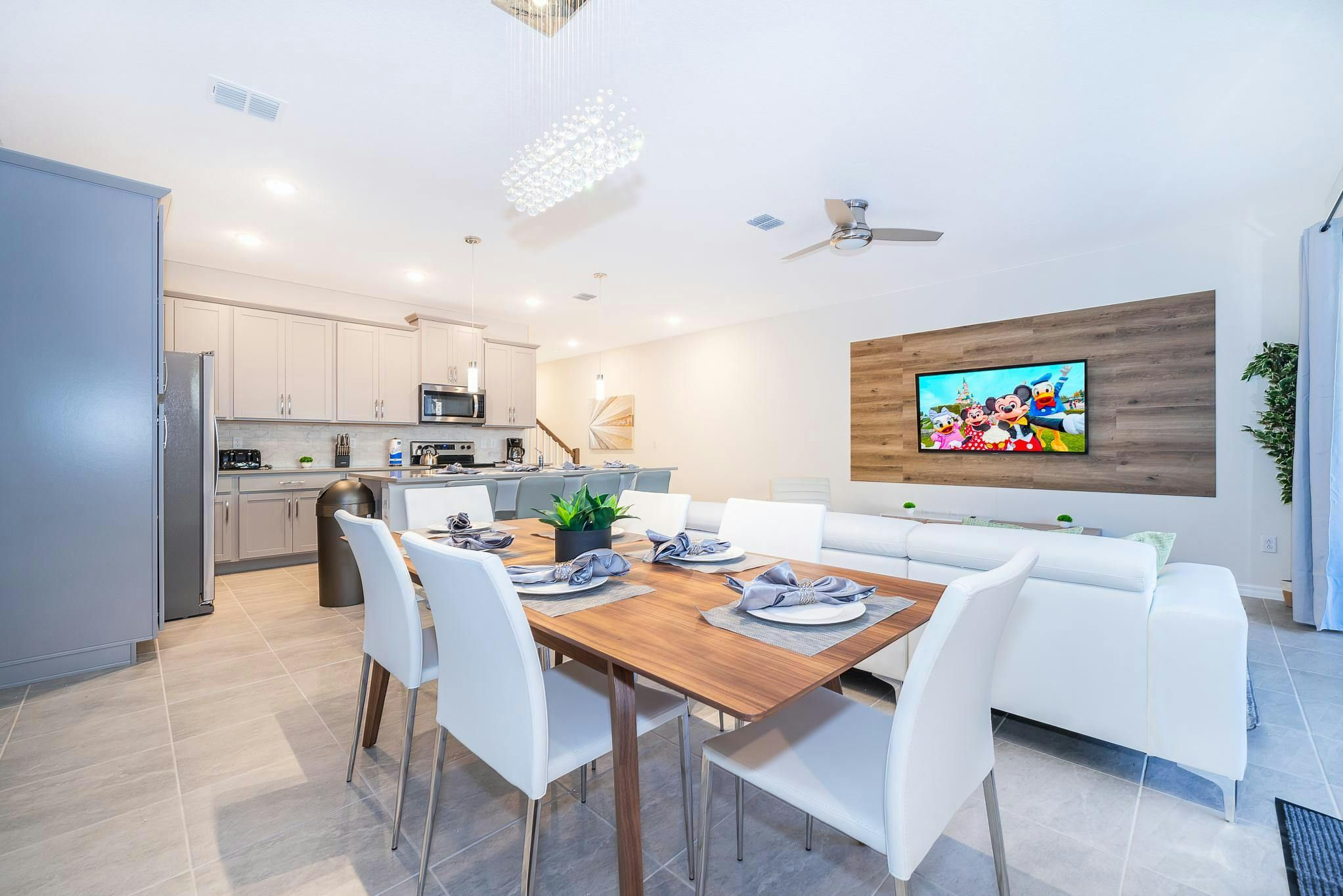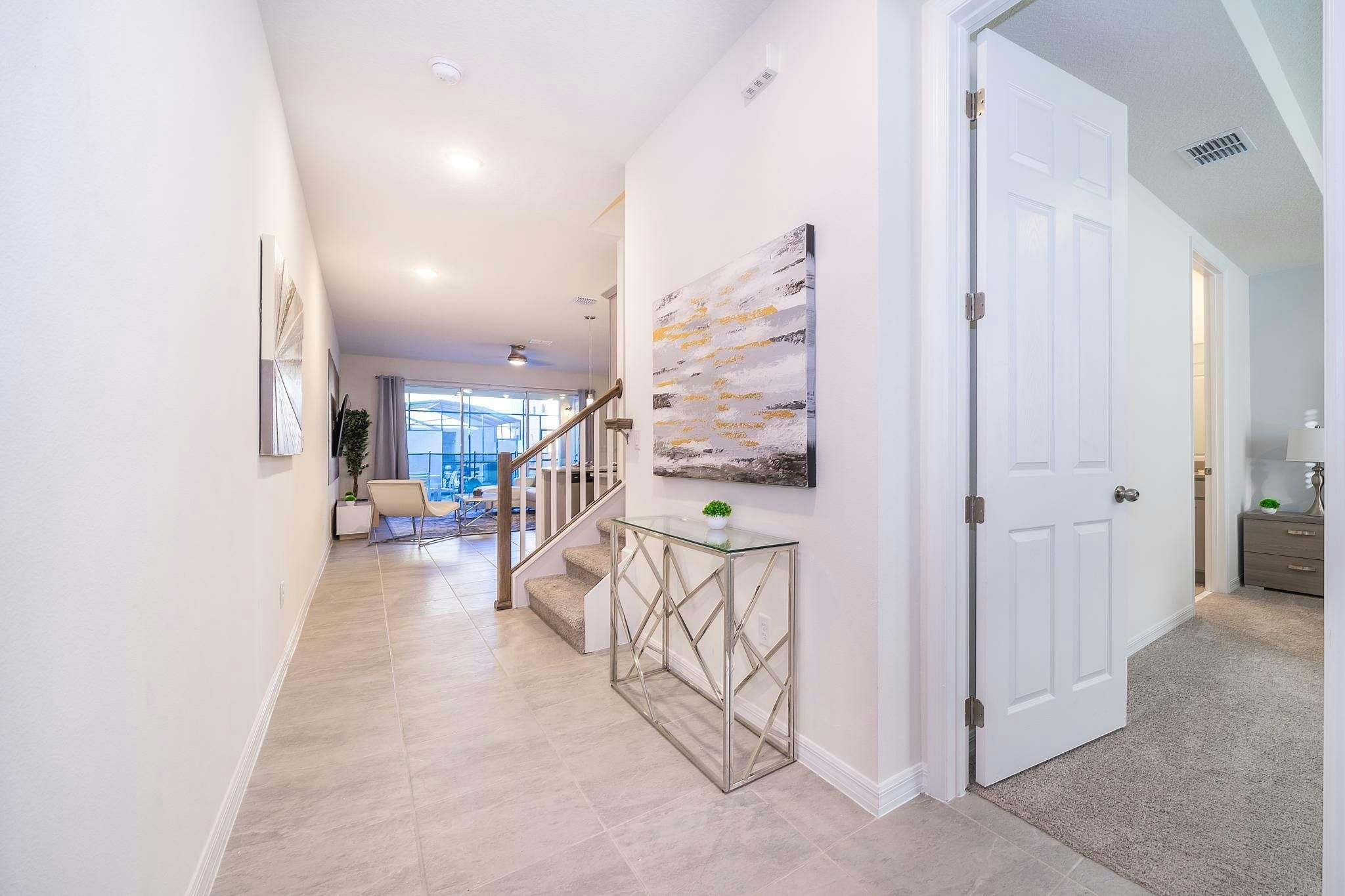 This brand new 5-bedroom vacation rental with a private pool is located in Solara Resort, close to Disney, restaurants, and shopping centers. The property features one bedroom downstairs and four bedrooms upstairs, including a king suite, a king bedroom, a queen bedroom, a bedroom with one full and one twin bed, and a bedroom with full over full bunk beds. The property has been newly furnished and decorated and is fully equipped with a washer and dryer. Internet and cable are included. Guests can park at the front of the property. The resort offers amenities such as two pools (including a Flow Rider), a restaurant, gym, business center, and more.