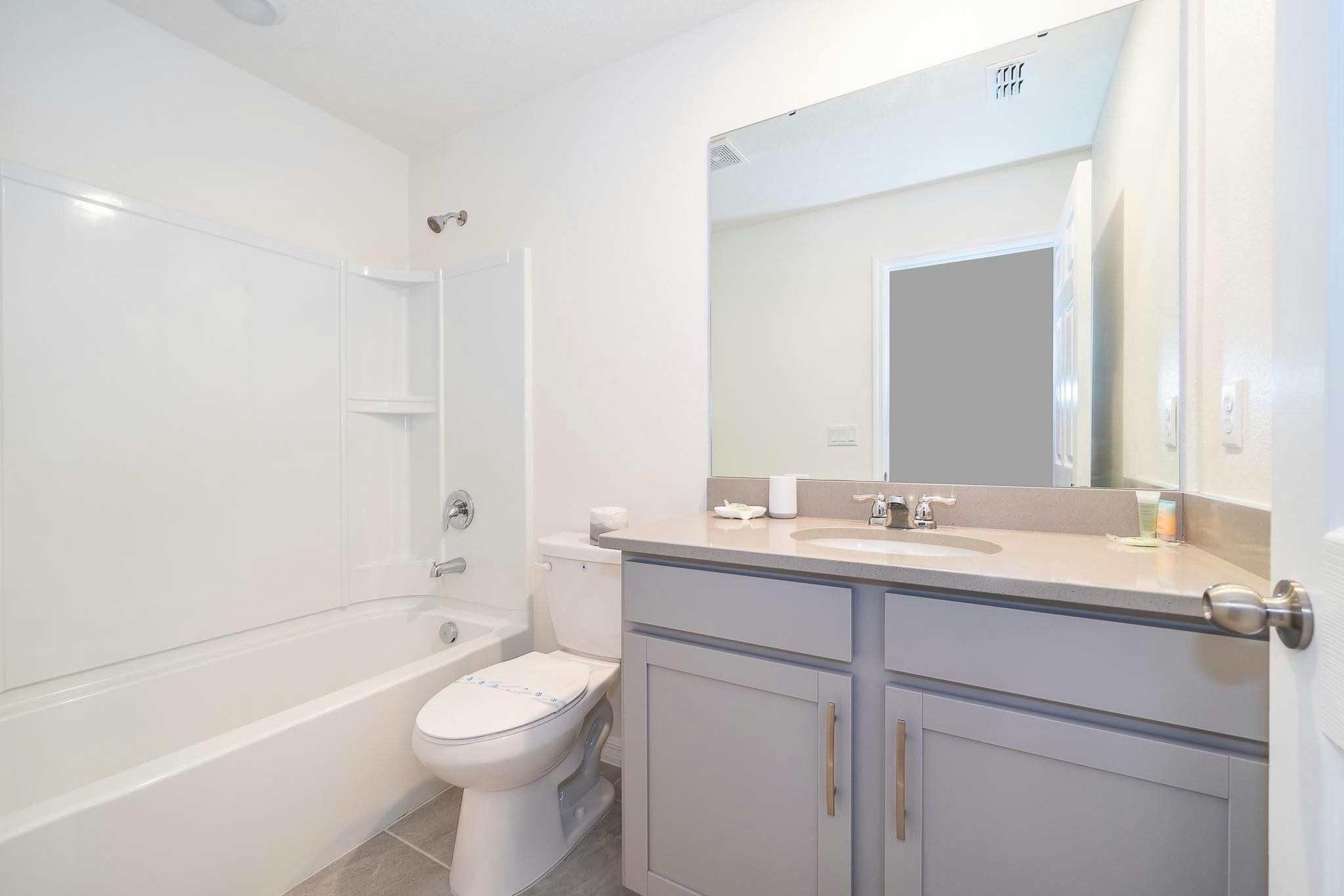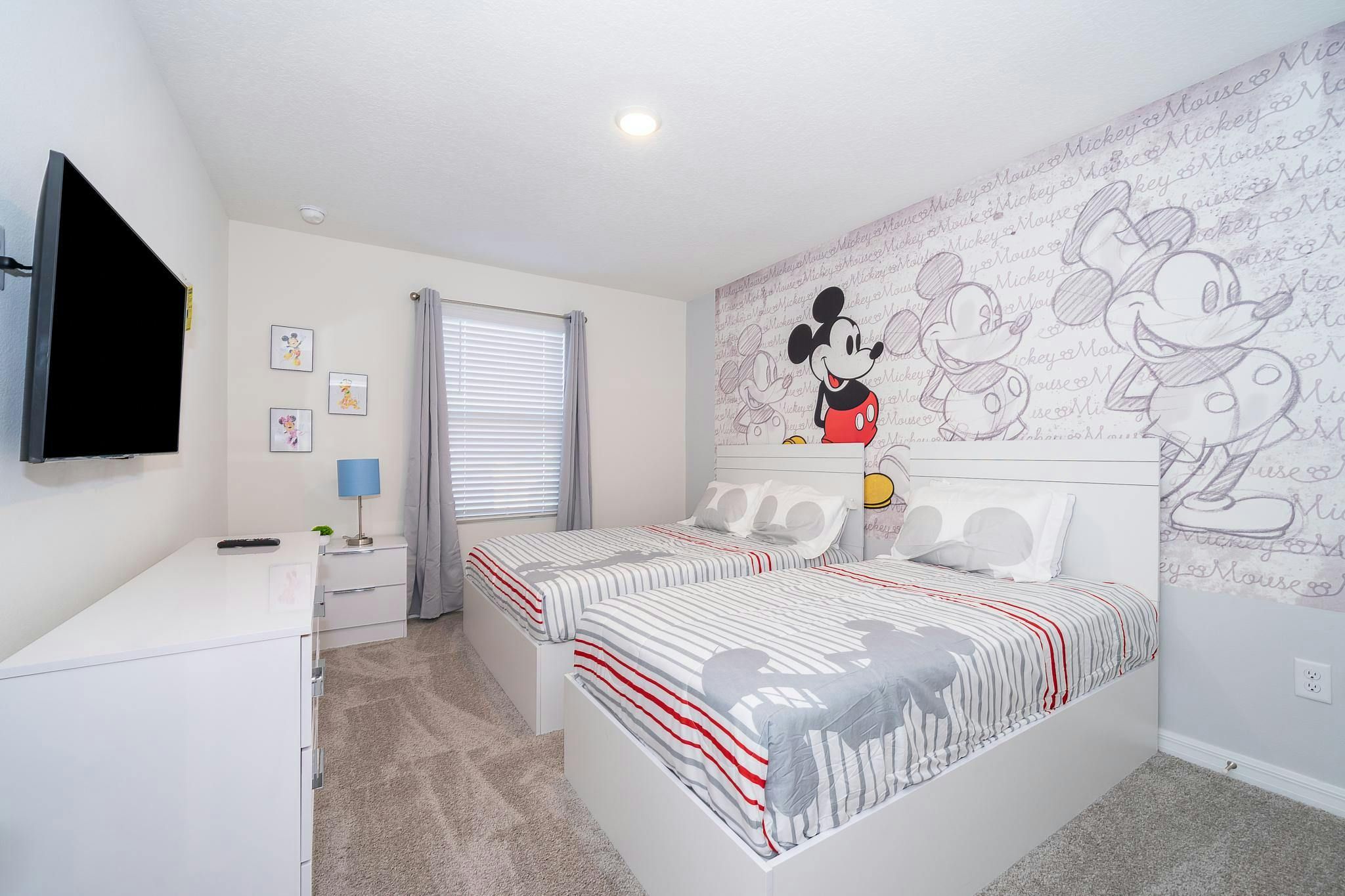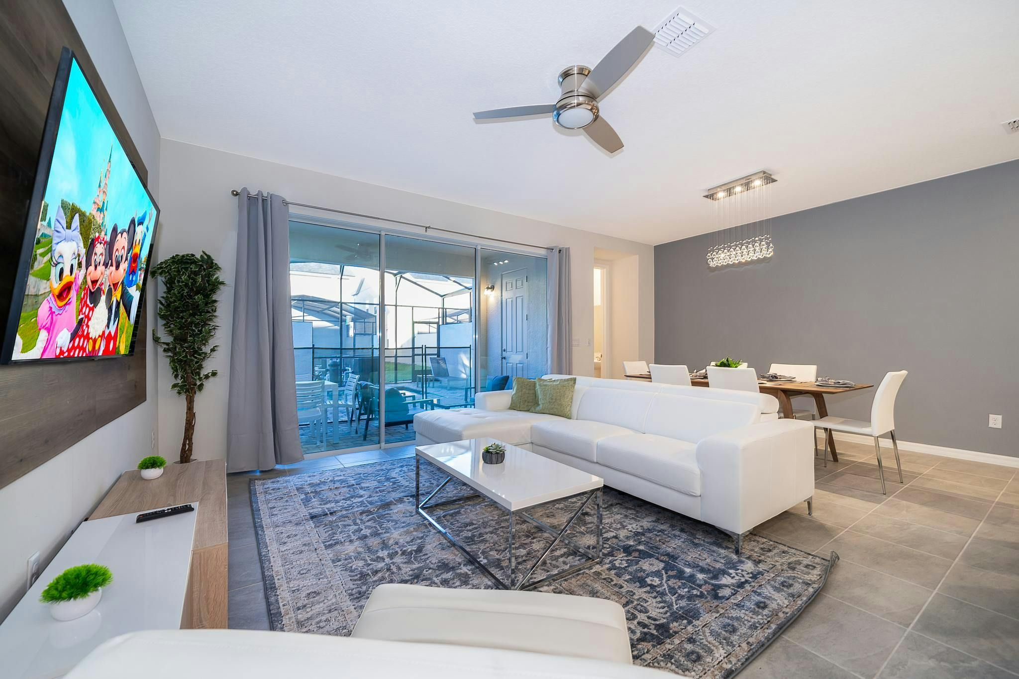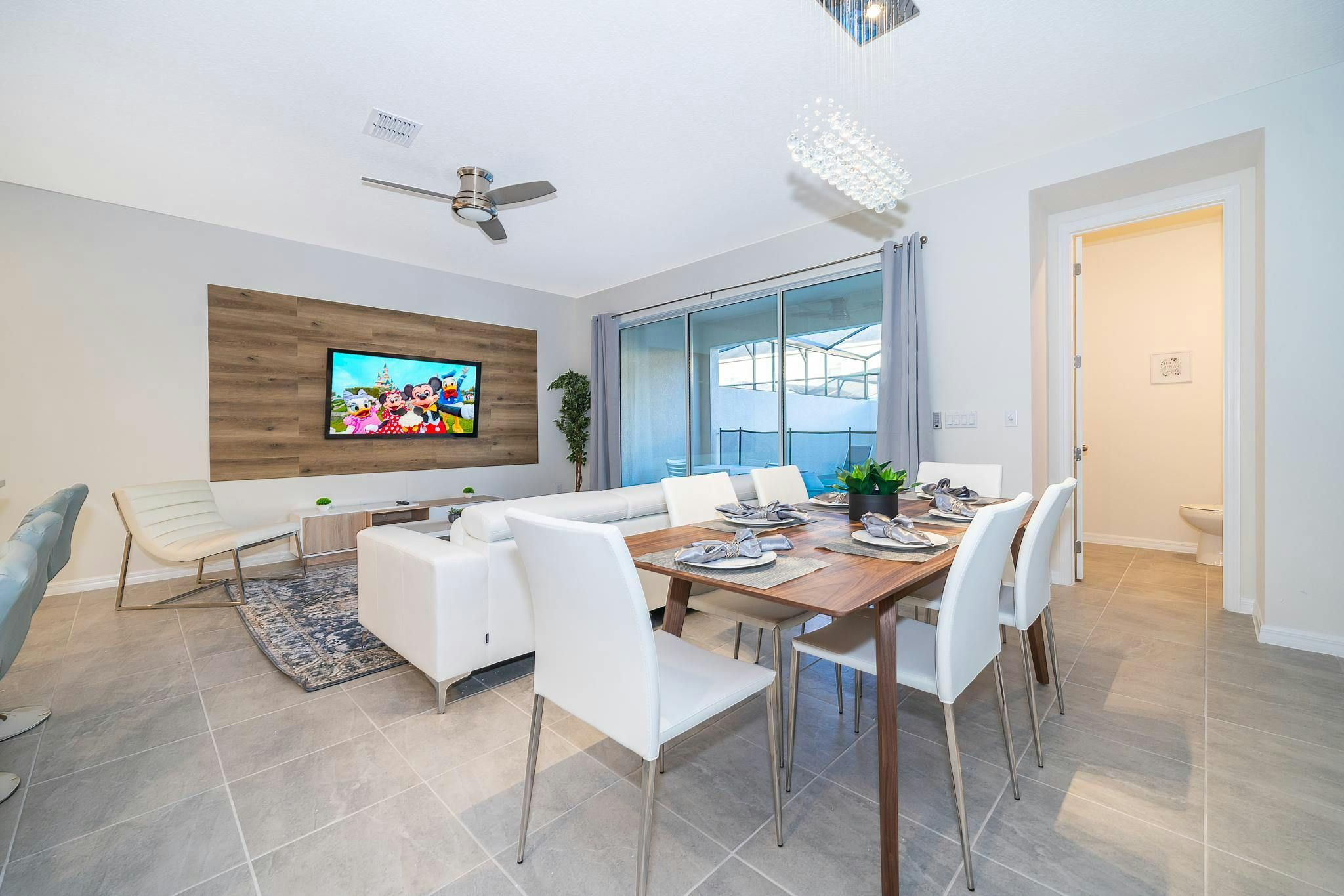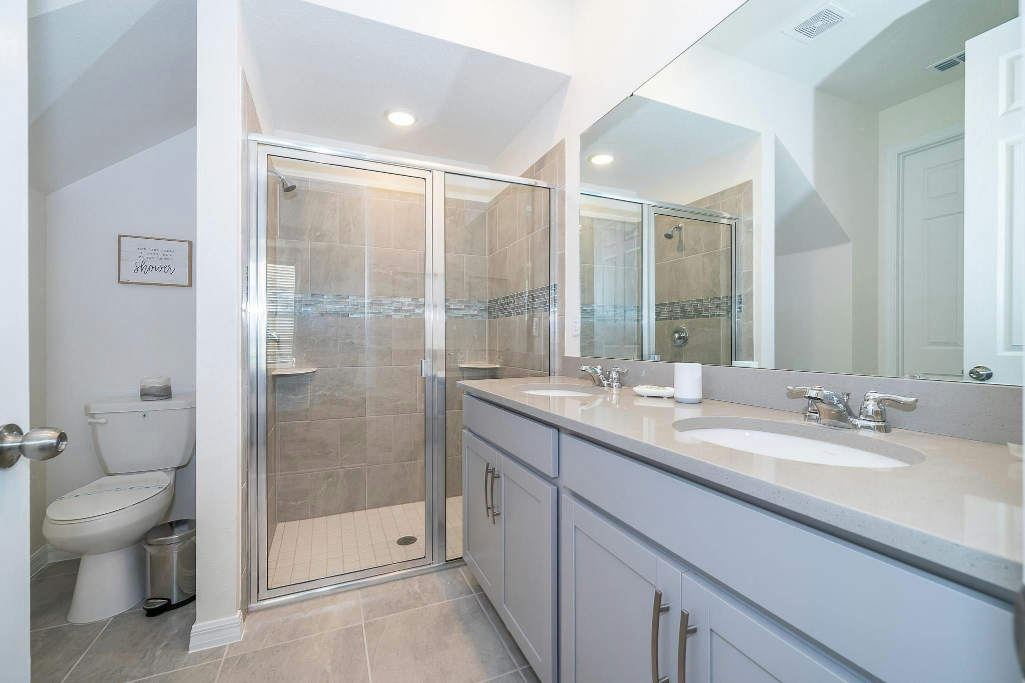 This brand new 5-bedroom vacation rental with a private pool is located in Solara Resort, close to Disney, restaurants, and shopping centers. The property features one bedroom downstairs and four bedrooms upstairs, including a king suite, a king bedroom, a queen bedroom, a bedroom with one full and one twin bed, and a bedroom with full over full bunk beds. The property has been newly furnished and decorated and is fully equipped with a washer and dryer. Internet and cable are included. Guests can park at the front of the property. The resort offers amenities such as two pools (including a Flow Rider), a restaurant, gym, business center, and more.