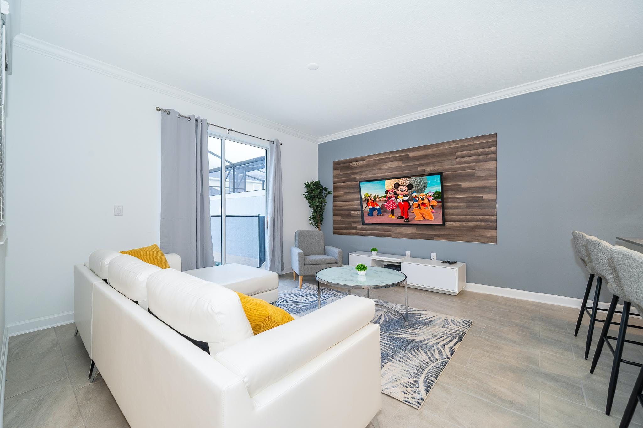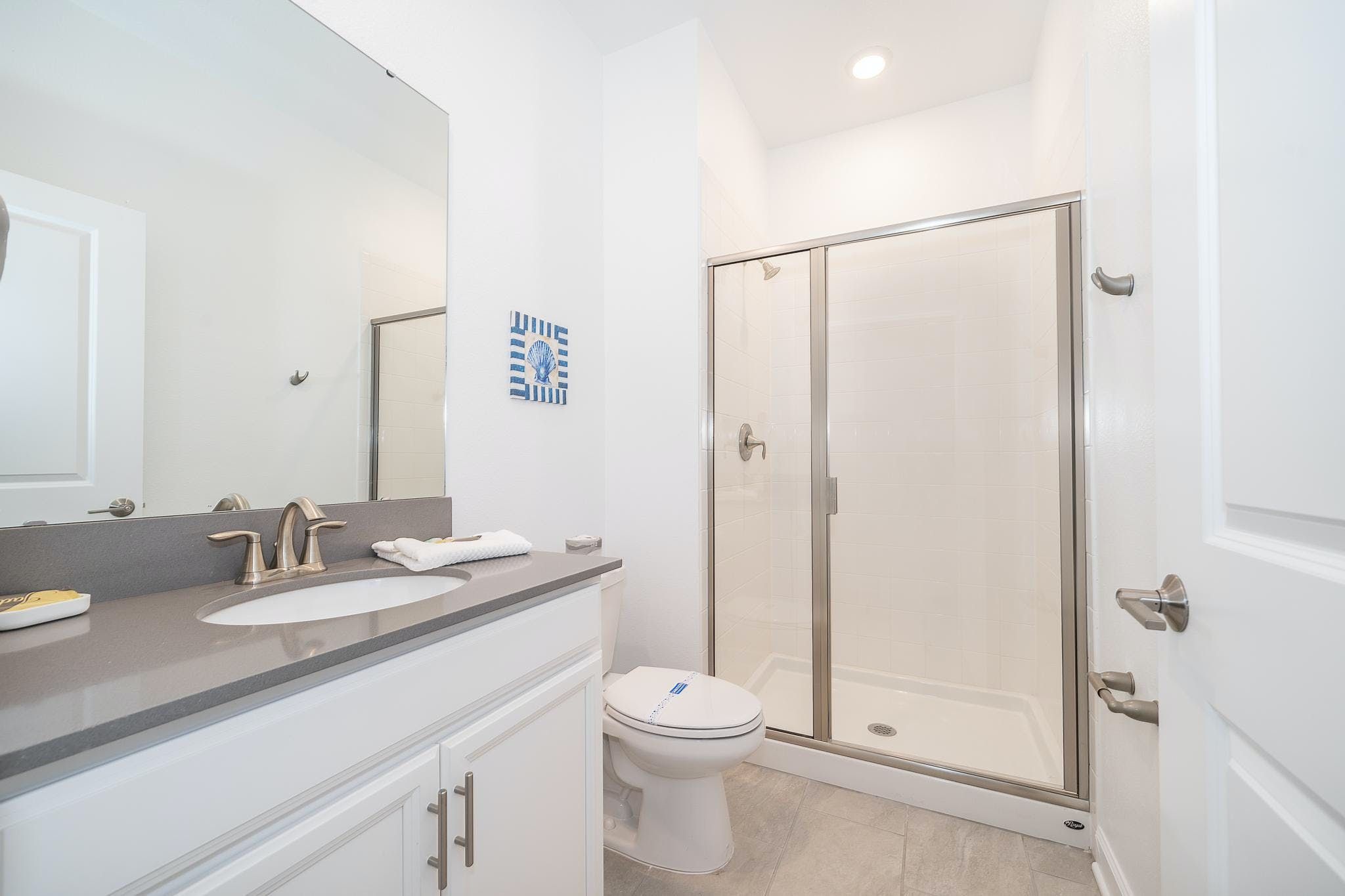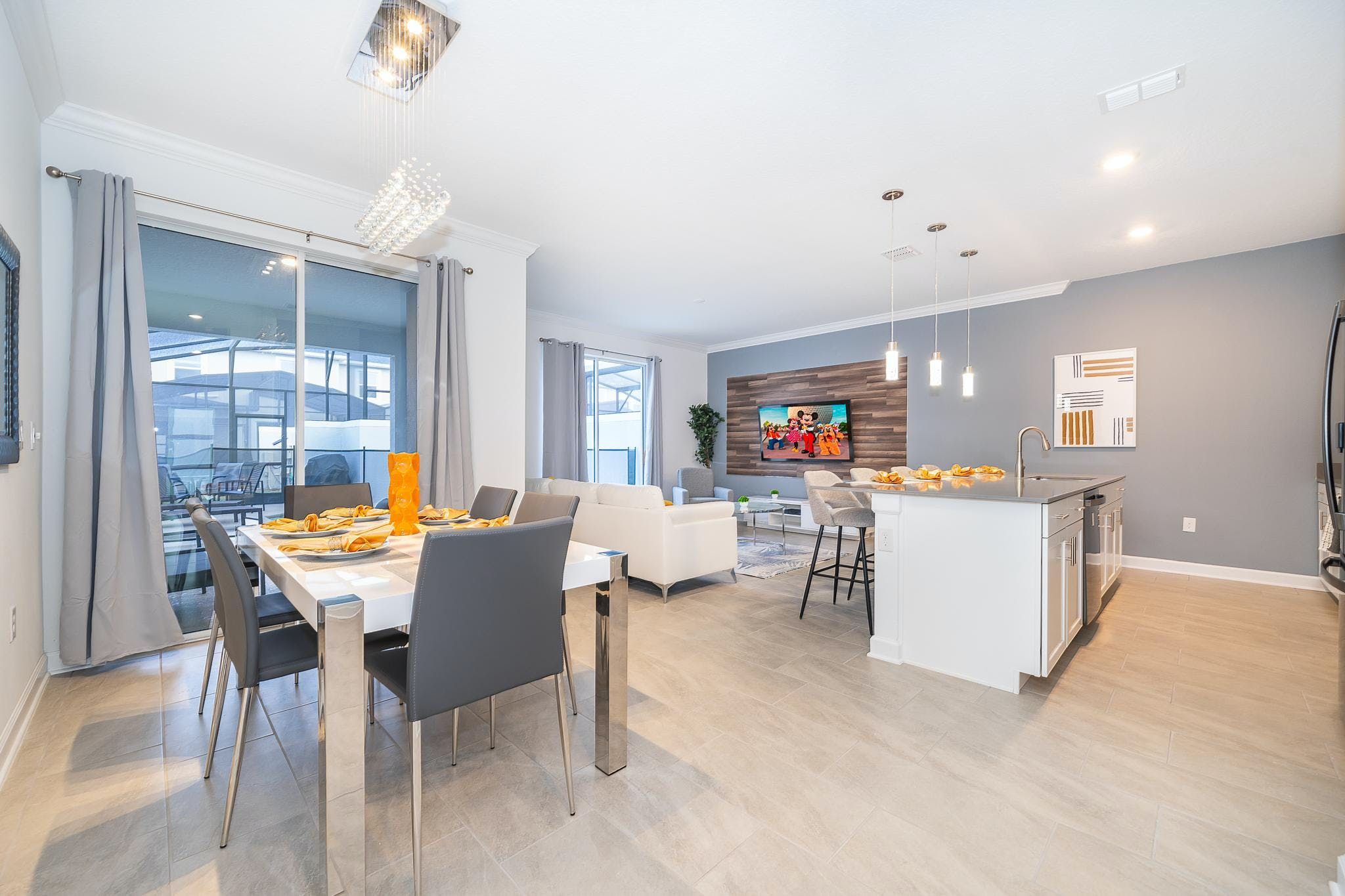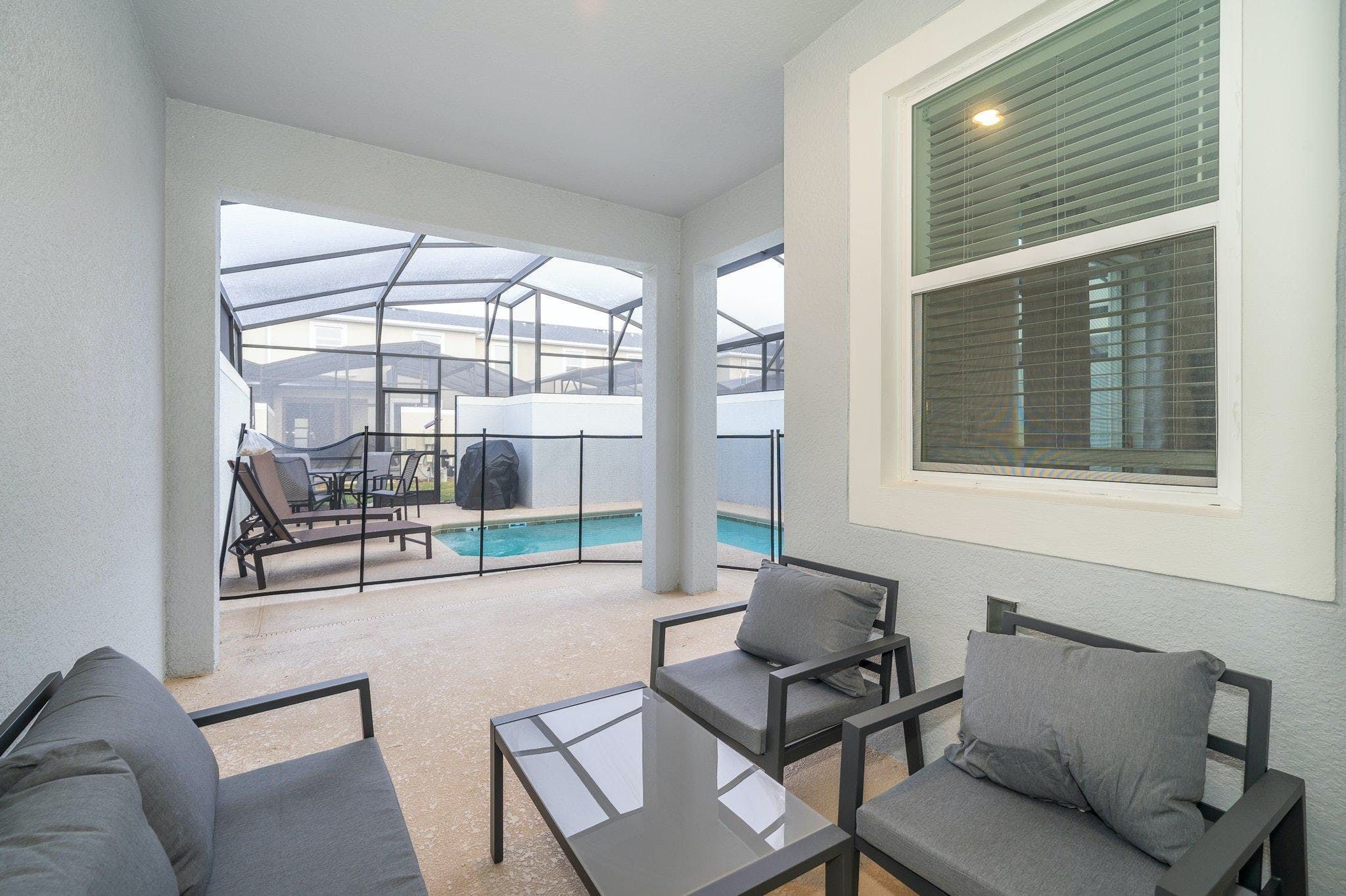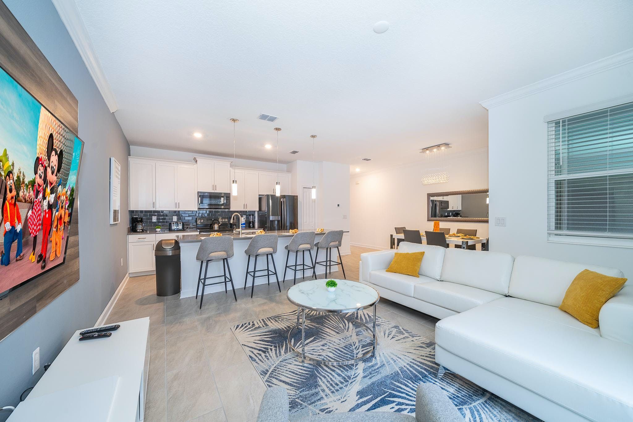 This brand new 4 bedroom, 3 bathroom vacation rental with a pool is located in Storey Lake Resort, providing guests with an exceptional vacation experience. The bedrooms include a king bedroom downstairs, a king suite upstairs, and two bedrooms with one full and one twin bed each. This resort is the closest community to Disney, Disney Springs, malls, and Walmart. Guests can enjoy the great amenities offered at the clubhouse resort such as two pools including a lazy river, restaurant, gym, and more.
