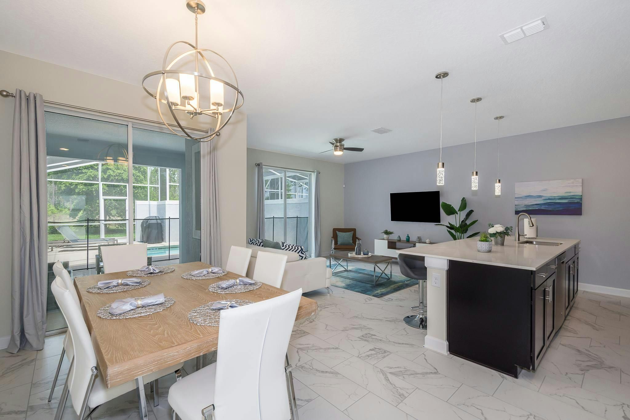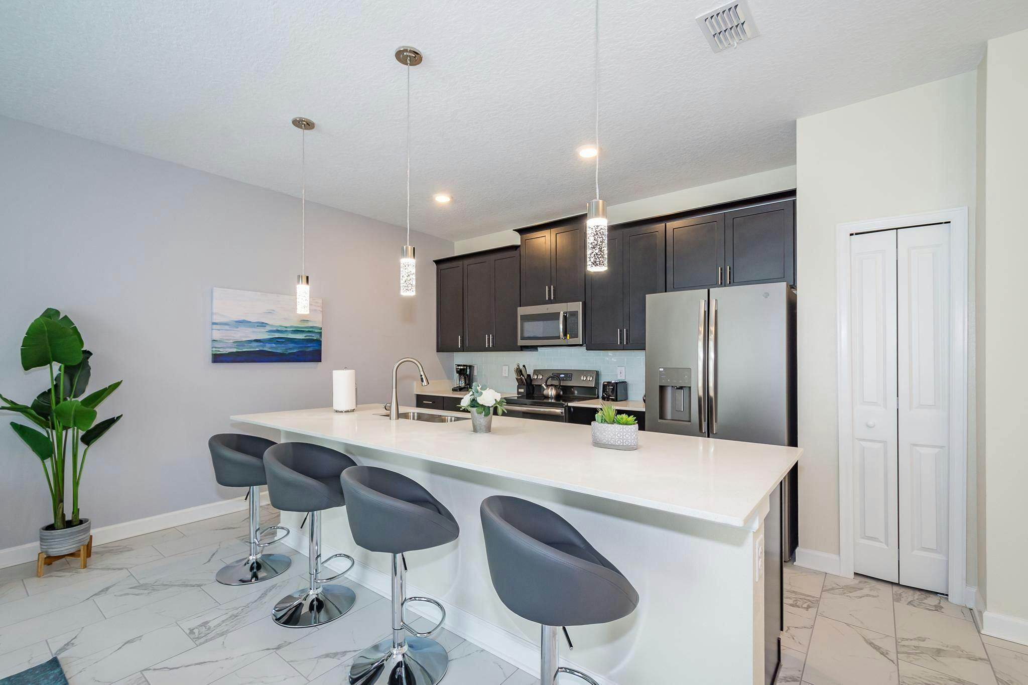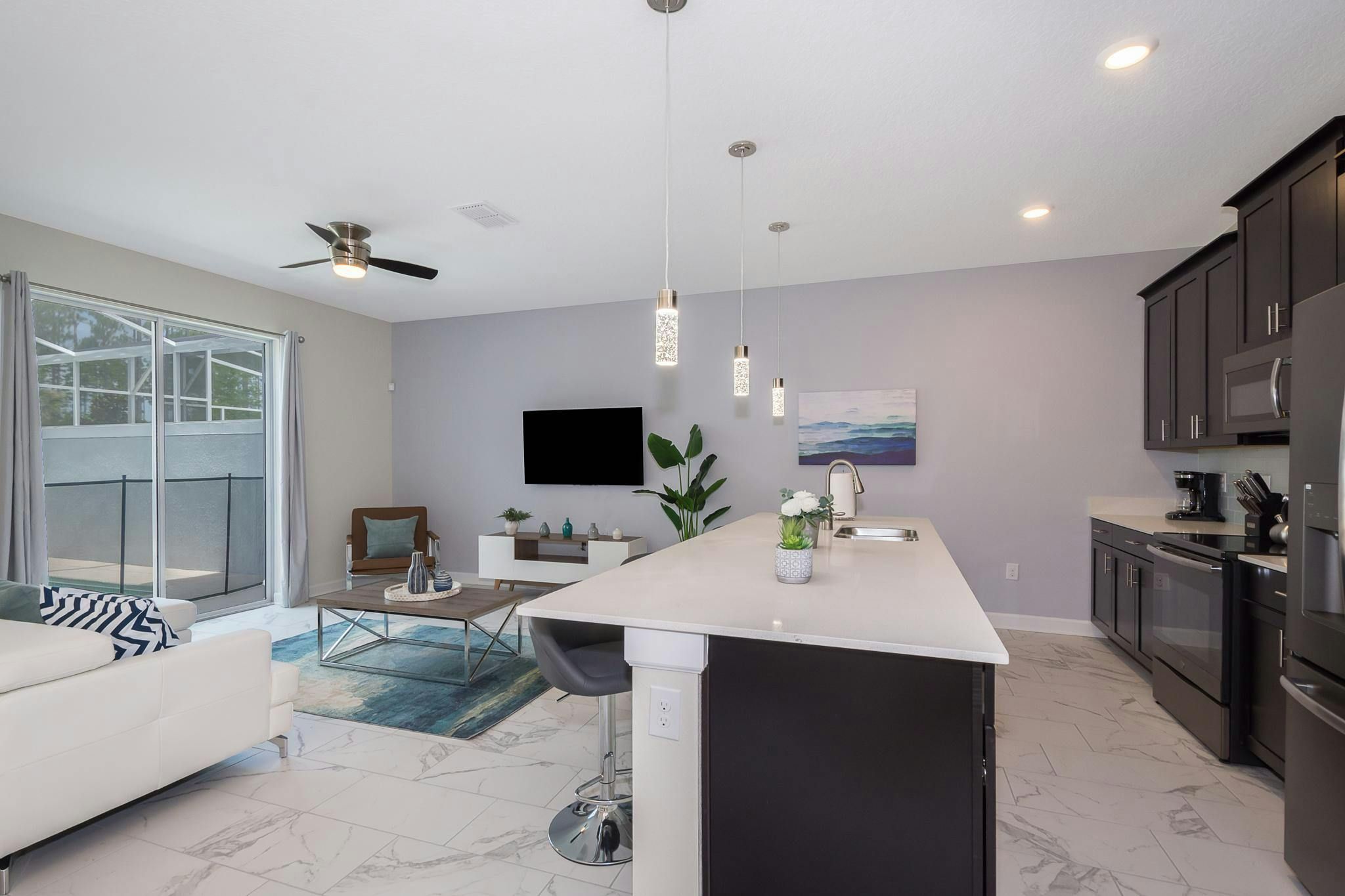 This stunning new vacation rental with a private pool is perfect for families or groups of friends. With four bedrooms and three bathrooms, it comfortably sleeps up to eight guests. The two king bedrooms and two bedrooms with one full and one twin bed each provide plenty of sleeping space. The rental is located in the Champions Gate Resort's new phase, surrounded by golf courses and tennis courts. Guests have access to the Clubhouse Resort's excellent amenities, including two pools (including a lazy river), a restaurant, gym, business center, game room, cinema, and more. Whether you want to relax by the pool or stay active with golfing and tennis, this vacation rental has something for everyone.