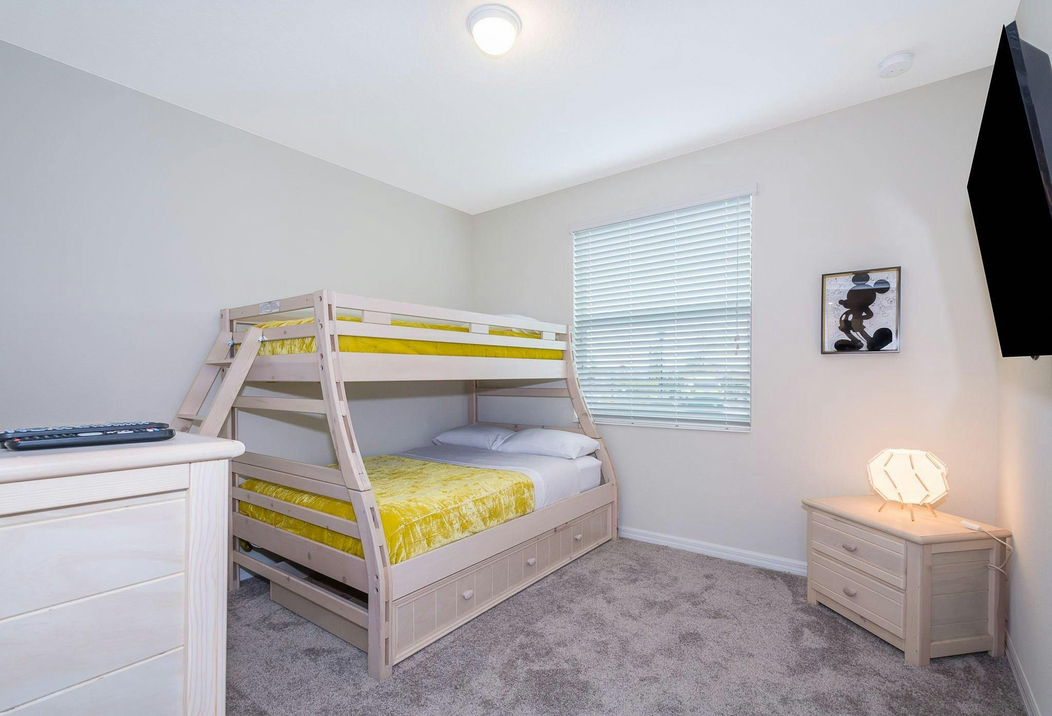 This brand new vacation rental condo is located in the beautiful Storey Lake Resort, providing guests with an unforgettable vacation experience. The property boasts three cozy bedrooms, including a king bedroom on suite, a full and twin bedroom, and a bunk bed twin over full bedroom. The community is conveniently located close to Disney, Disney Springs, Malls, and Walmart. Guests can enjoy the newly opened clubhouse resort that offers great amenities, including two pools (one with a lazy river), a restaurant, gym, and more.