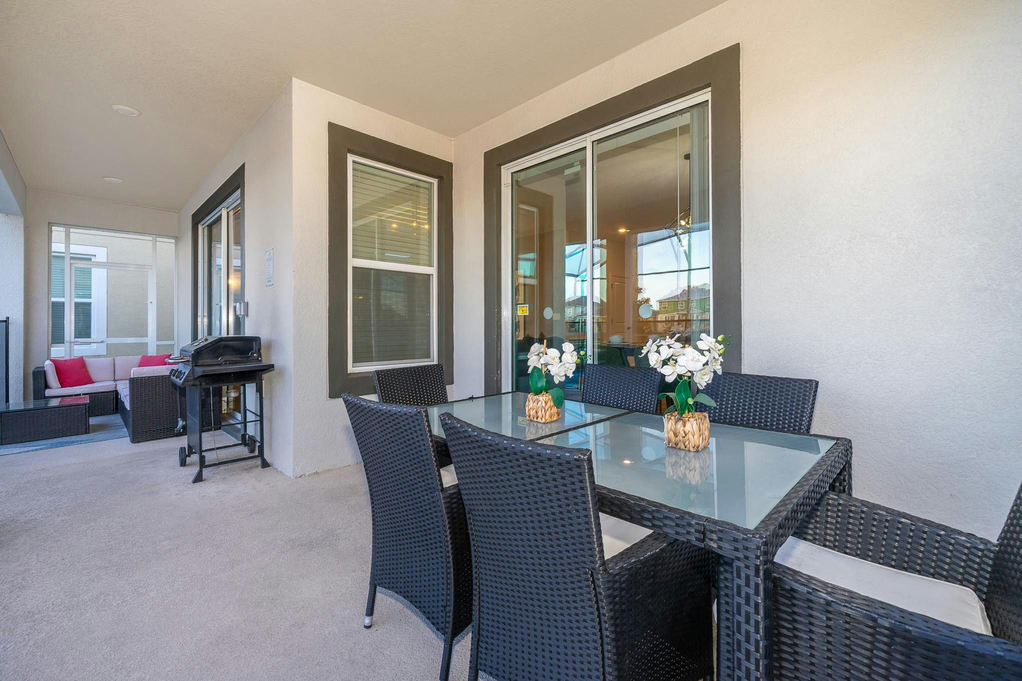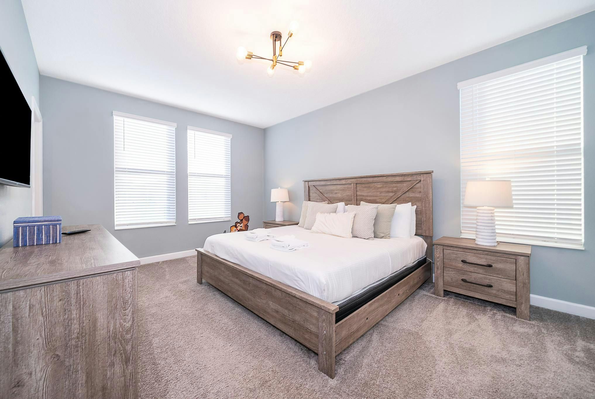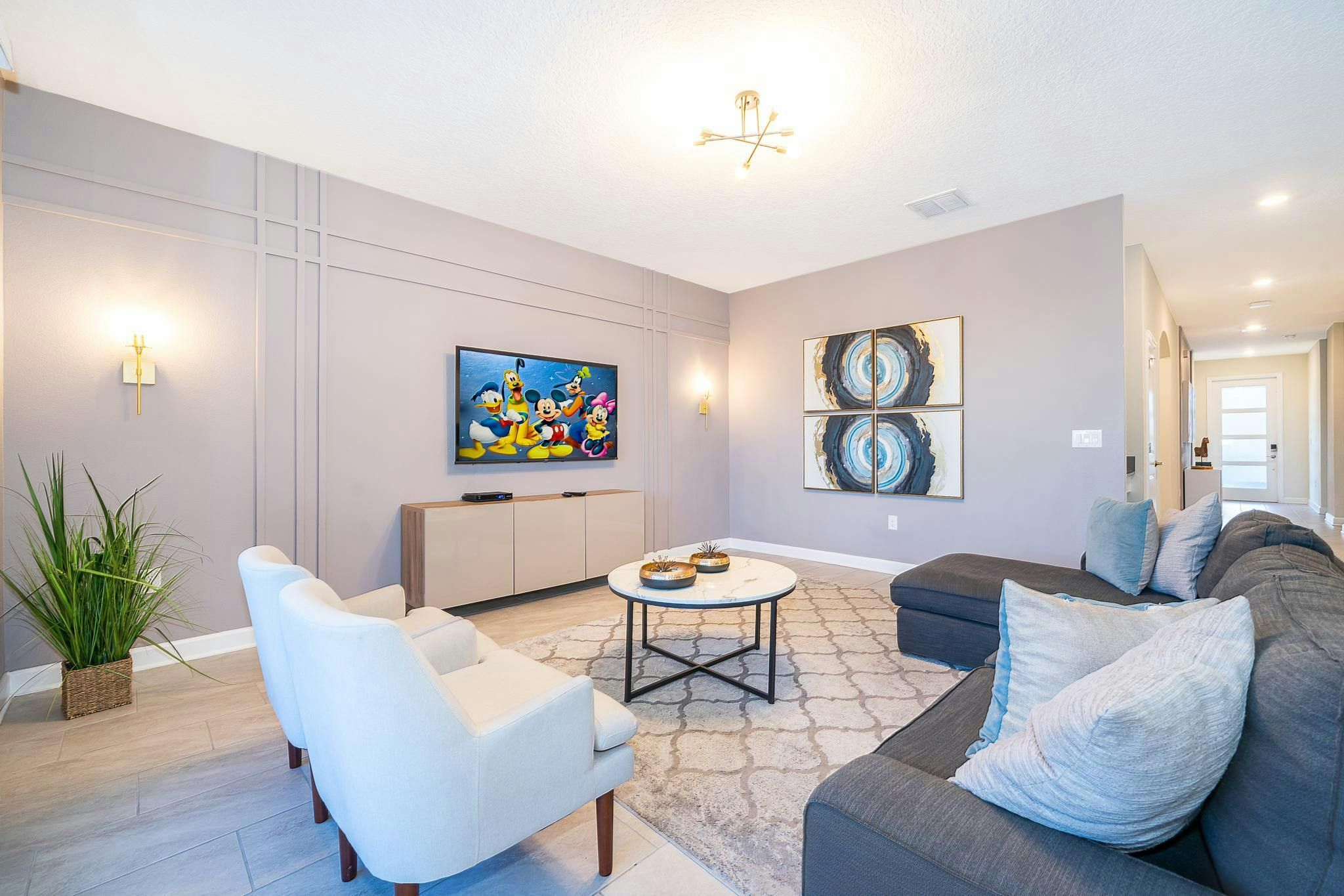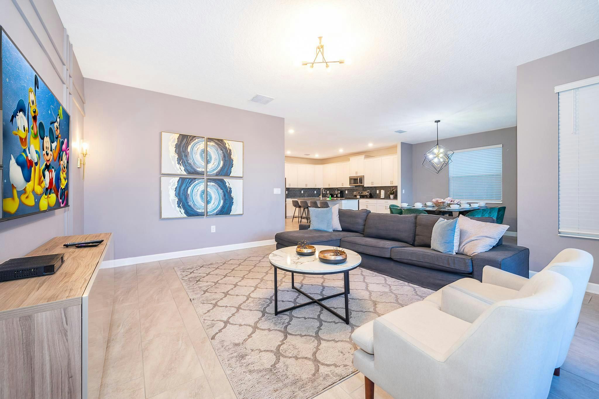 This brand new single-family home in Champions Gate boasts luxury and comfort with six bedrooms and five bathrooms, one of which is located downstairs. The fully equipped kitchen and laundry room make it easy to feel at home. Enjoy the private screened pool and spa, and take advantage of the private parking. With big TVs, internet, and cable, you'll have everything you need to stay entertained. The location is perfect for those visiting Disney as well as those looking for shopping and dining options. Take advantage of the amenities at the clubhouse, including two pools, a lazy river, restaurant, gym, and business center. For those looking to stay active, golf courses and tennis courts are just steps away.