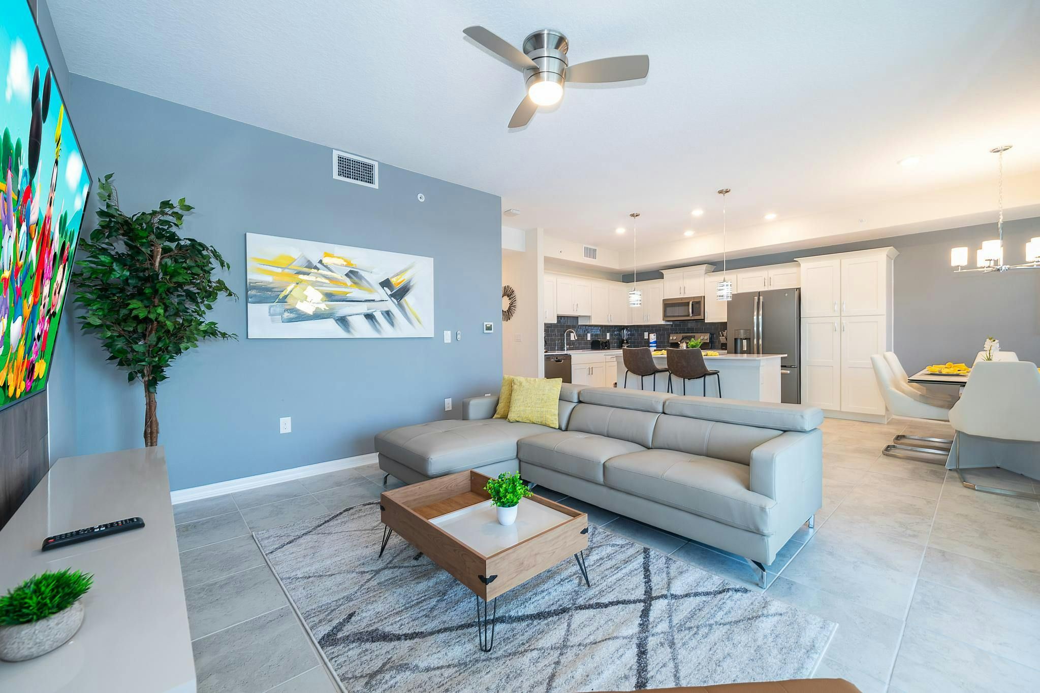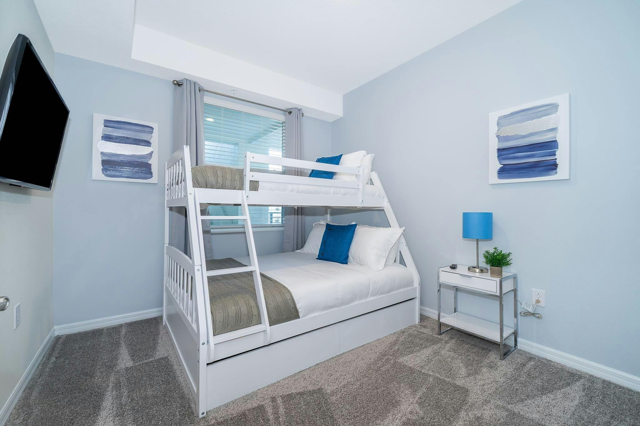This stunning 2-bedroom, 2-bathroom vacation rental condo is located in Storey Lake Resort and boasts a beautiful lake view. The bedrooms consist of one King bedroom on suite and one bedroom with bunk beds twin over full + a Sofabed. The community is the closest to Disney, Disney Springs, Malls, and Walmart, making it an ideal location for those looking to explore the area. Guests can enjoy the recently opened clubhouse resort which offers great amenities, including two pools (one with a lazy river), a restaurant, gym, business center, and more. With its luxurious amenities and prime location, this vacation rental condo is sure to make for an unforgettable getaway.
