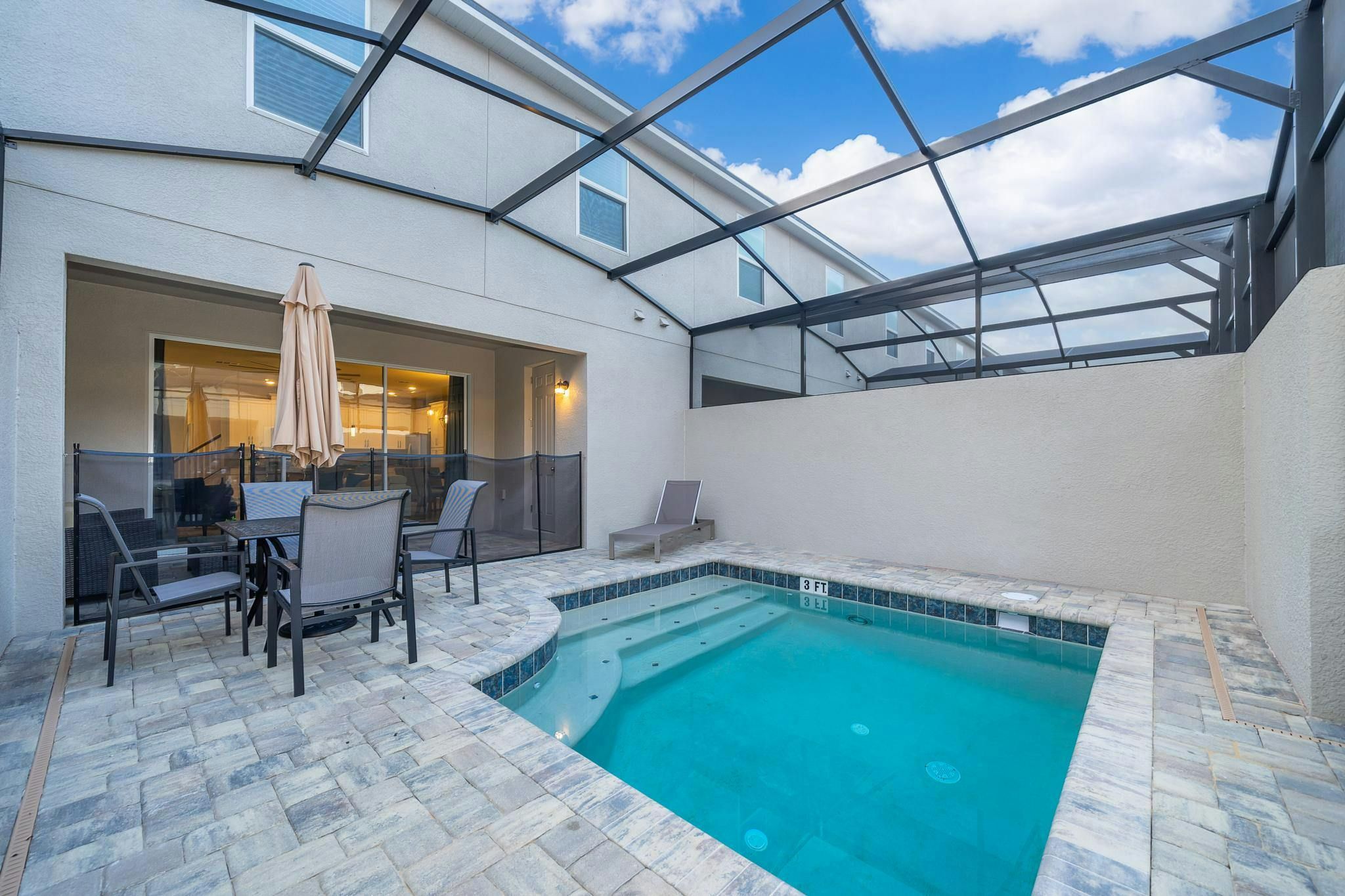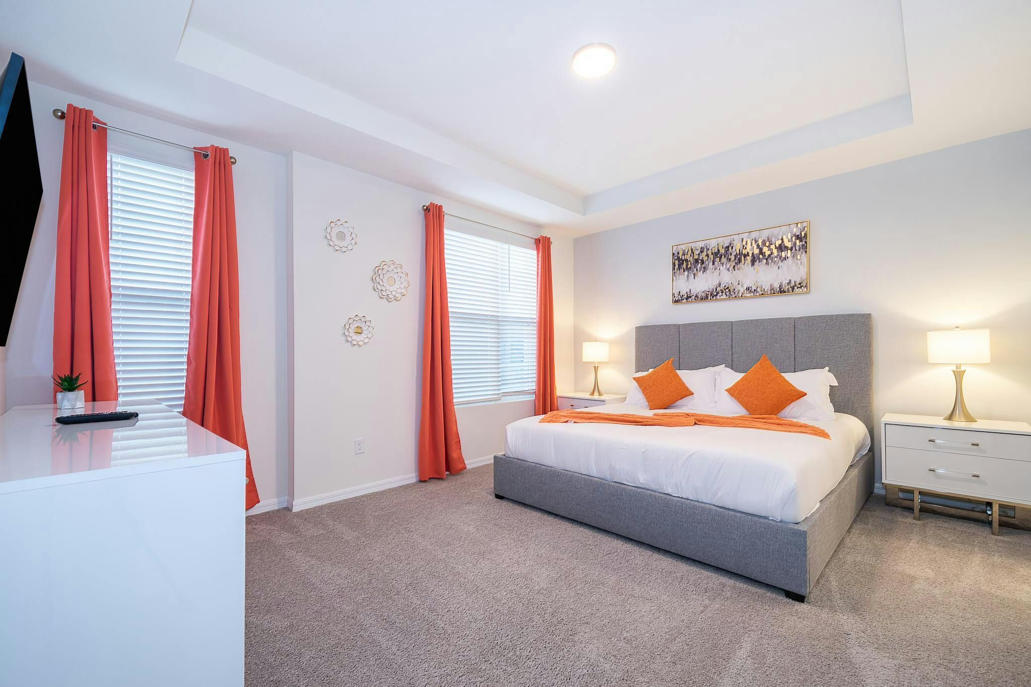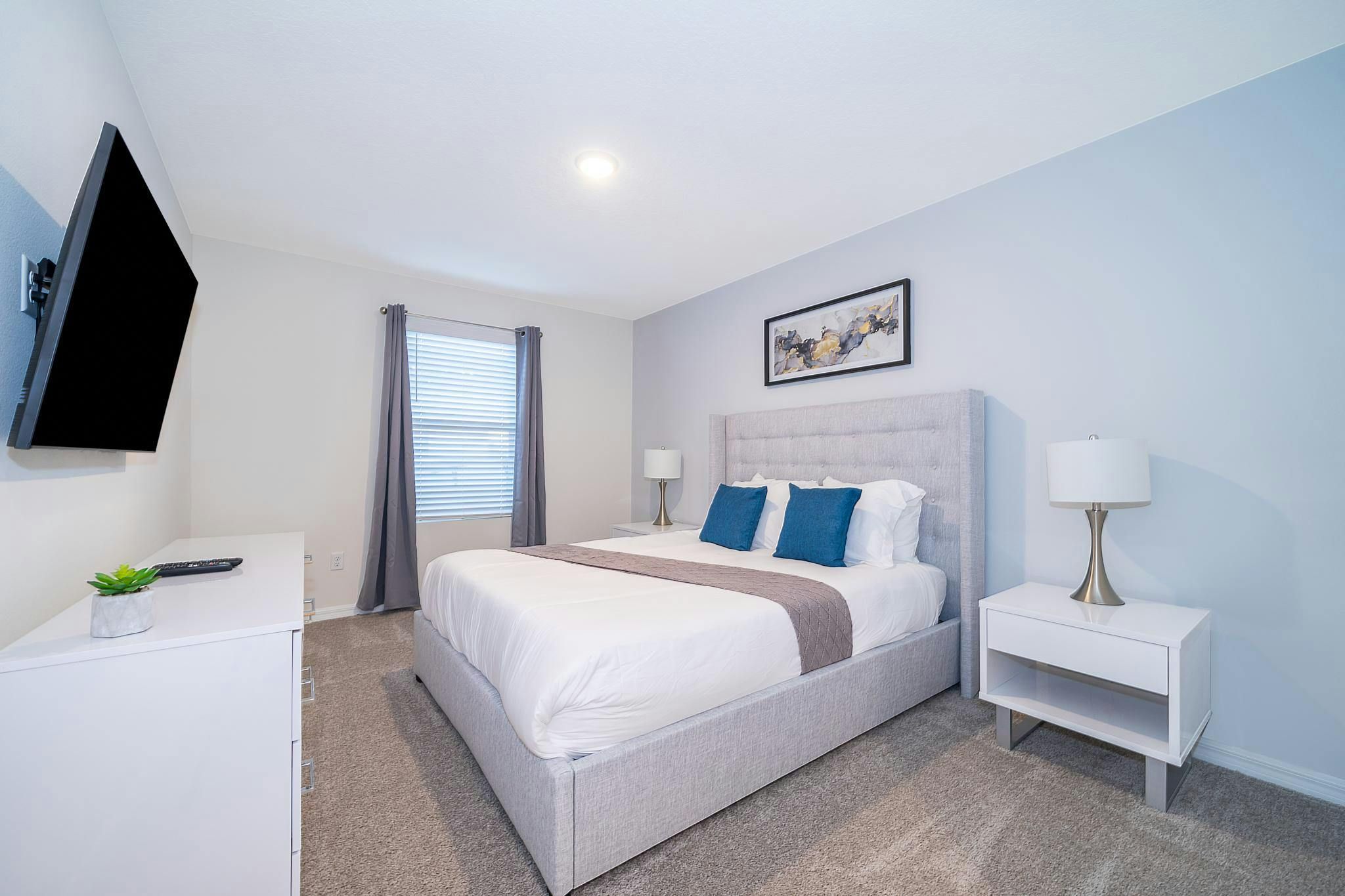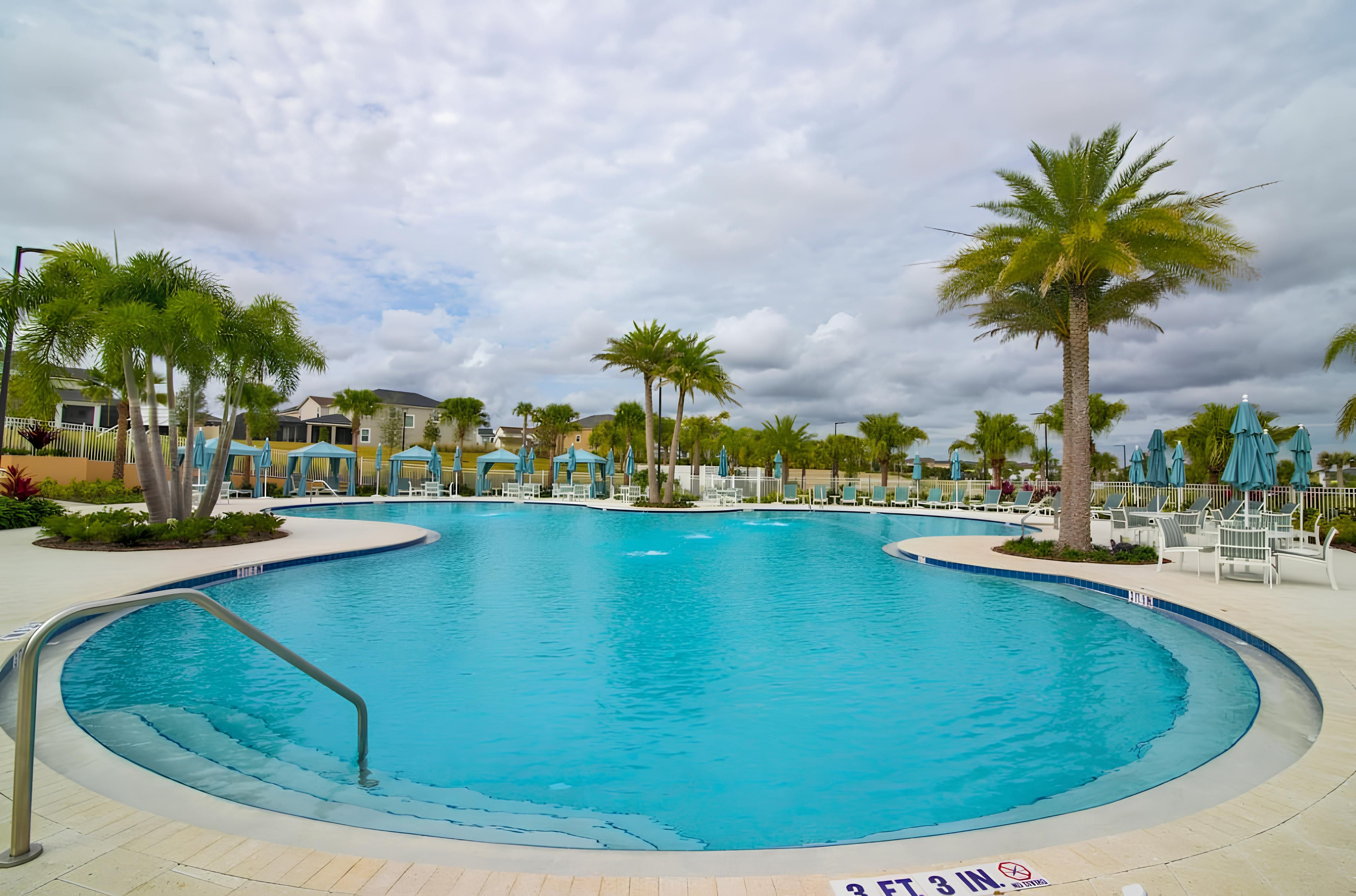 This brand new vacation rental boasts 5 bedrooms and 4.5 bathrooms, complete with a private pool. The property is located in Solara Resort and includes one bedroom downstairs, while the remaining bedrooms are upstairs. Guests will find a king suite downstairs and another king bedroom, queen bedroom, and two bedrooms with full and twin beds each upstairs. The property is newly furnished and decorated, complete with a fully equipped kitchen and washer/dryer. Internet and cable are included for guests’ convenience. The vacation rental is conveniently located near Disney, restaurants, and shopping centers. Additionally, guests can enjoy resort amenities such as two pools (including a Flow Rider), a restaurant, gym, business center, and more at the Clubhouse Resort.