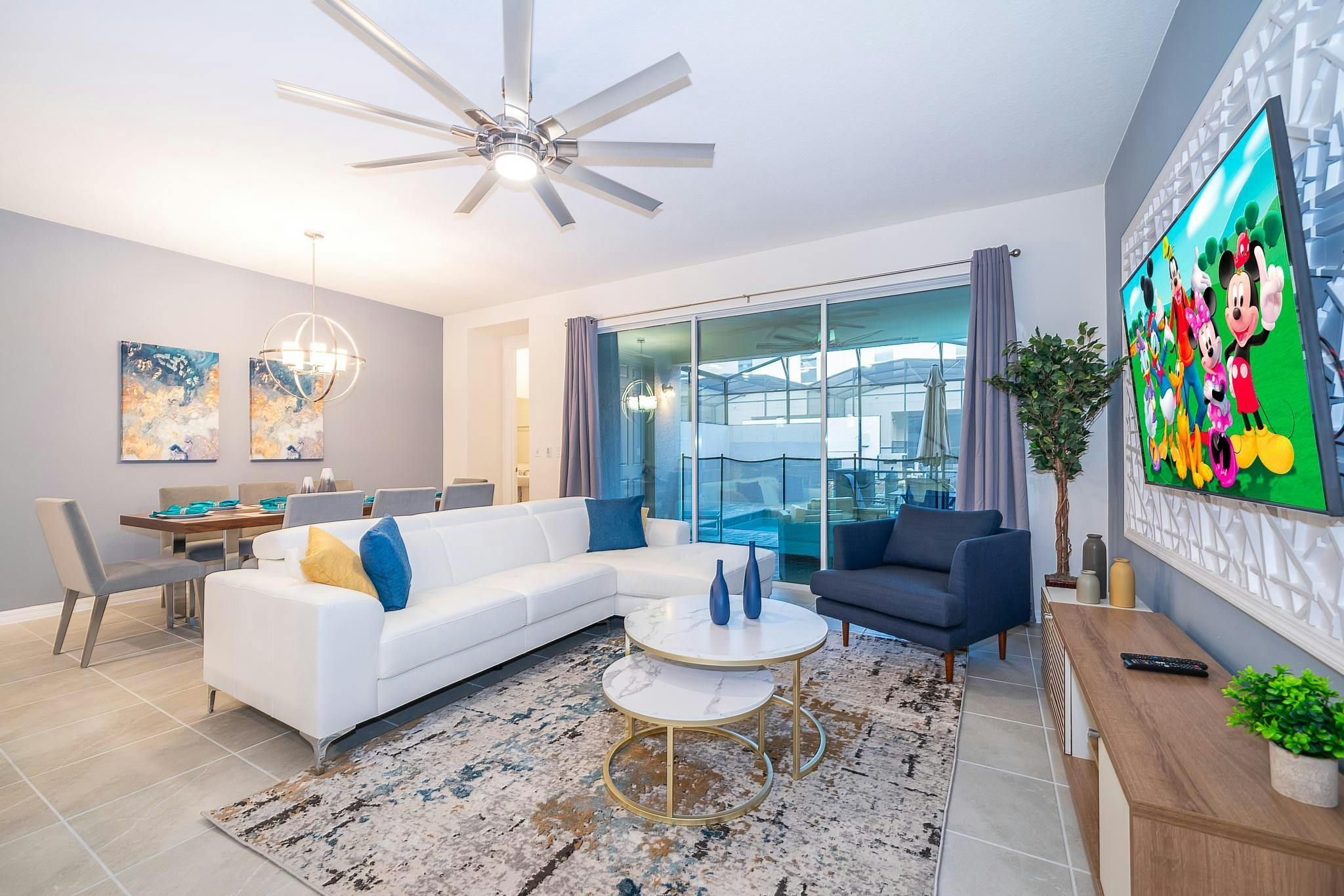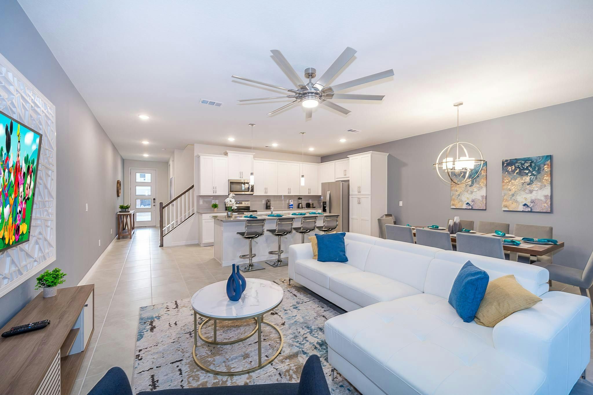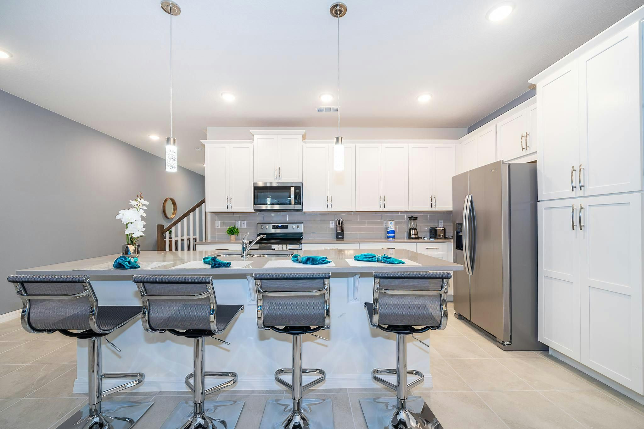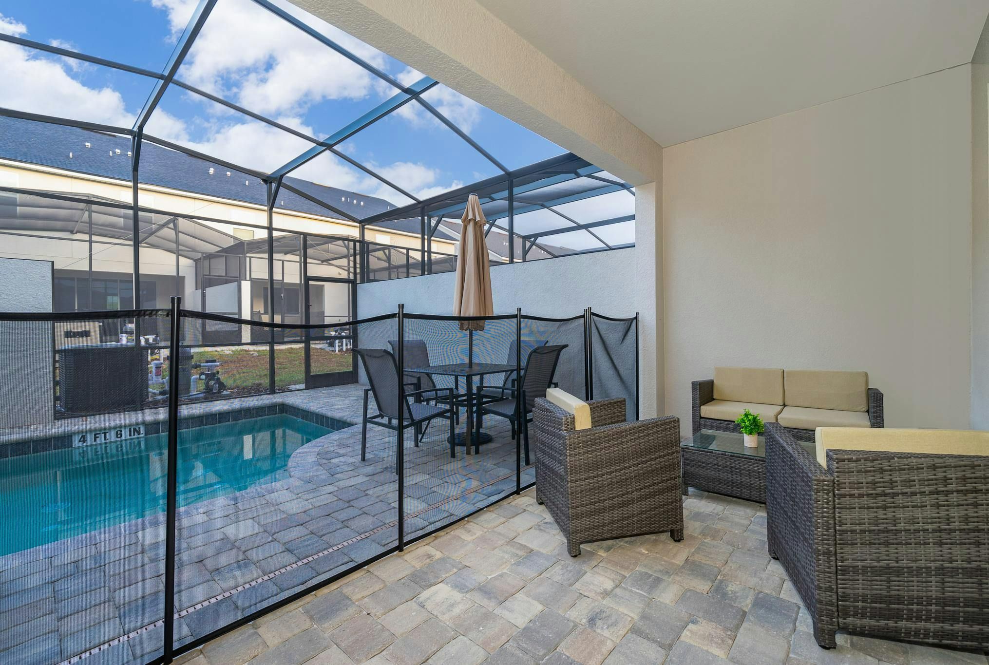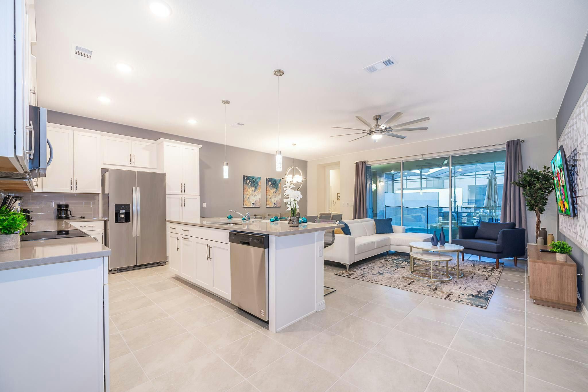 This brand new vacation rental boasts 5 bedrooms and 4.5 bathrooms, complete with a private pool. The property is located in Solara Resort and includes one bedroom downstairs, while the remaining bedrooms are upstairs. Guests will find a king suite downstairs and another king bedroom, queen bedroom, and two bedrooms with full and twin beds each upstairs. The property is newly furnished and decorated, complete with a fully equipped kitchen and washer/dryer. Internet and cable are included for guests’ convenience. The vacation rental is conveniently located near Disney, restaurants, and shopping centers. Additionally, guests can enjoy resort amenities such as two pools (including a Flow Rider), a restaurant, gym, business center, and more at the Clubhouse Resort.
