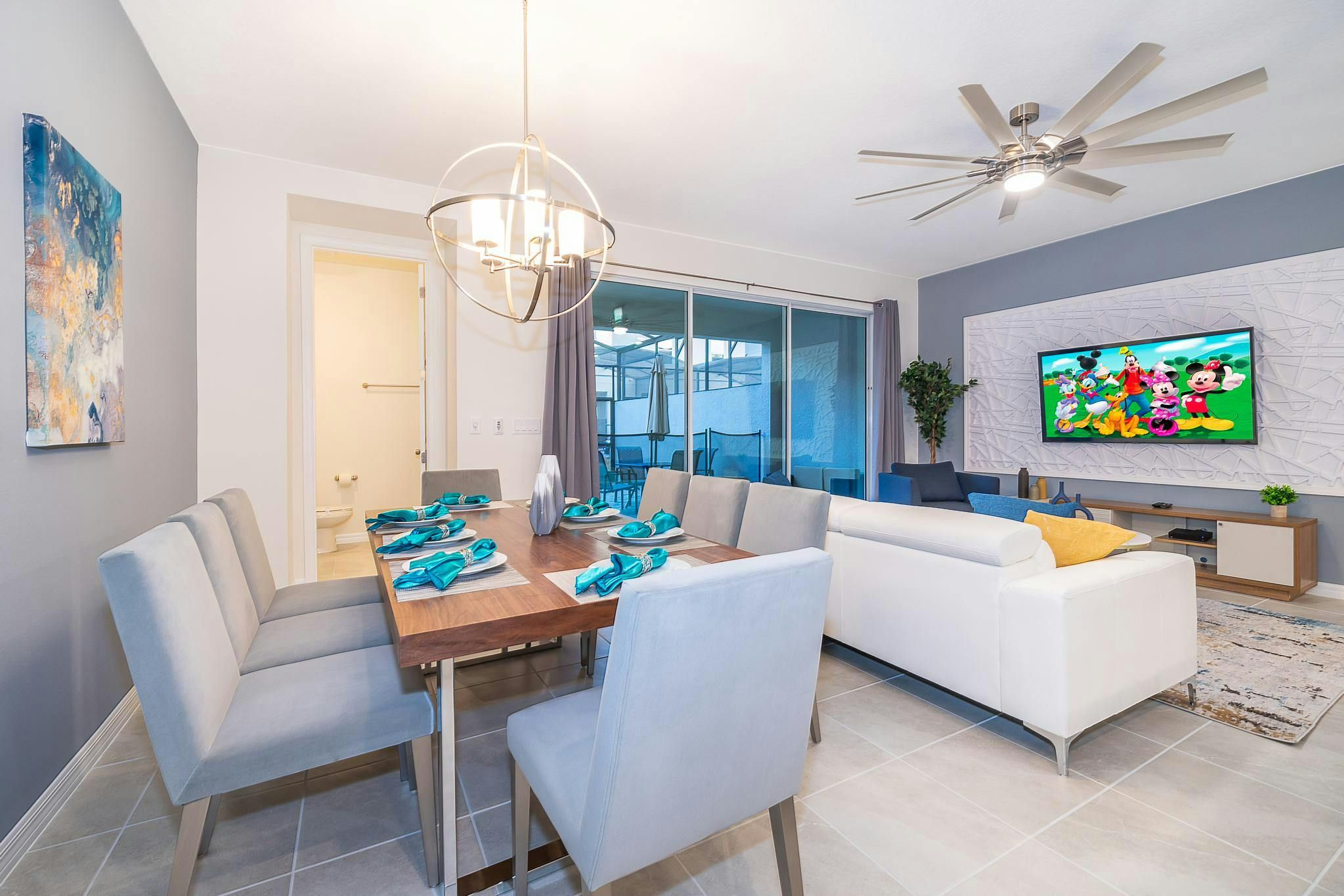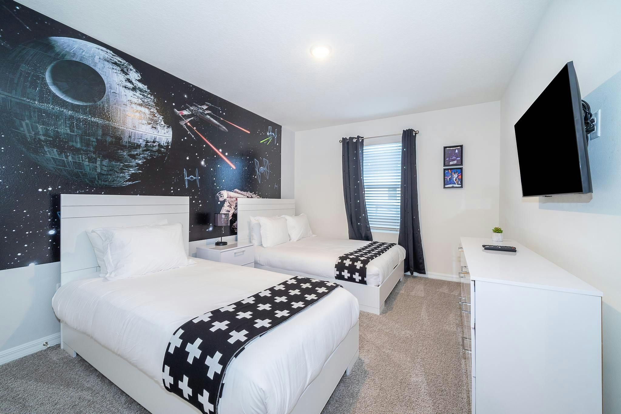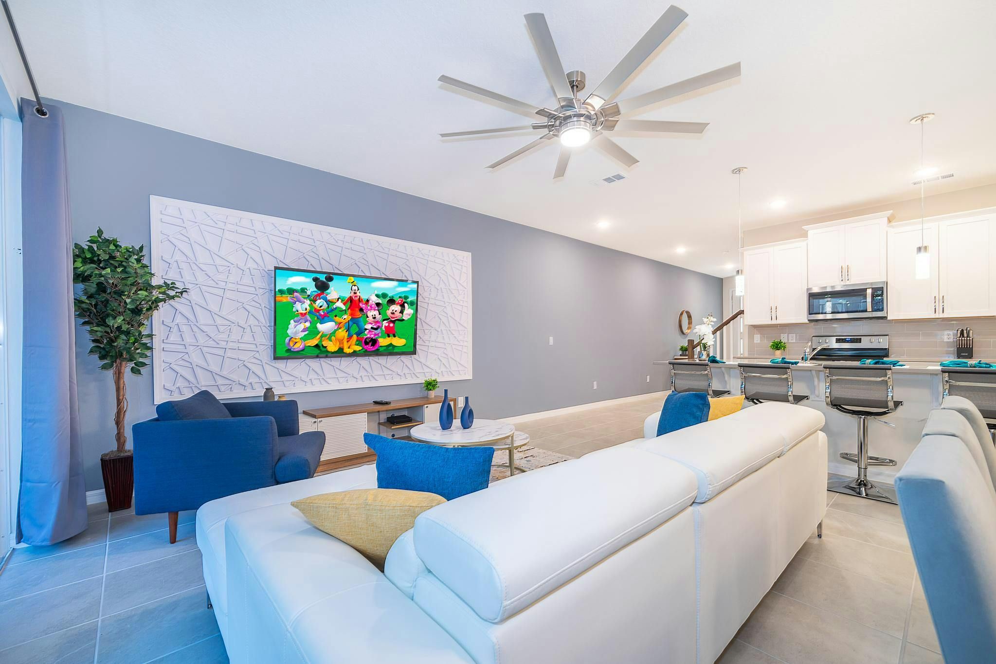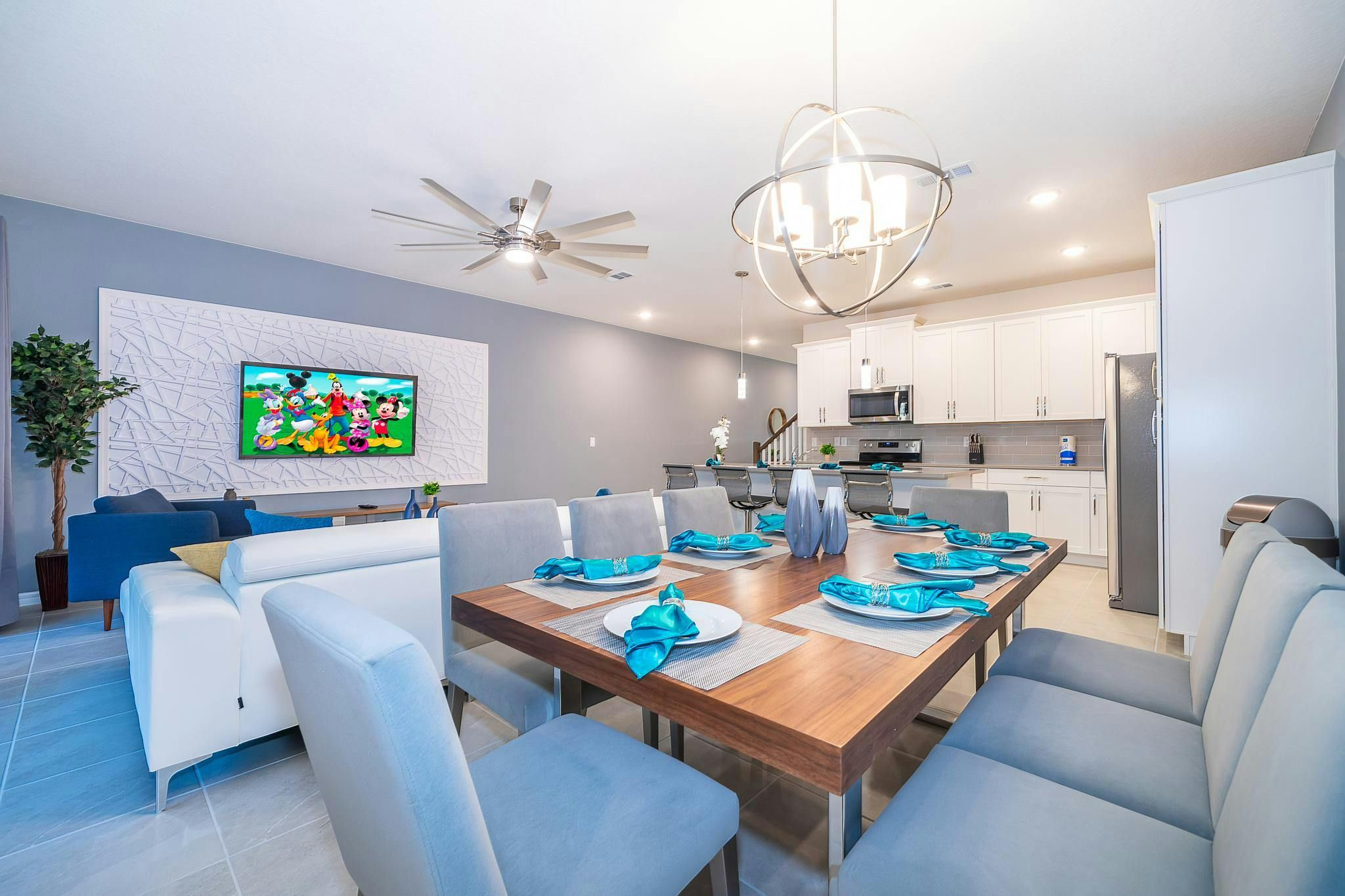 This brand new vacation rental boasts 5 bedrooms and 4.5 bathrooms, complete with a private pool. The property is located in Solara Resort and includes one bedroom downstairs, while the remaining bedrooms are upstairs. Guests will find a king suite downstairs and another king bedroom, queen bedroom, and two bedrooms with full and twin beds each upstairs. The property is newly furnished and decorated, complete with a fully equipped kitchen and washer/dryer. Internet and cable are included for guests’ convenience. The vacation rental is conveniently located near Disney, restaurants, and shopping centers. Additionally, guests can enjoy resort amenities such as two pools (including a Flow Rider), a restaurant, gym, business center, and more at the Clubhouse Resort.