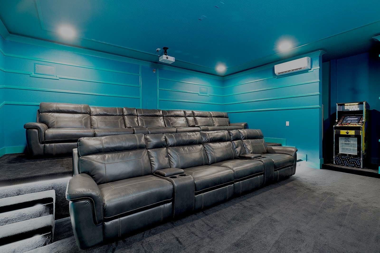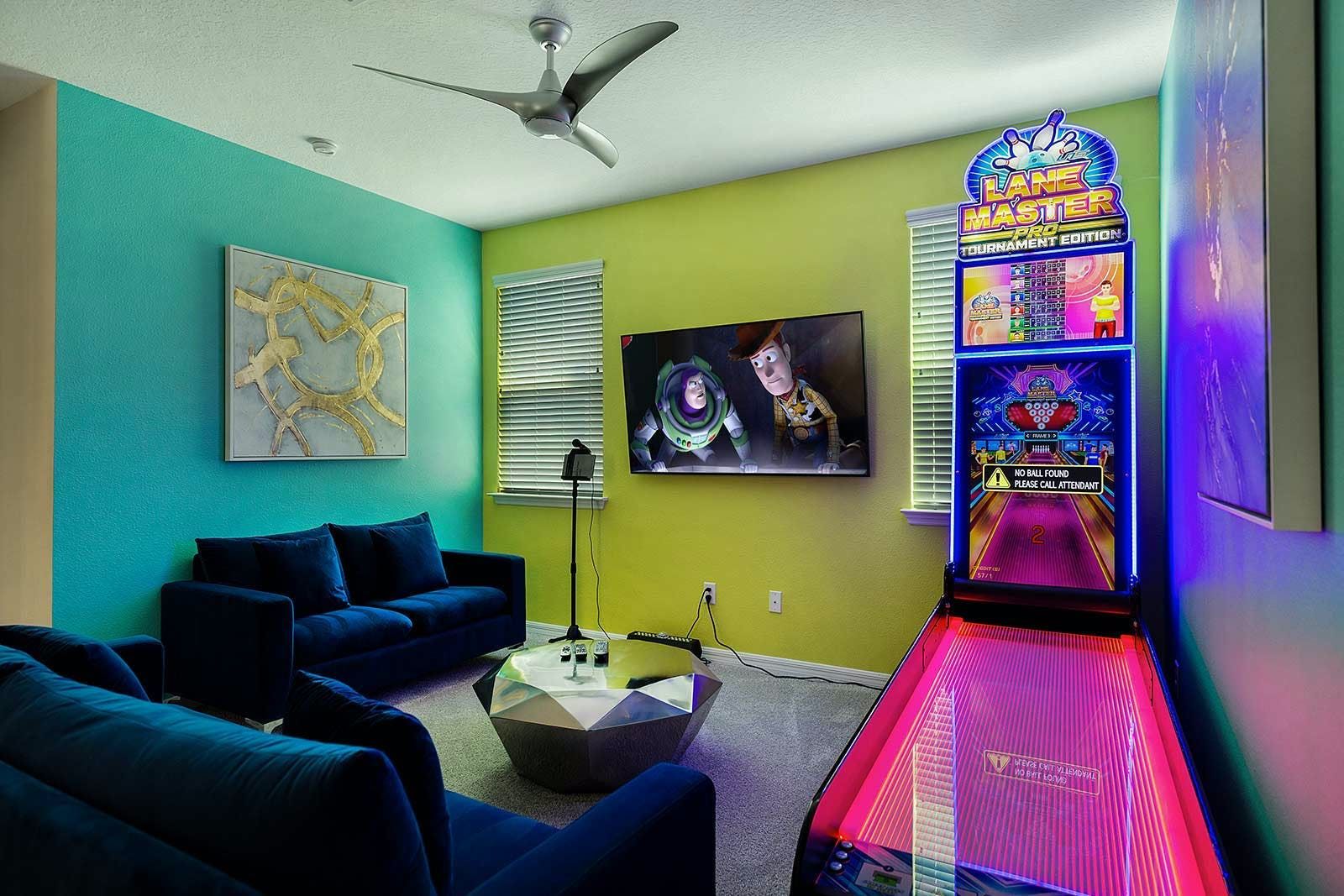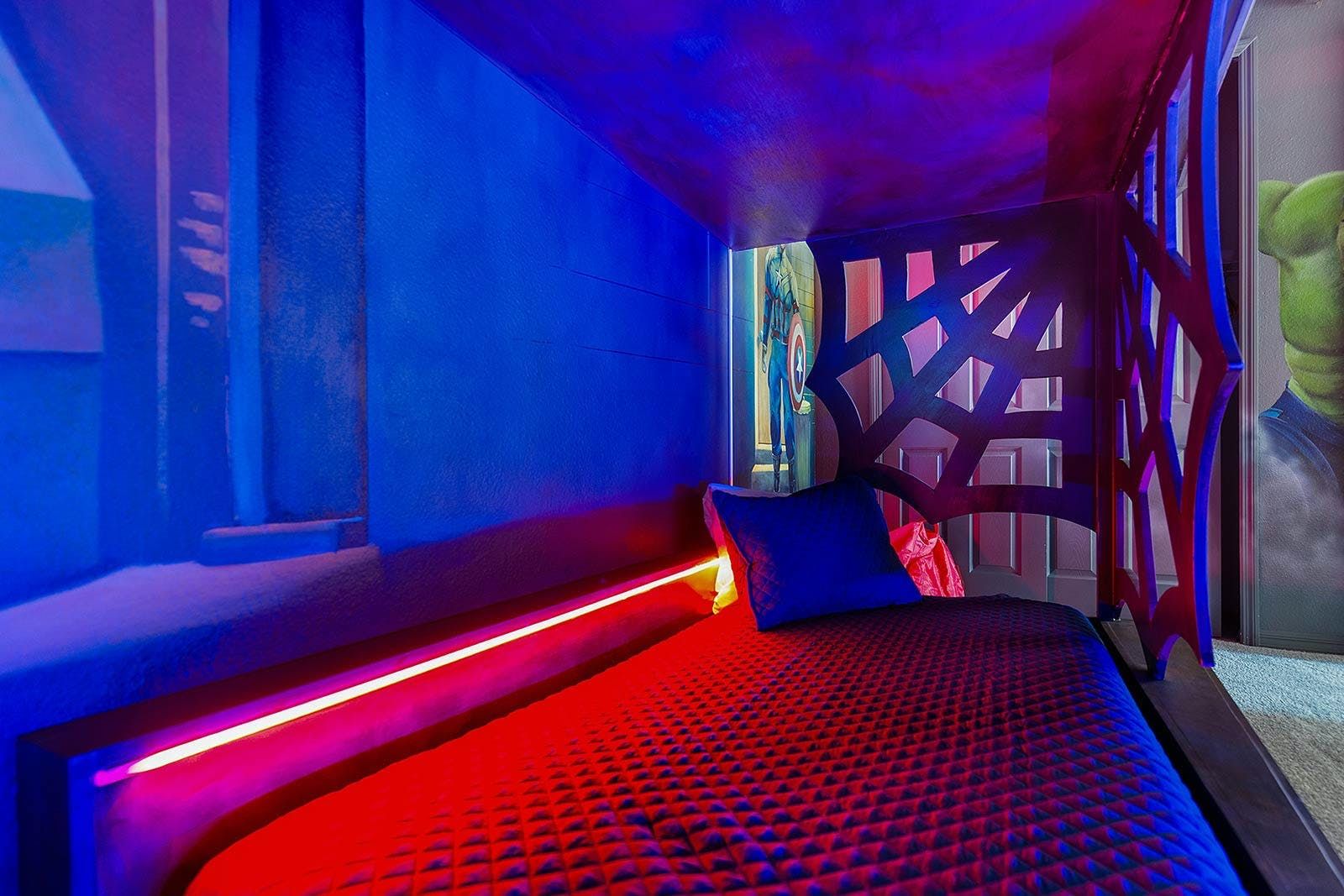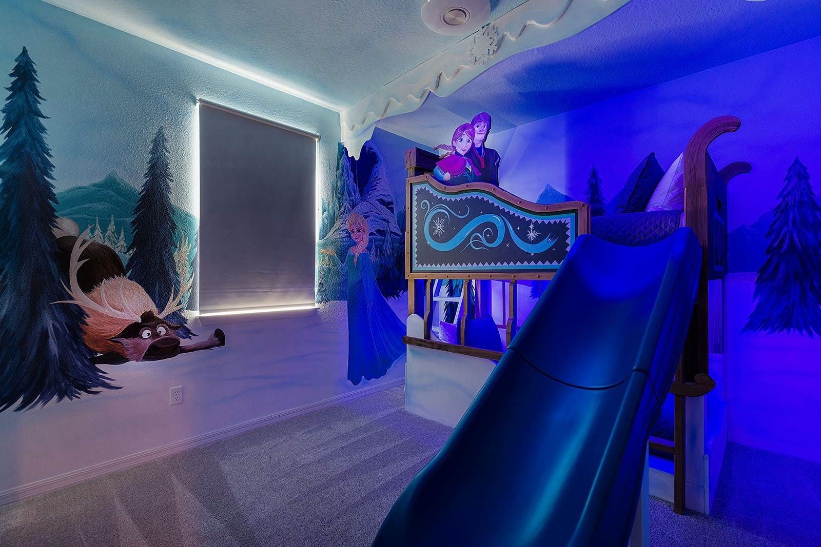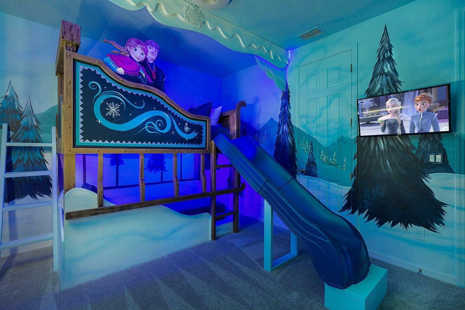 This vacation rental is perfect for families with children who love adventure and excitement. The winter-themed bedroom features a snow-capped bedframe and life-sized princesses, while the superhero-themed bedroom has over-the-top bunk beds and room decor. The house also boasts a private home theater with 10 comfy leather recliners, an arcade section, and a game room/loft with karaoke system, mini jungle gym, and smart TV lounge area. Outside is a screened-in pool and spillover spa surrounded by loungers, foosball table, giant connect four, pool basketball, and outdoor dining area. The kitchen is fully equipped with everything needed for mealtime and the living room has soft couches to relax on. Bedrooms have deluxe mattresses with super soft hotel quality linens. The resort offers luxury amenities such as FlowRider Surfing Simulator, splash parks with water slides, heated Grand Pool, volleyball/basketball/soccer courts, walking trails, fitness center, full-service restaurant, and more. It's located just miles from Disney and other popular attractions like Universal Studios and Sea World.