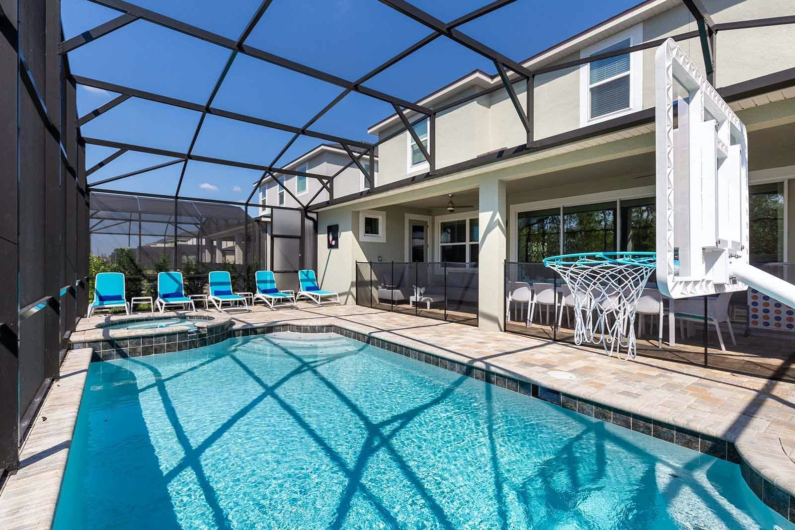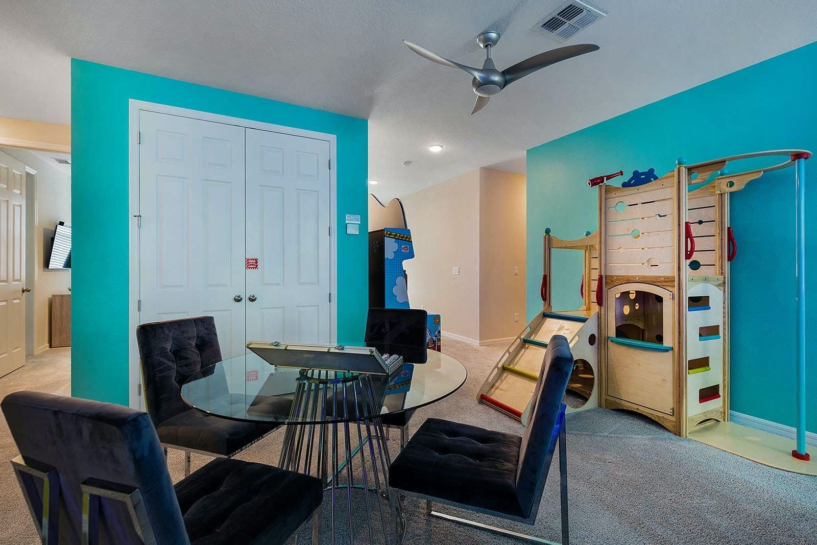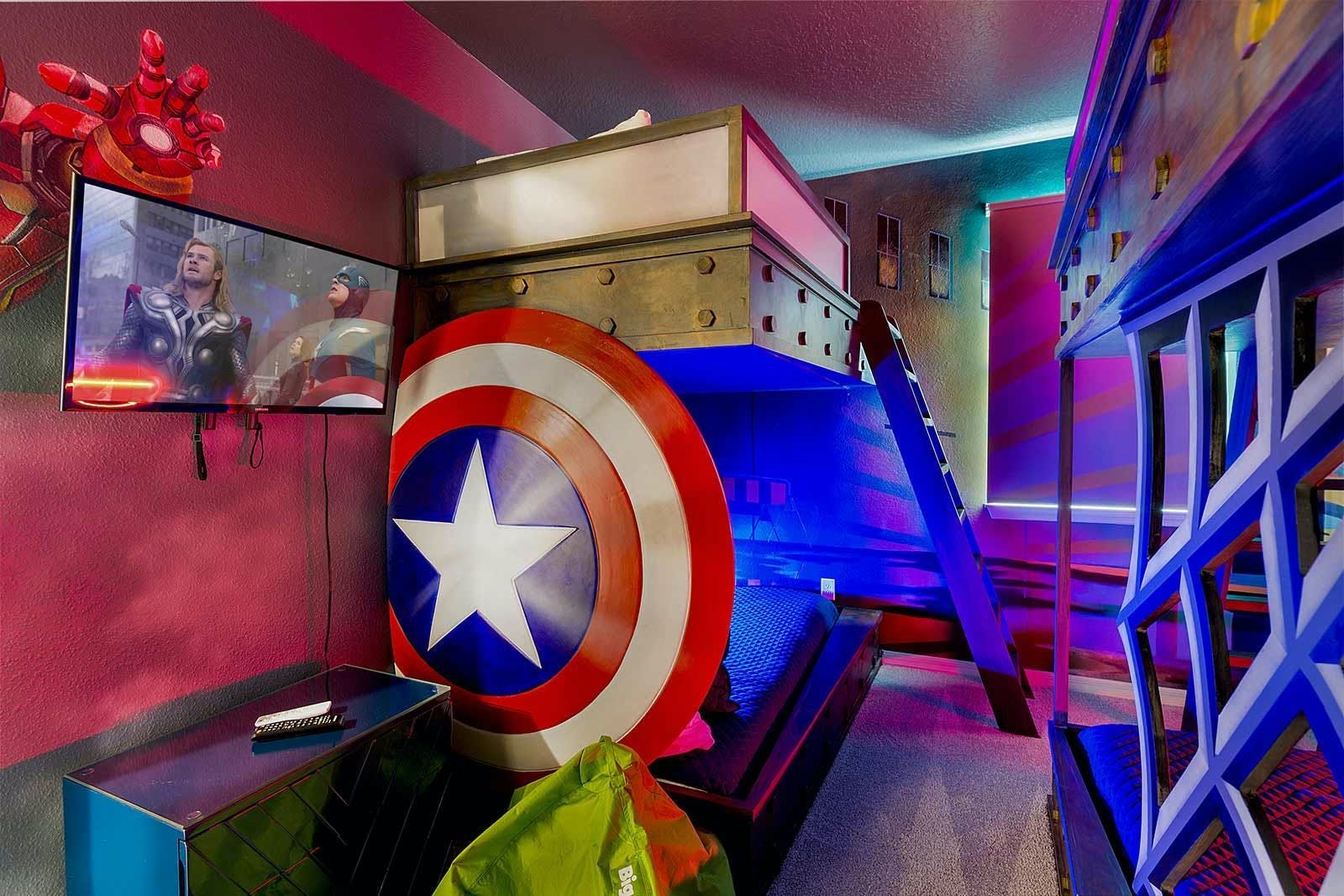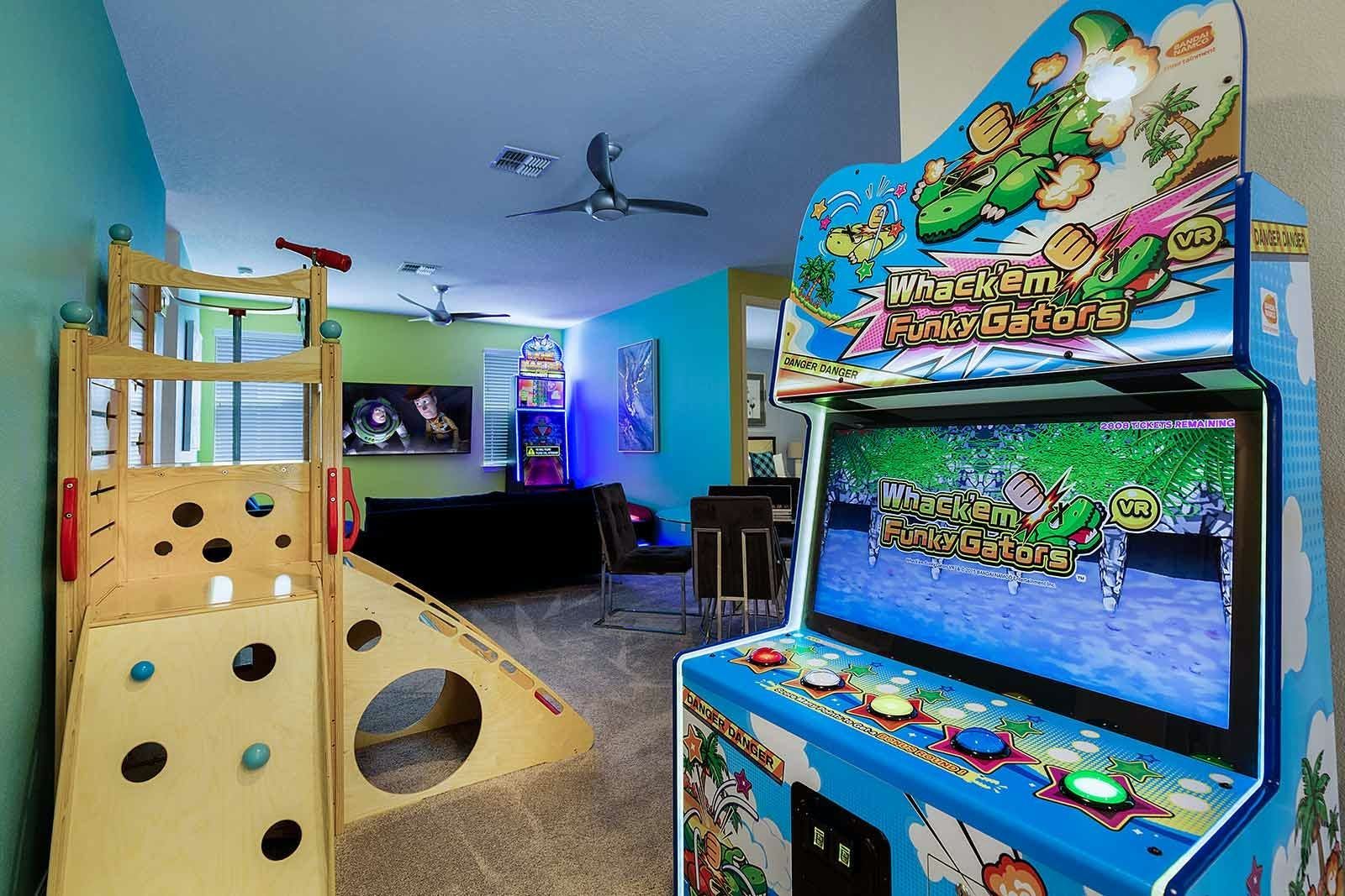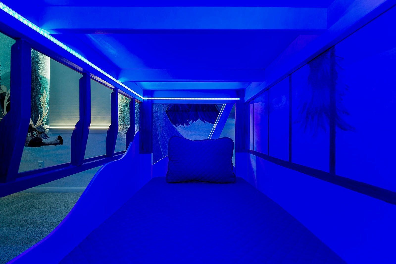 This vacation rental is perfect for families with children who love adventure and excitement. The winter-themed bedroom features a snow-capped bedframe and life-sized princesses, while the superhero-themed bedroom has over-the-top bunk beds and room decor. The house also boasts a private home theater with 10 comfy leather recliners, an arcade section, and a game room/loft with karaoke system, mini jungle gym, and smart TV lounge area. Outside is a screened-in pool and spillover spa surrounded by loungers, foosball table, giant connect four, pool basketball, and outdoor dining area. The kitchen is fully equipped with everything needed for mealtime and the living room has soft couches to relax on. Bedrooms have deluxe mattresses with super soft hotel quality linens. The resort offers luxury amenities such as FlowRider Surfing Simulator, splash parks with water slides, heated Grand Pool, volleyball/basketball/soccer courts, walking trails, fitness center, full-service restaurant, and more. It's located just miles from Disney and other popular attractions like Universal Studios and Sea World.