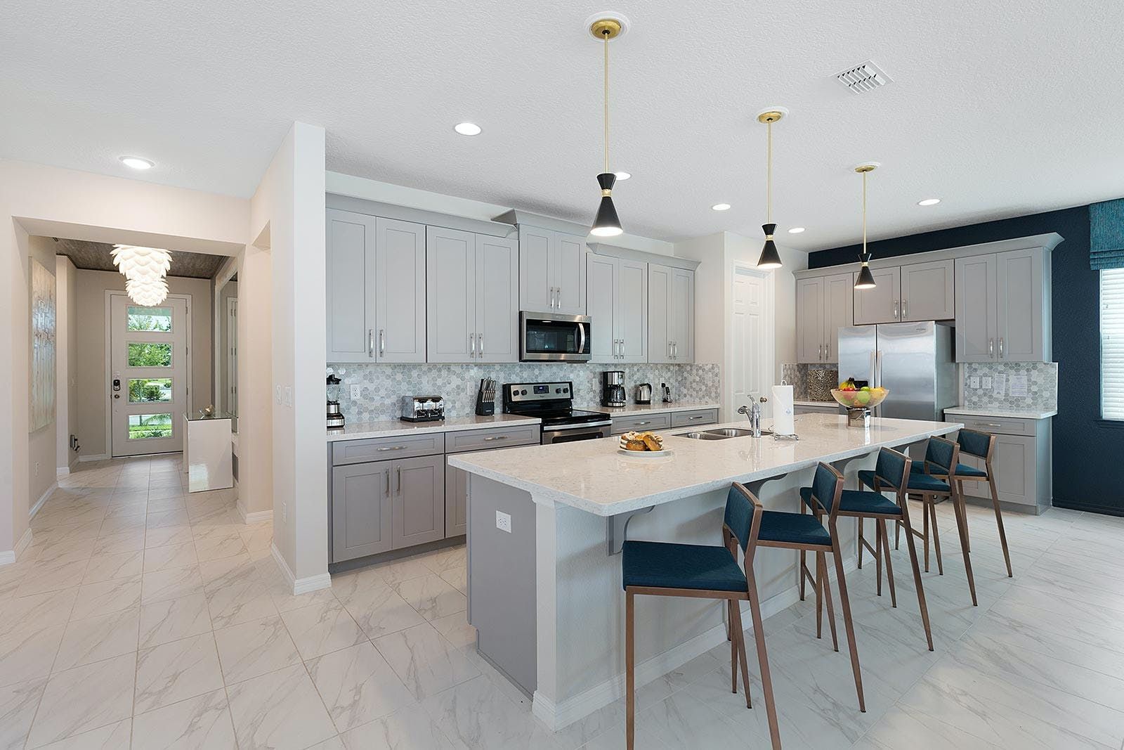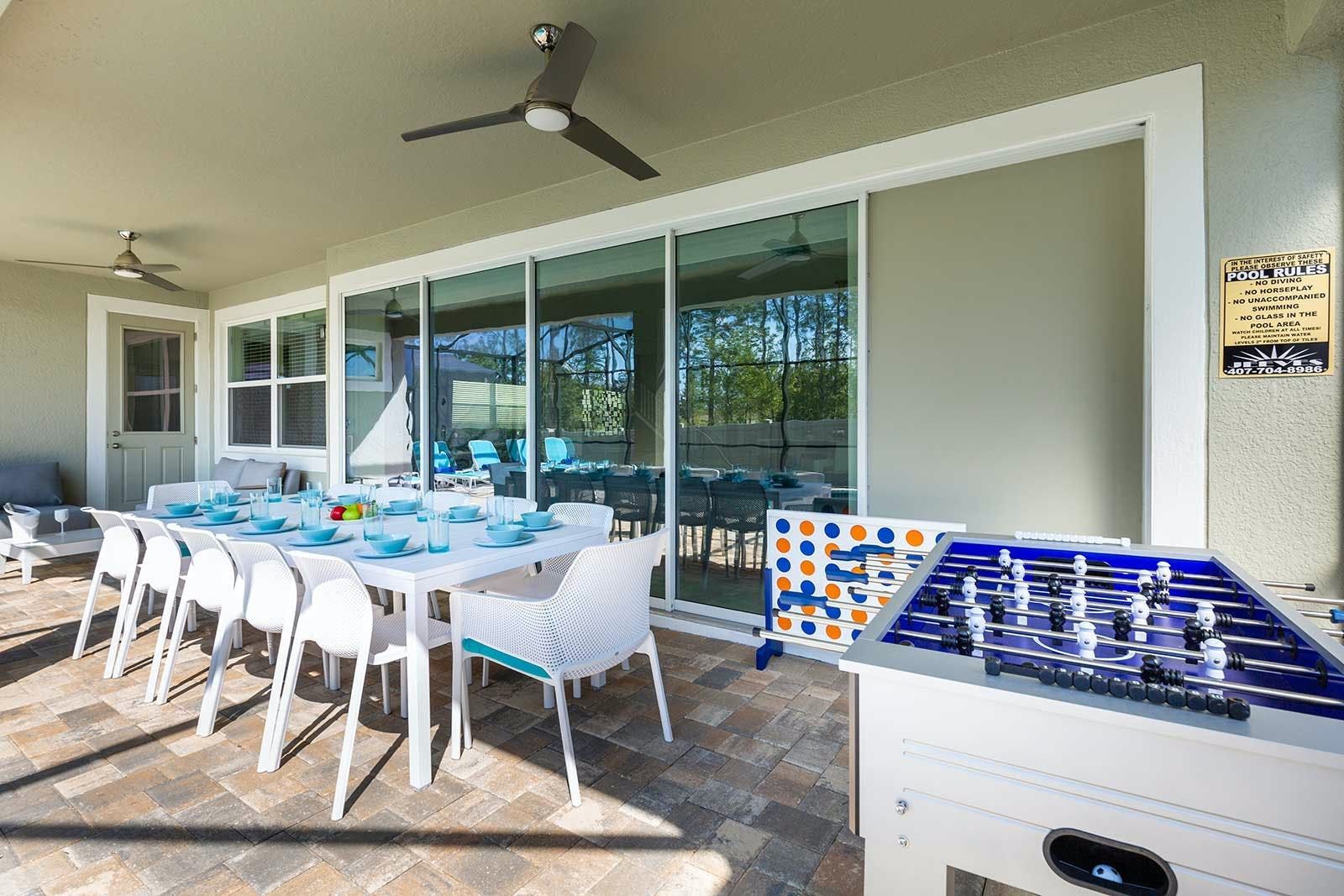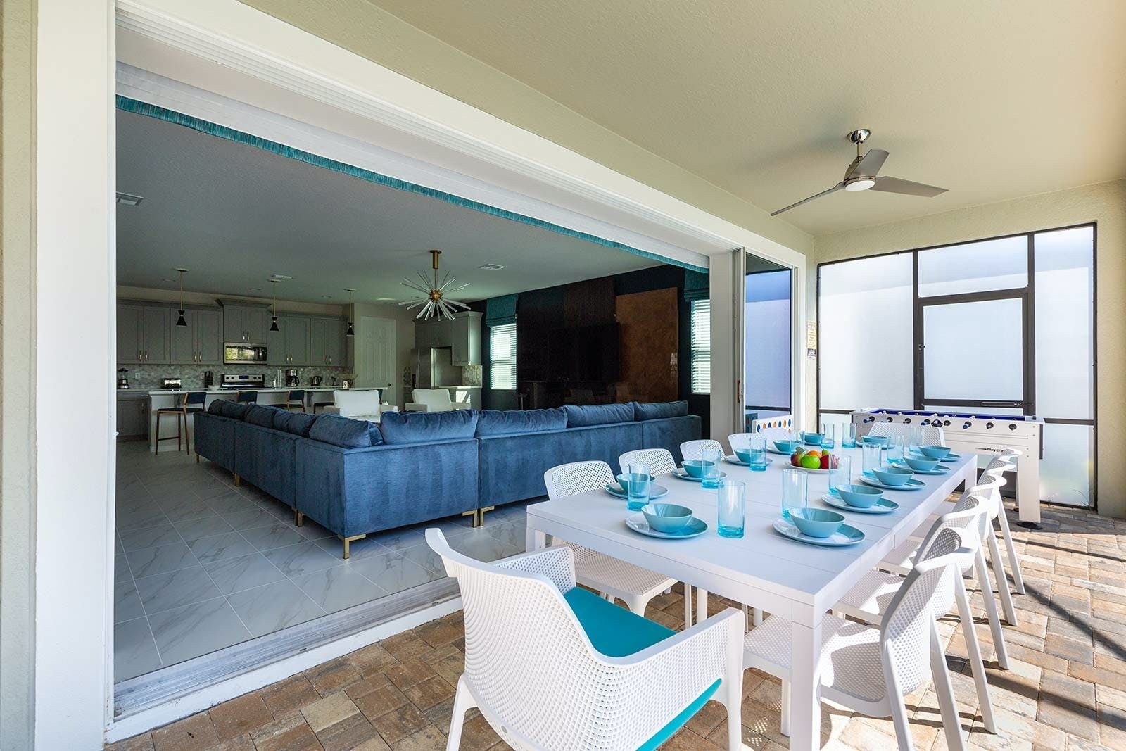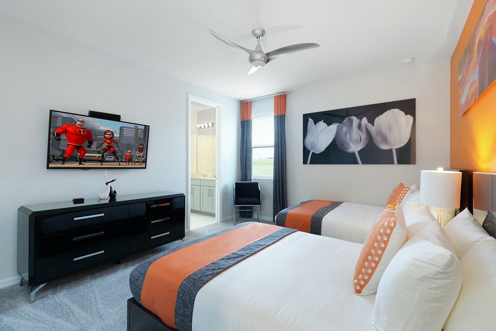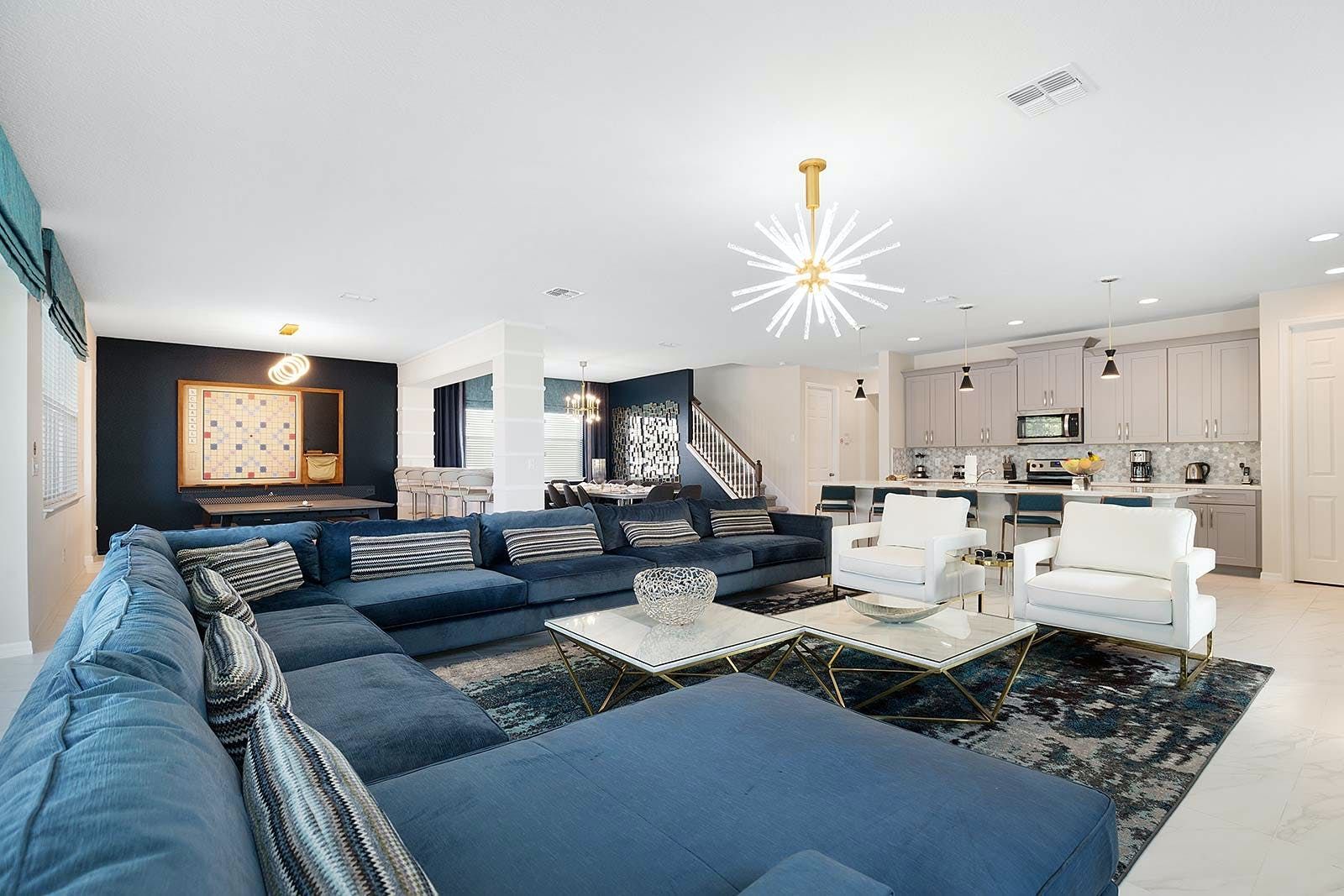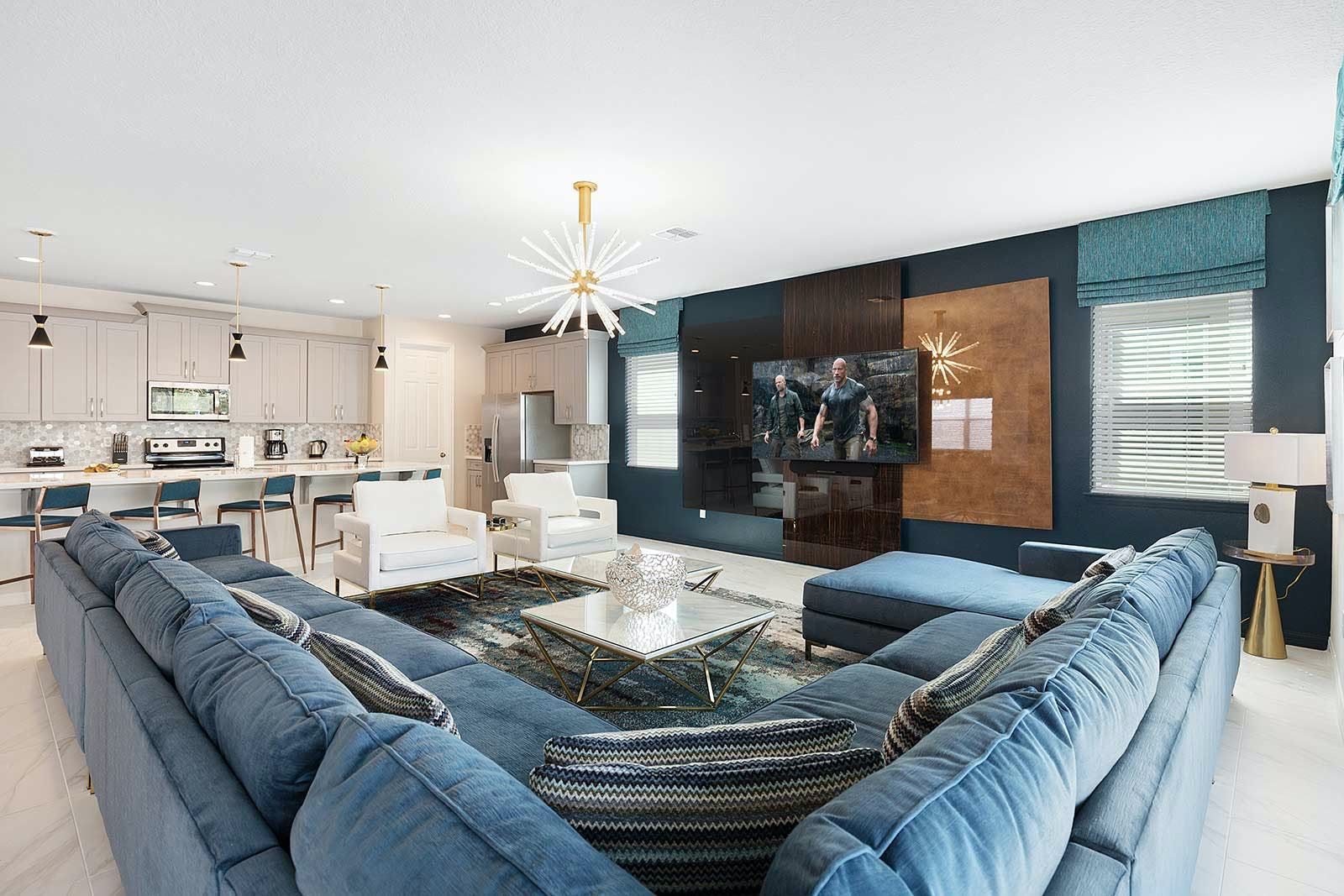 This vacation rental is perfect for families with children who love adventure and excitement. The winter-themed bedroom features a snow-capped bedframe and life-sized princesses, while the superhero-themed bedroom has over-the-top bunk beds and room decor. The house also boasts a private home theater with 10 comfy leather recliners, an arcade section, and a game room/loft with karaoke system, mini jungle gym, and smart TV lounge area. Outside is a screened-in pool and spillover spa surrounded by loungers, foosball table, giant connect four, pool basketball, and outdoor dining area. The kitchen is fully equipped with everything needed for mealtime and the living room has soft couches to relax on. Bedrooms have deluxe mattresses with super soft hotel quality linens. The resort offers luxury amenities such as FlowRider Surfing Simulator, splash parks with water slides, heated Grand Pool, volleyball/basketball/soccer courts, walking trails, fitness center, full-service restaurant, and more. It's located just miles from Disney and other popular attractions like Universal Studios and Sea World.