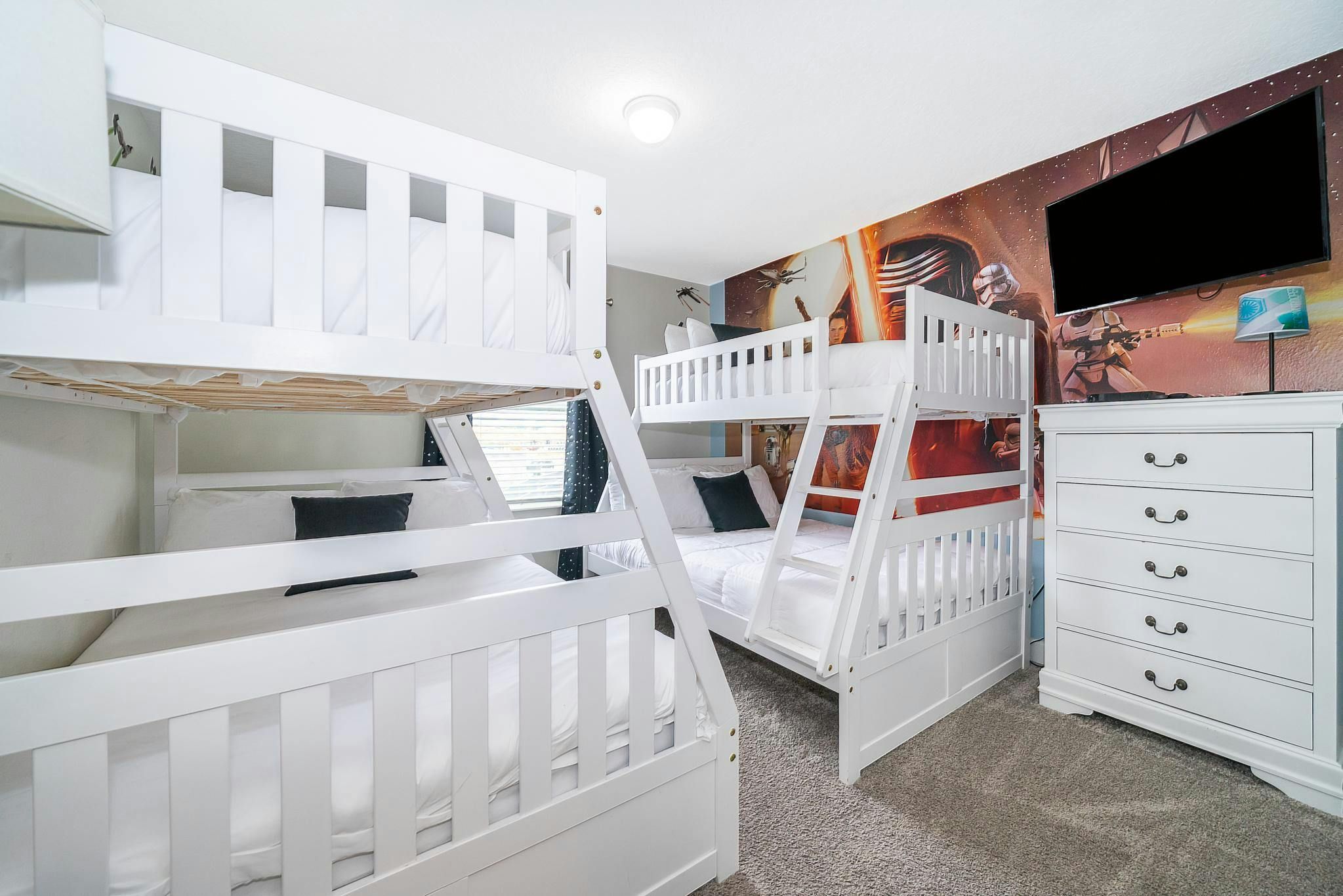 This 4-bedroom, 3-bathroom vacation rental with a pool is located in the new phase of Champions Gate Resort. The bedrooms include 2 king bedrooms, one bedroom with a full and twin beds, and another bedroom with two twin over full bunk beds. The community is surrounded by golf courses and tennis courts. The Clubhouse Resort offers excellent amenities including two pools (one with a lazy river), a restaurant, gym, business center, game room, cinema and more.