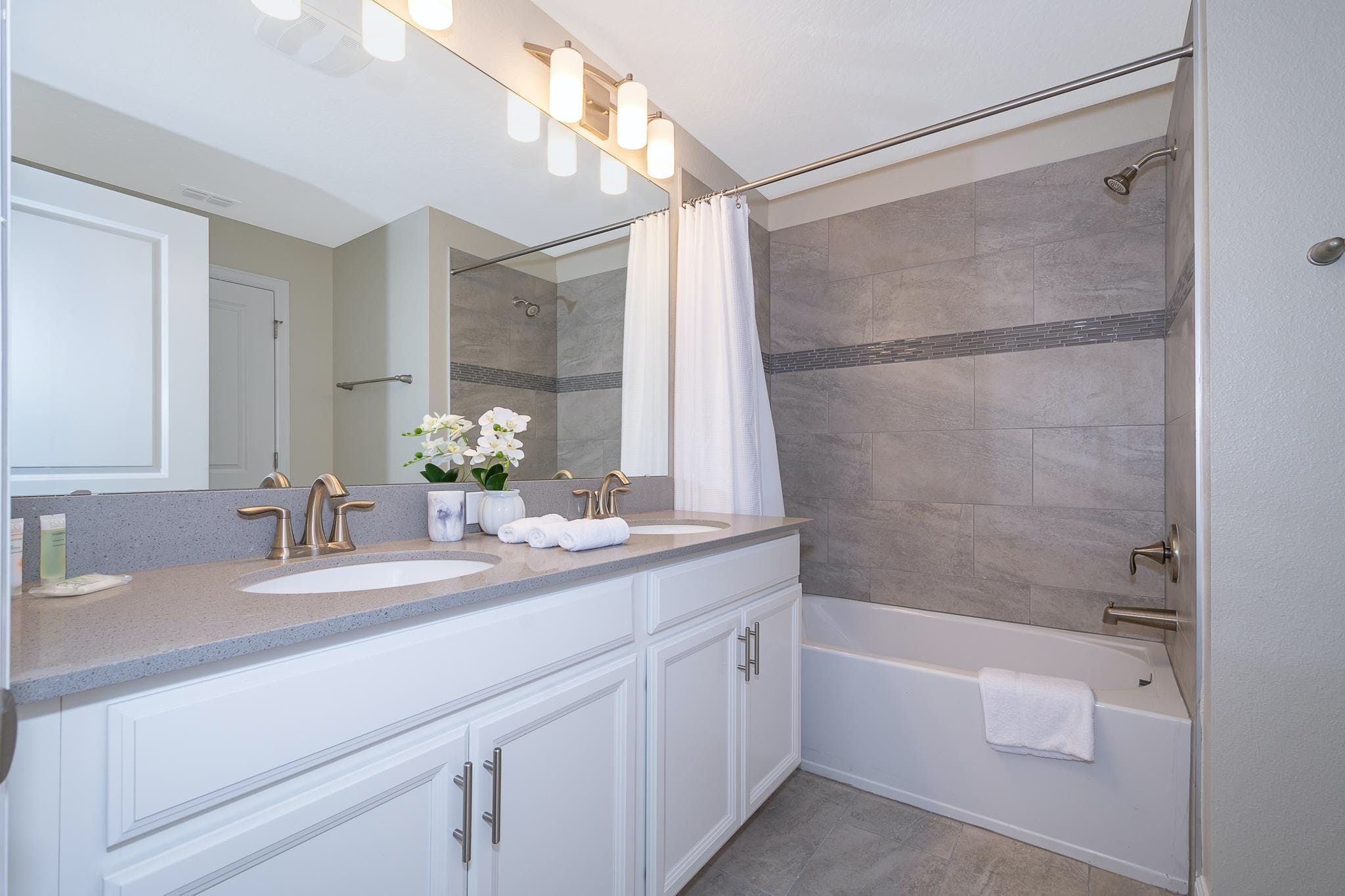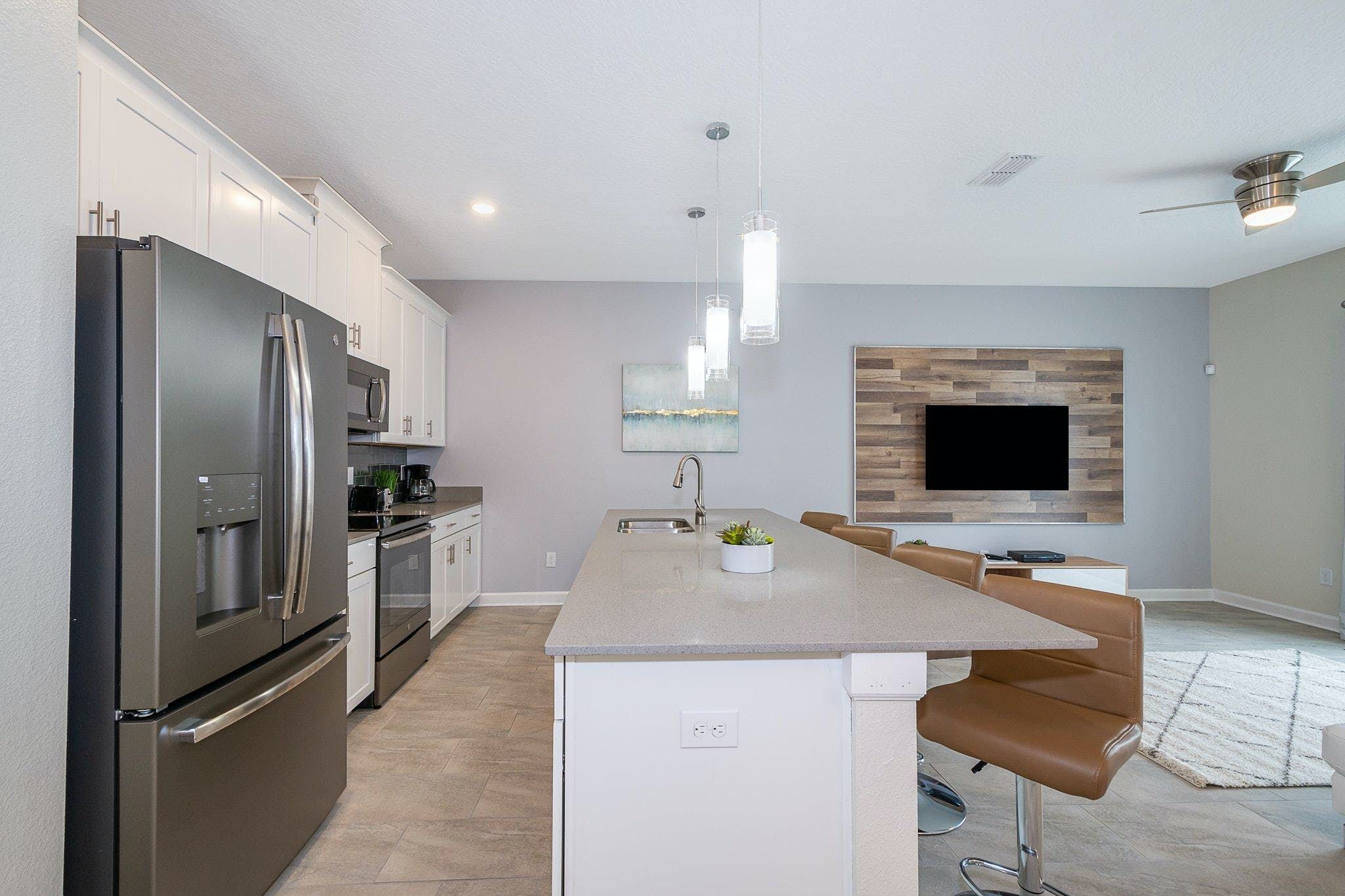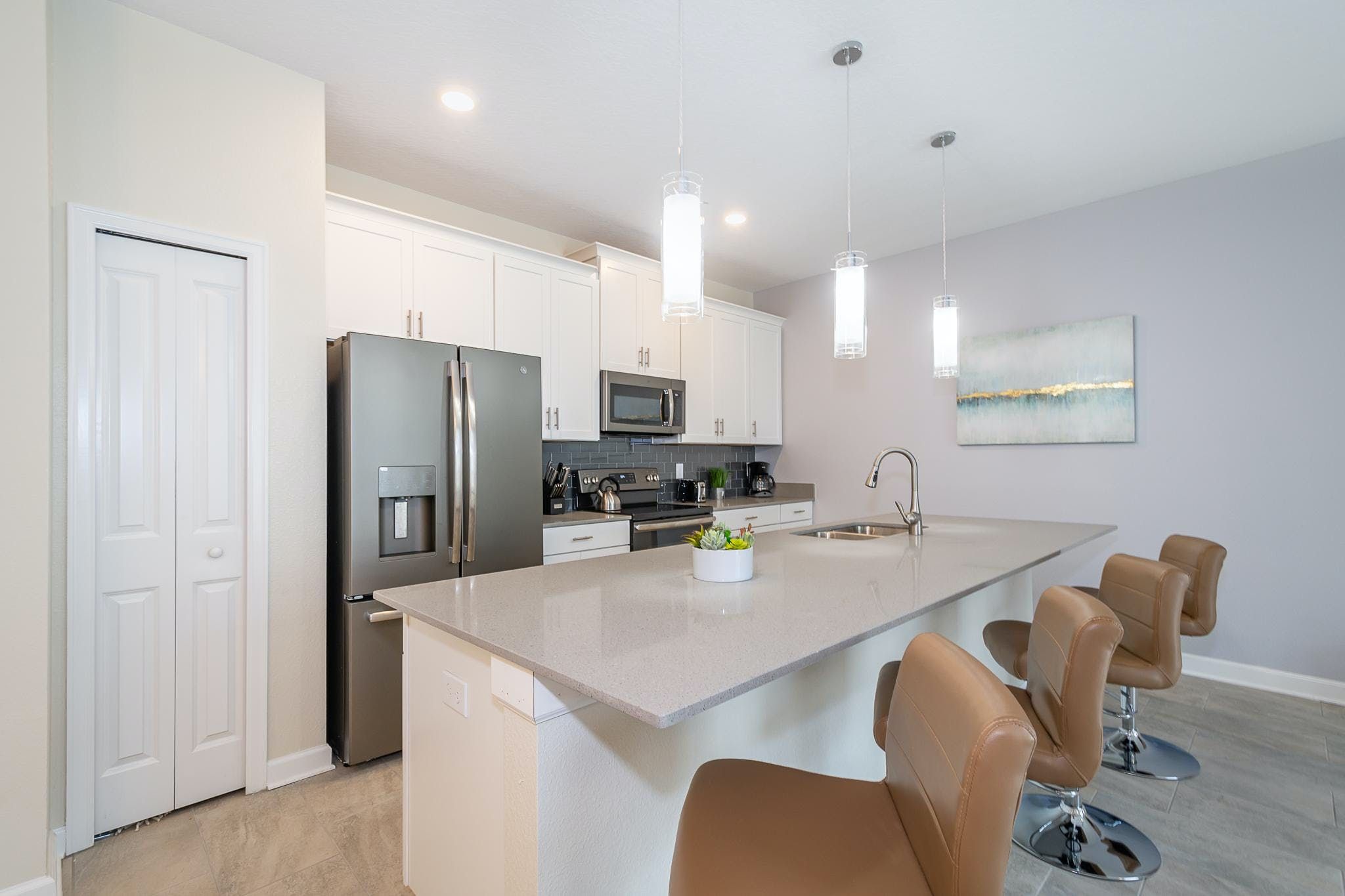 This brand new vacation rental boasts 4 bedrooms and 3 bathrooms, perfect for families or groups of friends. The property includes a king bedroom downstairs, a king suite, one bedroom with a full and twin bed, and another bedroom with a bunk bed twin over full and trundle bed. The resort is located in Storey Lake, which is the closest community to Disney, Disney Springs, Malls, and Walmart. The clubhouse resort offers great amenities including two pools, one with a lazy river, a restaurant, gym and more.