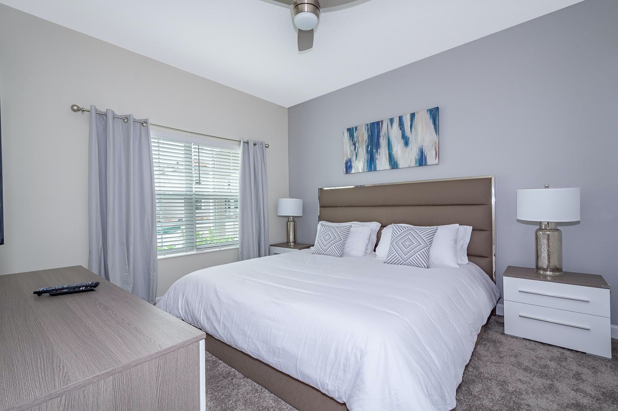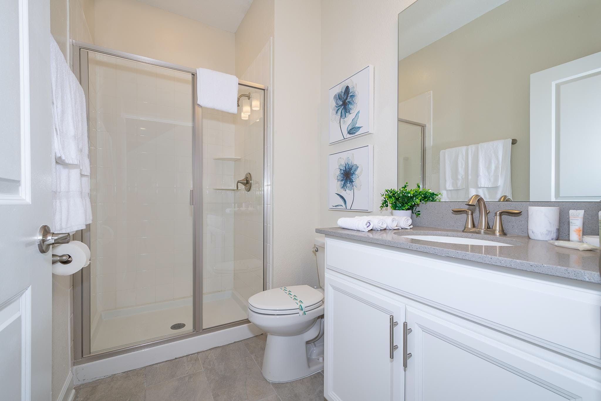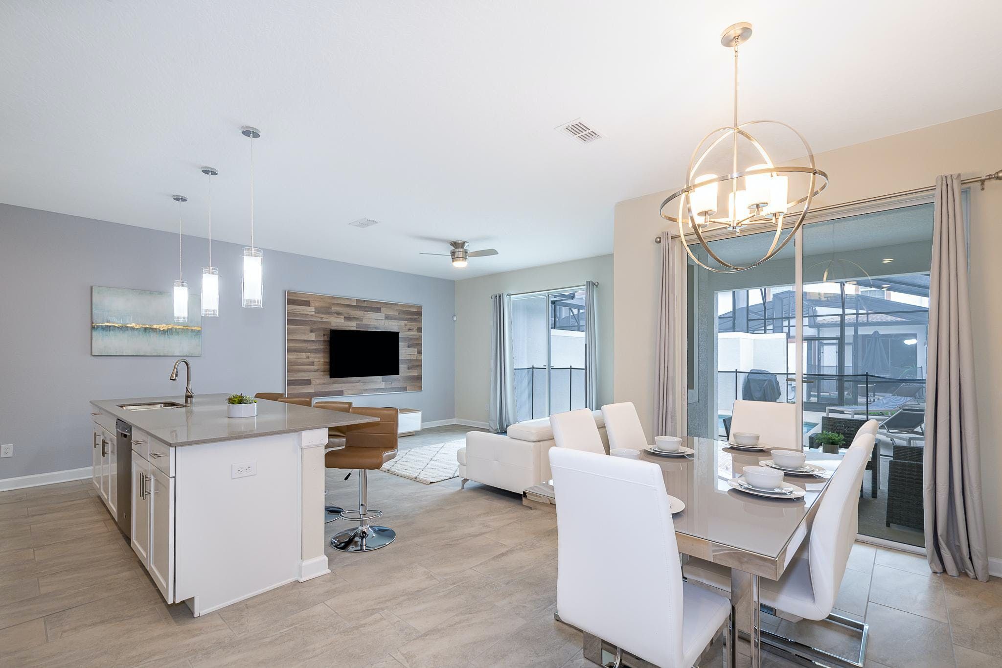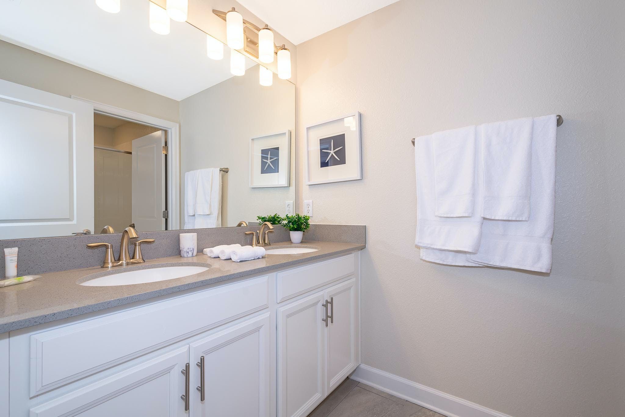 This brand new vacation rental boasts 4 bedrooms and 3 bathrooms, perfect for families or groups of friends. The property includes a king bedroom downstairs, a king suite, one bedroom with a full and twin bed, and another bedroom with a bunk bed twin over full and trundle bed. The resort is located in Storey Lake, which is the closest community to Disney, Disney Springs, Malls, and Walmart. The clubhouse resort offers great amenities including two pools, one with a lazy river, a restaurant, gym and more.