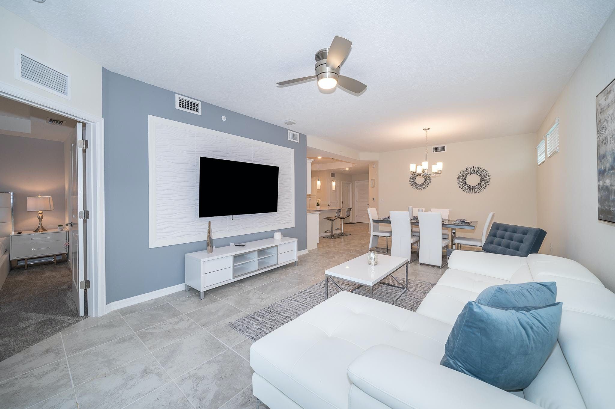This brand new vacation rental condo is located in the beautiful Storey Lake Resort and boasts three bedrooms and two bathrooms. The master suite features a king-sized bed, while the other two bedrooms have full and twin beds respectively. Conveniently situated near Disney, Disney Springs, malls, and Walmart, this property is perfect for those looking to explore the area. The recently opened Clubhouse Resort offers ample amenities like two pools (including a lazy river), gym, restaurant, and more. With all these great features, this rental is sure to make for an unforgettable vacation experience.