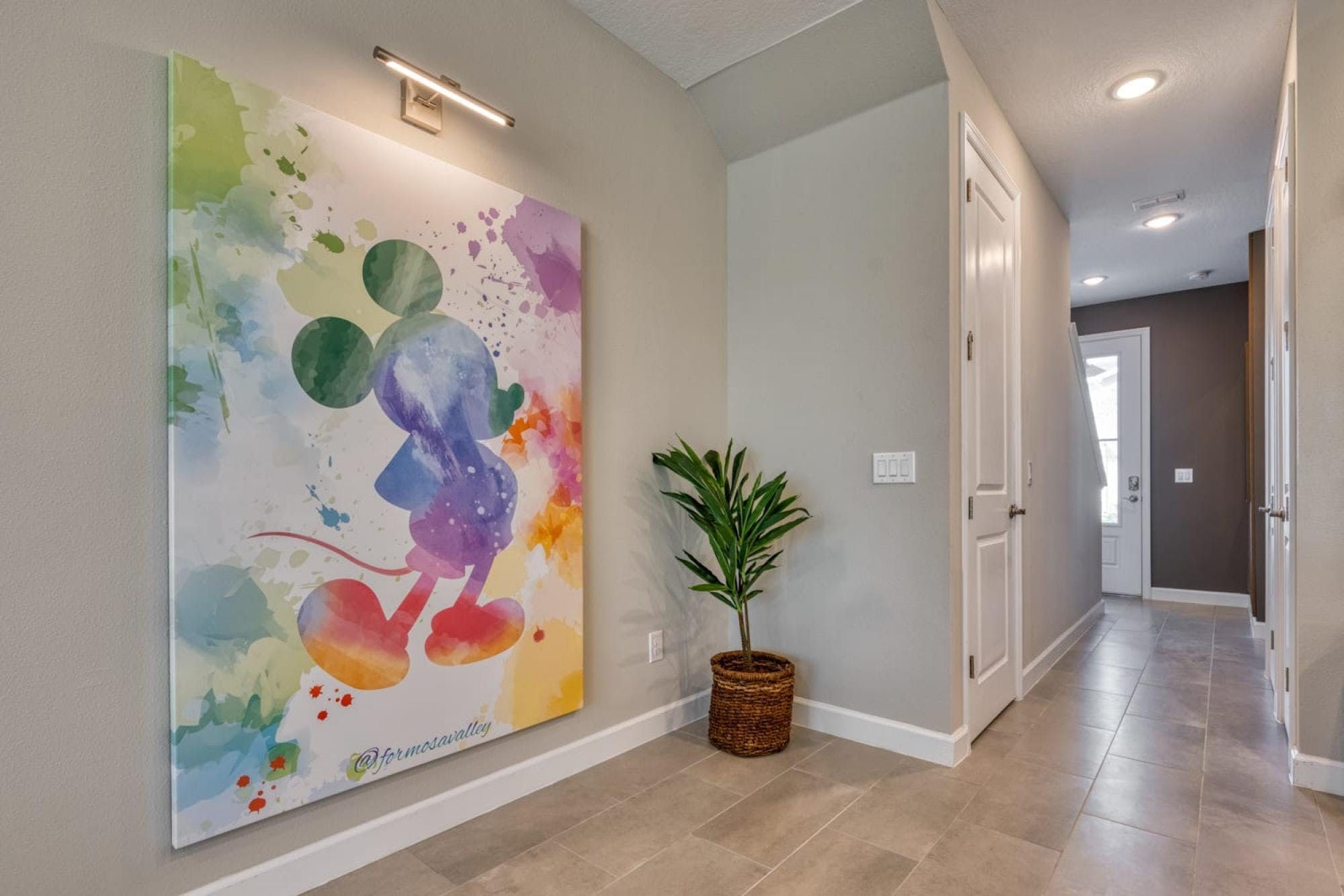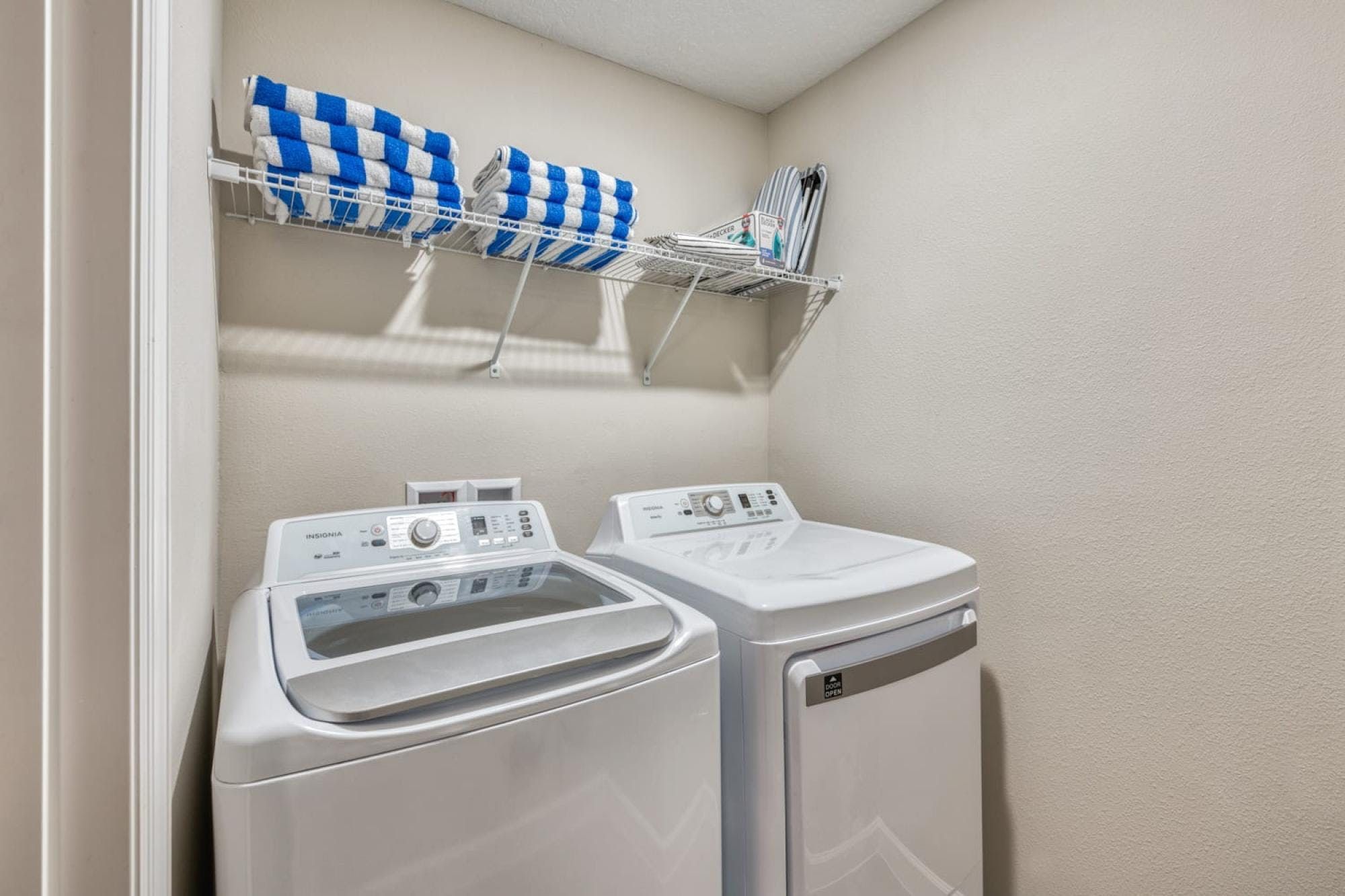 This elegant 4-bedroom, 4-bathroom villa offers all the comforts and luxury you deserve. The spacious and modern living room seamlessly blends with the dining area and fully equipped kitchen, creating the perfect space for relaxation and entertainment. The first floor boasts a king bedroom suite, while the second floor features a king master bedroom suite, a Mickey themed suite with twin beds, and a Harry Potter themed suite with twin beds. Additionally, there is a Star Wars themed family room with a twin sofa-bed and a laundry room with washer and dryer.