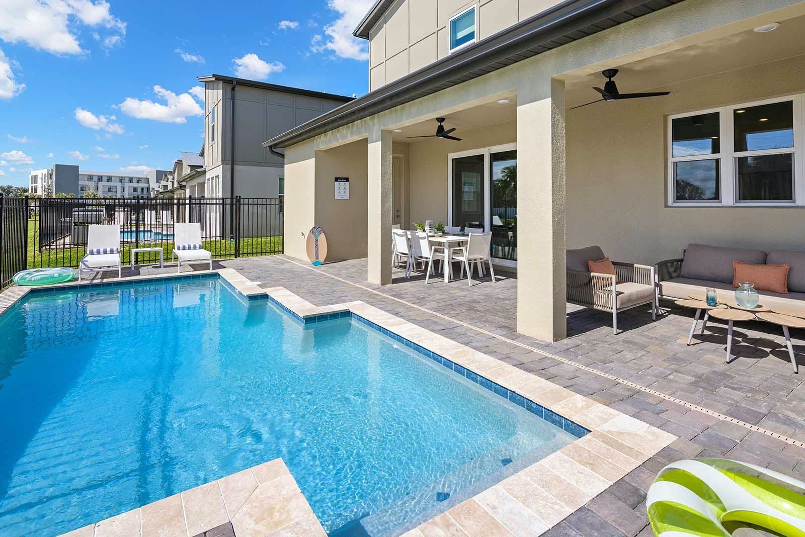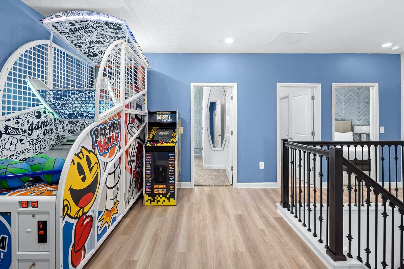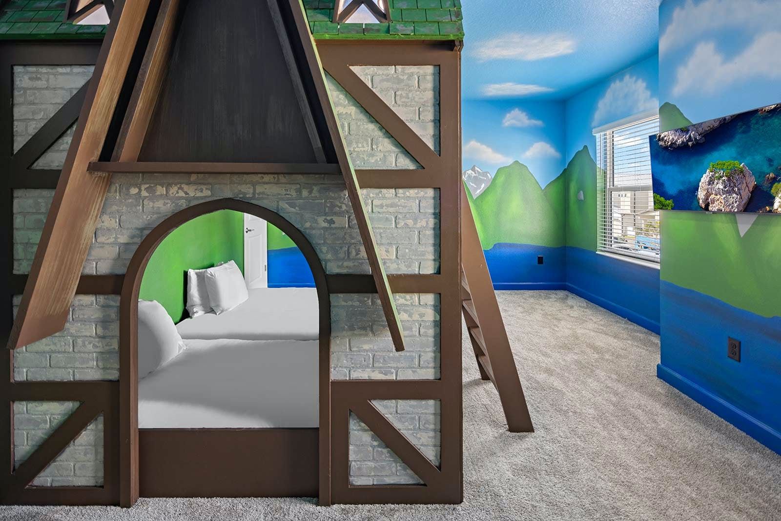 This luxurious 5-bedroom villa is the perfect coastal vacation destination. Surrounded by tropical landscaping and breathtaking views, guests can enjoy direct access to the ocean, a resort pool with lounge seating and facilities, an expansive marina, and a stunning bike trail. The villa boasts custom-designed interiors with a spacious living room featuring a large sectional, trendy chandelier, and mounted TV. The chef's kitchen is fully equipped with stainless steel appliances, generous cabinetry and counterspace, and even includes a breakfast bar/island for mini-meals. The outdoor pool area is perfect for lounging in the sun or eating poolside on the covered patio with a perfect dining set-up. The five sumptuous bedrooms are designed for the grownups in your group, while a fanciful "Storybook Village" bedroom enchants with mountainous wall art and built-in bunk beds. This home's recreation spaces are the star attraction including a custom karaoke room, home theater, and loft with classic arcade games and billiards. Guests will be within driving distance of attractions like Walt Disney World Resorts and Universal Studios as well as charming dining options like Ocean 302 and Djon's Chop House.