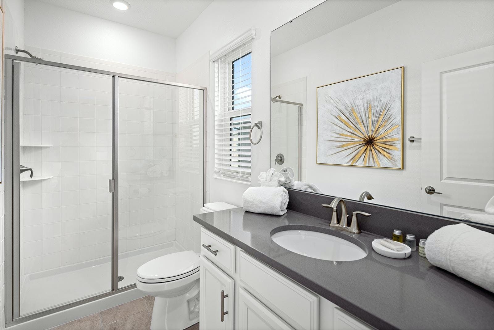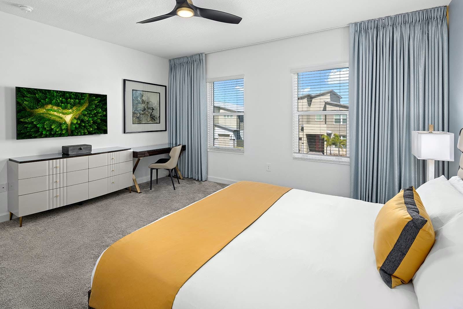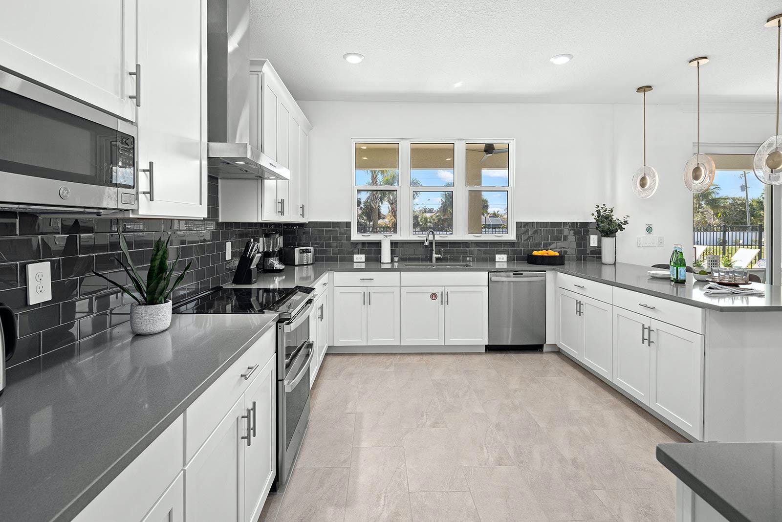 This luxurious 5-bedroom villa is the perfect coastal vacation destination. Surrounded by tropical landscaping and breathtaking views, guests can enjoy direct access to the ocean, a resort pool with lounge seating and facilities, an expansive marina, and a stunning bike trail. The villa boasts custom-designed interiors with a spacious living room featuring a large sectional, trendy chandelier, and mounted TV. The chef's kitchen is fully equipped with stainless steel appliances, generous cabinetry and counterspace, and even includes a breakfast bar/island for mini-meals. The outdoor pool area is perfect for lounging in the sun or eating poolside on the covered patio with a perfect dining set-up. The five sumptuous bedrooms are designed for the grownups in your group, while a fanciful "Storybook Village" bedroom enchants with mountainous wall art and built-in bunk beds. This home's recreation spaces are the star attraction including a custom karaoke room, home theater, and loft with classic arcade games and billiards. Guests will be within driving distance of attractions like Walt Disney World Resorts and Universal Studios as well as charming dining options like Ocean 302 and Djon's Chop House.