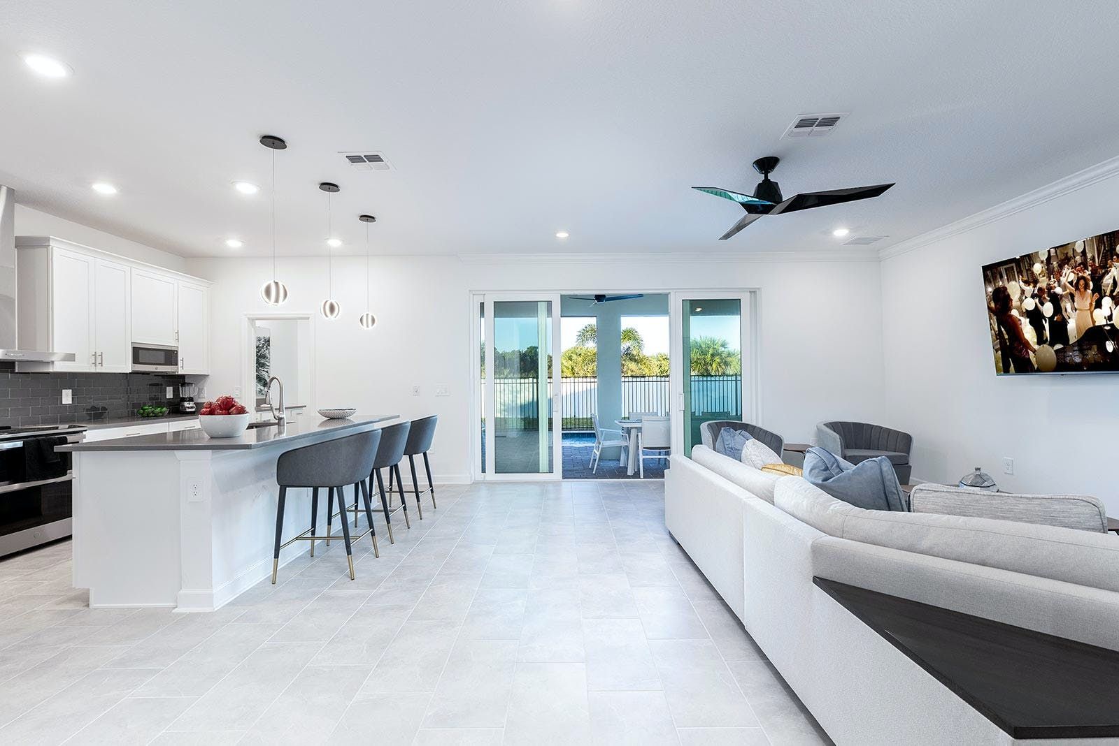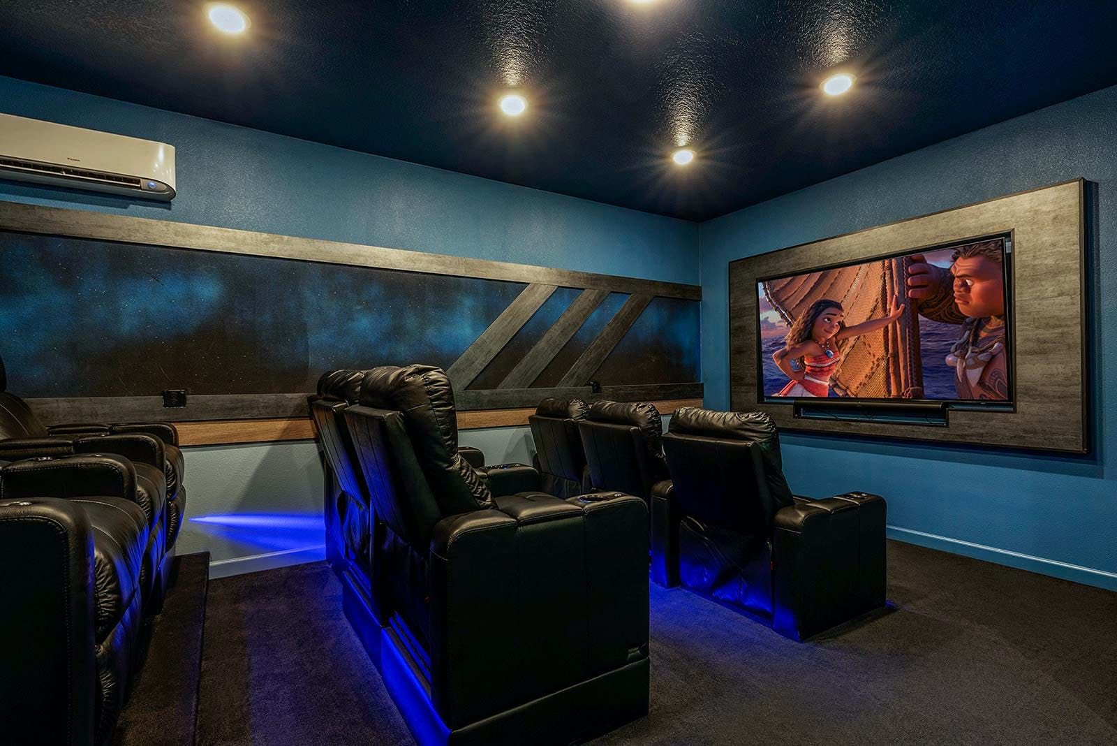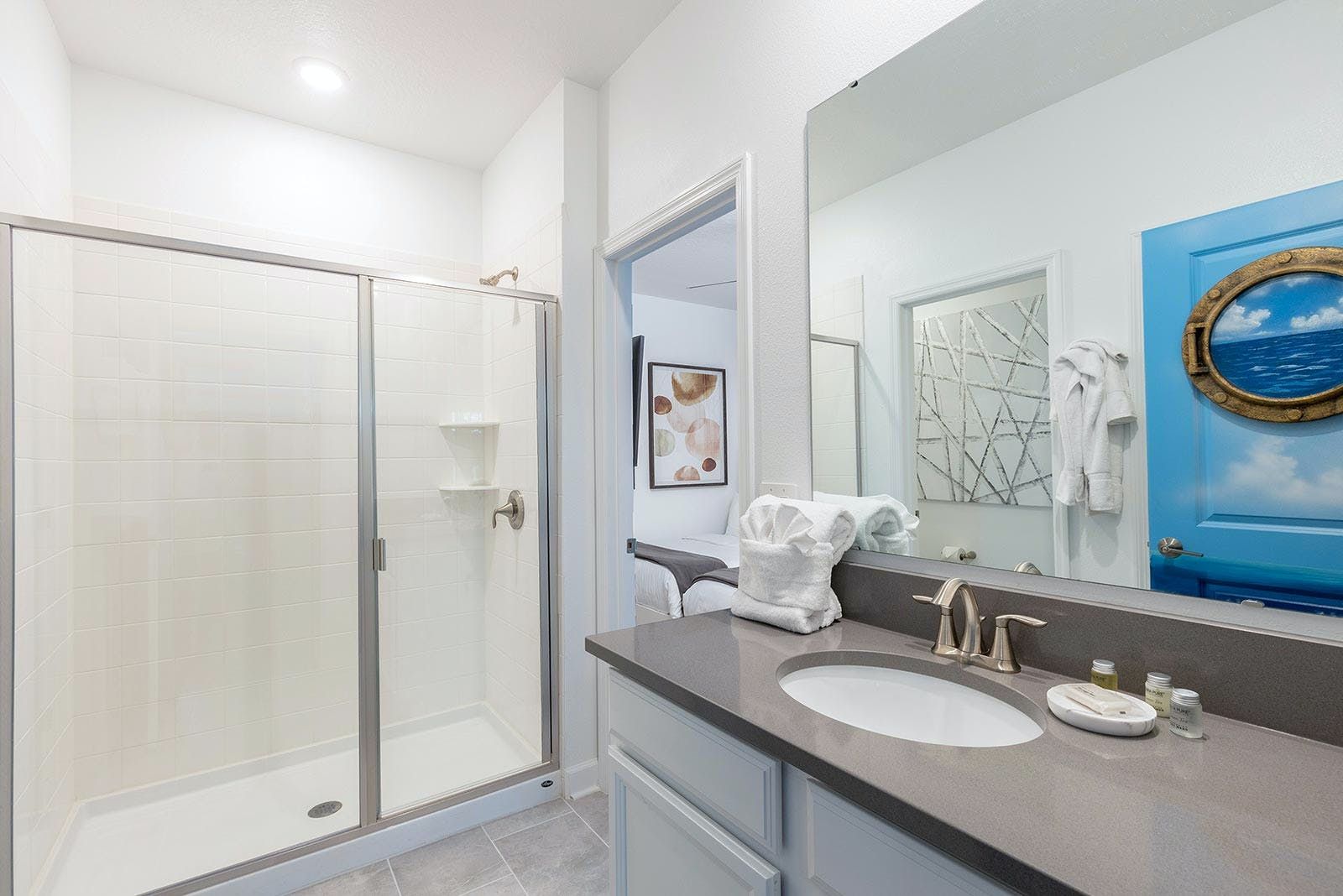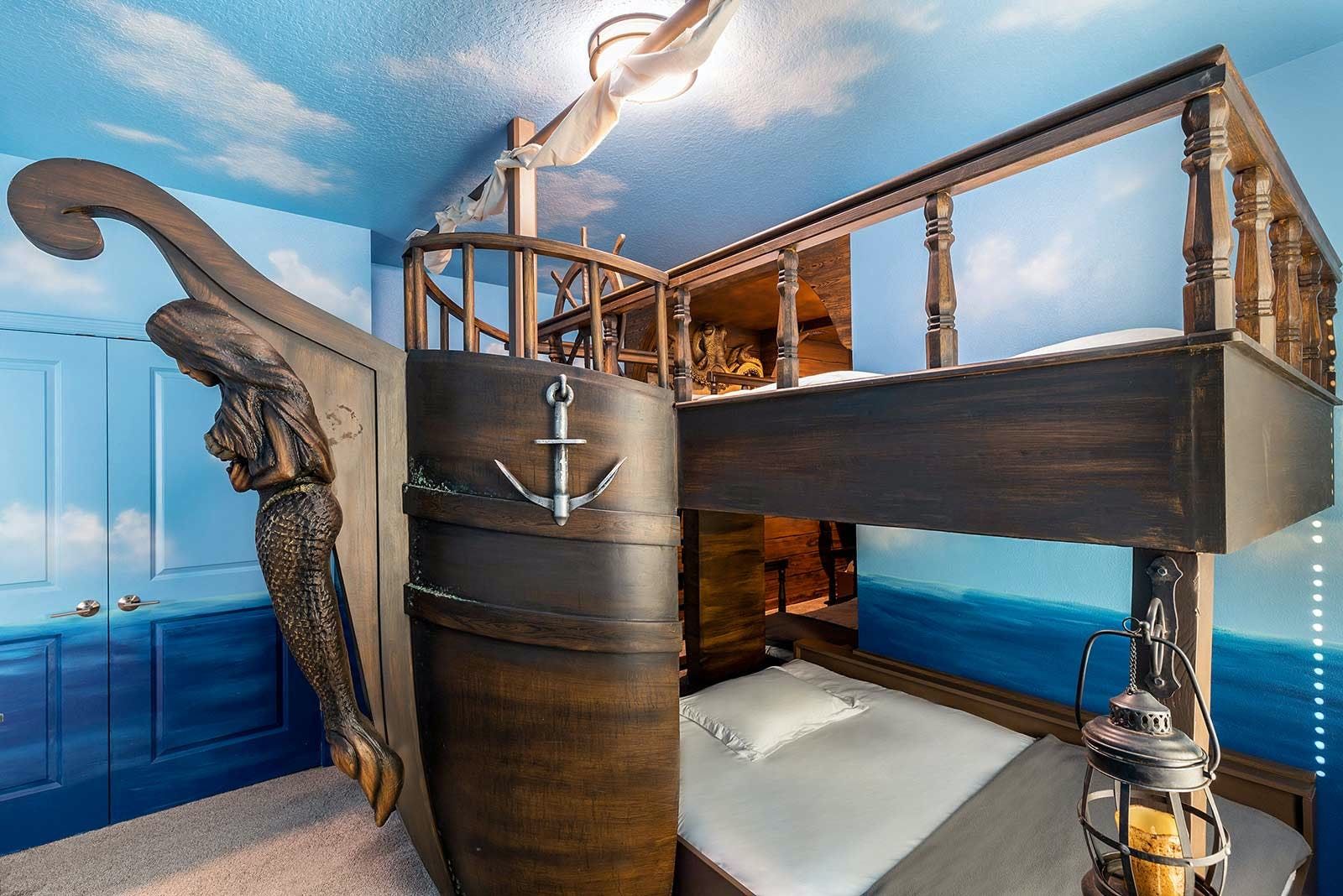 This resort offers custom-designed 4-8-bedroom villas with private pools and premier in-house amenities, surrounded by tropical landscaping and breathtaking views. Guests of each villa can enjoy direct access to the ocean, a brand-new resort pool with lounge seating and facilities, as well as an expansive marina and bike trail. The villa has an open-plan living and dining area with a beachy color palette that brings the outdoors in. The fabulous chef's kitchen has stainless steel appliances, cooking gear, utensils, and a kitchen island with seating. The private pool oasis is surrounded by warm beachy air, recliners, crystal water, and patio furniture for outdoor dining and lounging. Five of the bedrooms offer luxe bedding, soft modern lighting, calming artwork, and en suite bathrooms while the 6th bedroom is pirate-themed with a breathtaking wooden ship as its centerpiece. There are three recreation rooms: a private theater; casino room; spacious loft with billiards and shuffleboard. The villa is located close to famous attractions like Disney World Resorts (90 min), Universal Studios (90 min), Sea World (90 min), etc., restaurants, parks, beaches, museums, and more.
