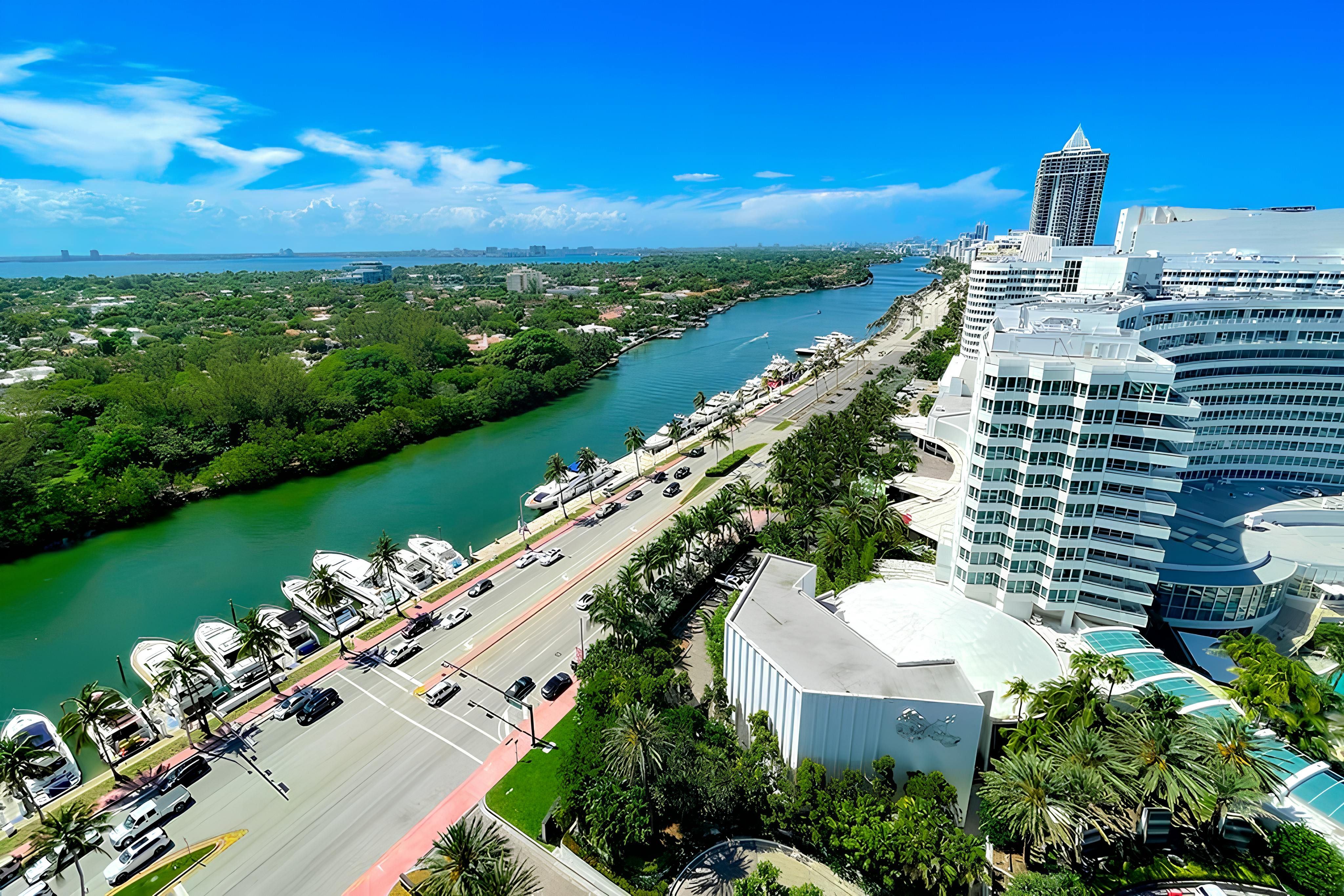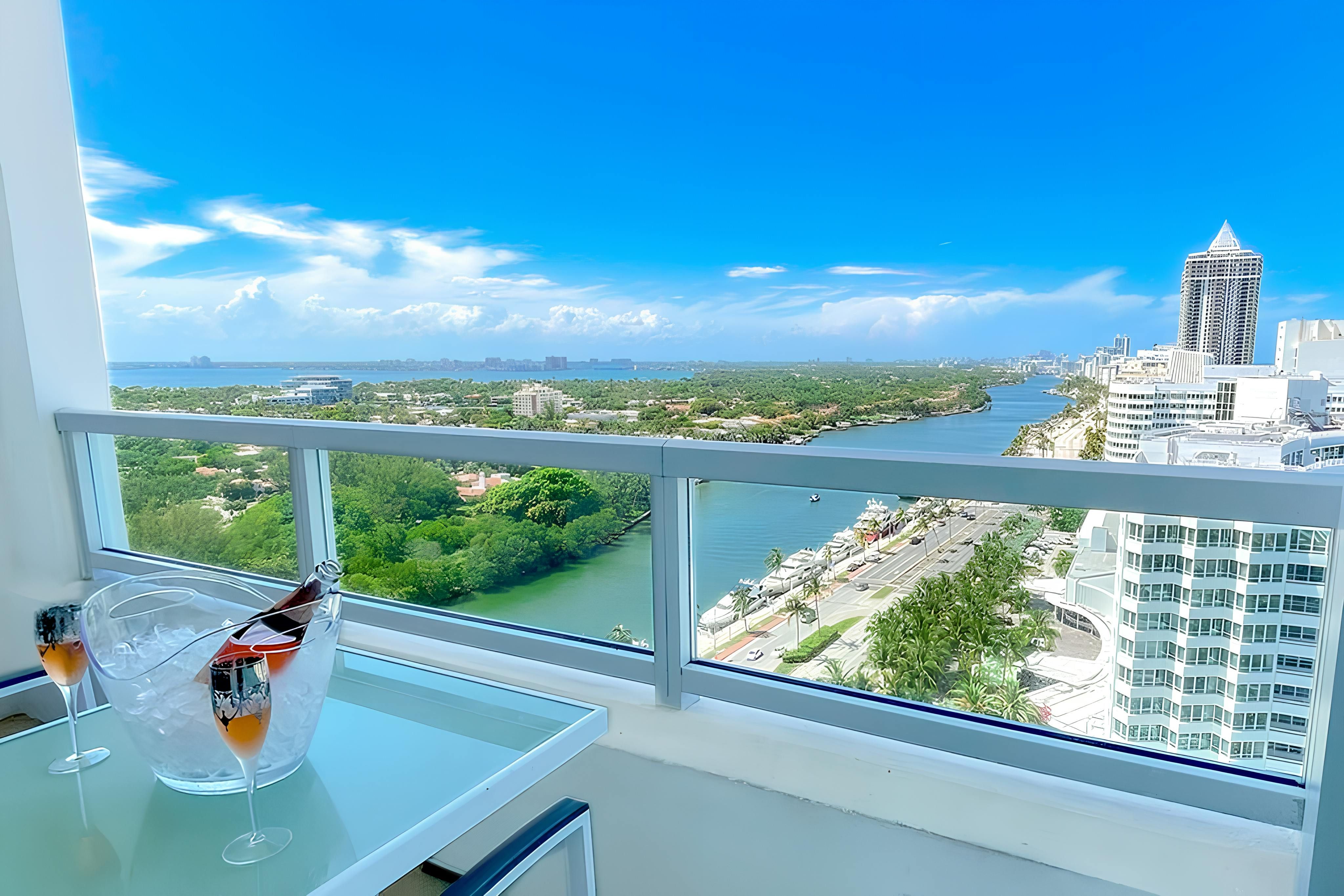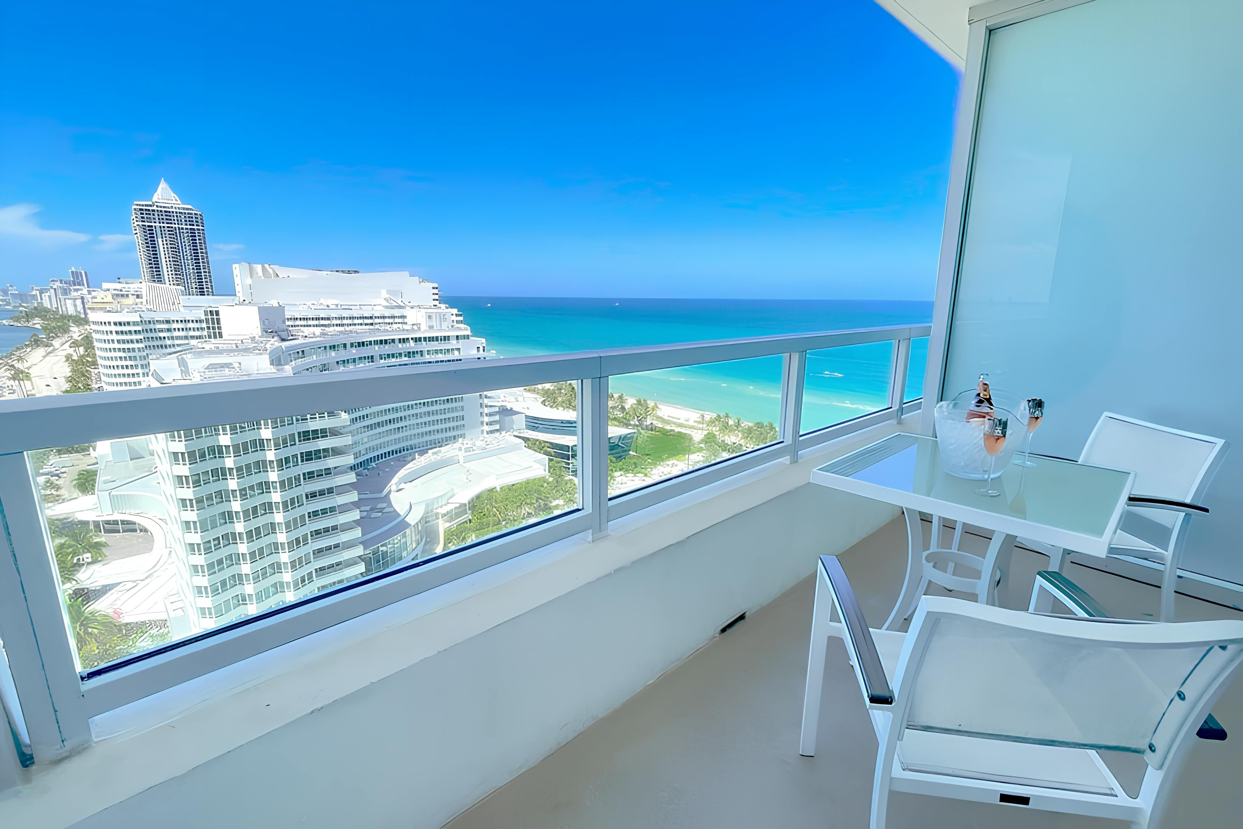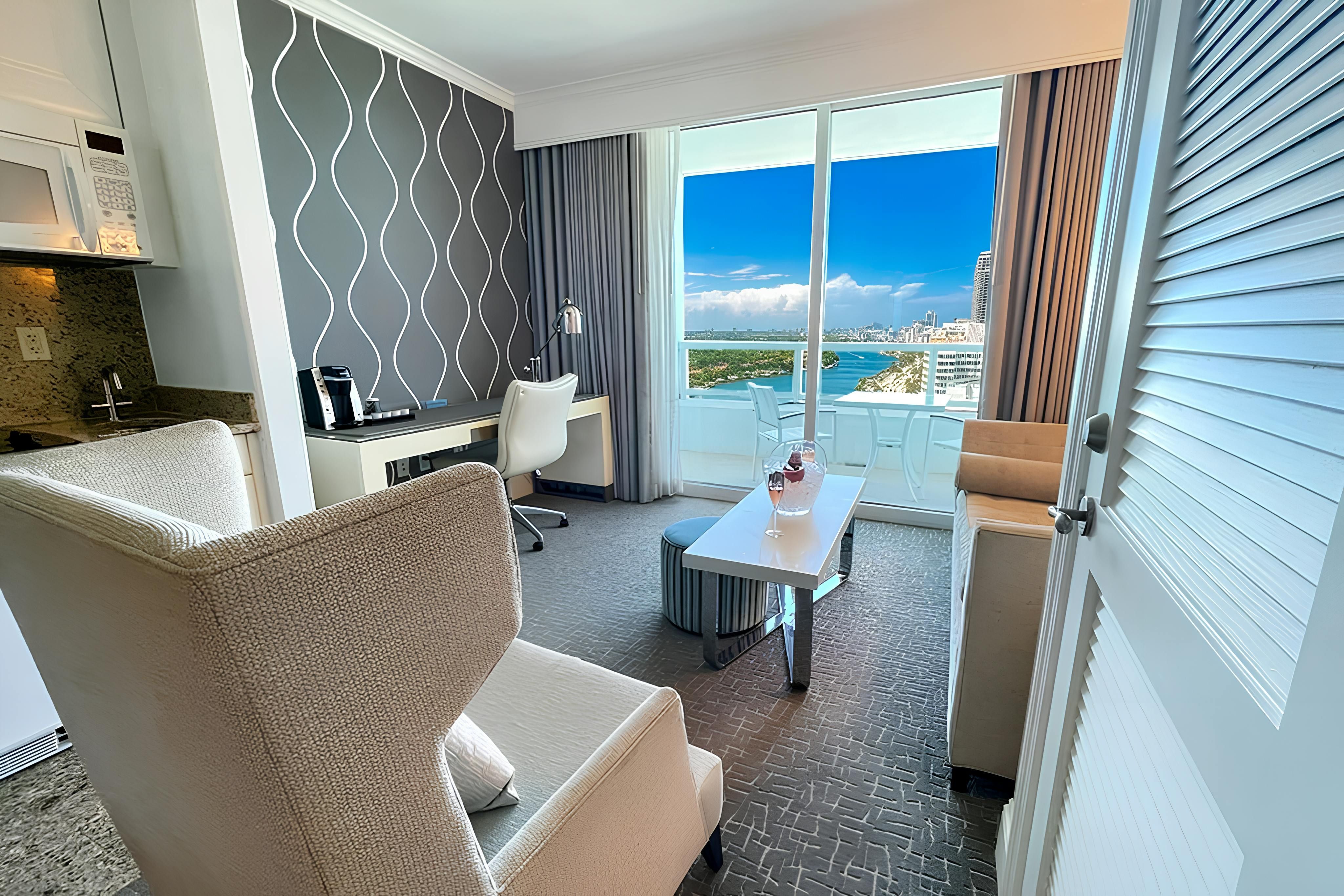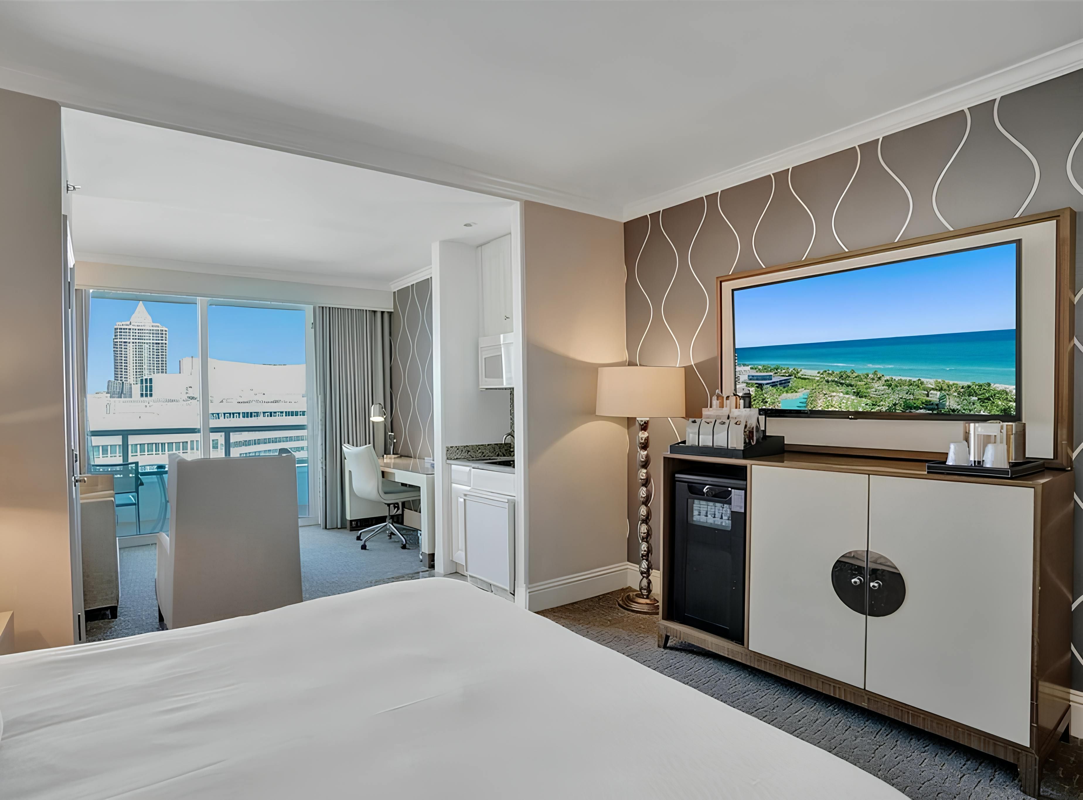 This Miami suite is small but fully equipped with everything you'll need for a relaxing beach escape. Housed inside a seafront hotel, you'll enjoy access to all the amenities, including a gym, a spa, outdoor pools, and direct beach access. The suite itself includes a balcony with sea views, a desk, and a little kitchenette – ideal for preparing light bites. For larger meals, there's a restaurant onsite and other great eateries in the local area. Spend mornings by the pool, take the hotel bikes out for a spin as you explore the local area, then toast to the day at one of Miami's buzzing beach bars.