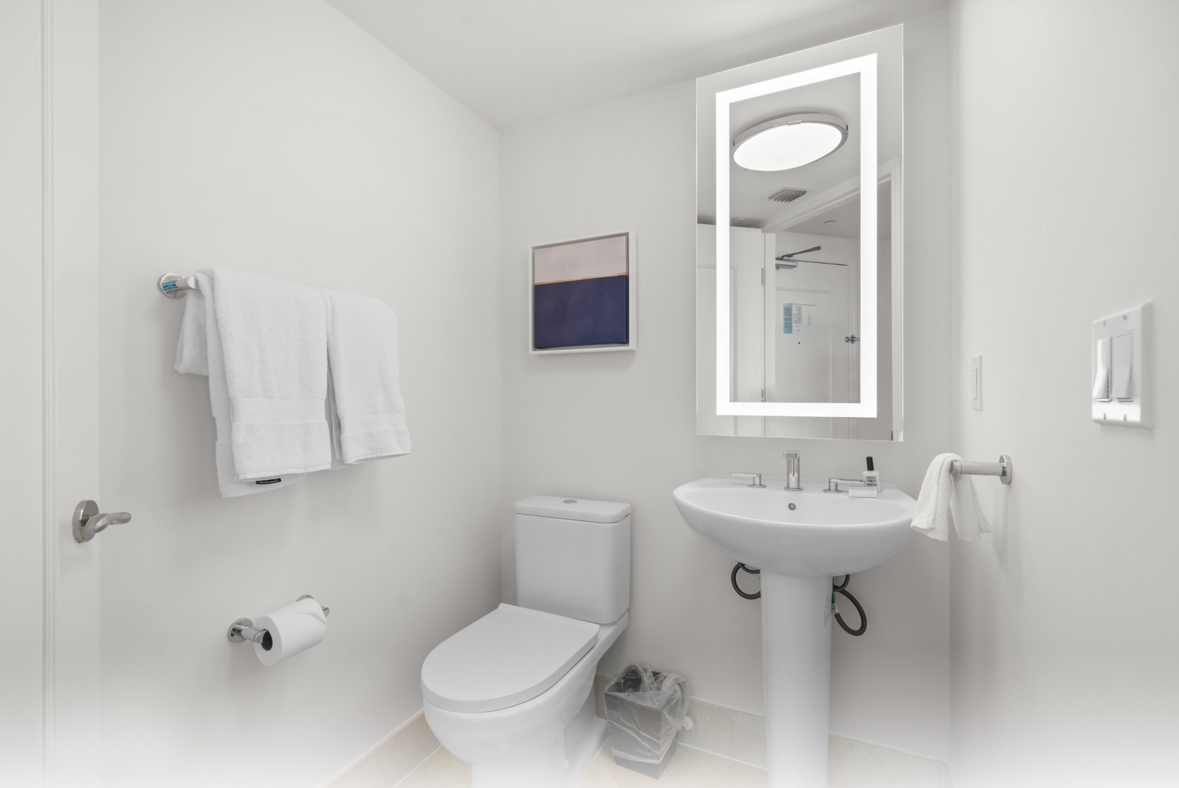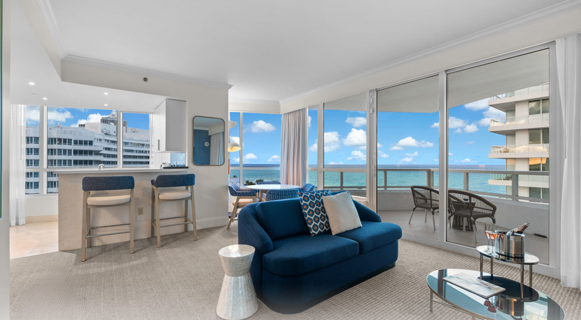 This Miami Beach apartment makes the most of its oceanfront setting, with a spacious balcony framing sweeping views of the Atlantic. The large open-plan living area is filled with natural light, designed for gathering and relaxing in full view of the sea. A full-size kitchen, complete with plenty of space for cooking, makes mealtimes quick and easy. Step outside and you’re right by the sand, with Miami’s vibrant culture, dining, and nightlife close at hand. After a day exploring, return to your private retreat and have a relaxing bath, before retiring to the cosy bed.