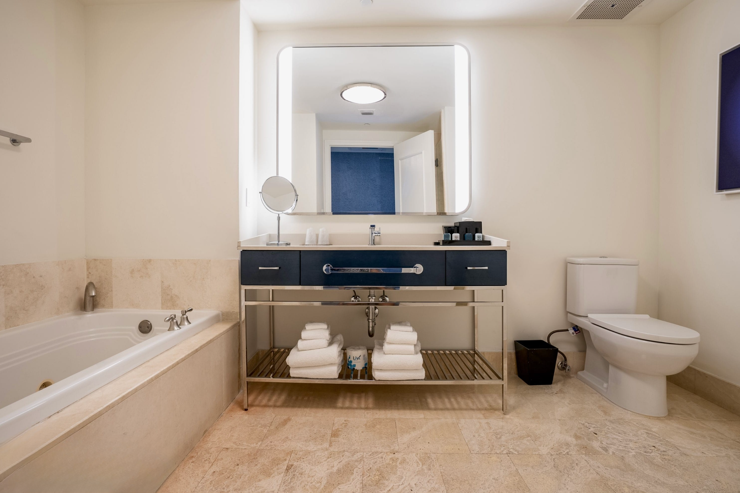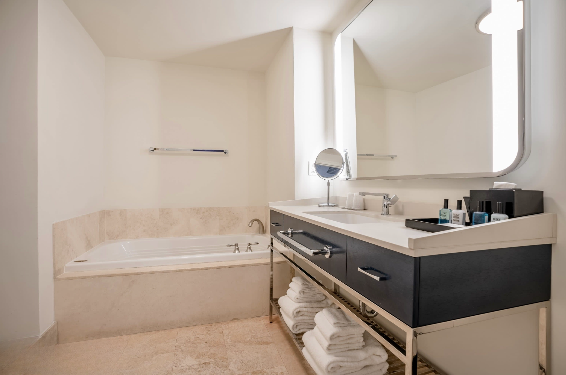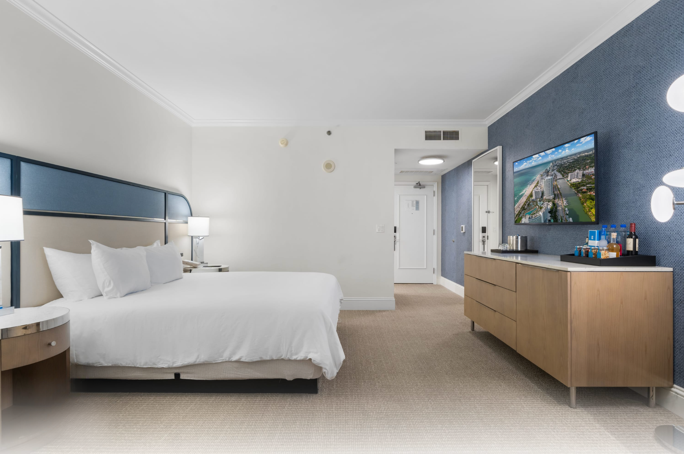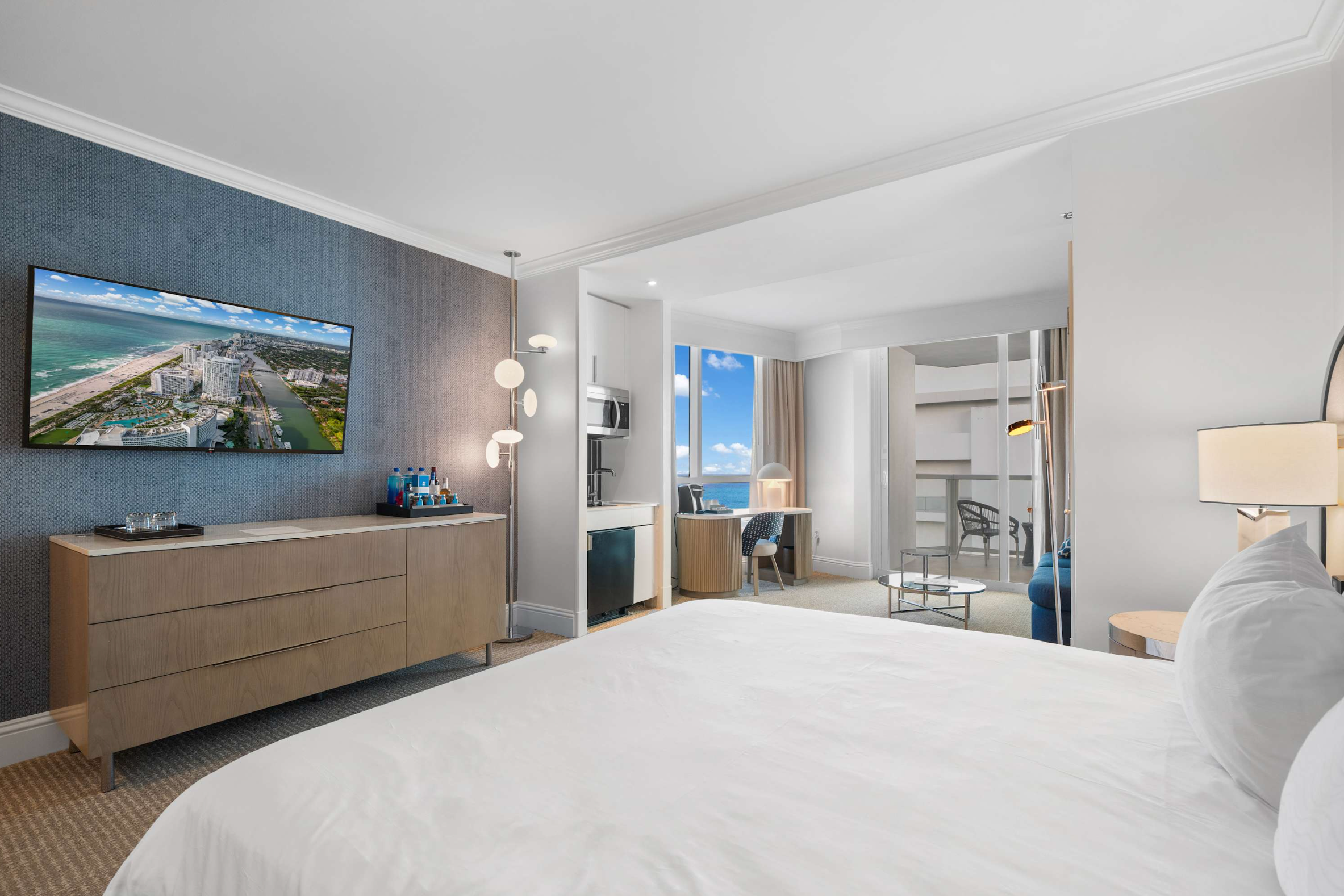 This suite feels like a five-star hotel stay, with the bonus of a few practical touches to make life easier. The kitchenette is compact but handy for morning coffees or keeping your snacks chilled – though with Miami’s restaurant scene at your fingertips and world-class dining on-site, you might never need it. Days here can be as relaxed or as active as you like, with seven shimmering pools, a spa, a state-of-the-art gym, waterslides for the kids, and more. And if you’re here to explore the rest of Miami, it’s a great base with South Beach and Ocean Drive are just minutes away.
