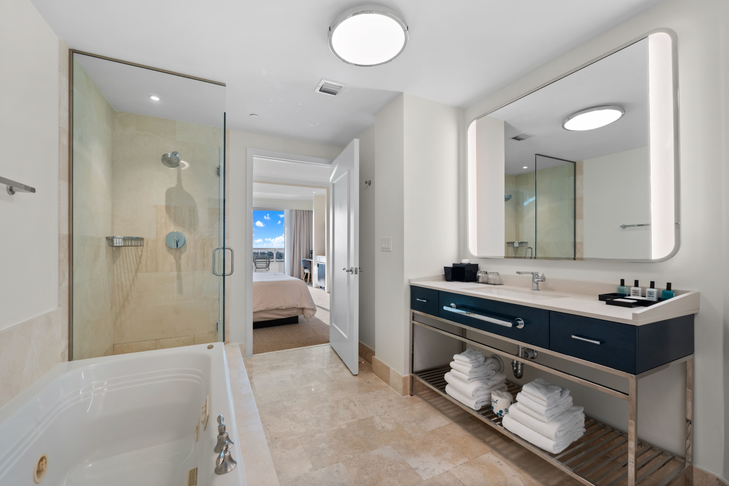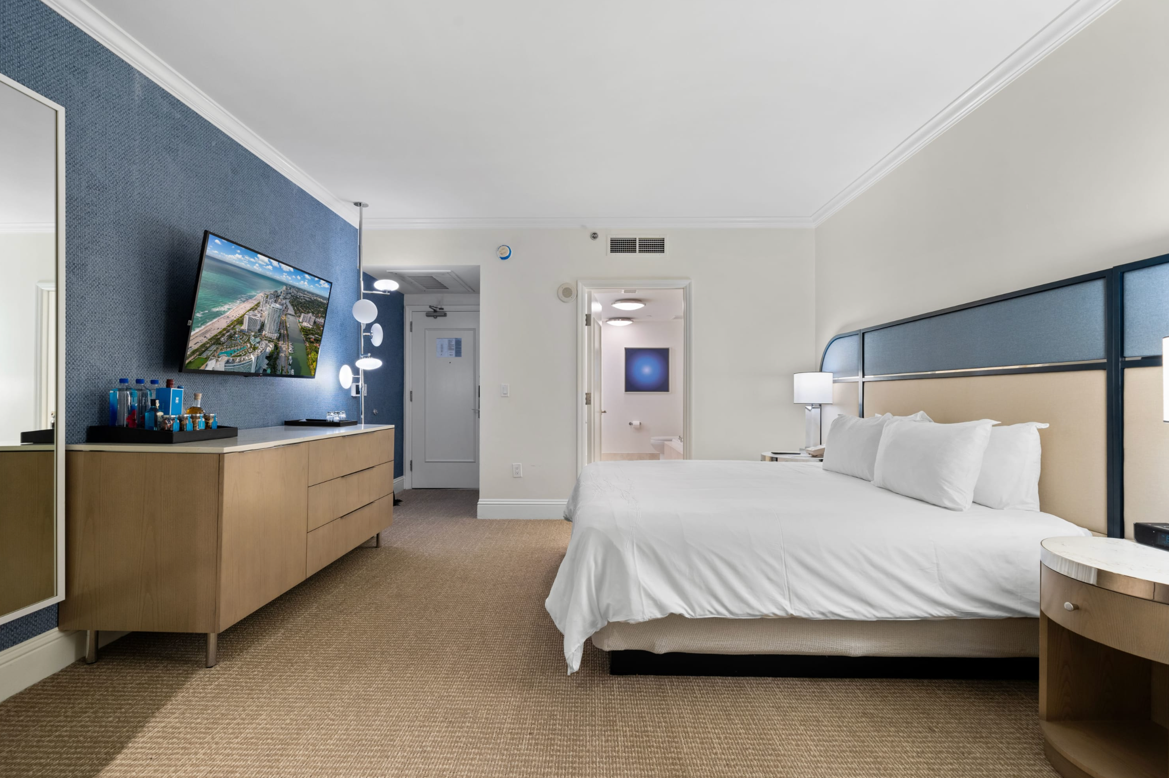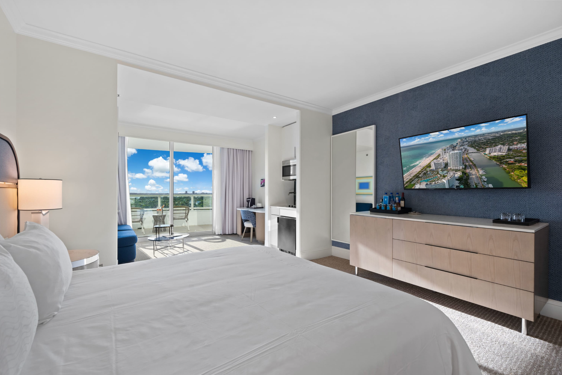Escape to the seaside with this Miami resort suite. It comes with a small kitchenette for preparing light bites that you can enjoy at the table on the balcony, a sofa bed for two, and a handy desk for catching up on work. You'll also have access to the resort's amenities here, including the spa, swimming pools, gym, and restaurants – and you can even order room service. When you're ready to explore Miami, you'll find the beach a few steps away, and you can drive to iconic city sights like Ocean Drive, South Beach, and the Design District in twenty minutes.