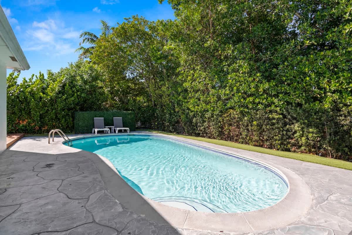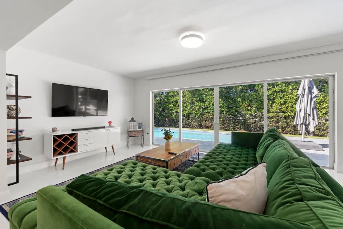 Nestled to the west of Aventura, this modern holiday villa balances functionality with sociability. The open plan living room, dining area and kitchen complement each other nicely, with enough space for a pool table that doesn't get in the way of fridge raiders. While two of the four bedrooms feature king size beds, the sleeping arrangements for other guests are worth agreeing in advance, especially at maximum occupancy – sofas, air mattresses, and rooms of four across two beds may be involved. Outside, the heated pool is a welcome feature, as is the outdoor grill and kitchen area for cookouts in the Florida sunshine. You'll also be a half hour drive from Miami Beach, should your party fancy a day trip.
