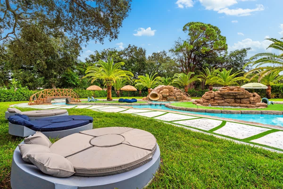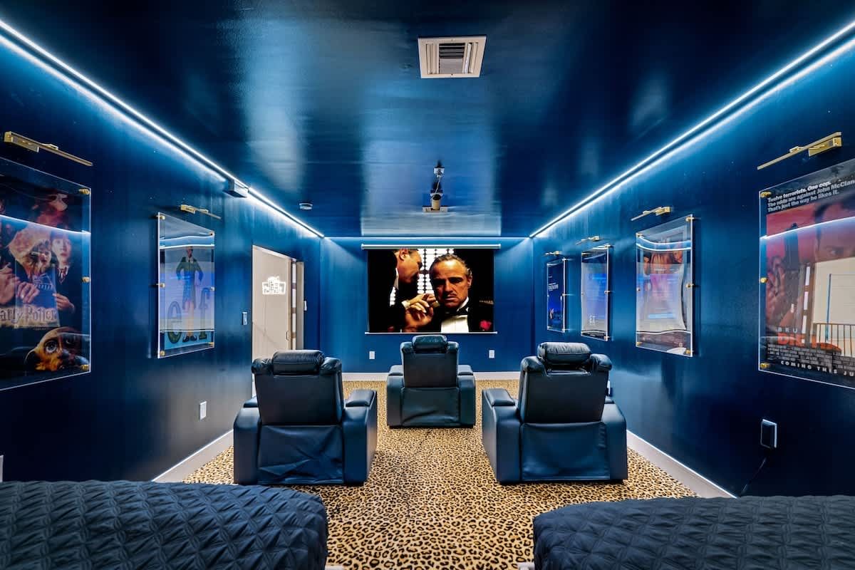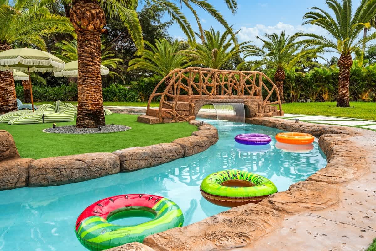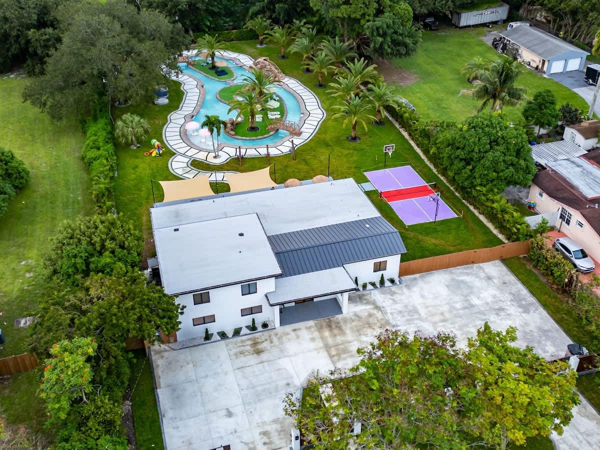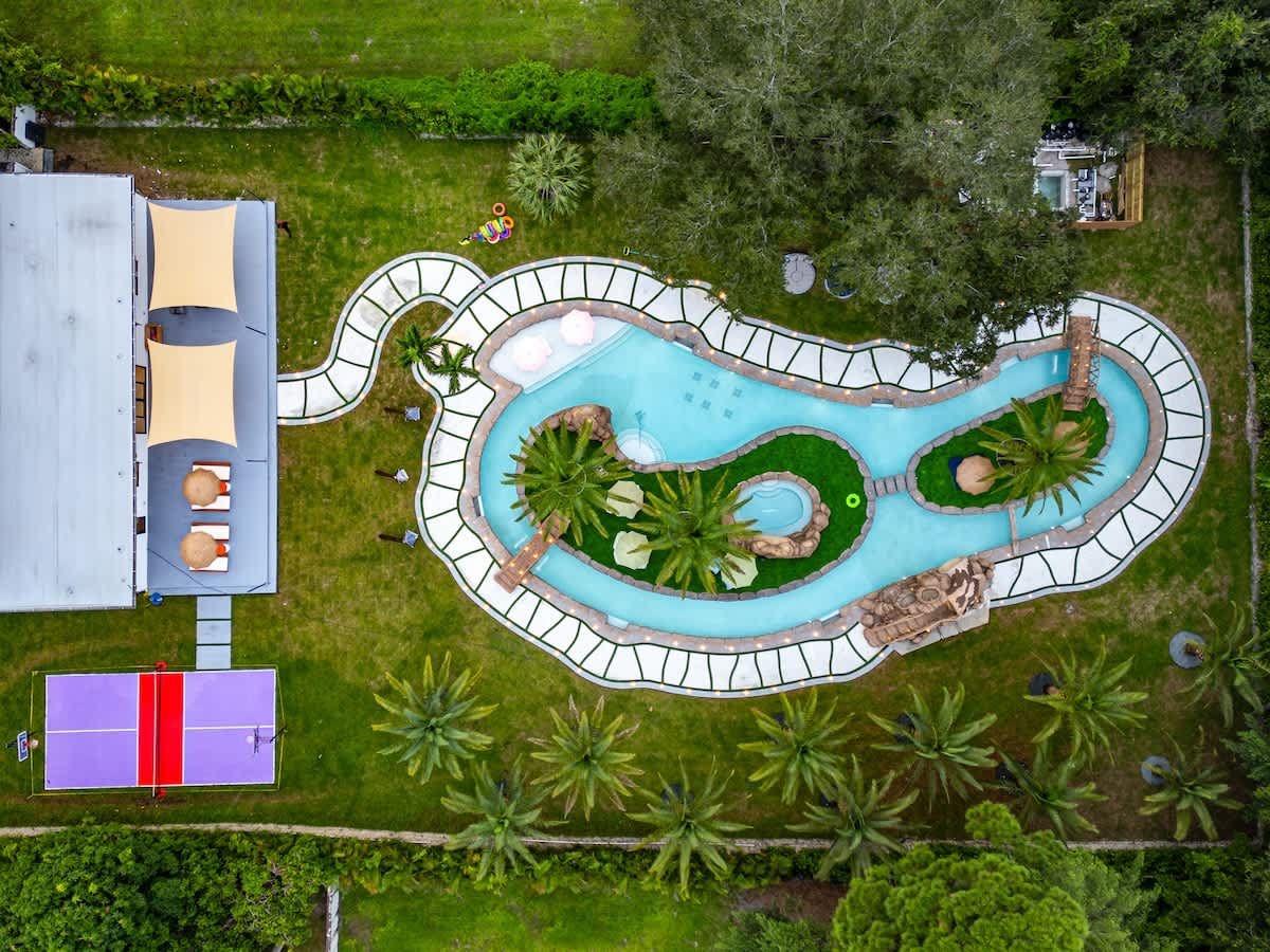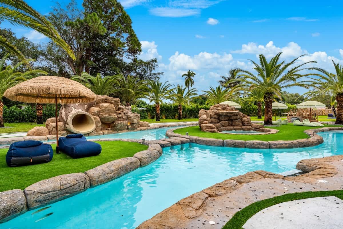 It’s not every day you have your own private lazy river. But at this Miami retreat, you can drift beneath the palms on a float, pause for a soak in the 20-person hot tub, or slip down the waterslide into the pool. When you’re ready for dry land, challenge friends to pickleball or basketball, take on the shuffleboard or ping pong table, or gather in the custom movie theatre for a night in. With its sheer scale and playful spirit, this is a resort all to yourself. This home is perfect for families, reunions, or anyone who wants their holiday to feel larger than life.