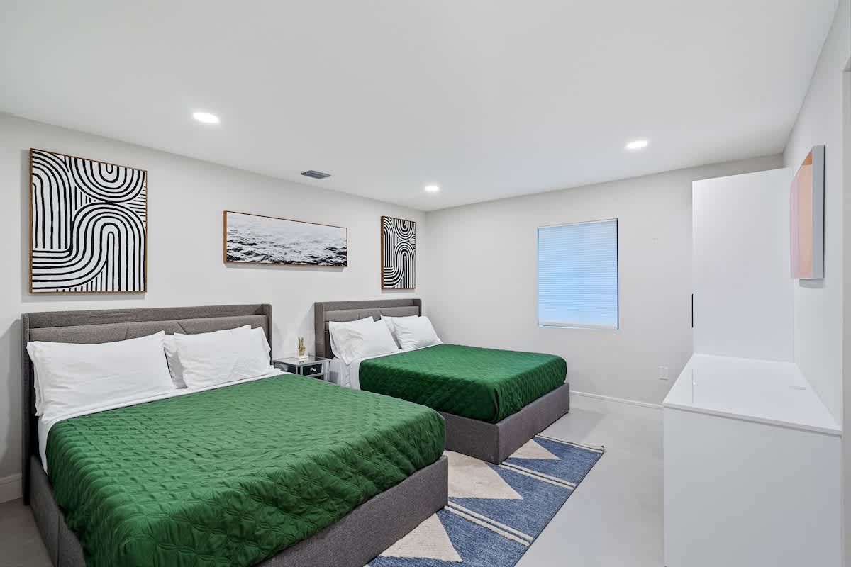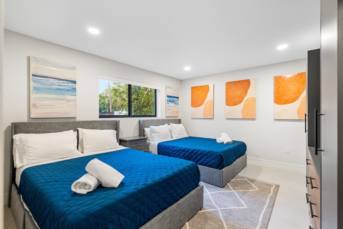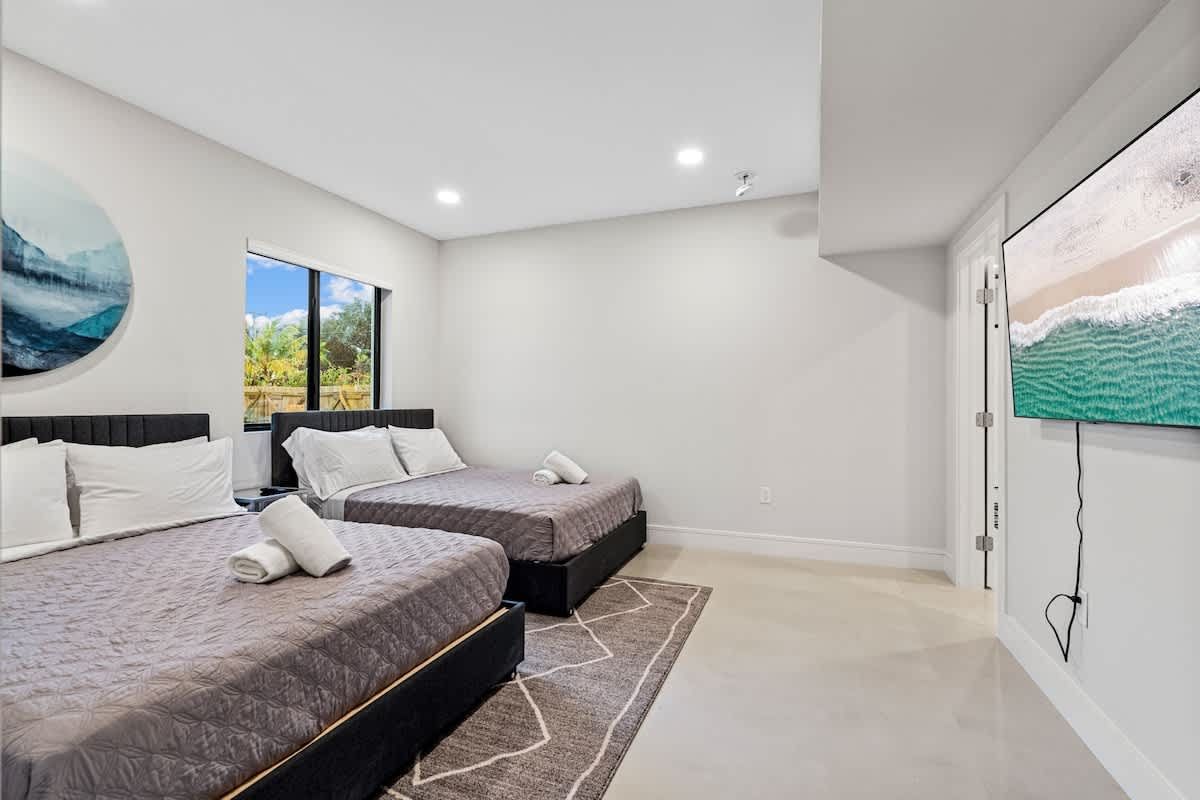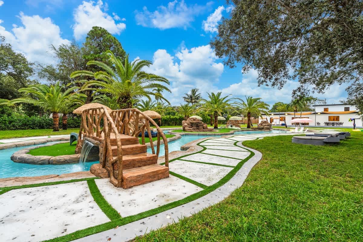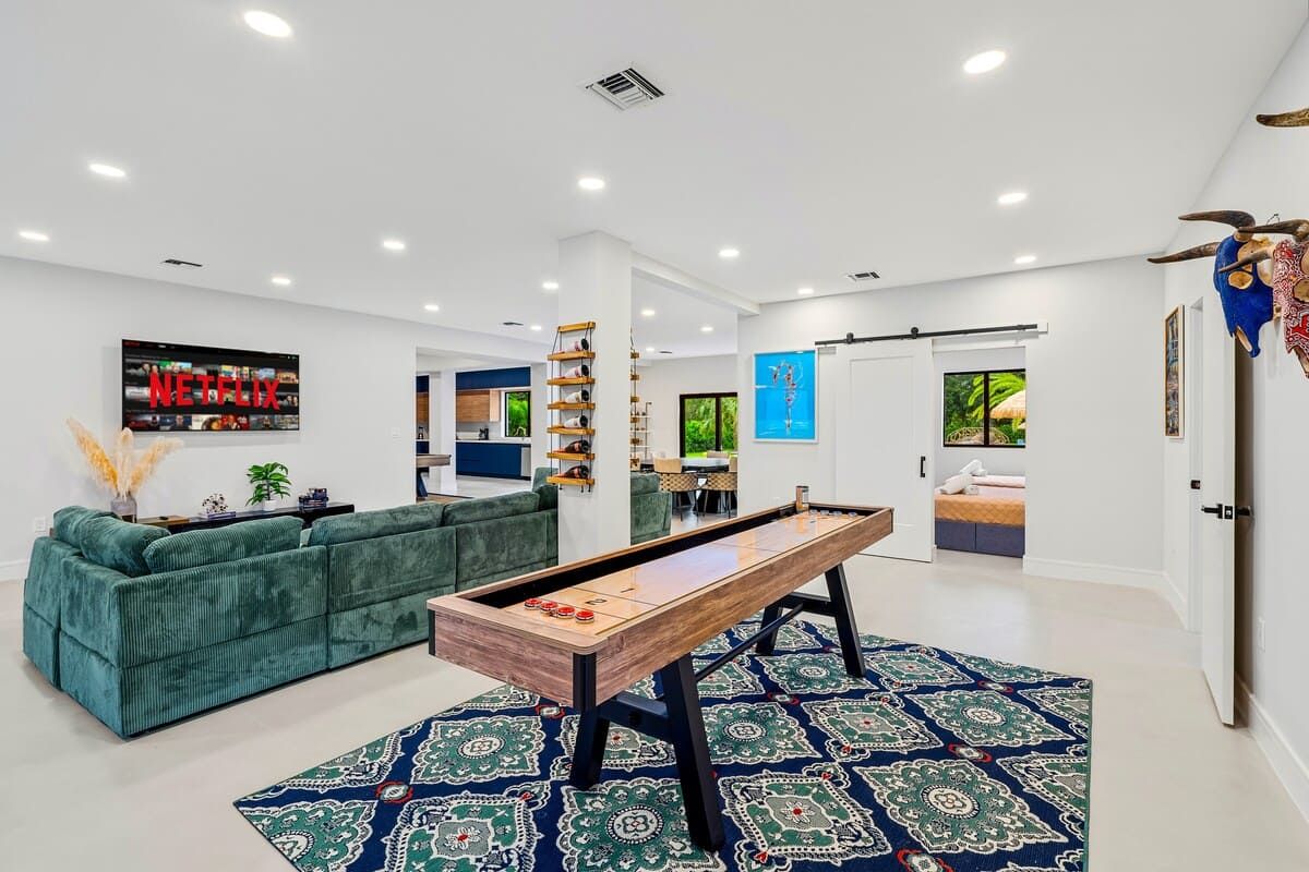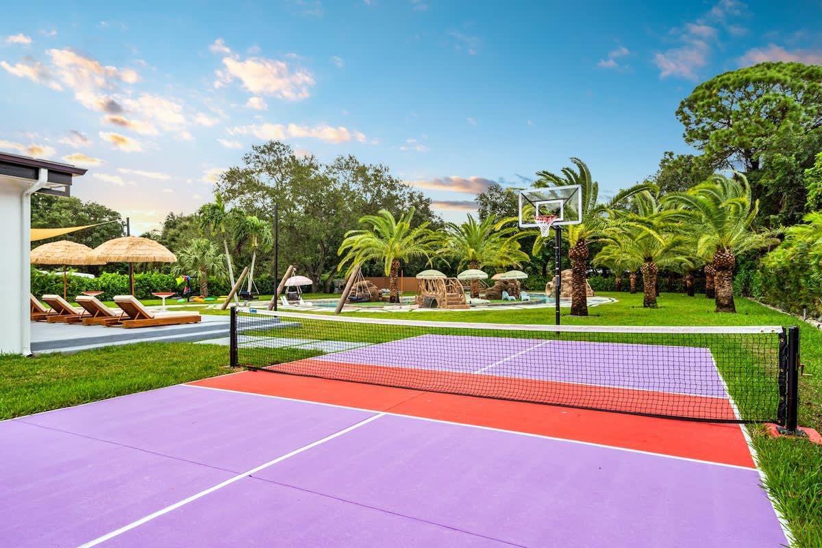 It’s not every day you have your own private lazy river. But at this Miami retreat, you can drift beneath the palms on a float, pause for a soak in the 20-person hot tub, or slip down the waterslide into the pool. When you’re ready for dry land, challenge friends to pickleball or basketball, take on the shuffleboard or ping pong table, or gather in the custom movie theatre for a night in. With its sheer scale and playful spirit, this is a resort all to yourself. This home is perfect for families, reunions, or anyone who wants their holiday to feel larger than life.