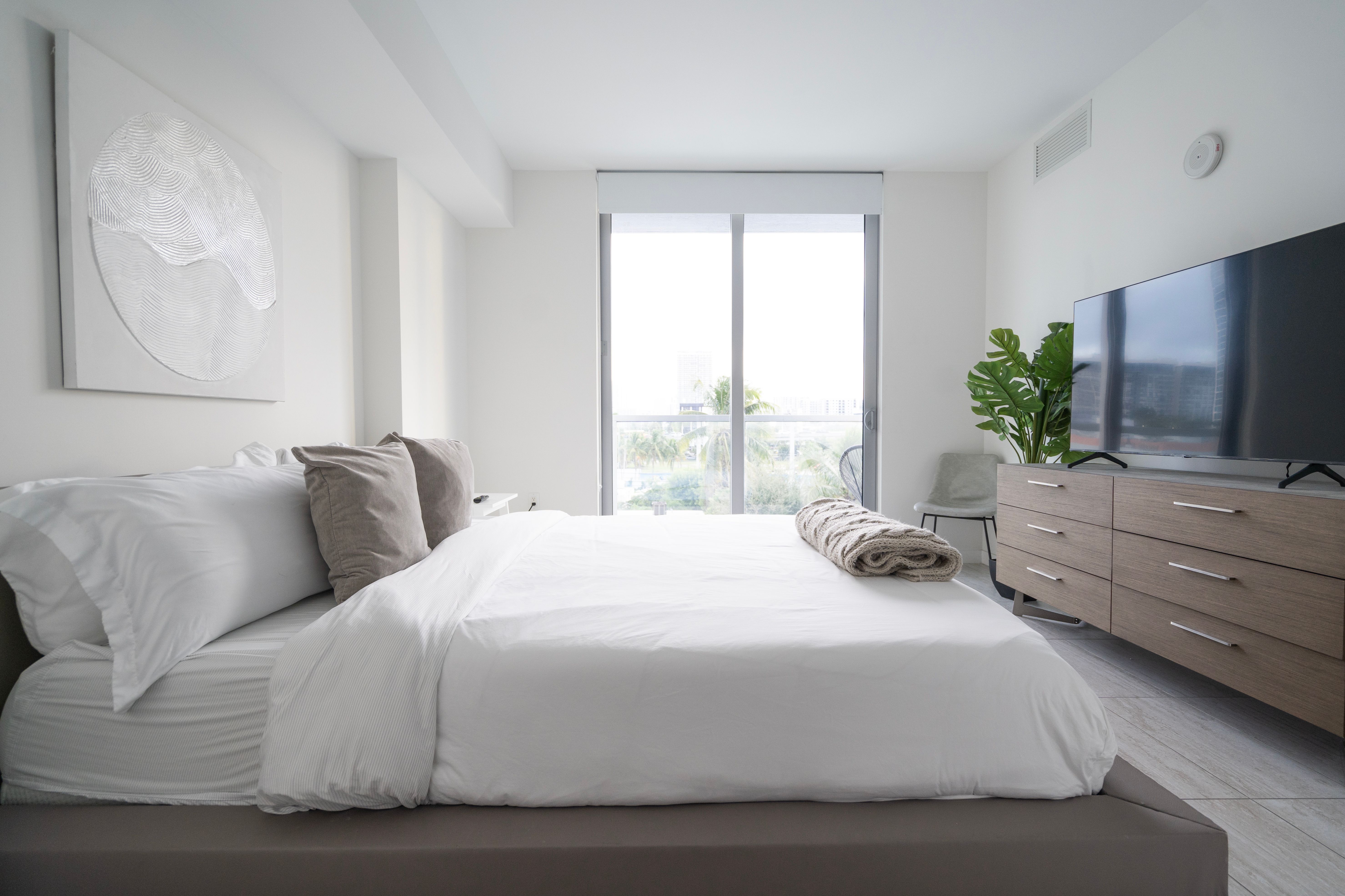 Just steps from the Miami Design District with all its art galleries, restaurants and shops, you’ll find this modern apartment. Another highlight is this building’s communal amenities. You’ll have access to a pool and barbecue area as well as a well-appointed gym. There’s also a lounge with a snooker table and a workspace. Or relax on the private balcony here (it has seating for two). The open-plan living room also sleeps guests three and four on the sofa bed – but please note that the dining table only has room for three guests. Another bonus is that there’s a free parking space.