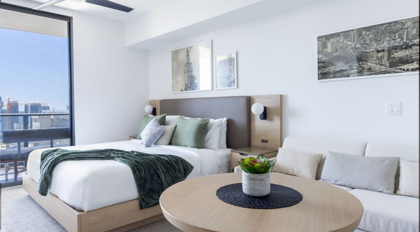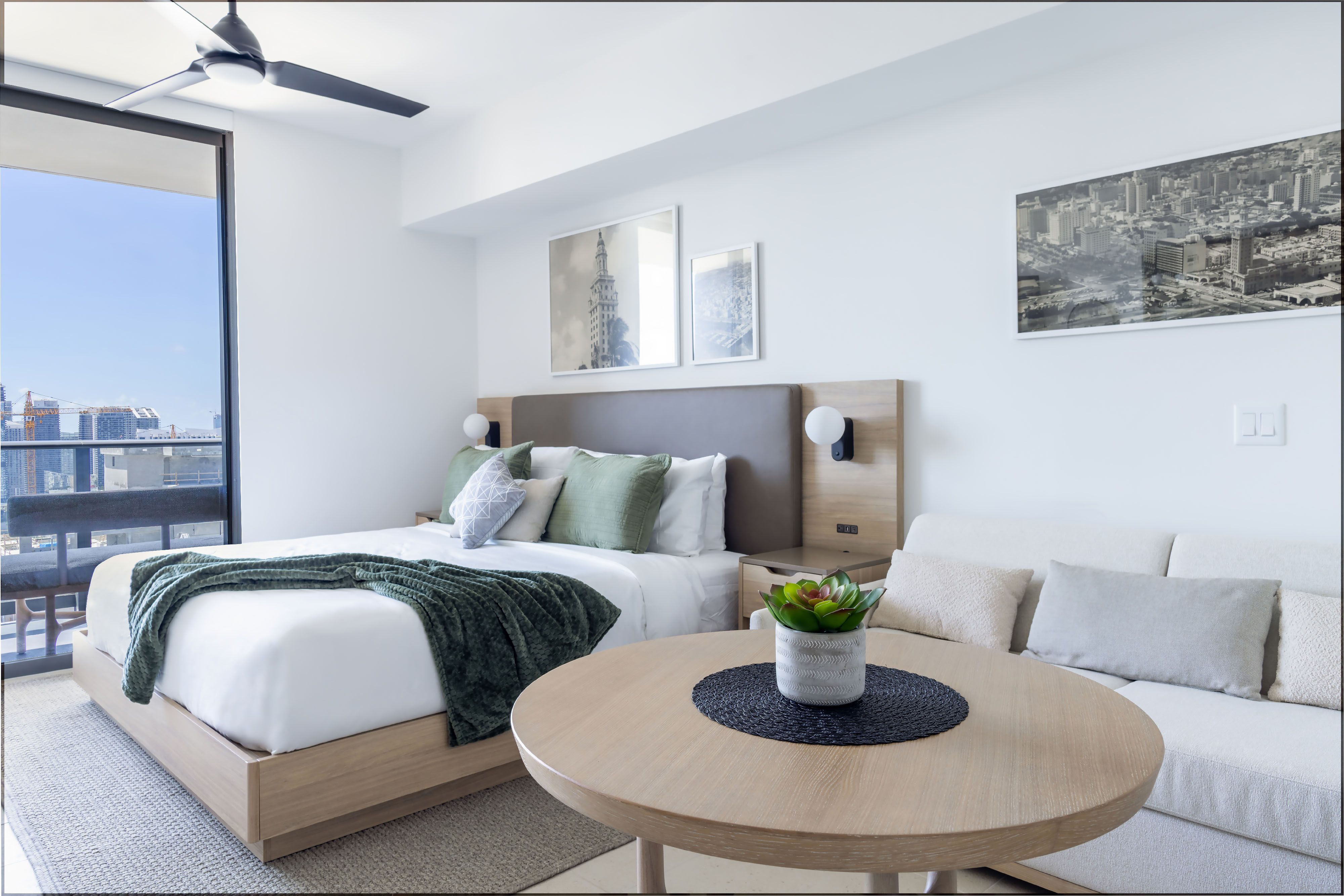 Located in Downtown Miami, this studio apartment places you in the heart of the action. Step outside and you'll find shops, restaurants and bars on your doorstep, while South Beach is around a twenty-minute drive away – or you can hop on one of the apartment's bicycles and explore the nearby waterfront. The space itself is elegant but compact, with limited dining space – especially if you're travelling as a group of four – though the private balcony makes a dreamy spot for evening drinks. Better yet, you'll have access to the building's rooftop pool and gym.
