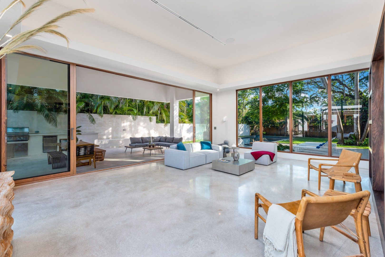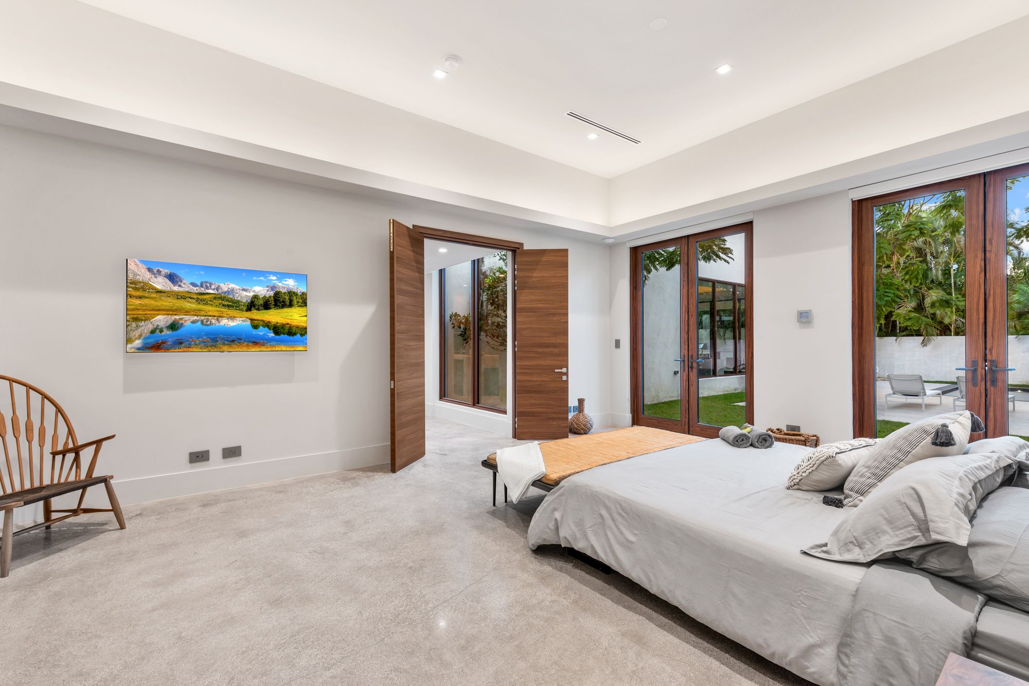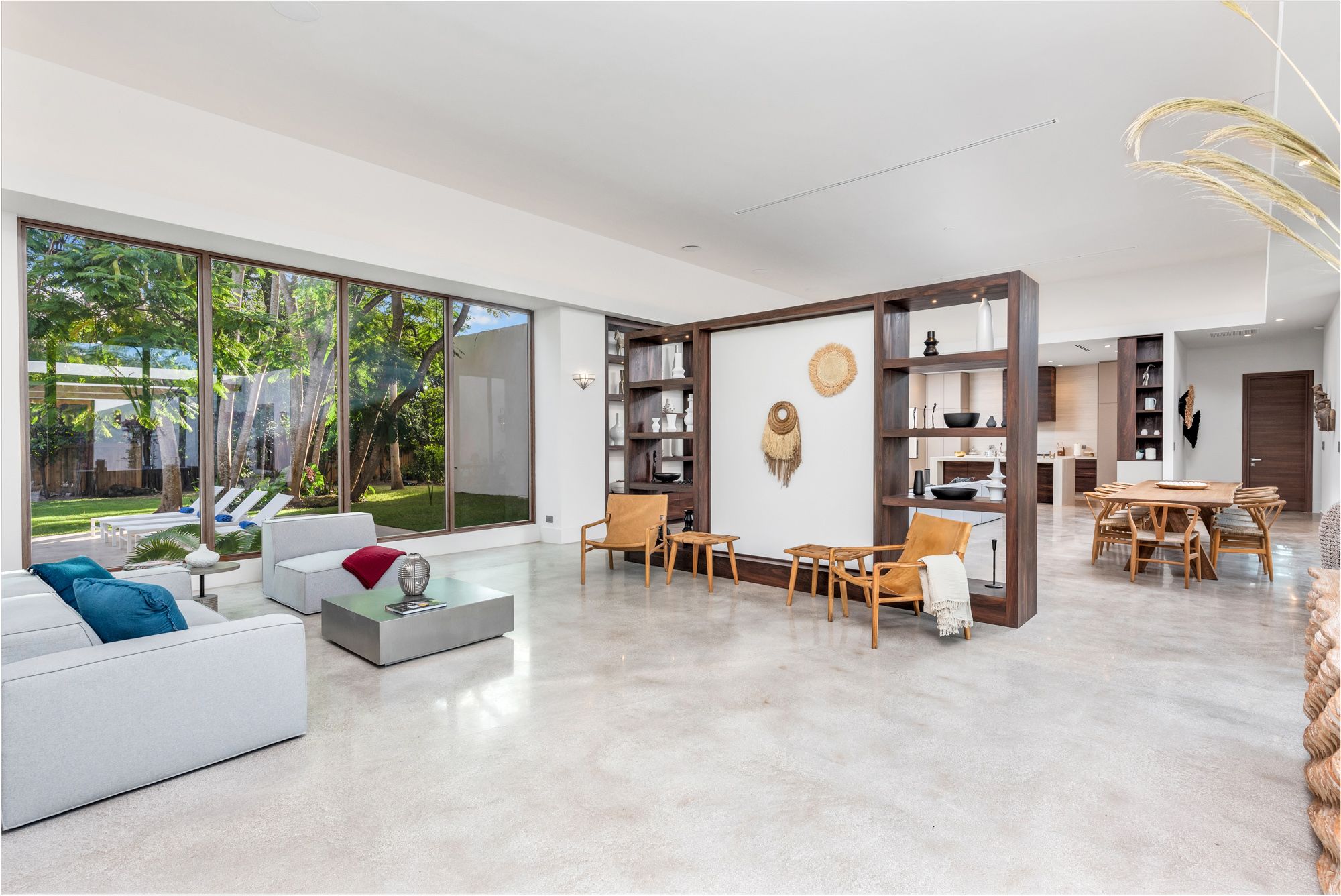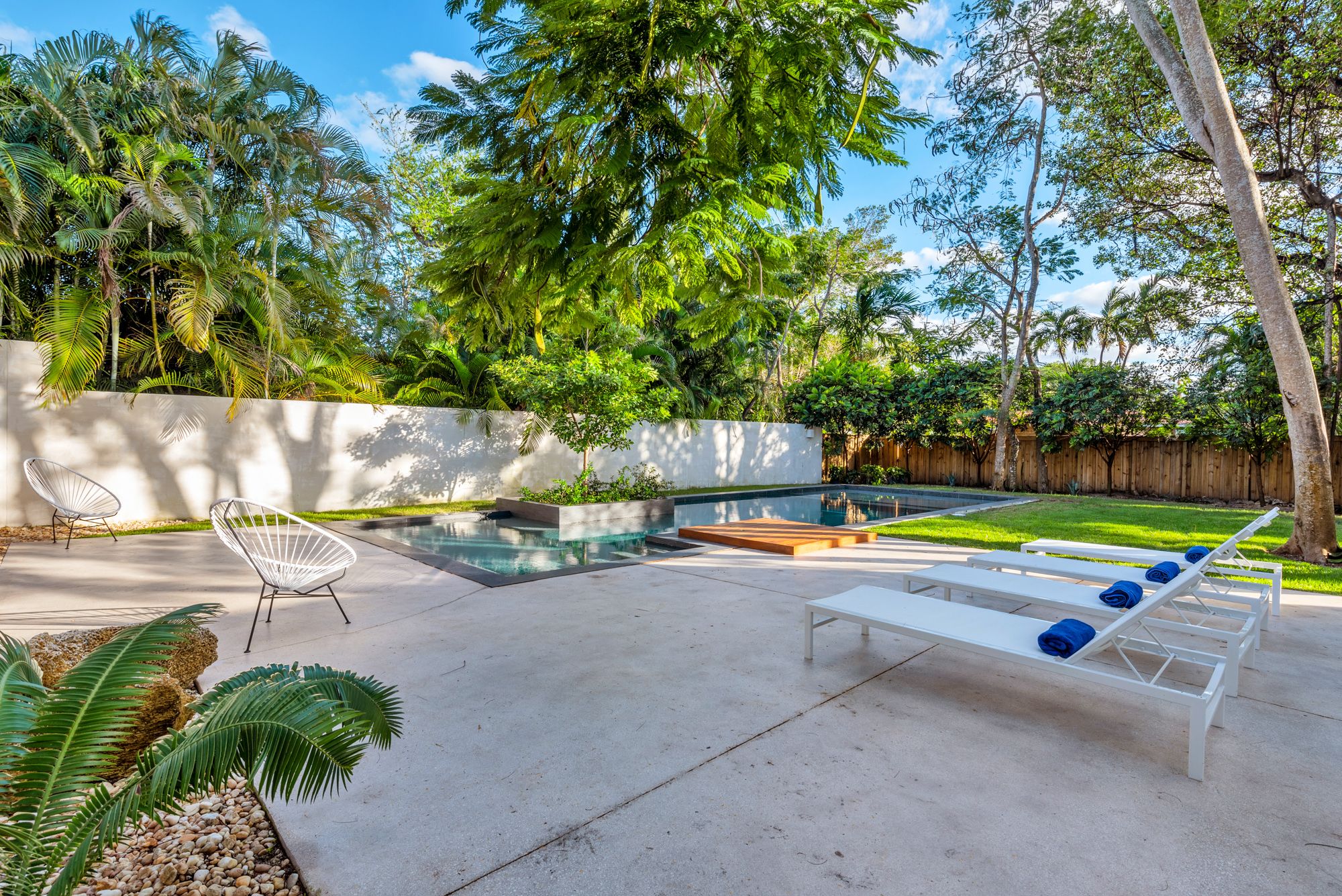 Sparkling new and set within manicured gardens, this modern villa is in the heart of Miami Shores. Just a ten-minute drive from Miami Beach and Wynwood, it's in a quiet neighbourhood with easy access to everything you could need. You're greeted by a Moroccan style entryway, with exquisite landscaping and tropical plants, while sleek lines and an open-plan layout to the vast living space make for a cool, contemporary place to call home for a while. Think polished concrete floors, dark wood built-in shelving and plenty of floor-to-ceiling windows. Hang out inside on the huge sofa or at the stylish dining table, or slide open the doors and spill out onto the covered terrace. There's a top of the range kitchen inside, as well as an outdoor kitchen area for barbecues and cocktails in the garden. Swim in the heated pool, bask on a sunlounger or read in the shade of the palm trees.