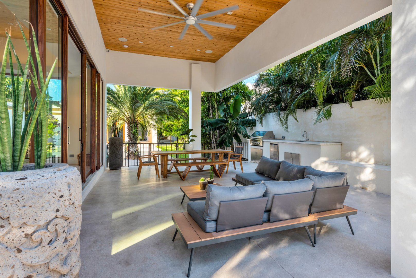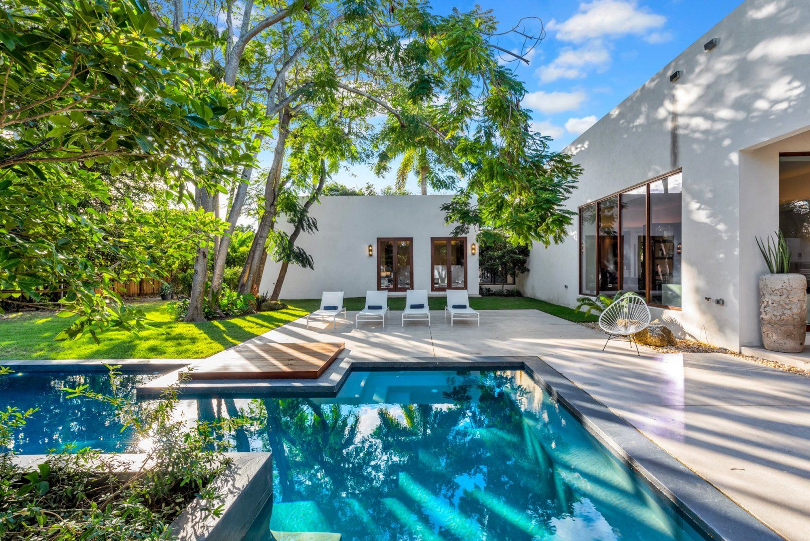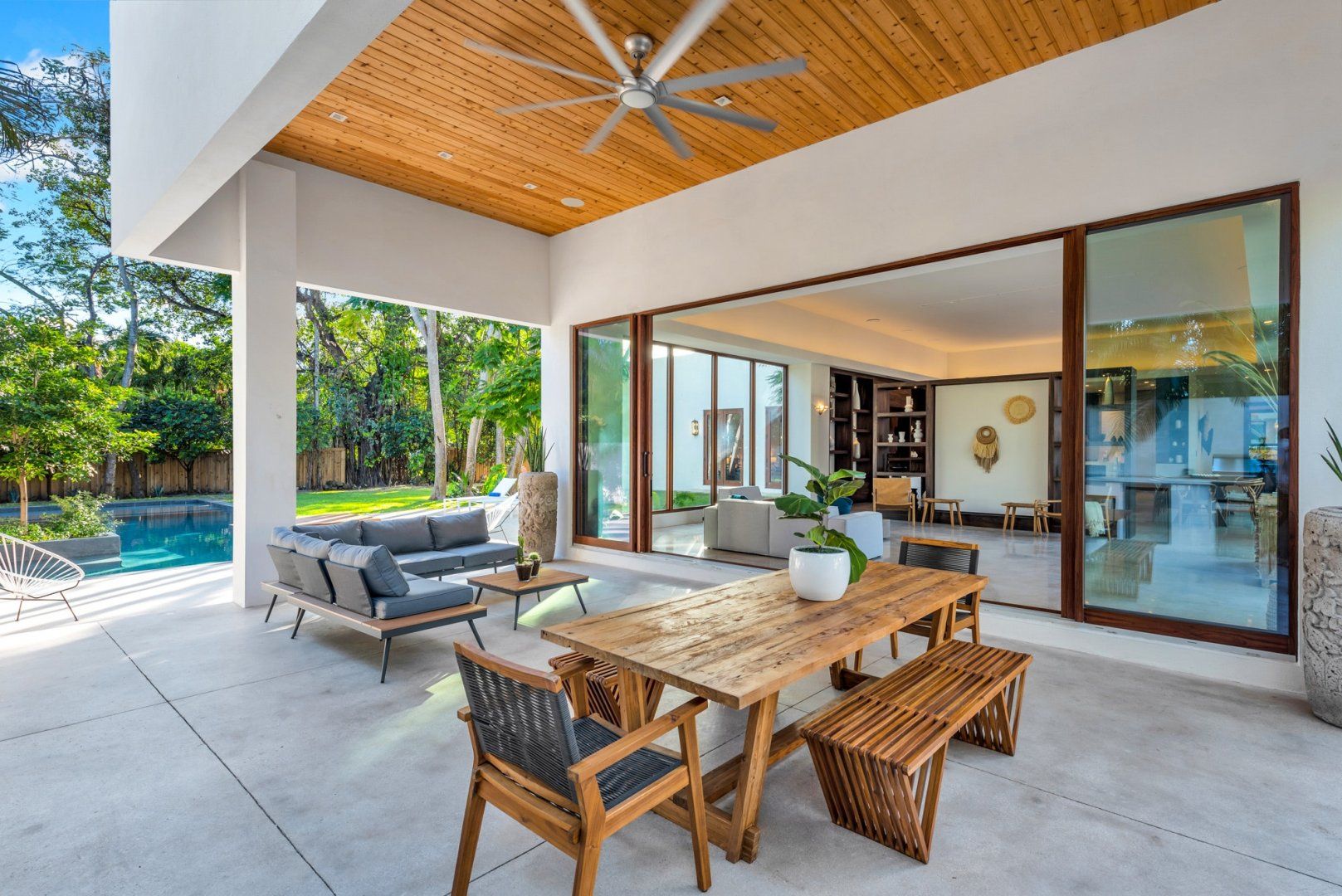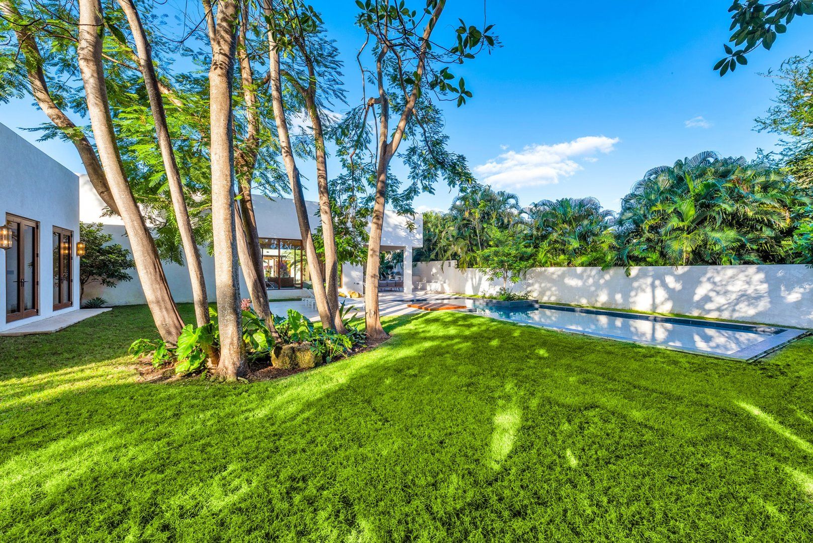 Sparkling new and set within manicured gardens, this modern villa is in the heart of Miami Shores. Just a ten-minute drive from Miami Beach and Wynwood, it's in a quiet neighbourhood with easy access to everything you could need. You're greeted by a Moroccan style entryway, with exquisite landscaping and tropical plants, while sleek lines and an open-plan layout to the vast living space make for a cool, contemporary place to call home for a while. Think polished concrete floors, dark wood built-in shelving and plenty of floor-to-ceiling windows. Hang out inside on the huge sofa or at the stylish dining table, or slide open the doors and spill out onto the covered terrace. There's a top of the range kitchen inside, as well as an outdoor kitchen area for barbecues and cocktails in the garden. Swim in the heated pool, bask on a sunlounger or read in the shade of the palm trees.