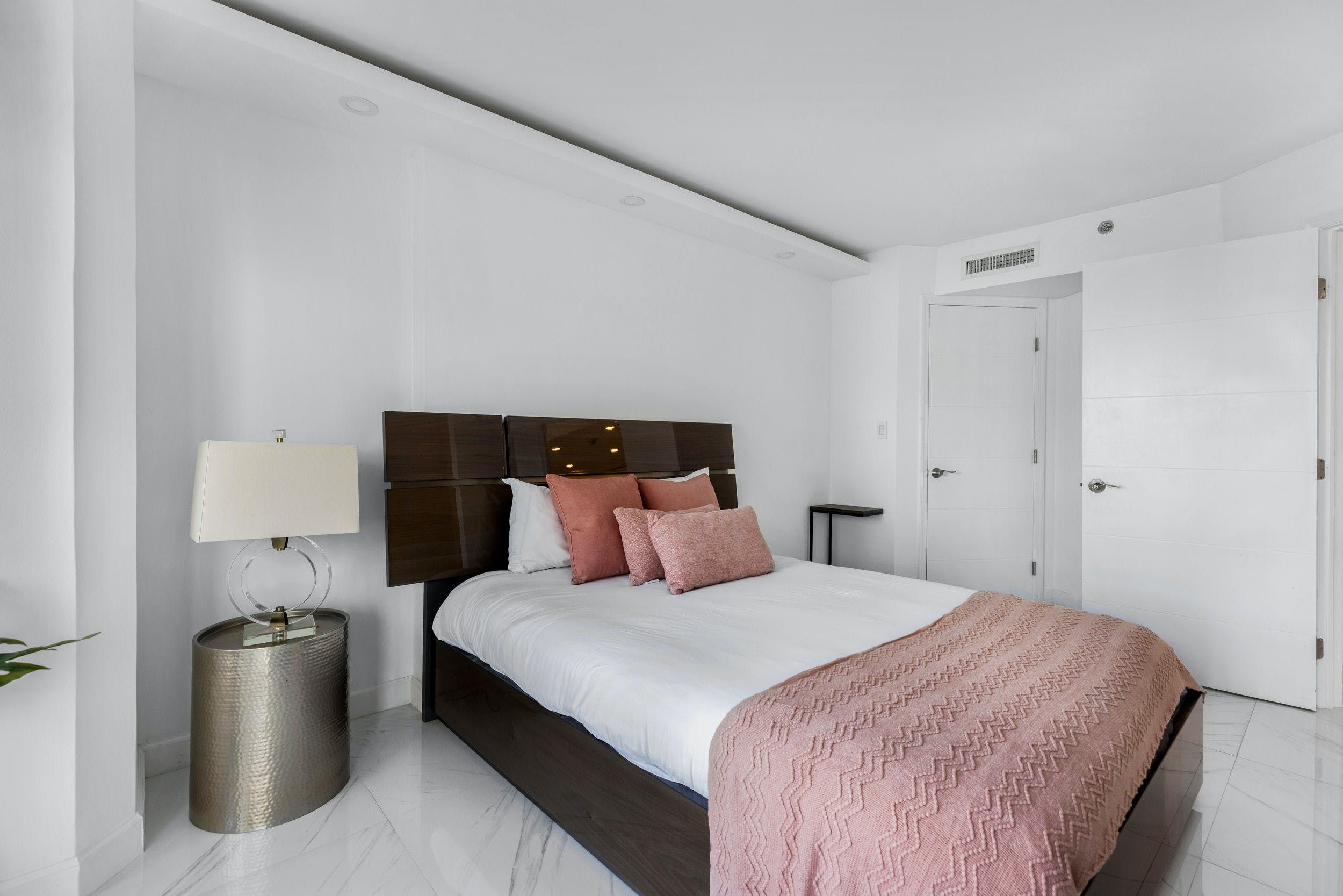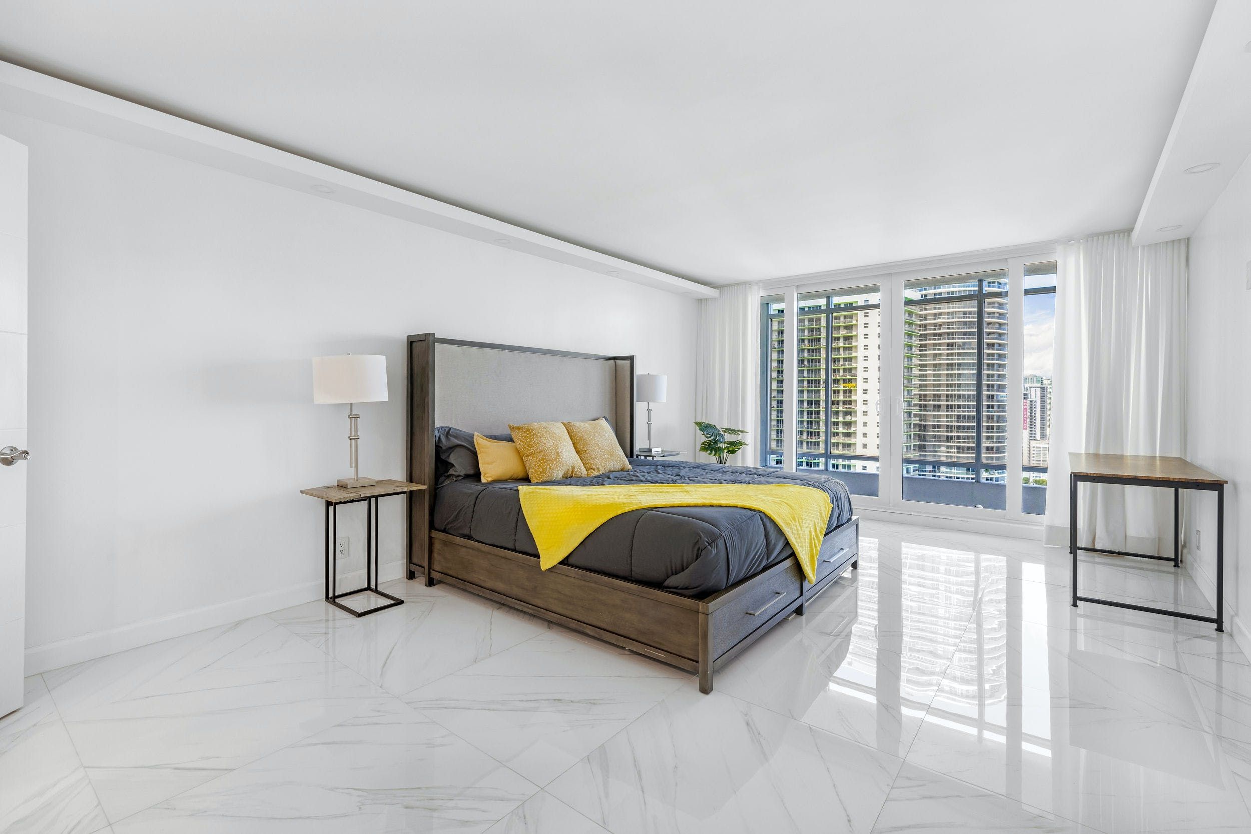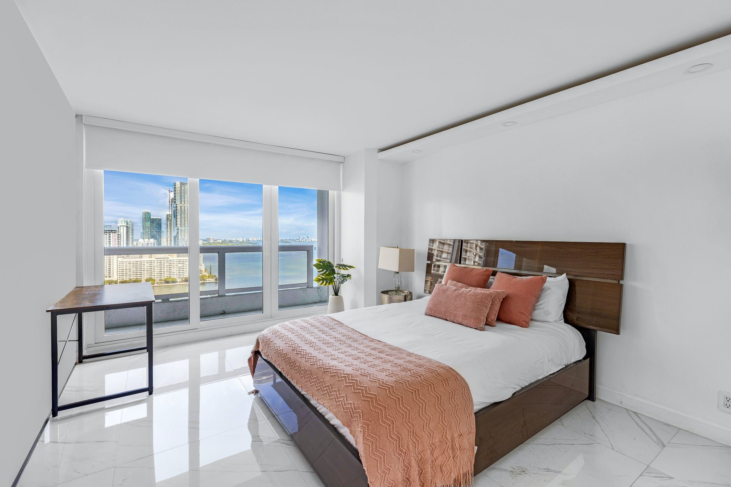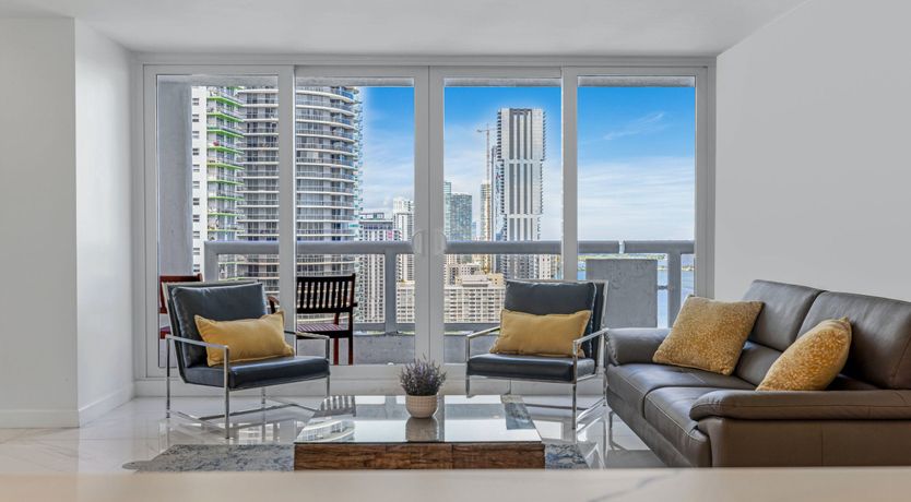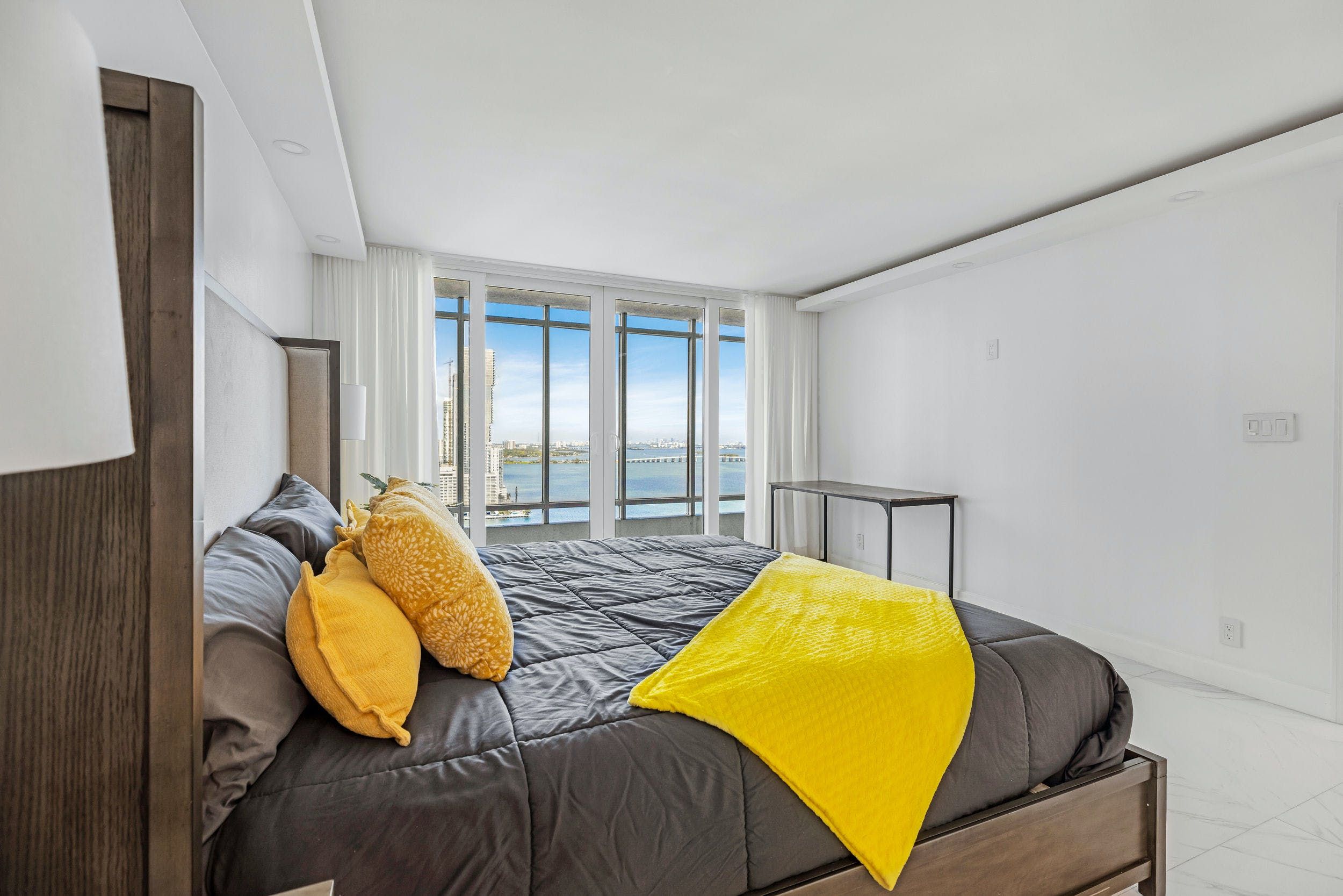 You’ll find this sophisticated apartment in East Miami, a ten-minute drive from bustling Downtown and fifteen minutes from the endless sands of Miami Beach. Inside, it’s whitewashed and sleek, with high-end appliances, minimalist furnishings and glossy marble floors. Walls of glass not only flood the place with natural light but give way to views of the glittering Biscayne Bay. Step out onto the balcony and gaze across the turquoise waters with a freshly brewed coffee in hand.