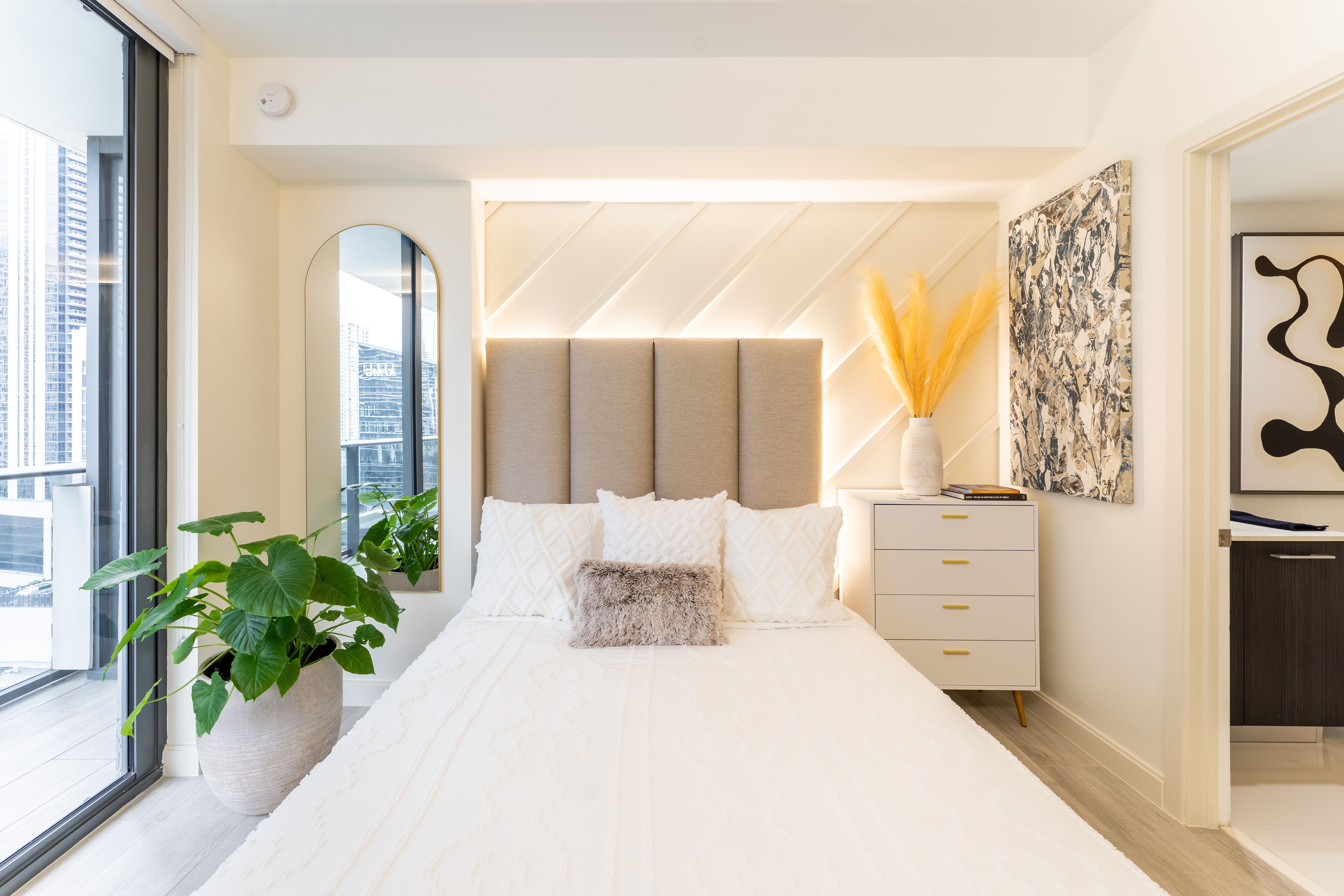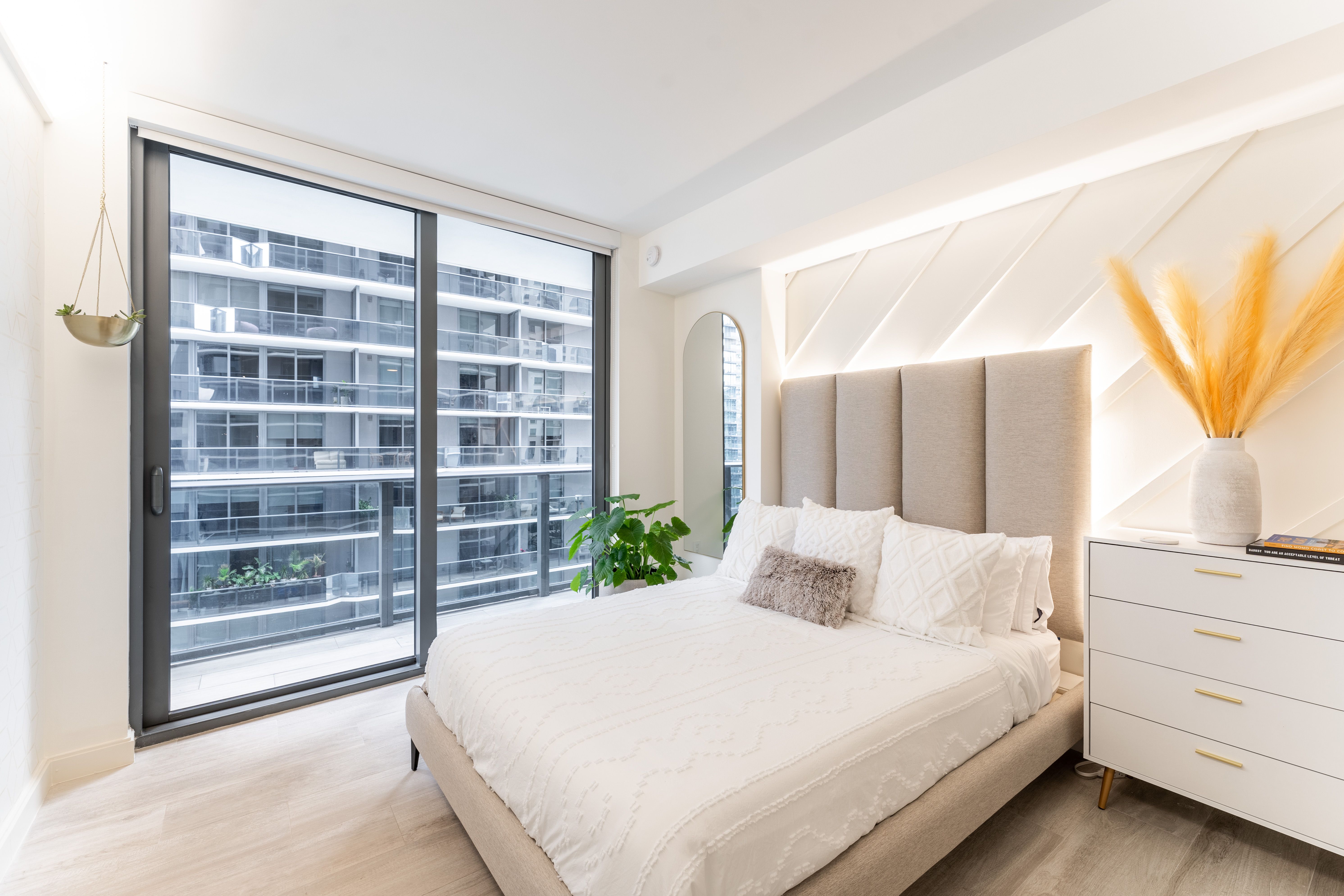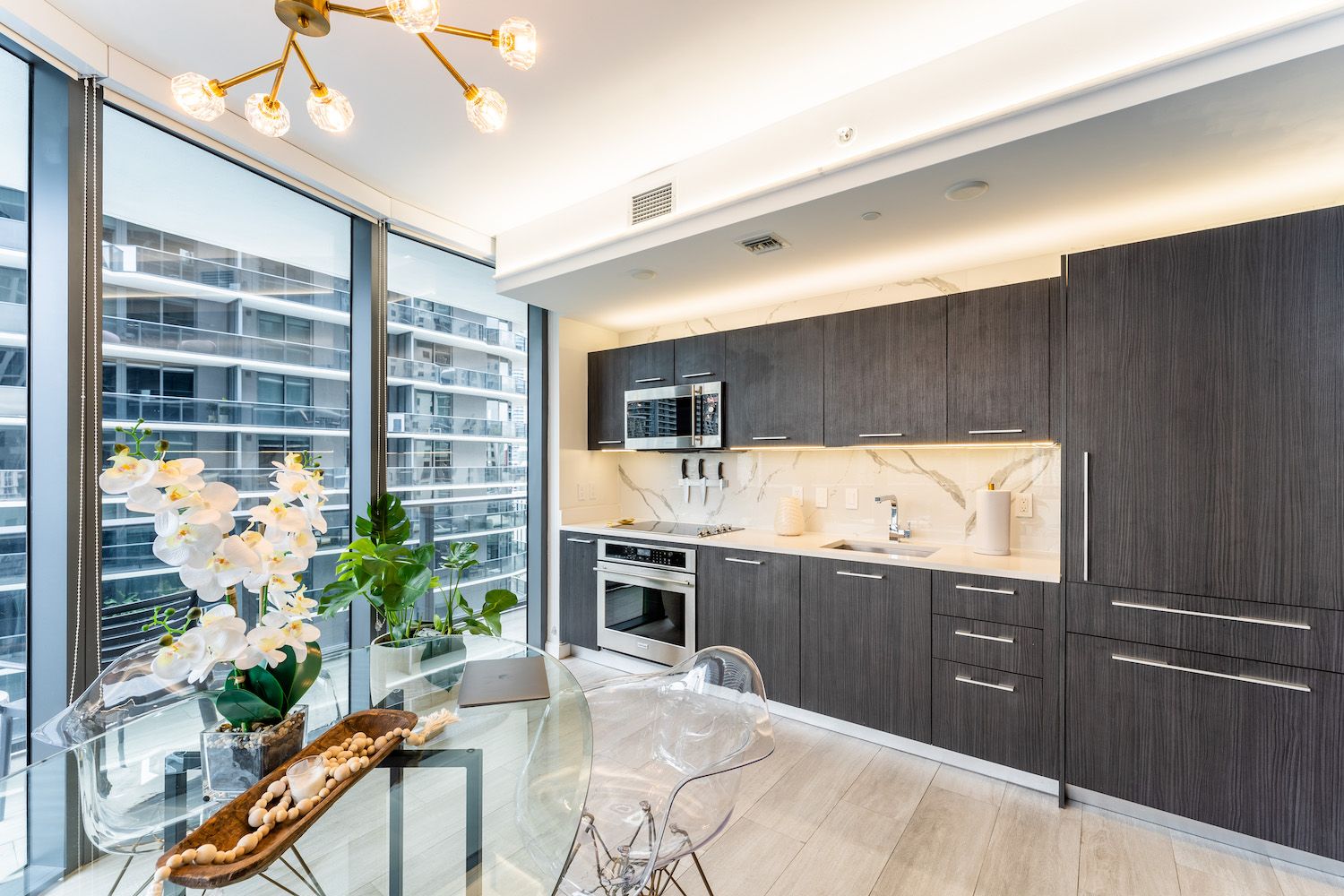 From its wrap-around glass walls, ultra-modern furnishings and marble backsplash kitchen, the space itself is perfect for a small group, couple or working professional looking for an all-in-one, family-size pad to call home for a while. Everything has been done with the sleekest of finishes, including the sumptuous bedrooms and ensuite bathrooms. Wake from your restful slumber, stagger over to the rainfall shower for a quick rinse before starting your day with morning coffee on the balcony.